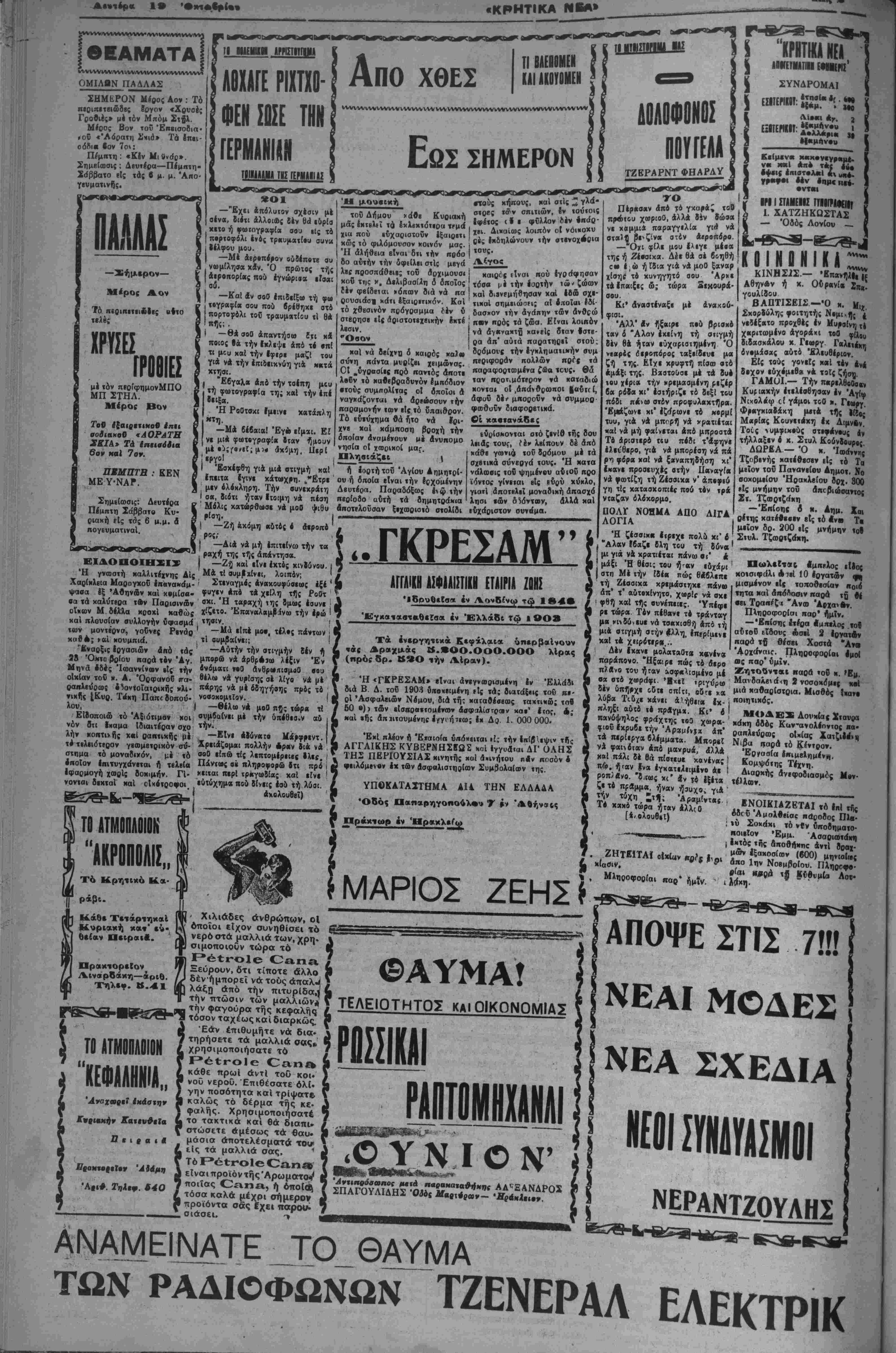 ΚβίΓθνή"Ρως προτεινομένη μέτρα όσον <5φΓχ? μέν τόν Ιξοπλισμόν της Χώρας μή γίνουν Ιχτο; των άιαγχαίων μόνον, δσον ^τρθ(α ,δέ την αοφά λβιαν των συνόοων όχυοωθοΰν τα πλέον ίοθβνΐί οηικΐτ. Κατά την συνεδρίασιν έτονίοθη όιι το Βέλγιον, ^έν υφίσταται λόγος νά ίγκαταλβιψι την Κ. Τ. Κ. καί δτι α! ύποχοΓωσεις τού πογ{ τας ξένας δυνάμεις ποέηη νά μείνουν ακίραιοι Τό σοσιαλιστικόν χόμμα απεφάσισεν Ι .ιω; κιτιψ^φνη τή·" Κι β ρνησιν »ατα τϊ,ν ύ συνβδςίασν τής Βο λή:. ΤΡΟΜΑΚΤ Κ ΣΥΗΕΚΑΟΝ1ΕΝ ΒΕΝΕΤ 1Σ ΑΘΗΝΙ 19—10-36 (»η"ι βνΐαΛη μαο) Άνγίλλβιαι έκ Β-νί-ιίος ότι την 3 ανιηςχθές τοοιιακτικίις σεισμ ^ς αννΜηπι »ί)ν πό ιν. Πολλαί . ίηαι κατέρθΕυσαν (ί 'ΐ »<·■ τοιχοι "λλόφοονες ?ξη(χοντοε!ς τος όδτύ,. Τί ηλεκτρικόν οβϋΐΛΠ ίπ·ϊ)<07ΐτι. Έ* της *αϊ<ΐθ0ϊ«ο«· ως ίφονεύθησαν πολνί όϊ ινες δέν ή5υντ(ν'τιια» νά Ιξέλθουν τήίν όϊ»ών των. Έπίσης ·ναν£σ'θά· «ρησαν π λλ" ί'τοοινά μνημίΐ» μεγάλη ΛΕΙας "Η τοομακτιχη αυτή ο ισμι-ή δόνησις βνένβτο αίσθηΐή βΐς μεγάλην δ<»ία καταστραφέντων π«1 λάν χσμών. ΤΑΡΑΧΑΙΕΞΕΡΡΑ ΕΙΣ ΤΗΝ ΠΑΛΑΙ ΑβΗΝΑΙ 19 - 10—36 (τοΰ ανφοΰ μος)- ΤΓ,λβγοοφήιΐ'ΐτα §ξ Ίεροσο'υμών άγγέλλοκ»,'« νέαι «αθ' χιί εξε00άγησαν κϊς Παλαιστίνην,Λθί· την καθιν ¥ων οπεογιών. Είς τό χωρίον ΆΥ'"! 'Ιωίννη ε Άγγλι*όν|'.πόσπασμα ίνέπβσεν ι!ί ίνέδςαν των Άοι'βο·, φινευθέντων Ι(?ι»ν βΙ(|11 τιωτώ*. Μβτίΐξύ των άνδοών τού ΑποσΛΐίσΐ»01^ κΐί «ών Άοάβον συνή(ρ»η Αληθής μάχη *»ι"ϊυ, θέντων των "Άγγλαιν ο Κγον αργότίθον "ο1 υπό άεροπλ-ΐνων. Οί "Αθ'βΕς ϋπέστησαν *™' πιν τούτου αληθή πανωλΕθρίαν, φονευθίν»»* πολλών χαί τραυμιτισθένι-ων δβ«άδων. μ Έκ'ση; «·αΙ είς Τέλα Β β Ιφονίύθηοον 1 Αγγλοι άστυνομιχοί καί ετραυματίσθησαν *ο· κετοί. , ΣΟΒΑΡΑΙ ΣΙΓΙΡΟΥΣΕΙ! «ι τη ιιιιιι. Ι810Κ ΜΟΙΣΟΥΛΜΑΗΙ ΑβΗΝΑΙΙβ-10-36 (,οϋ ανταποκριτοϋ μα:).—Τα έκ Βι έννης τηλε/βαφήματα άναφέ ραυν «τι ομιλών χδίς ί Καγχ, λάρι·ς τής Αυστρίας Σούαηχ «ίς ου.«#ροισιν 1200 μελών ιοδ Ηύίΐμαχος χον ΙόήΧωβΐγ ζη #α παραμβ/νου, ^ναιμένοι καί πι οιοΐ πρό; την οικογένειαν των Αβ ----- ■ ■ ■ —ε— ■ —■ -ε— —-------------------------- ΑΘΗΝΑΙ 19—10—36 (ιοΰ αντα«οχθ"0° μ<η) Τηλεγοαφήματιι ?κ Βομβαης αναφέΒθ,"* »ί οί ταοαχαί μεταξύ Ίνδών καί Μόυβου>μα*α)