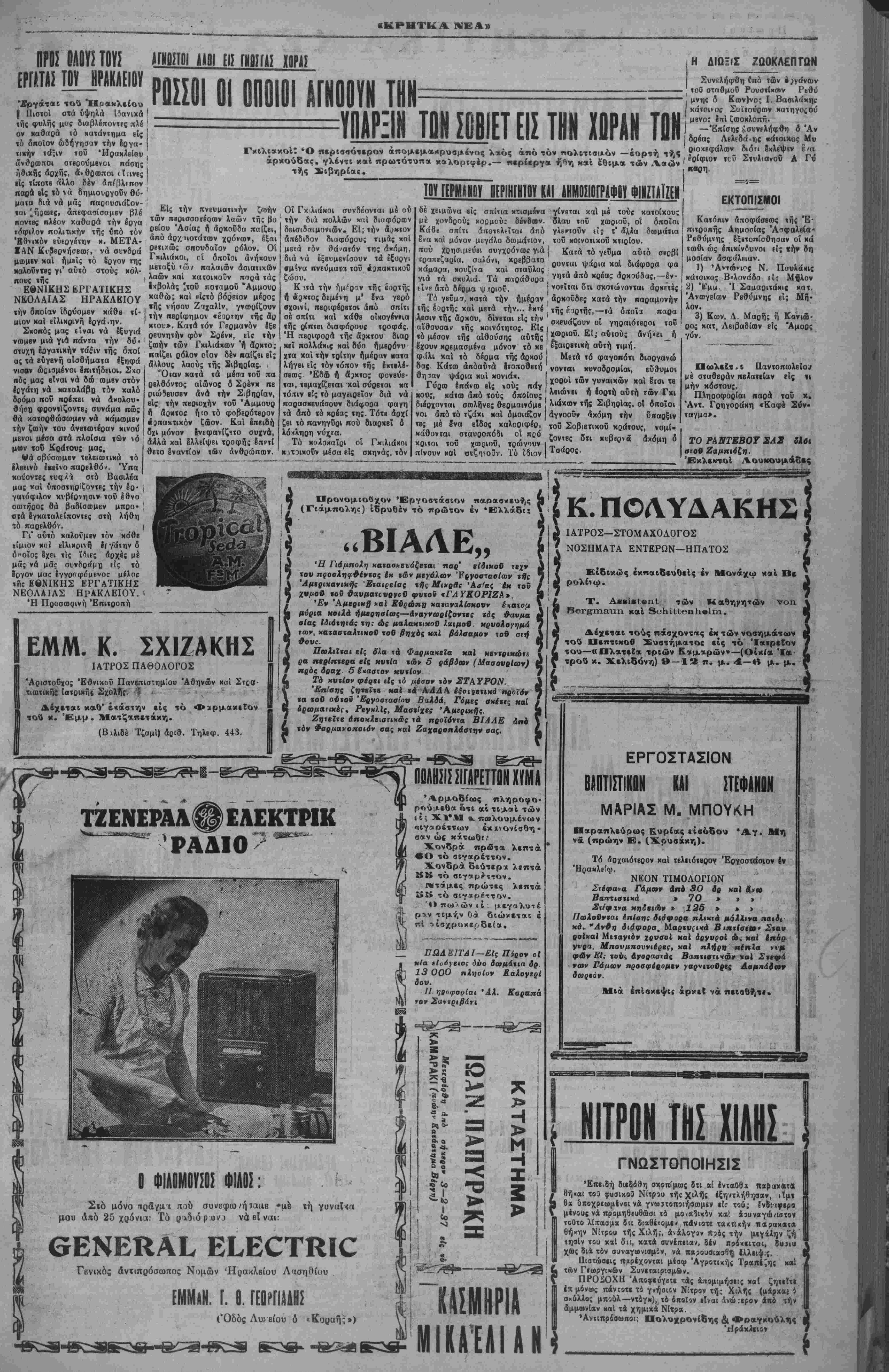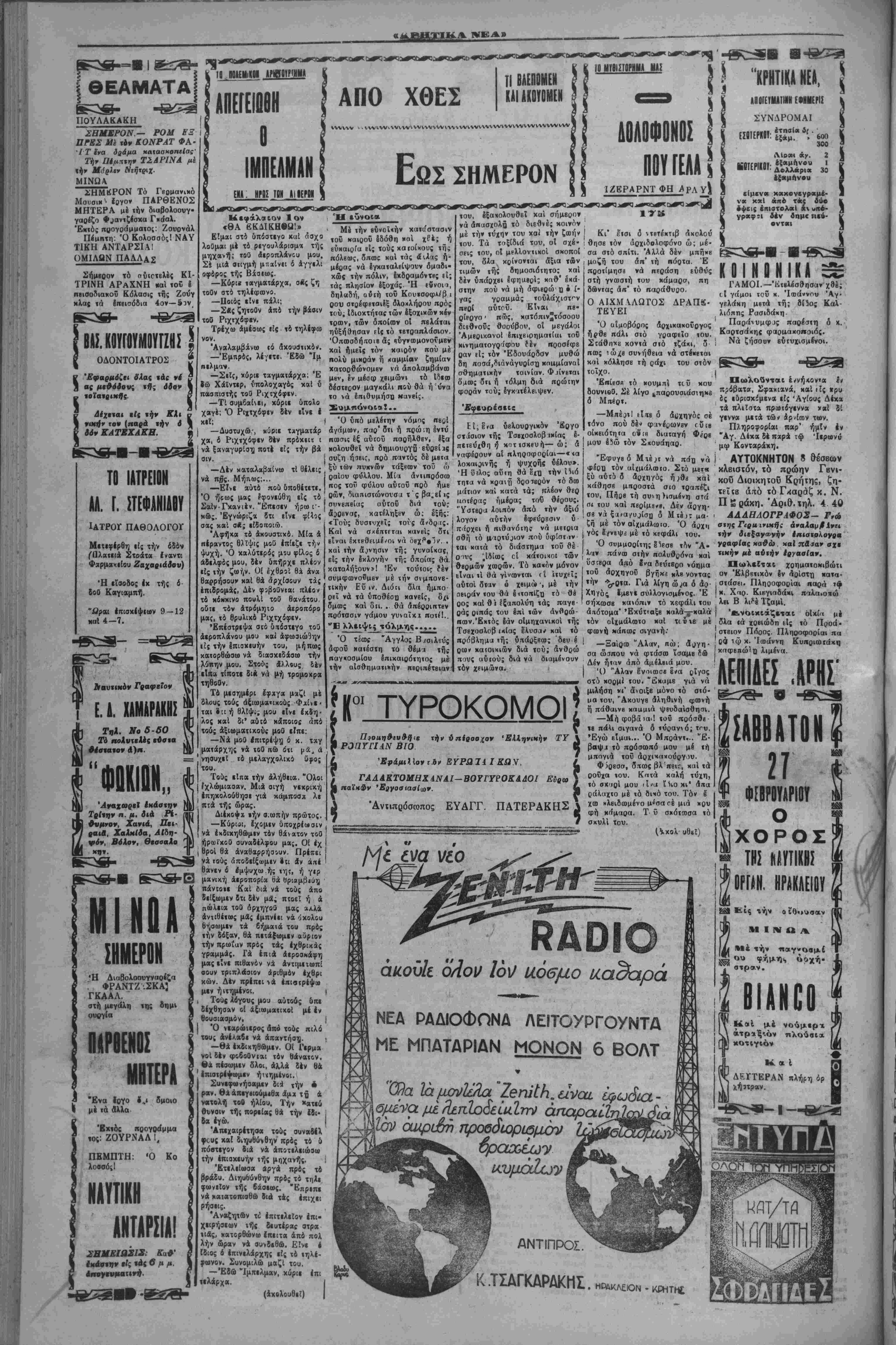 ΑΘΗΝΑΙ 8—2—37 («ού άντ)<ού μσς(- Κατά σημερινά τηΐιγβαφήμαχα Ικ Λονδίνον, ή Αγγλικη Μνβέρψησι , επιθυμούσα νά δ»98 πςώΐη τό παοάδειγμα τή; πλήρους Αηοχής καί ούδετεο(5τητος τής χώοας της έναντι τοβ Ίσπανικσν ζητήμαχος, απηύθυνεν έκκλησιν ιΐς τούς έν Ίοπανίφ άγαανιζομένους μετά των I- ρνθρών "ΑνγΙονε ύιηκ.ου; όπως ίηισί^ίψ» σιν ιΐς την πατρίδα «ών Αΐέγεται ότι δύο χιΐιάδβ; "Αννλοι έθελον ταί μάχονται μβτά των κνβερνητικών στρα«ευ μάτων. Μέ την έκκλησιν ταύΐην «ής Αγγλίας ά· σχσλεϊται όλος δ σημερινό; Εύβαιπαΐκός «ύπος. Λ Ο ΣΤ ΑΟΣ ΑΘΗΝΑΙ ^ 8-2—37 (τοΰ άνταποκοιτοβ μας).—Καθ' εί άγγέλλουν αί χθεσιναί Εύοωπαί- καί ΙφημεοΠες δ άπό θαλάσσης βομβαρδισμός τίς Μαλάγας αυνβχίζεται άπό τριημέρου ά- νηλοής. | Κατόπιν τούτου οί χνβερνητιν,οί απεφάσισαν νά διακινδυνβύσουν μίαν κατά θάλασσαν σύγ- κρουσιν των δύο στόλων χοί τα πολβμινά οκά φη της χνβερνήσεσς έ<αιθέντα είς Κ-^ρθαγένην άπέπλβυσαν πρός συνάντησιν τοϋ Εθνικον στΟΛθυ. ΜΕΓΑΑ ΣΥΝ1Ν Ιί Σ ΝΣΙΣ ΜΕΤΑ ΥΠΟΥΡ ΜΑΣΙΑΣ ΕΝ ΕΚ ΑΘΗΝΑΙ 8—2— 37 («ου άνταπο-ριΐοβ μας).— Κατά ττιλΒγραφήΐίαΐα έκ Παρισίων την 6,10 μ. μ. τής χθές αφιχθη β'ις Μόντβ Κάρλο 6 "Αγγλος 'Υπουργός Εξωτερικών μ. Ήντβν συ»οδευόμενο; ΰηό τής συζυγσυ τού χοί δύο Ιδι αιτέροον γραμματέων. ^Ό "Αγγλος ΊΓκουογ<νς θά συναντηθη μετά τοΰ είς την πόλιν ταύτην βύοισκομένου έπιση; συνταγιΐ'ΐταΌχου Μπέκ, ΎιτουργΘϋ των Έξςοιβρι*ών τής ΠολωνΓας, μ§· τά|[τοϋ διοίου θά συζητήση ^Ιπί τϋς ^ξτοτβριχίίς πολιτικϋς ττϊς Γερμανίσς καί τοϋ τβλευταίου λόγου τοΰ Χίτλ^ρ. ΑΘΗΝΑΙ 8-2—37 (το"ι άνταποιιθιχοδ μας).— Ό Άγγλικός τύπος, άσχολούμενος με τάν ιϊποχλεΐΰμδν των Ίσπανινών παραλ(ων, λέ γει δι καίτοι χά ιυστεροϋν αί άΛαντήσβις μιρι χβν Κρατών, ή '.^πιτροπή μή ίιτβμβ ίαβως Είναι ΰποχρεωμένη νά συνέλθχ) την 9ην τοίχοντος (<ιΰ ριον) χαί ό»ίαν 11 π. μ. διά νή δρίοΗ την ήμέ ραν της ενάρξεως τού άποπλεισμοϋ. Τα χράτη, τα επιδόσαντα τάς ΙπαντήΌεις των ιίνβ τ) Ραισσία, Άγγλίσ, Γαλλία χαί Τουρ κια. Οί Γβρμανοΐ πΓβΐπαθοΰν νά διχαιολογή σουν την μή επίδοσιν απαντήσεως ,1; την »Βπι τροπήν μέ ιήν άτυχή ίοίαν της συμμβτοχϋς «αί τοΰ 2)0ςεηκοΰ στόλου είς τόν άποχλεισμόν. Η «ΠΑ ΟΡΟΣΜΛΕ Η ΑΘΗΝΑΙ 8-2-37 (τοΰ ανταποχριτοϋ μας) — Ή ά^ελφή τοΰ δουκός τοϋ ΙΟίίνησοβο πριγκιίπισσα Μαίρη ?1·ις ίγχατέλϋψΓν ιό Λονδί¬ νον ποο; συνάντησιν τοΰ άβελφοΰ της, άφίχίτο χόες ϊΐς Βιέννη . Ή π3ιγκήπισσα Μα'ρι,, ώ; λέγβται είναι άπεσταλμένη τοΰ άββλφου ,ης Βασιλέωβ Γίΐοο- Υίου καί τής μητρός της διά τόν διακανονισμόν ζητημαιων οΐκανομιχής φύσβω; *«1 την ανακοί¬ νωσιν ιης ϊπιθυμίας αμφοτέρων δπαις ίπανίλθι ϊίς Αγγλίαν. 'Ω; λέγεται σχετιχώς ό "Αγγλος Βιισ.λεβς θα δημοσιβύαπ προαρχ«ς κατάλογον των Βασι Α.κών μελών, μβτοξύ των οποίω/ «ά περιλαμ ρανβται καί ό Έδάδ
