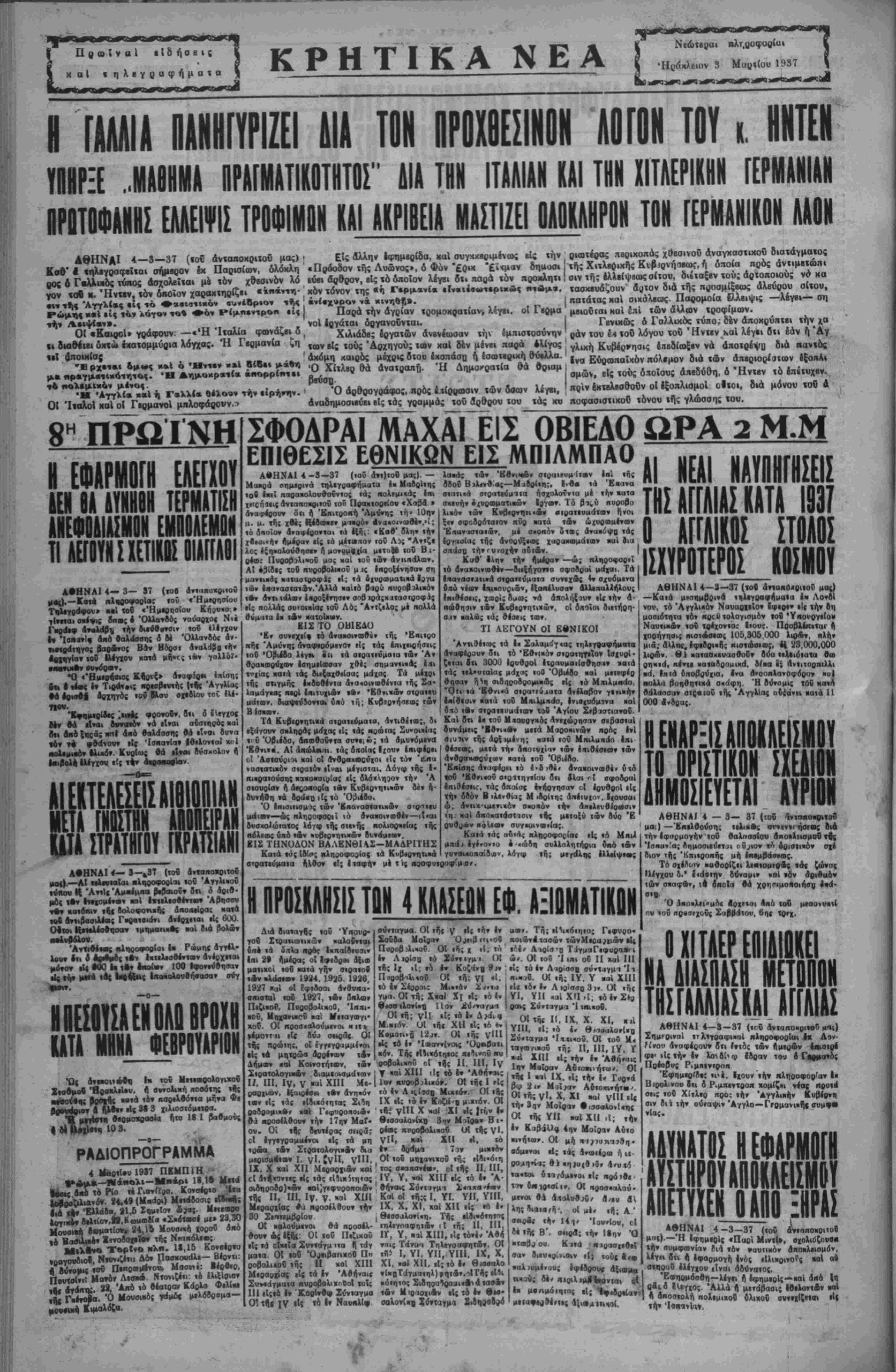 ΑΘΗΝΑΙ 4—3-- 37 (το« <ιν«οιιο«ριταυ μα«)—'ΗκεΙθονοτι; «ελιπ·; —*«·»»'ήθίθες δια «ήν Ιφορμογήν «ου θαλησσΐον αηο«λιισμον τ«5ς ΊθΛυν'α; Αημοσκυεΐυι οδ^«ον «Α έ^οιετΐκιόν σχέ διον ιή; 'Κπκοοκής μή Ι—μ^ΙΜεΐς. Τό οιέλιην «αθοοΐζιι λ··«ομ»οΑς »Α< ζώνας ΙλΙγχου δ.' 1«άε«ην δύναμιν ·αΙ «Αν δριθμόν «Δν σπαςρΛν, τ· ΑΊεοΙα θά χοηττιμοΐΐοιήσο 4«α· Ό α«η«λ·ι<·μδ< Ιοχε«αι Ακ6 τοθ μέσοννιπ( ην «ου ηρβσιχονς ΣαβΙΜτον, 6η< το~. ΟΙΙΤΑΕΡΕΩΙΙΩΚΕΙ ΝΑ ΑΙΑΣ! ΤΙΣΓΑΛΛ Α 1Μ ΑΣ III Ι ΑΙΙΣ ΑΘΗΝ4Ι 4—8 — 37 («γ6 άτ«ακοιιρι«ο» μη() Σημεριναί »τλ«γοαφι«οΙ χληοθφθθΐαι έ« Δ*»· Ρίνου αναφέςου» 8«ι ?*<ό; «όν ήμ«<;Αν Ιιειθΐρε Φε·ιΙς«ή* 4ν λον&ίιφ Ιδοαν ιου Α Γό Πέβ Ρ Έφημερίβεΐ «ι»ε. Ιχουν «ήν «ληοοφοο'αν |« «θλ»νου 8«ι Α Ρ^μΐΜντοοκ «ομ(ζ«» νέα« «οο«* σει; «οδ Χίτλεο «ρο: «ήν Αγγλικήν Κυβεανιι σιν δι* ιήν ούίαψιν'Αγγλο—ί>ρμανι«ήεσυμ«)·