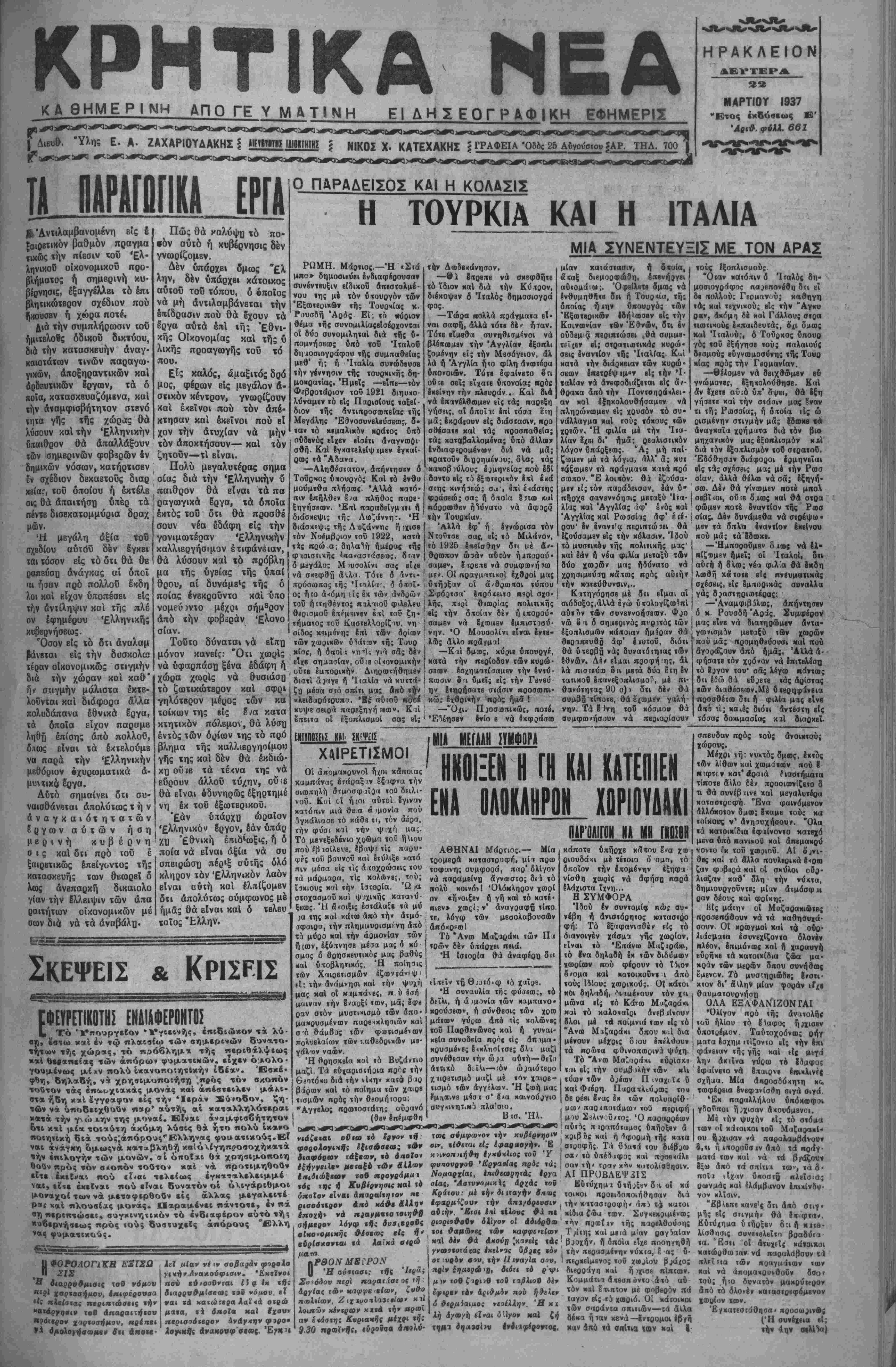<*ο_ι»ν ΗΡΑΚΛΕΙΟΝ ΔΕΥΤΕΡΑ 22 ΜΑΡΤΙΟΥ 1937 Έτος εκδόσεως Έ' Αριθ. φύλΐ. 661 ΤΑ ΠΑΡΑΓΟΠΚλ ΕΡΓΑ |> Αντιλαμβανομένη είς έ