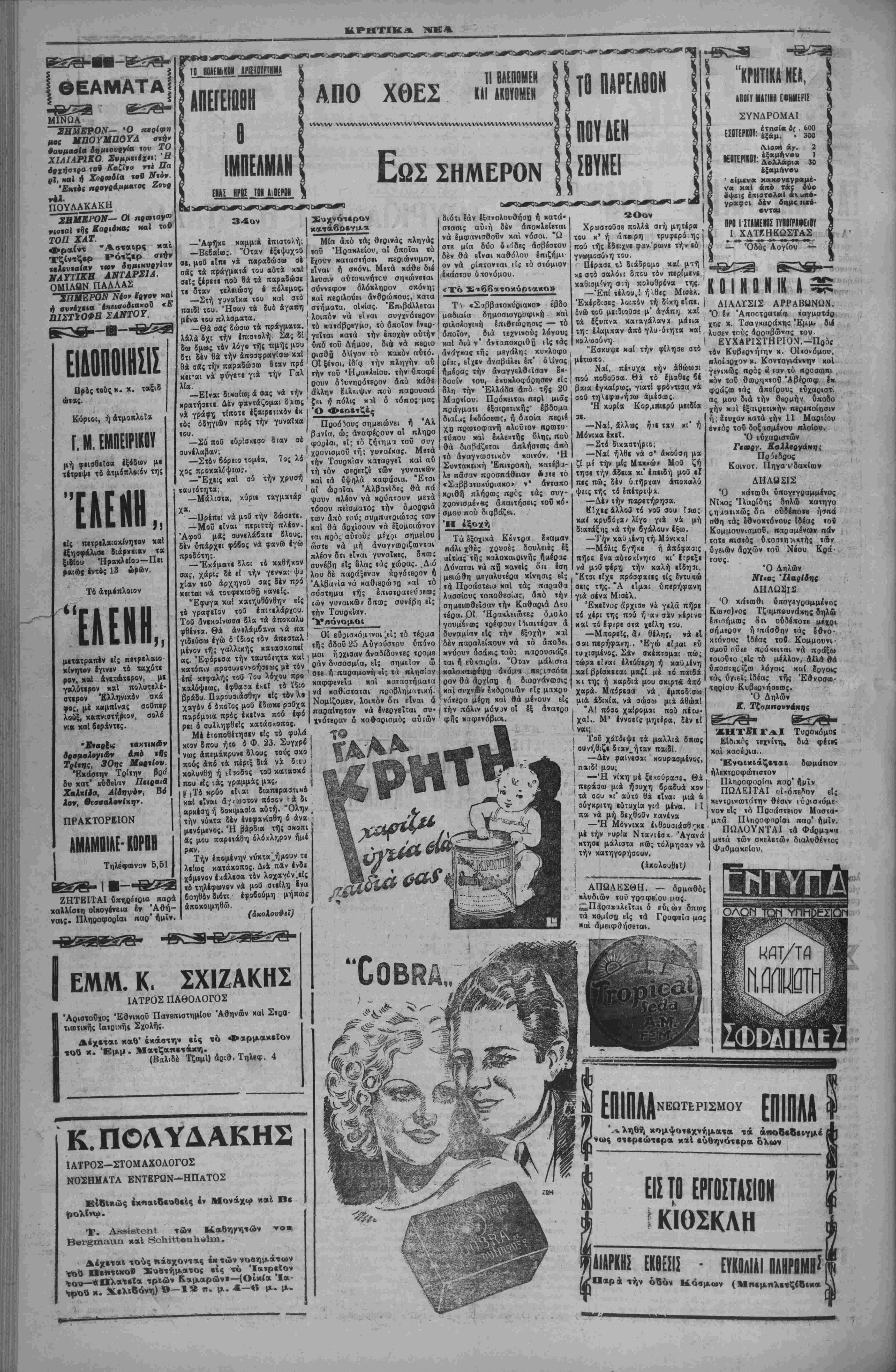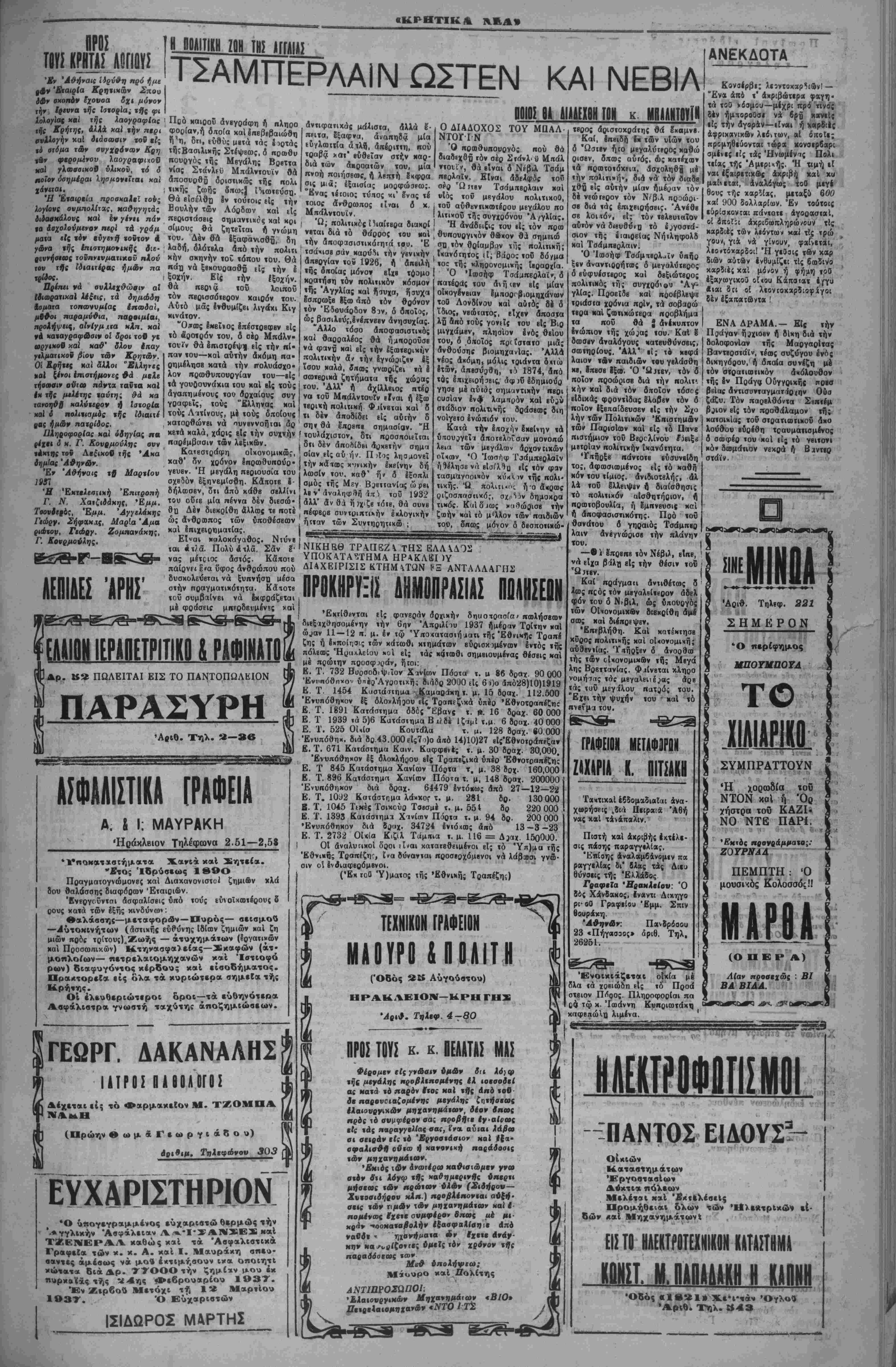των φ>**<ο* τον. Οί νποψήφιοι θά Ι|«ασθονν «ί; τα ίΚίηνΐΗΟ, άίγεβραν, γ ιω μαρίαν, άρώμηα κήν, γεαγραφιαν καί γαλλικά. ΤΟ ΝΕΟΗΓϋϊΐΙΥΑΙΟΚ 2ΥΗΤΕΧΗΙΑΣ ΑΡΤΟΟΟΙΙΝ Γενομένων χθβς αοχαιςεσιάιν τής ΣυντεχνΙας ίρτοποιών Ή- οαχλιίον άπηοτ(βθΐ) τό Διοικη χηλβγραφήμαχα 2κ Χανίων ιό ετήσιον μνημό συνον τοθ Ίλβυθβρίου Ββνι ζέλου προβκάλεσΒν πρωτο- φανή κοσμοσυθροήν είς τα Χανιά, χβλεαθβνιήν Ιΐην ιιροίΐνήν έν μέσφ συγκινη- «ικών έκδηλώσβων πένθους| καί έπιβληιικοϋ δγκου κό·! ομού βΐς χό Άχρωτήόι. Πλεΐστοι, συγκινητικΑτα ·<οι, λόγοι έξεφωνήθησαν, έν μέσφ δακρύοντος πλή· θους. Έξ (σου πάνδημον («ήρξβν καί τό μνημόσυνον •Ις την πόλιν μας, τόν "Αν1 όν Νικόλαον, Νεάπολιν, Ση ΐιΐαν καί είς τα λοιπά Κρη νικά χέντρα καί Κοινότη¬ τος, Ώρ.α.ότστον χΒνοτάφιον β»Χ«ν στηθβ βΐς τόν Μητρο ηολιτικύν ναόν τής πόλεως μας, πρό τοΰ δποίου έξβφώ νηοβν τόν λόγον τού ύ λή κ. Τίτος Γβ Καχότιν διοτανής τής Κυβερ. νήσεοος ή 24η χοί ή 25η Μ ιρ τίου χηρύσσονται ήμέοαιι Έθνι κχ]ς ίοοιής καί Ιπιβίλϋβχαι ό ση μαιοστολισμο; πάντων ιω» χατα σιημάιων «αί οίκιών. ΑΟΕΡΤΙΑΙΑΜΕΡΙΚΗΣ ΑΘΗΝΑΙ 32-3—37 («ού άνταπσκο,ιτού μα^.— Καθ' & Ι τηλεγραφείται έκ Λέας Ύάρ Ηη-, α.ισιλοννται έν<ός «ής αή μβροψ σοβαραί άπεον'αι «ι; «ήν 'Αμ ρικήν λ<Ί»φ μή ίκανο πσιήσιως «ών α/ιτ/αάιω» «Αν Έργατώψ «ών Έργοστασίαιν ΚαάϊσΙιρ, οί θΐοΓοι, ώ; ννω στόν, εξηναγκάσθησαν νά έ« κεντόαονν ταυτα. ΟΙ ΝΑΥΤΟΙΙΑΙΛΕΣ 'Ω; μά; ανεκοινώθη ΰ.τό τ ου Διμρναοχβίου τή; πόλεώ; μας οί δηλώσιν·<β; δτι βΊκθυμοΰι' νά καταΐοχθοΰν ιί; τό Ναυτικόν Ναυιόπαιδβς ποέπβι νά ηαρου σ'ασθοϋν αυριον είς τ ό Λιμβνας χβΐον Χανίων. τικδν αύτήςΣυμβούαον ά; έίή,: Παναγ. Παπαδάκης ποόβ· δοος, Στυλιανό; Κασιοινά· κης Άντιηοόβδοος, Γεώογιο; ΤσουβιλΙδης Γεν. Γραμματεύς, 'Δθανάσιος Χανδάνο; ΤαμΙας, Χοιστόφ. Θιοδαι^άκη; σύμβου λος, Μιχαήλ Βίργος σύμβουλος, Νικ. Κοβισβτάκης αΰιιβοολθ;, Βάγισς Φοοτιάδη; σύμβαυλο;. Διά τό Έκοιτικόν Συμβ .υλι όν τί κάτωθι: Δημήιοιο; Χαν δάνος Ποοϊσιάμβνος, Έμμι νουήλ Κοσστανταοάχη; άναπλη οωτής, Νικόλαος Γβοοργιάδη; μέ Ή Α Μ όΒχ^ιλΐι; ίττί^κμτν χάριν «!(, τάν Ικτο-ιιοΒίντα πρό ήαερδν Κρήτα δικηγόρον Ίωίν ν ην Κου Ά *τον. ΕΒΥΘϋβΚ ΧΟΡΙΒΥΔλΚΙ (Ή συνέχβια έκ τή 1ης αελίδος) είς την (ϊΐτέναντι κλιτΰν Ησί α«" έ,Κίΐ παοηκολούθουν ώ; θεαταί τό φιβ-:ϋόν φ ηνόμΐνον. ΚοΙ έπ»ΐ επέρασαν την νύκτα κα] την άλλην η^ίο^ν, Ια>ς 8ιο>