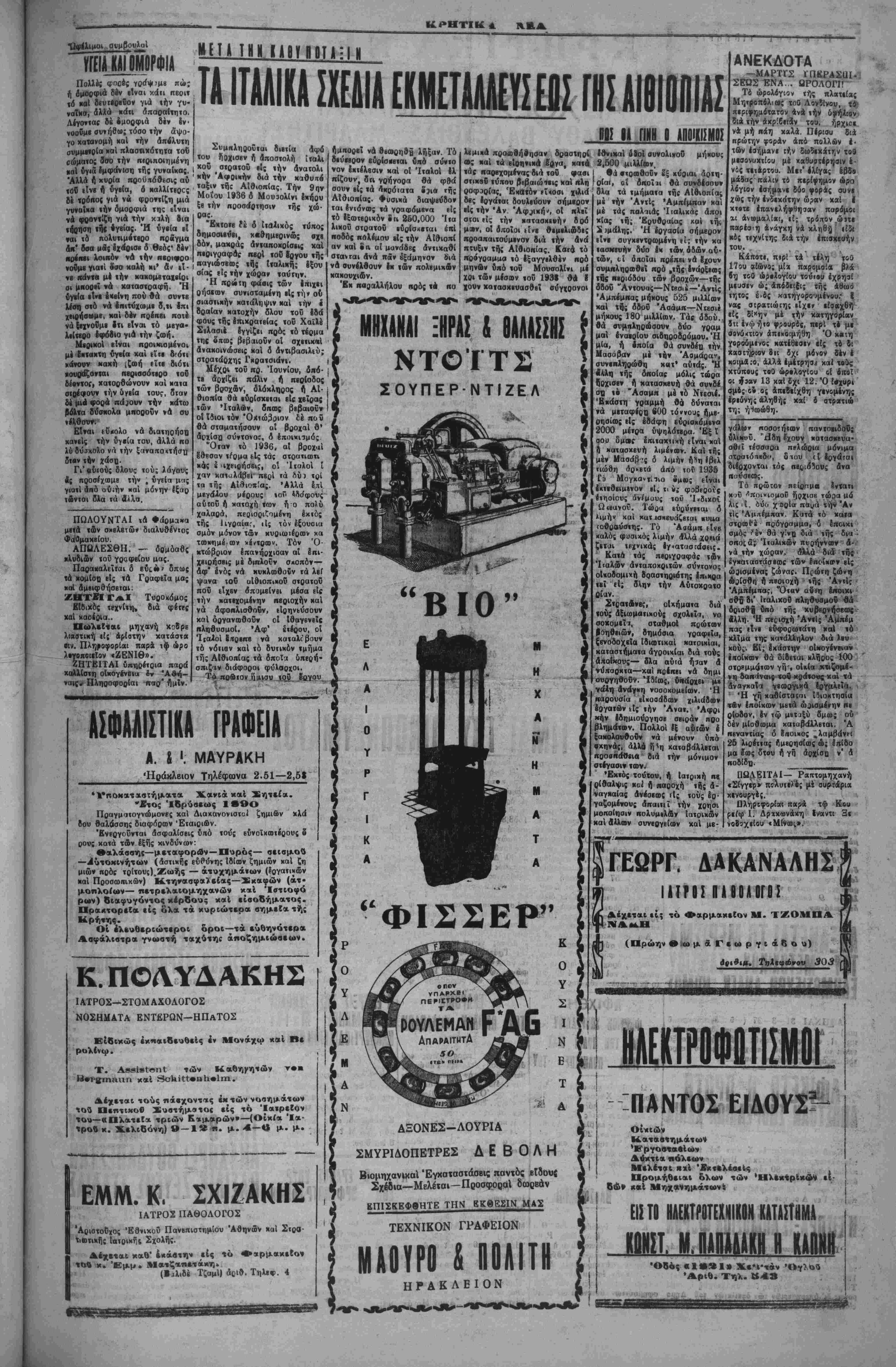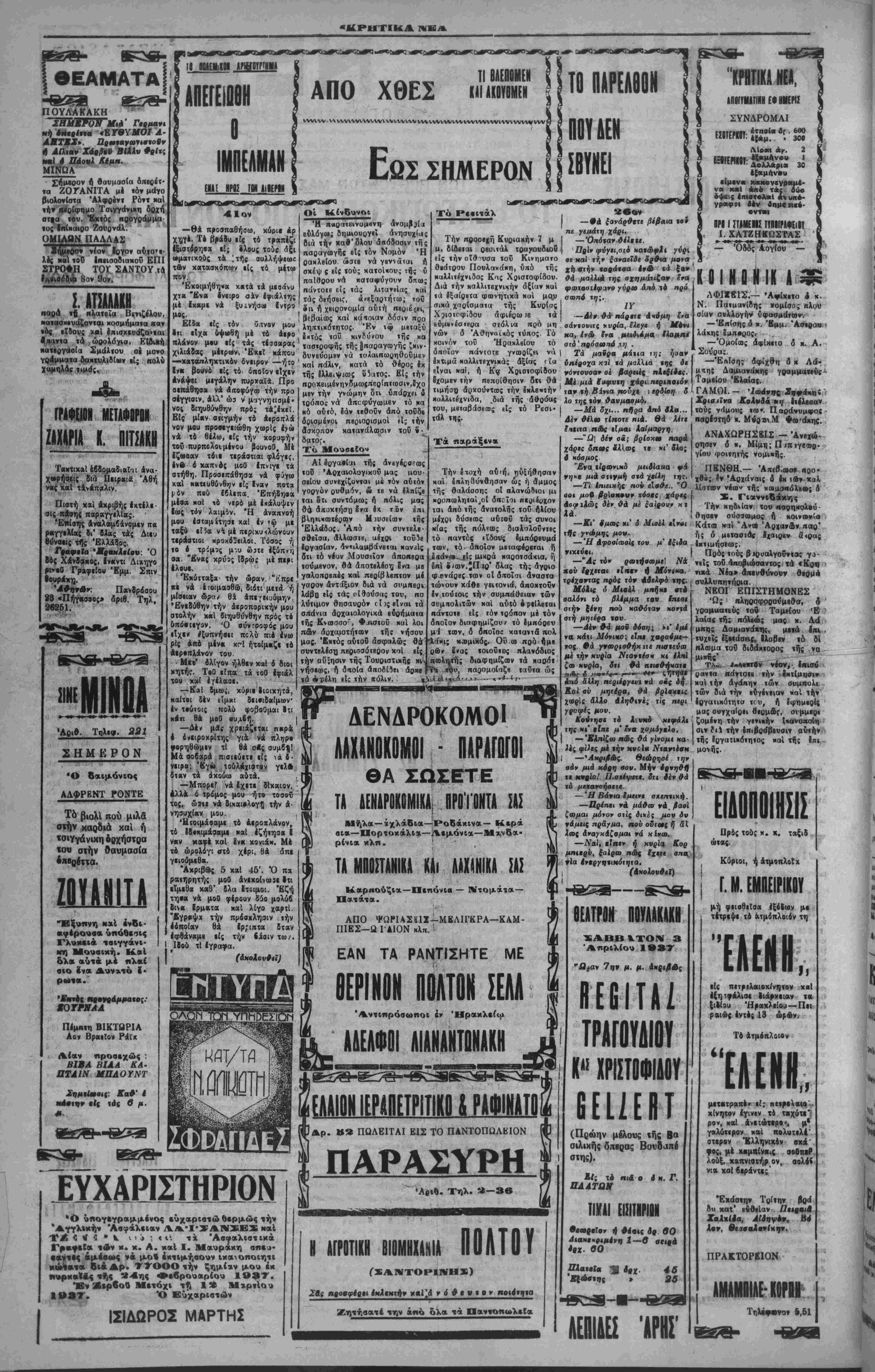 ΑΘΗΝΑΙ 31—3—37 (ΐοΰ <5ν.υ«οχς.«οϋ μας)Κΐθ' ά τηλβγρχρβϊτ ιι έκ Παρισίων μ<;γά λον σιδηοοδοθίχιχόν· δυοιύχημι Ιν Γαλλία ίση μειώθη την νύκτα χθές 'Η άαυξοστοιχίπ Μιτο^ντώ, Ικΐΐλοΰσα την γραμμήν Πιιοισίιυν — Μιταγιόν, ίξβτροχιάσθη πβρί ώ^αν 9 21 μ μ. εξο)θι τής πόλεως Ντάξ, κ<ιΐππτραφ ΐΐ-» παντελώς. Μίχρι τοΰ μβσονυκτίου είχον άναουοθό (κ ι ώ ν συνΐοιμμάτων τοϋ Ικτροχιασθέντος συρμοΰ οεϊ; νρχποί καί εβδομήκοντα πΧηγιομένοι. Έ τί τόπου καιίφθαβεν πλχίοε'ς χινητύν νοοο ν,ομίΐον Ιπ' αύτοχινήταιν μβΐά χει^ονϋγ»1ου, τό οποίον ποοέσχβ τάς ηρώϊας βοηθβΐας εί; τού; τοαυματισθ/ν άς. ι . ΟΥΑΝ ΛΠΟ ΩΣΣΙΚΙΙΙ ,ΙΕΡ ΑΙΑΤΙΙΟΡΕΙΤΑ ΕΛΕΙ (Α «ΥΤΙ ΑΘΗΝΑΙ 31—3—37 (τοϋ άνταποκοιτοϋ μας) — Αι* αναγκαστικοϋ νόμου, δημοσιβυθέν τος εί; τή» Ιφημΐρίδα τής «υβίρνήσβως αύξά V» ται τό μέρισμα τοΰ μβΐοχικοϋ ιαμβίου στςα «ου κρός τούς μβιέχους τού. ΑΦ (ΕΤΟ ΐ ΟΡΟΤΗ ΗΙΣΤΙΙΙΣΙΘΡΕΔΙΩΗΙΙΗΙΑ Κατά κληροφορΕα; έκ Χανίων διά τού κατ* ηλεύυαντος την π«ρ.Καρι«χήν ΒουλναριοοΟ ατμ° *ιλο(ου έχομΕοθηβαν 80 τόννοι αποριλαίου,διά τας «νκγχεις τοΟ|Νομοδ. Ι Ό τρίπος τής διανομής χον θά κανονισθή & «ό τ,ής Γ«ν. Διοιχήοιοος. II ΕΙΣΠΡΑΞΙΣ ΑΗΜΒΙίΟΜ ΦΟΡΟΝ 'Γπό τοθ 'Γπουργείου των Οίκονομιχών δίβτάχ θ'ηοαν ά Ταμίαι τοθ Κράτους βπω; εί^πράττουν Ιά βφειλόμενα πρ*ς τό Δημόαιβν τής χρήσει»; Ι9ί8—37 μέχρι τής 17ης προσιχοθς Απριλίου. Τό μέτρον τοθτο ελήφθη ίνα αποφευχθή ή έπιβά δι' ύΐτ.ερτ}μερι6ν ι ών δφειλετών τοΰ Δημο ΑΦΙΧΘΗ Η ΔΙΑ ΤΗΝ ΠΟΛΙΝ ΜΑΣ ΤΙΜΗ Η0ΑΗΣΕΟΣ ΤΟΥ της 'Ω, μα; άνβκοινώ^η ύ^ό Διοικήσεως Χαοοοφυλαχης χθησαν ιί; την «ό? ιν μας καί θά διαΐίθοΐν Ιντος τής Ιβδομά δα:, ύ<ιό την έπ'βλεψιν Άσΐυνο μικών δογάναιν, 20 τόννοι σπο ρελαίου. 'Η τιμή τού σποοεΑαί ου τούτου θά δοισθτι πέριξ των 30 δοαχμ&ν. ΟΙ ΒΛΙΣΦΙΙΜΟΙ Κατόπιν Εγγράφου τού φιλβστάτου Έπισκόπου Ρ«θύ μ>ης καί Αύλοποτάμου ή ΔιοΙ