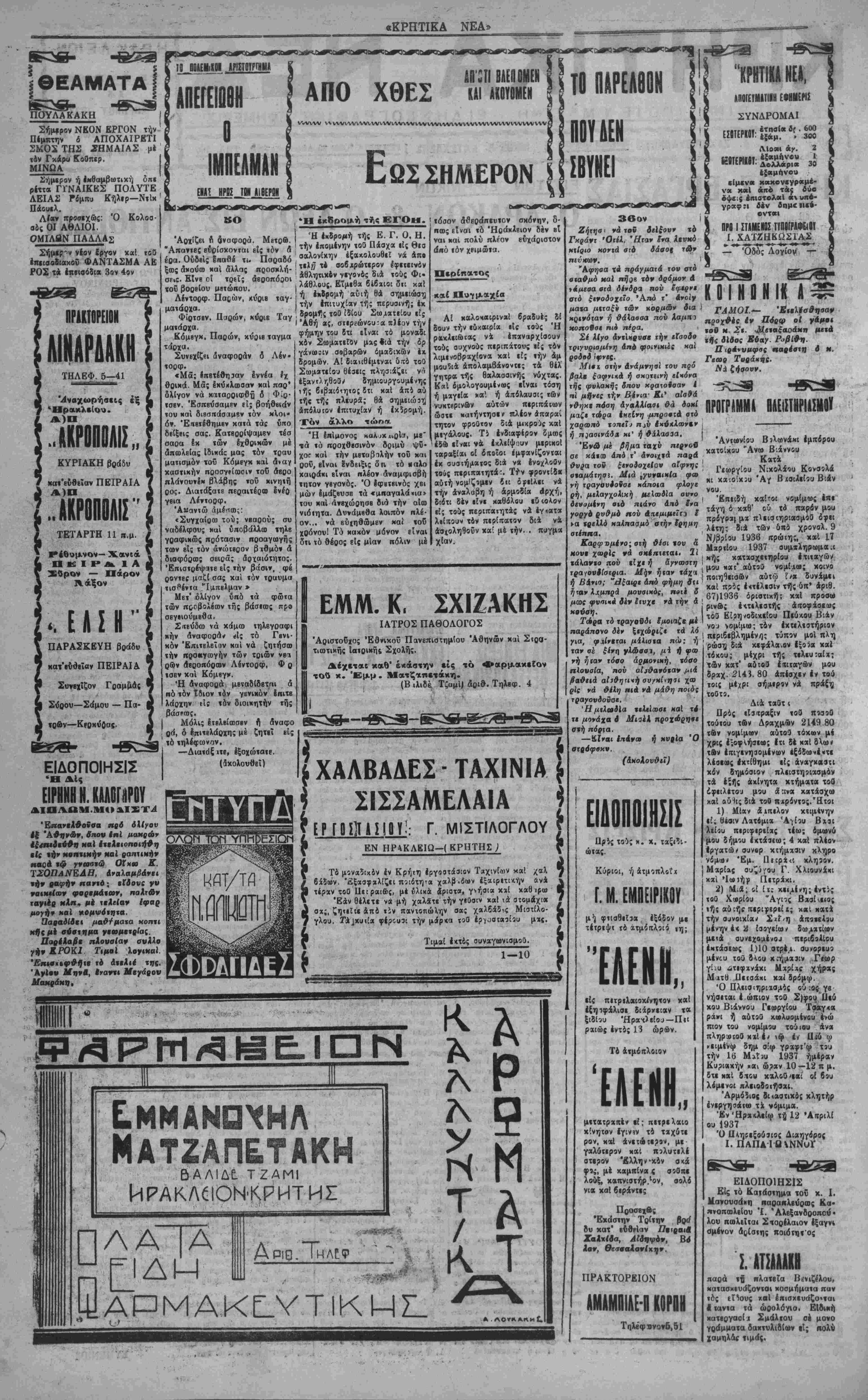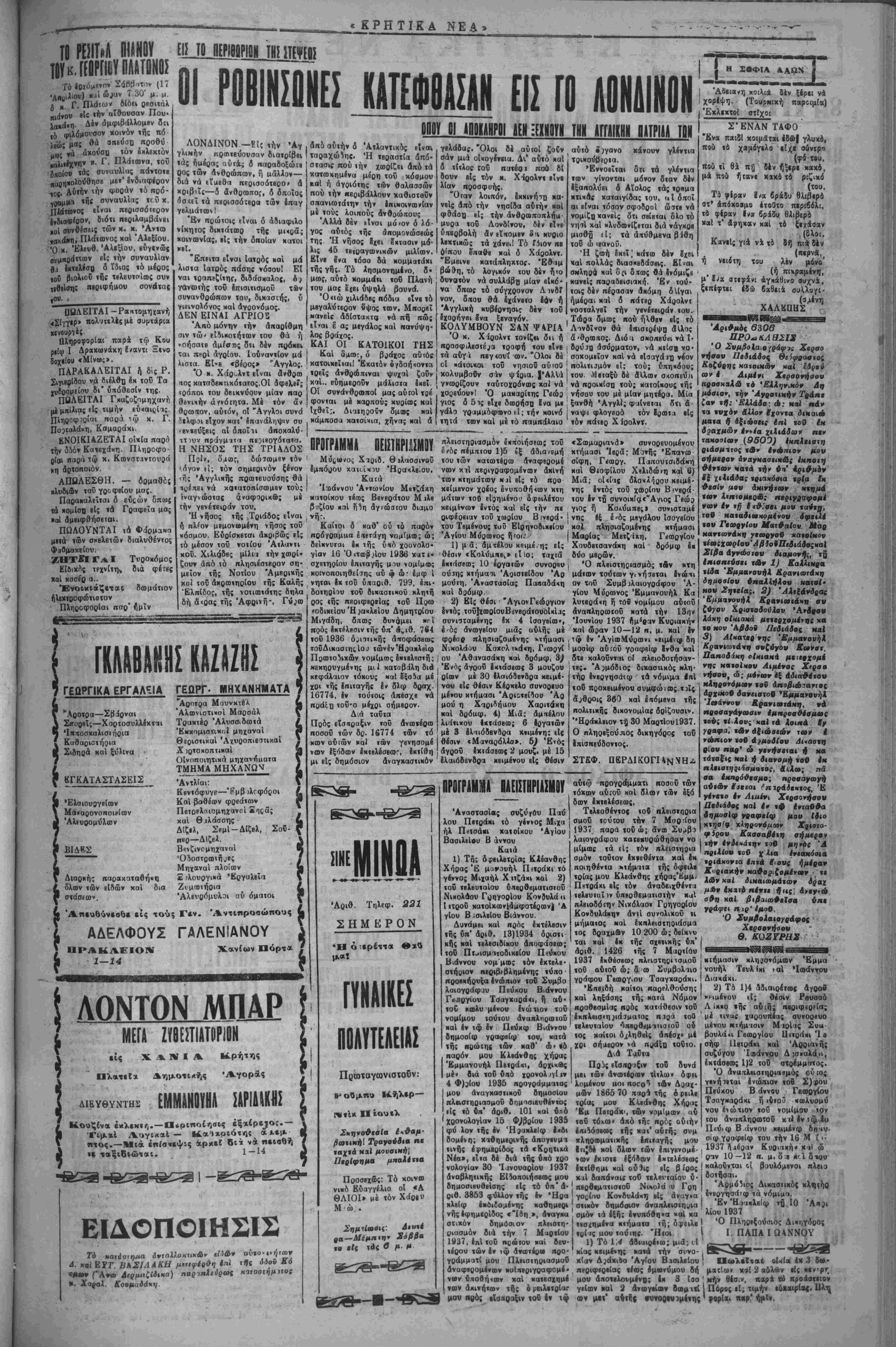 ρ.β'ων, 1<ΐα*τοι ίκϊόοει; των Πβριοινών έν-με ρΙΓων άνήγγειλαν χθές έσΐέρας είς χον Γαλλικόν λαόν 9 ΐι ή Αγγλία ϊτροποΓθίι,οιν τήν στάσιν της είς τό Ίσπανιχάν χαί ·τι αναγνιβρίζιι τόν ί αυθαίρετον άπβκλπσμον, τον ίιτιβχλλβμινβν 6πό , τοθ Φραγχο εναντίον των Κυβερνητικων λιμί ν»ν. Ή απίφαοις έ',ήφθη μετά πολύωρον ούοχι ψιν τοθ 'Αγγλΐχθϋ ΎπουογΐχοΟ Συμβουλίω, λί γεχαι^δ* δτι αφίχθησαν ή5η πχρα τφ Φράγκο ϊύο Άγγλοι άντιπρόΌιοποι δια τόν διακανονι σμόν τοθ άποχλεισμοθ. Έ Συαφορΐα έν Πΐριοίοις είναι ηρο^χνή;, τ,ονίζετσι δέ δτι ή Ά/γλία δέ» είναι ή μόνη χά» ρα πού ήμποριϊ νά Ματΐυθύνη τάς τύχας τ·3 Κοομβυ καί β» οί ΈργατικοΙ τί)ς 'Αγγλίας νο «) ίέν ϋβ δεχθοθν την άπέφασιν αΰΐήν. Η ΕΜΑΣ ΕΙΣ ΕΚΘΕΣΙΝ ΗΙΡΙΣΙΟΝΥΣΤΑΤΙϋΡΑ ΑΘΗΝΑΙ 14-4—37 (τού άντκποιιριτοθ — Κβτα τηλεγραφήματα τβν Γαλλΐχων ΙβημιρΙϊων έχ ΒιρολΙνου, την 20ην τρέχοντος, Ιπέτιιβν τ·ν γενιθλΐων τοθ Καγχιλλαρίοϋ χίτλιρ, έ ΔοάβενΙβρφ β* άν«»τ,ρυχθ2 οιραΐίρχης τβθ Κατά πληοοφοο(ας έκ Παρι σίων ηοό; τό ύφυπουογΐΐον Τύπου χαί Τουοισμοϋ, τα Ιγχαί νια τή; δΐϊθνονς ίκθέσεοις των Παοισίων #ά γίνουν την 2<ιν προσεχον; μηνός Μ.ΐ)υ, ή τί σοδος δμως είς τό κοινόν θά έπιτοαπη μόνον <Ίπδ τής 12ης τοΰ ίδίου μηνός. Έν τφ μεΐαξύ αί ά;μόδιαι ύηηοβσίαι τοΰ ύφυ- «ουογβίου Τύπον καί Τουοι ομού συνεχίζουν την Ιογασίαν, διά την δσον ένβστι άοΐιωΐϊθαν εμφάνισιν τής Ελλάδος είς την 8*θβσιν τούτην. Καθ1 & ήγγίλ- βη έκ Παρισίων τό ελληνικόν πβοίπτεοον πεηατοϋται ίντός τής αρξαμένης εβδομάδος καί Λοχίζουν αί «σωιεοιχαΐ αύΐοΰ διακοσμήσεις. Διά τήν ίξοοτεοι χήν διακόσμησιν δ ζωγράφος χ. Παρθένης κατόπιν βντολης τον ύςρυπουογβίου έοχβδίασβν ίνα πίναχα, δστις συμβολίζβι τό ηνεϋμα τό οποίον Εξβπήγα- σΐν έκ τοϋ άναιέλλοντος έκ της Άκοοπόλεω; ηλίου καί έφε&τι οΐν δλον τ ν κόσμον, μέ πιοα στάθΒΐς έ/τίσης τώ/ διαφόρων αγαθών δυνάμβων καί έν ουν δυασμφ πρός τα μνημίΐυ καί «ά τοπία τής χώρας μα;. Ή ιΙ«ών οίηη της δηοΐυς τα σχίδια παοηκολούθησβν 6 ΰφυ πουργός μ. Ν χολονσης καί 6 διευβυνιής τού 5φυπουογβίου κ Α«<<α, θά ««(«λυθή δτ5 ιίδι κων Γάλλων χαλλιτεχνων έν Παοισίοι; τϋ έποπιε α τοΰ κ, Πιΐοθένη, θά καταλάβο δέ τό ύιτέρθυοον τοθ πβοιητέοου καί θά συνδυασθή ποός τό πρό τον πΕοικτέρου ιοποθειηθησόμινον μέγαδ/ΐιλμα τοΰ Άςτιμισίου Διός τό δΐτοΐον κιιιασκευάζίΐ β κ. Ζιλιβοόν είς τό άρχαιολογι 'Βπίσης ίιοιμάζονται είς τό «αθασχβυαστήοιον τοϋ μουσβί- ου άιεό ιίδικά συνβογίΐι ποο- πλάσματα τή; Αθηνά; τή; Ά- χοοπδλε»;, της κβφτλής τοΰ ίφήβου τοΰ Παρθβνβνο;, της κεφαλής τοΰ Διός, τής κβφαλής τής Βέρενιχη; καί τοΰ κατότ- τοου, τα 6/ιοΙα θά τποσταλ· λοΰ', ϊό βκτεθοΰν «Ι; τό Ελ¬ ληνικόν πεοίπτερον. Τα συγκεντροοθέντα έξ αΊλου διάΊροοα ένληνικά β.θίμαια ύ πβθ0 γίνουν τά ΐ50 χιβώτΐίΤ, μβ ταξύ των διτοίων πεοιλαμβίνον τοι ιιίνακες Έλλήναιν ζοογοά φοον, πβ(}ί τά 10 γλυπτά Ιογα νλυητών καί μβγάλη ποικιλία Ιογων λοϊ ής τέχνπ; τά Απόϊ« «ά χΊταλάΡουν όλόβληοον τόν ϊ'π δ ;οφον τοϋ πεοιιττβοου. ΕΚΑΡΰΜΗ ΟΡΕΙϋΤΙΚΙΥ Κνοιακή 18 Απριλίου Άρχάνβζ — Έπανωαήφη — Χουδέτσι Συγκέντρωσις 6[ς <α γοαφίΐα Η ΠΕΡίΟΔνΓιΑ ΤΟΥ ΒΑίΙΛΕΟΣ ΕΙ! ΠΟΛΕΙΣ ΠΕΑΟΠΟΗΜΗΪΟΥ { ΣΥΝΕΙ'ΖΕΤΑΙ ΟΡΙΙΜΙΕΥΙΙΙΙ ΑΘΗΝΙ 14-4-37 (τοΰ άνταηοκοιτοδ μα;( —· Τηλβγοα Φβϊται έκ Πελοπονήαον, ύΐτό τόόν άΐΐίστιλμίνοΒ / τβν Άθη ναϊίών έφημε.ί^ον, δτι *, κιοιο δεΐιι τού Β σιλέοο; άνά τάς δια φόρον; Πελοποννη κακάς πό λεις συνεχίζϊται θοιαμβευτικη Έχ Πΰονου, Ι/θα τοϋ έαεφύ λάχθτ) χθέ; ·ό/τό τβν κα»οίχ«/ μβναλβιώ!>η; ΰ/ΐοοοχη, ή Α Μ.
