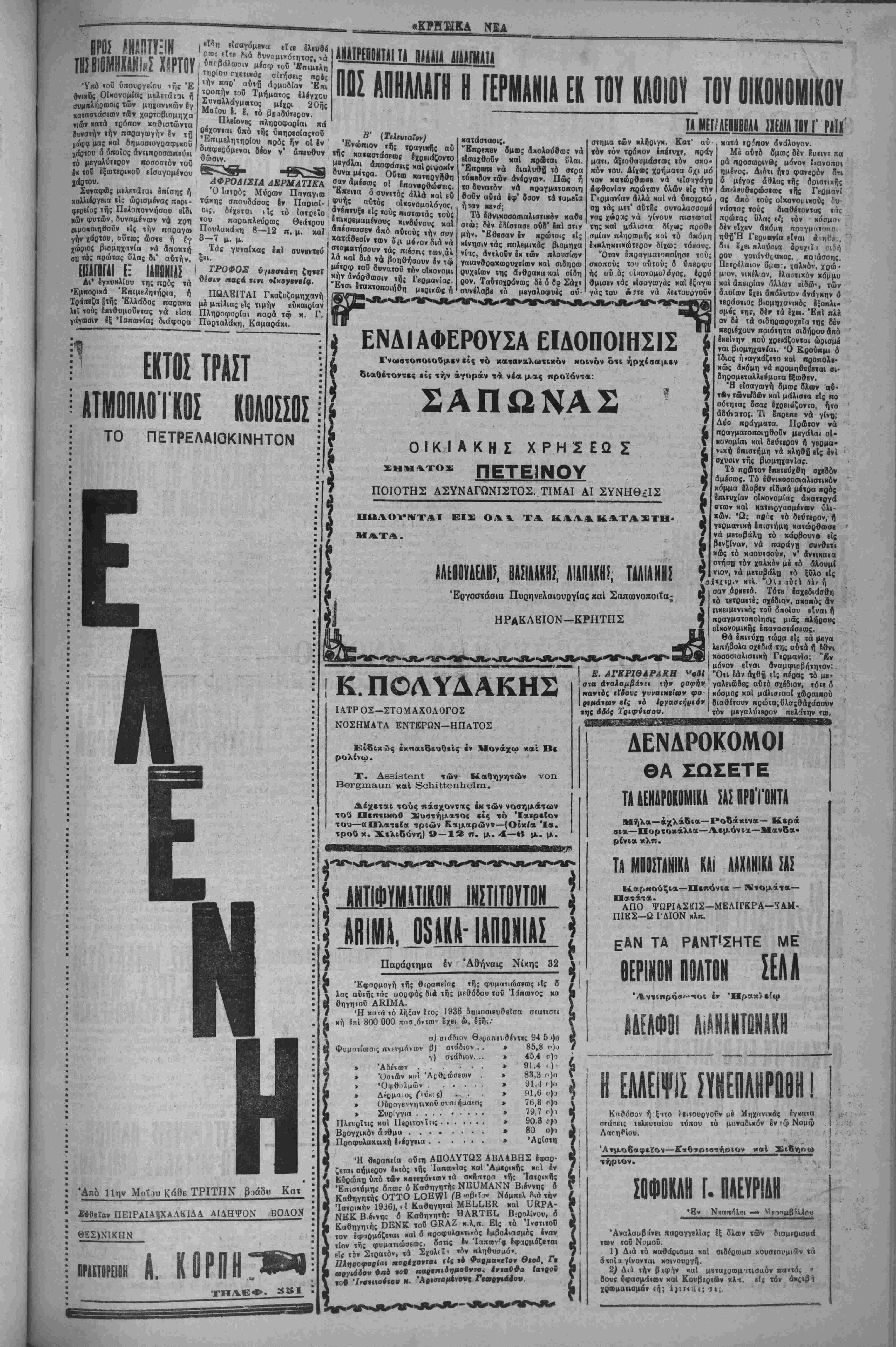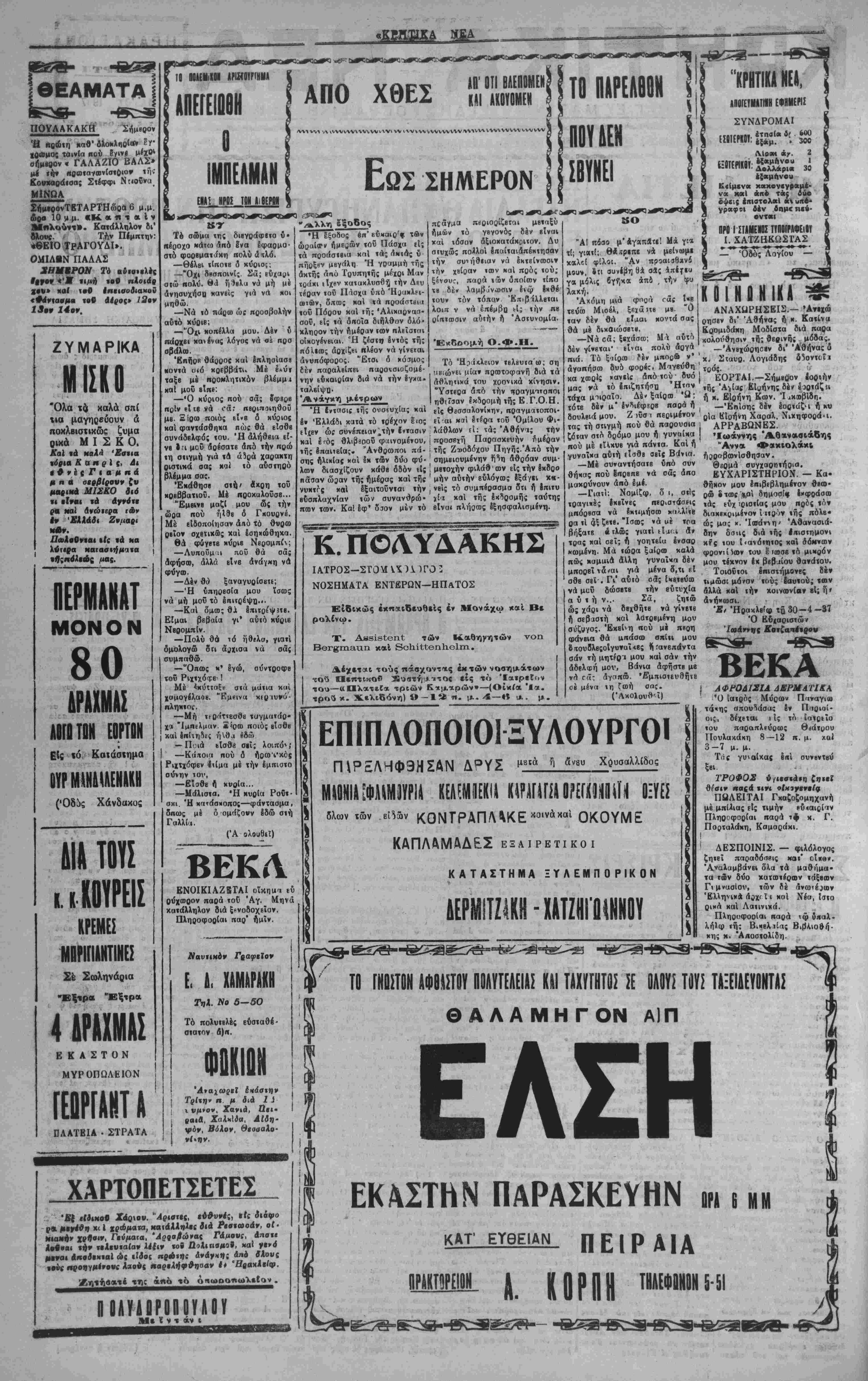 Ε< Α. ΚΑΜΑΡΑΚΗ Γηλ. Νο 5-50 Τό πολυιβλες εύσΐαθέ- σιατον &)η. { Αναχωρεί Ι Τρίτην π μ διά υ τ νμνον, Χανιά, Ζ2ει· ι οαια, ΧαλκΙδα, ΑΙδϊ)· ! ψόν, Βόλον, θίοααΧο- ΑΠΟ ΧΘΕΣ ΑΒ' ΟΤΙ ΒΛΕΠΟΜΕΝ! ΚΙΙ ΑΚΟΥΩΜΕΝ ΛΛΛ νν< Λ » νν V νν ννννννννν/νννν νννν νν ΛΛ ννν ΙΛΛΙ ( ΤΟ ΠΑΡΕΛΘΟΝ «ΟΥΔΕΝ Εωσ σημερον 11 σβυνει ΚΡΙΤΙΚΑ ΝΕΙ, ] ΑΠΟΓΕΤΜΑΤΜΗ ΕΦΗΜΕΡΙΣ ΣΥΝΔΡΟΜΑΙ | . ετηοίβι δ( 600 */-λλη έξοδος Ή εΊοδος βη' εύ*αιθ'« τβν ώοαία·ν ημερών τού Πάσχα είς τα κοοάστβια καί τάς ιικιΑς ύ πήοξβν μβγάλη Ή γοαμμή τής άκτής άπό Γουπητής μέχοι Μαν τοάχι ιϊχβν χατακλυσΰη' την Δβυ τέραν τοΰ Πάσχιι υπό Ηρακλει¬ ωτών, όπως καί τα προα,στβια τοΰ ίίόοου καί τής Άλιχαοναα- σοϋ, εί; τα δηοΐα διηλθπν δλό· κλήρον την ημέραν «ών πλείσται οικογένειαι. Ή ζίσττϊ έντός τή; πόλεως άοχιζβι πλέον νά γίνεται άννπόφοοος. Έτσι ό χόσμος £έν παοαλβίπβι παοοισιοζσμέ- νην ευκαιρίαν διά νά την Ιγχα. ταλείψυ· Άνάγκη μέτρων Ή ίντπσις τής θνσ«υχία; καί έν Ελλάδι κατά τό τύέχον έΊο; είχεν ώς συνέπειαν ^τή* έντασιν χαί Ι 'ός θλιββοοϋ φαινόμενον, τής §παιιε(ας« Άνθοωποι πά¬ σης Γ)λι«ίας Μαί 1» τδν δύο φύ· λων διασχΐζουν κάθβ οδόν «Ις πάσαν ώ^αν τή; ημέρας Χαί της νυκτΓς «αί έξαιτοϋνΐαι την εΰσπλαχνίαν των συνάνθρω¬ πον των. Καί Ιφ' δαον μέν τό μβταξύ ημών τό γβγονός δέν είναι χαί «όσον αξιοχατάκοιτον. Δυ σιυχιός πολλοΐ έηαίταιαπέχτηοαν την συνήθειαν νά εκτβίνοοσιν «ήν χβίραν «αιν «αί ποός «ού; ξβνους, παοά *ών δ ποίον ν τί«ο τβ δέν λαμβανακΐιν ίιφ Ικθέ τουν τον τόπον Έπιβίλλβίαι λθιπ ν νά έπέμβα είς την ηβ ρίπτωσιν αυτήν ή Άστυνομία. 'Εκδοομή Ο.Φ.ΙΙ. Τό Ηράκλειον τβλβυταω, ση ιιβιώνει μίαν ποαποφανη" διά τα δθληΐΐχά τού χοονικά κίνησιν. "Ύστβοα διό την ποαγμιιοτοι πθίΓοαν Ικδοομτ) της Ε Γ.Ο.Η. είς Θ«σσαλονίκην, πραγματοποι- εΐαι καί εχίςα τοΰ Όμίλου Φι· λάθλων τί: τάς Άβιίνΐί την | ποοσβχή Παοασκβυήν ίμέ()αν ι τής Ζ»οδόχου Πηγής,Άπό την ' σημβιουμβνην ή^η αθρόαν συμ· μβτοχήν φιλάθ'ων εί; την δκδςο ' μην αυτήν εύλόγως ίξάγει χ«- ι νβίς τό συμπέοασμσ δτι ή Ιπιτυ χ£·» χαί τή; έχ^ρομής ταύτης βΐναι πλήοως εξησφαλισμένη. Κ. ΠΟΛΥΔΑΚΗΣ ΙΑΤΡΟΣ-ΣΤΟΜ VI)! )ΓΌ : ΝΟΣΗΜΑΤΑ ΕΝΤΕΡΩΝ—ΗΠαΤΟΣ Ειδικώς έκηαιδευθείς έν Μονάχω καί Βε ρολίνω. Τ. Δβδϊβίθπί των Καθηγητών νοπ καί Δ έχεται τούς πάσχοντας έκτών νοσημάτων τοΰ αεκτικοθ —υβτήΐίτος είς τό Ιατρείον τού—«Πλατιία τριών Καμάρων*—(θίκία Ία. τροΰ κ. Χελιοόνη) 9 —13 η. μ. 4—«Λ υ., μ. "ΑΙ πόαο μ'αγαπίτε! Μά για τί; γιατί; Θά,τριπε νά μβίνωμε χαλεΕ φ'.λοι. "Αν προαΐίθανί μουν, ·(( βυνέβτ] θα οβς άπέτιυ γα μόλις 6γτ]κα απδ , την φυ λακή. Άχόμη μιά φοοά <"άί 1«Β τεύω Μιοέλ, ξρϊαπβ μβ "Ο ταν δέν θά εΐααι χοντά σας θά μβ δικθιώσβτκ. —Νά οά ξβχάσσ); Μά ουτδ δέν γίνεται' είναι πολύ άογά πιά. Τό ξιίρ(θ ?βν μποοίδ ν' άγαπήσω δυό φοςές. Μαγεύθη κα χαιοίς «ανείς άπό τού δυό μας νά τό επιζητήση Ήτην τάχα μΊΐςαϊο. Δέ* ξαίρ,οο Ώ; τότε δέν μ* έν^ιέφ^οβ παοά ή δουλβιά μου. Ζ)ΰσ; πεοιμένον τας τή στιγμή πού θά παρουοια [ζέταν στπ δρόμο μου ή γυναίκα πού μέ ίΐνΗυβ νιά πάντα. Καί ή γυναΐχα αυτή Είσθε αβΐς Β^>ιο.