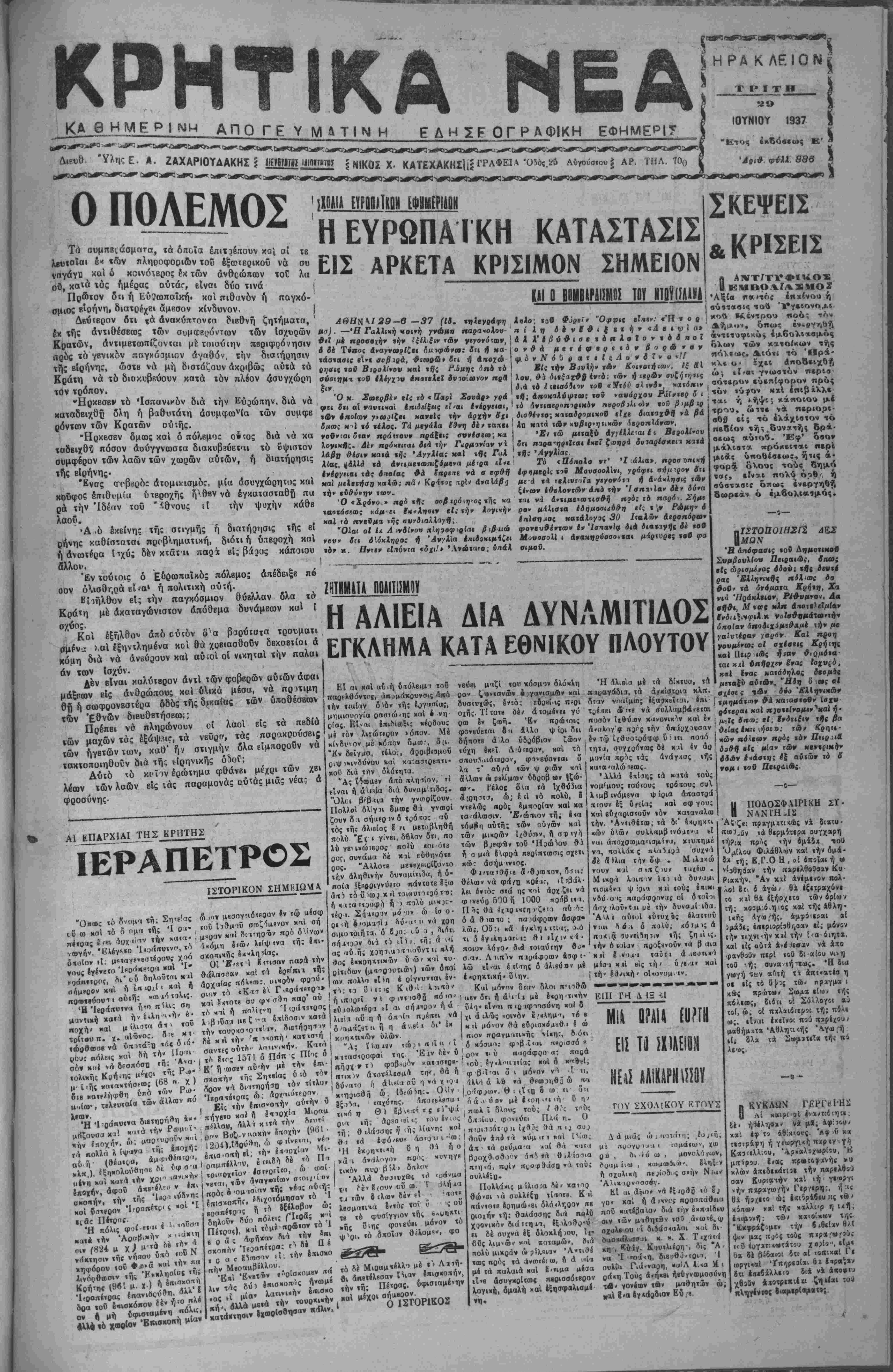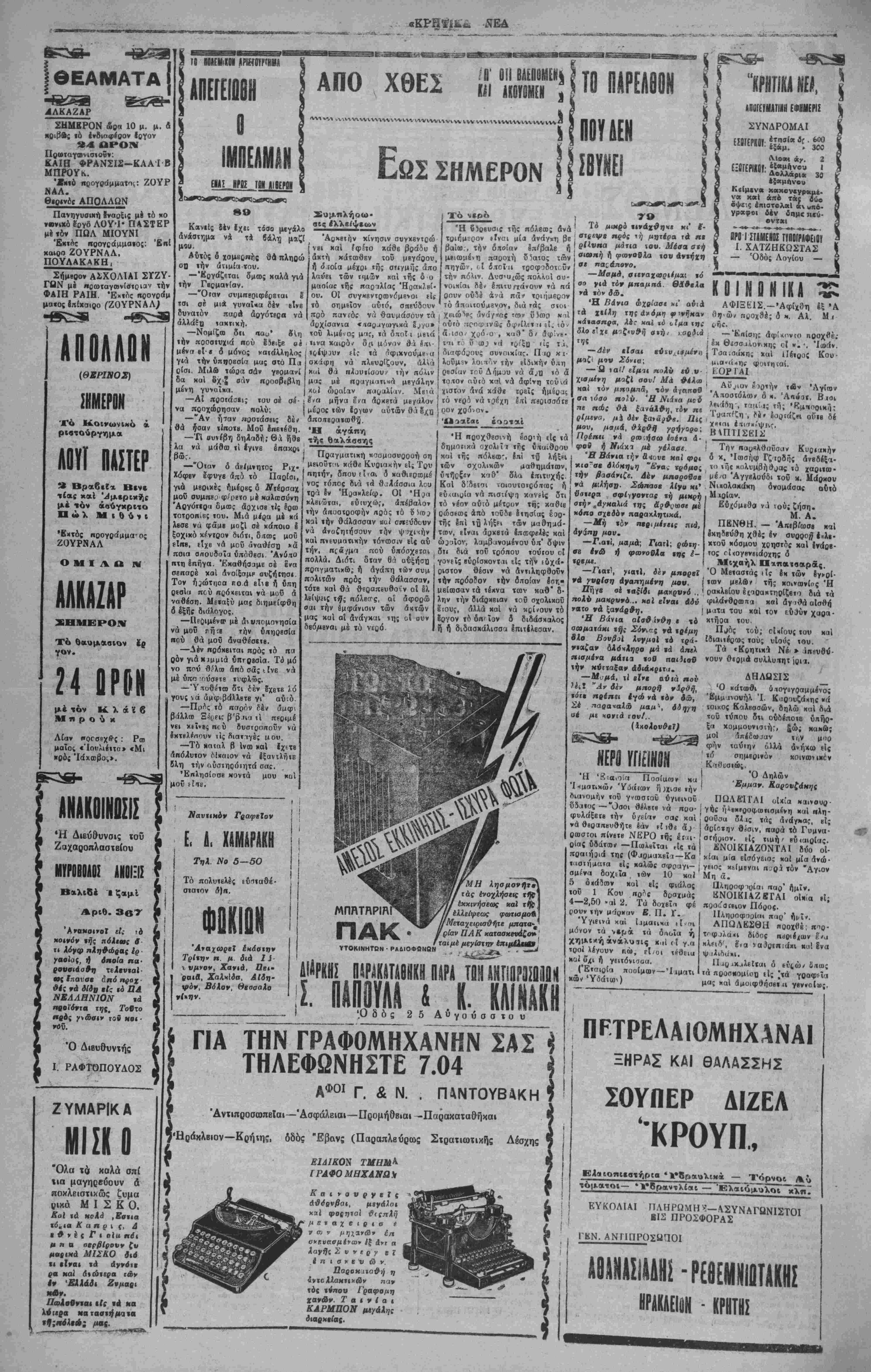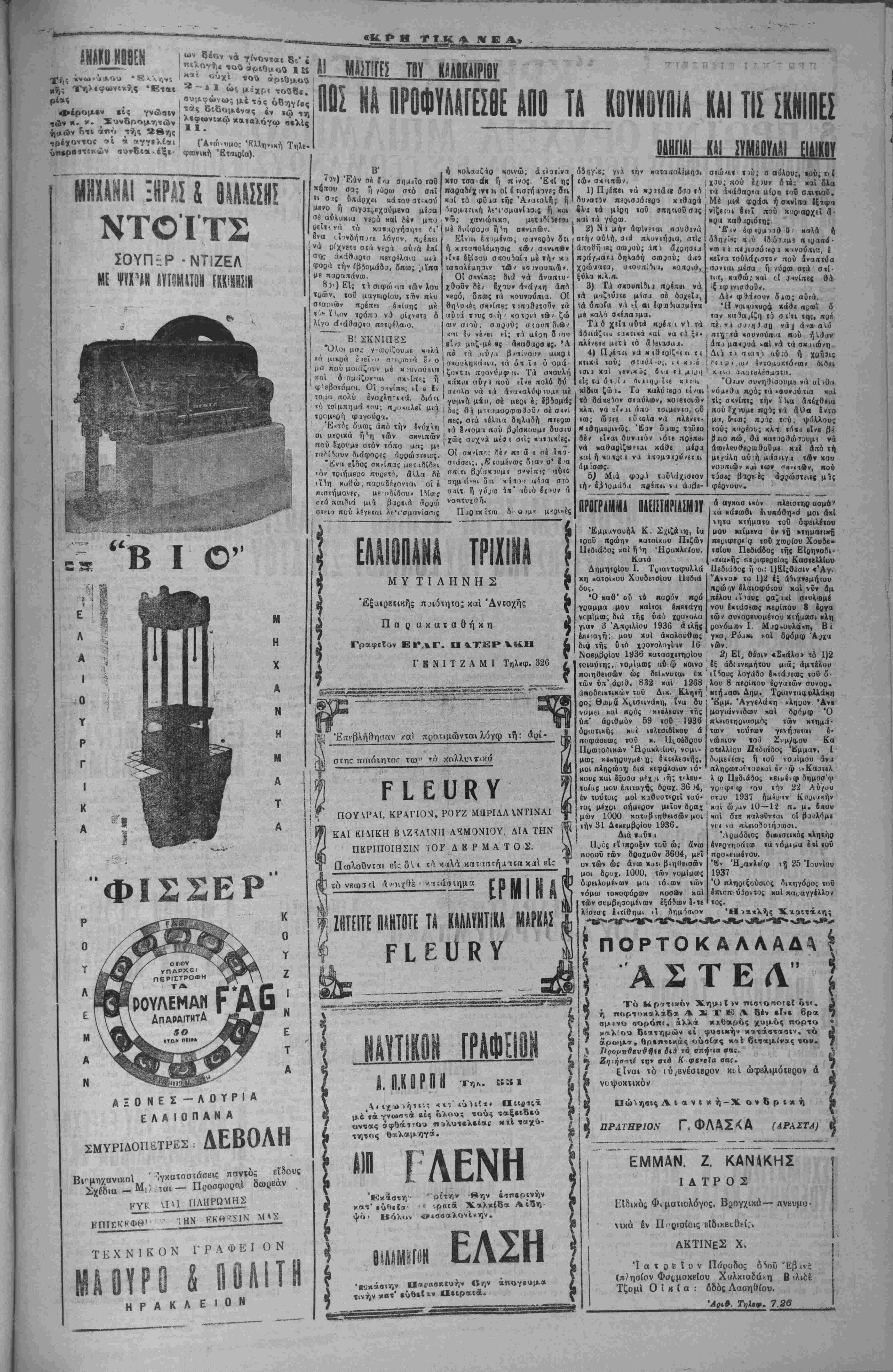 πβοιΐβαλλον οί 19ύνοντ6ς έ<άστο τε «ά «ου ποοσκοπισμοϋ τή; πόλεώς μας. Έν τούτοις ή λύπη μου αΰ τη μετςιάζ«ται άπό «ήν σκέψιν όιι τί ίδεολογία «ου ποοσκοπι· σμοΰ έ'χβι εί; τάς «άξει; της νί· ου; παλλομίνου έ·ένθουσιασμοϋ Ηαί αύία'ταονήΐβωί, δποΐοι ιί ναι οί 8ι«νθύνοντ8ς «ήν κίνησιν .ΑΡΑΤΑΣΙΣ, ΕΙ!Α[0[|αΟΥ_Ε:ΑΜ«ΗΟΥ Δι* άπσφάσεω; «ών ύασυρ γών _θπκ0; Οίκονσμίας καί ΟίκονομΐΜών. ή ίσχϋς τού τρέ χοντο; είσαγογΐΜθ# εξάμηνον (Ιανουάριον—'ϊρυνίου(, ηα ρετάθη μβχρι τής 20ή; Ίου λίαν. νιαΤνομοιοτησισ ΤΟΥ ΑΡίΙΰϊ ΟλΓΟΥ Ό "Αρβιος Πάγοί ίιά γνω ματεύσίώ; «ου άίτϊ(/οίνθ»7 δεί 4 Κ' Συνταγματική Πράξις π« οί διαλύσεως «ών δημοσίου παλληλικών συλλόγαιν, δέ» έ χ»ι εφαρμογήν π^οχειμένον «β ρΐ δικηγ^ρικών καί συμβολαιο δ σνλλογον. ΕΙ; «ο Πολιτικόν φ τοΰ κ. Π^ωθυηουογοΰ έαΐάλη π ιν ττιλβγοαφήμοτα των Γβωο γικών συνβταιρισμβν ΙΙισκοχβ φίλου κιί Β ιγ.οο/ιά; Ή^α<λ=ί ου "δι' ώ/ διαδηλοϋται ή ευννοο μοσύνη «ώ» άγοοτών ύνέο τή; Κυ3β(}νήσεοπ; διά «ήν οόθαισιν ιοΰ ζητηματος «ών χοεών των Ο ΣΗΜΕΡΙΝΟ! ΗΙΙΙΟΣΦΑΙΡιΚΟΣ ΑίΟΚ Σήμεοον «ήν 5ην απογευμα¬ τινήν θά λάβη χώοαν ιϊ; «ό νή* πβόον €Χάνδαί» δ τοίϊος Πό δισφτιΐοικός ίγώ/ τοΰ «αοτι θλήμιιος υεθιόδου 1937 μετα ξύ «ών δμάδων Ο.Φ Η καί «Εθνικον». Τόν άγώνα θά δ χ. Χατζόπουλις. ΗΑΡΑΐΐΟΦΪΙΡίΙίΙ! Μ1Ο1ΤΟΥ ΕΜΗΟΡ. 2Χ.ΑΗΣ Την παρι^θοϋααν Κυριαχή' έιβλέσθησαν υ( ίΐησιαι έξβτά σβις, επί χϋ] «<ί;βι Γά»ν μαθημά των, «η; Δημοσία; 'ΚμκοοΐΝη; Σ(θλή;. Είς τάς βξβιάσβις πιοέ στηοαν οί γονβϊί καί «ηΐβμ'Όνβ; των μιθητών καί πολλοί ίιιίση- μοι. Τπ5 ιοϋ Γάλλου Πρέσββω; παοασημοφοοτΐθΐ) δ άοιστβύσας μ»θηιή{ Ββνιζέλο; Μ. Τζανά χης. 23-6-37 (ου Λ μας).—Ή άναμβνομέντ) μβτα τόσου Ινδιαφέρο* τος ΒιβιταακΓ) άβοο.τοσκή β.τί5βιξι; έ/ένετο Ι Χς Ι ΕΙ; ταύ:ην ί^ ιβον μέ^ο; 460 έν συνόλω *αι νουργη Άγγλκά ίεοοπλάνα, τάς επι ίβίξβις δέ παοη«ολού3ησ8ν καί δ ί5ιος δ Βισιλβύς. Έ!) ιυμΐαβη !) π).<5ιη$ τοιΐ πι^ »σ«υιζαμ4· νού 4Κ·<)3 κ ιί ή τι<ύ:η; «ώ» β ιμβιυϊιατκά)» ' ααοαιάιοοι, ή δ«οί·ι ΰιβοίβη πά υ ν ποοσδο* «ίαν. Βίβ ιπνιαι 3<ι μίχοι τέλουε «οίχαντο; Ι· «ούς ή Αγγλία θά δΐ'ΐθέτη καινουογή άβοοπλά- νο 2000. II ΑΣΚΗΣΙΣ ΤΟΥ ΕΑΕΓΙ01 ΔΙ' ΑΓΓΑΟΓΑΑΙΚΟΝ ΣΙΑ- ΦΟΝ.-ΤΙ ΑΕΓ1ΙΝ ΙΤΑΛΟΙ ΑΘΗΝΑΙ 29—6—37 (ϊοΰ (5ν«αη;ο«·οιτοΟ μ<ι^. —Ό Ίιαλΐϋά; ιύ.ιος, άαχολούμβνος δια μακρών μέ την ά«όφιθιν «ή; 'Αγ/λίας καί Γαλ λία , δ τω; διβξιίγου» δι'Ιδιχων »ων σκαφδν «όν ίλϊγχον βφ* δλ-ν τδν Ίσ,τοινικδν «αοα· λίοον, λβγβι δίΐ «οϋτο άποΐβλβϊ μίιν καθαοά* νίκην «ής Ρωσσίας. Έφ' δσο» δμω; βίσάγονται ξέναι Ι«ιοροαΙ , Ι ηζηΐ^βϊα ^ς Ευρώπης χοΐ ή Ί 2 λ α Γ"}Ι*αν·α δέ» τΜΐυροΰν νά συνΒογασβ Βιά «ήν Ειρηνικήν λύη» την π0οβλημάτ·ν ΗηεΙρου ανΐής.