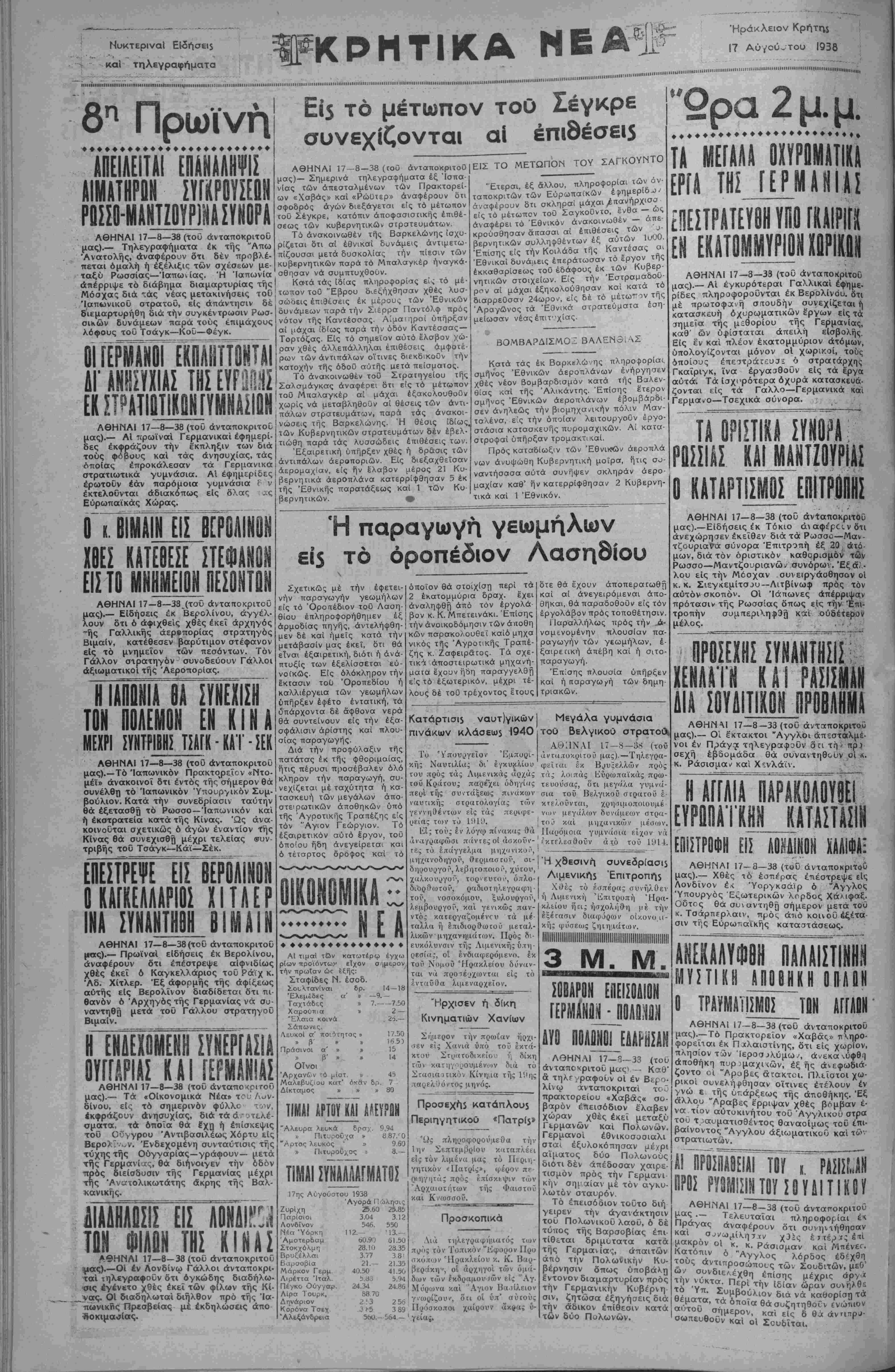 ΑΘΗΝΑΙ 17—8—38 (τοϋ άνταποκριτοΰ