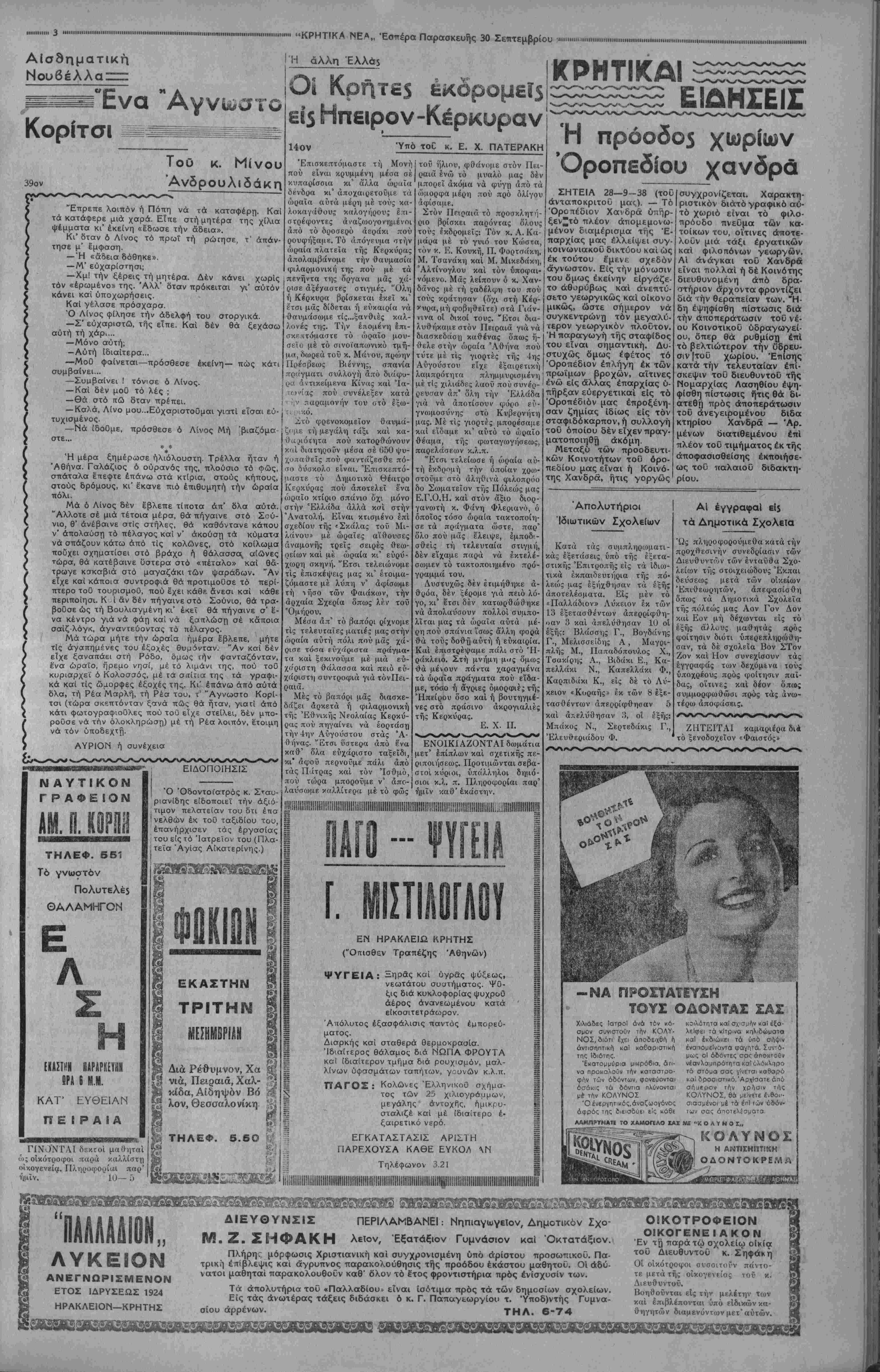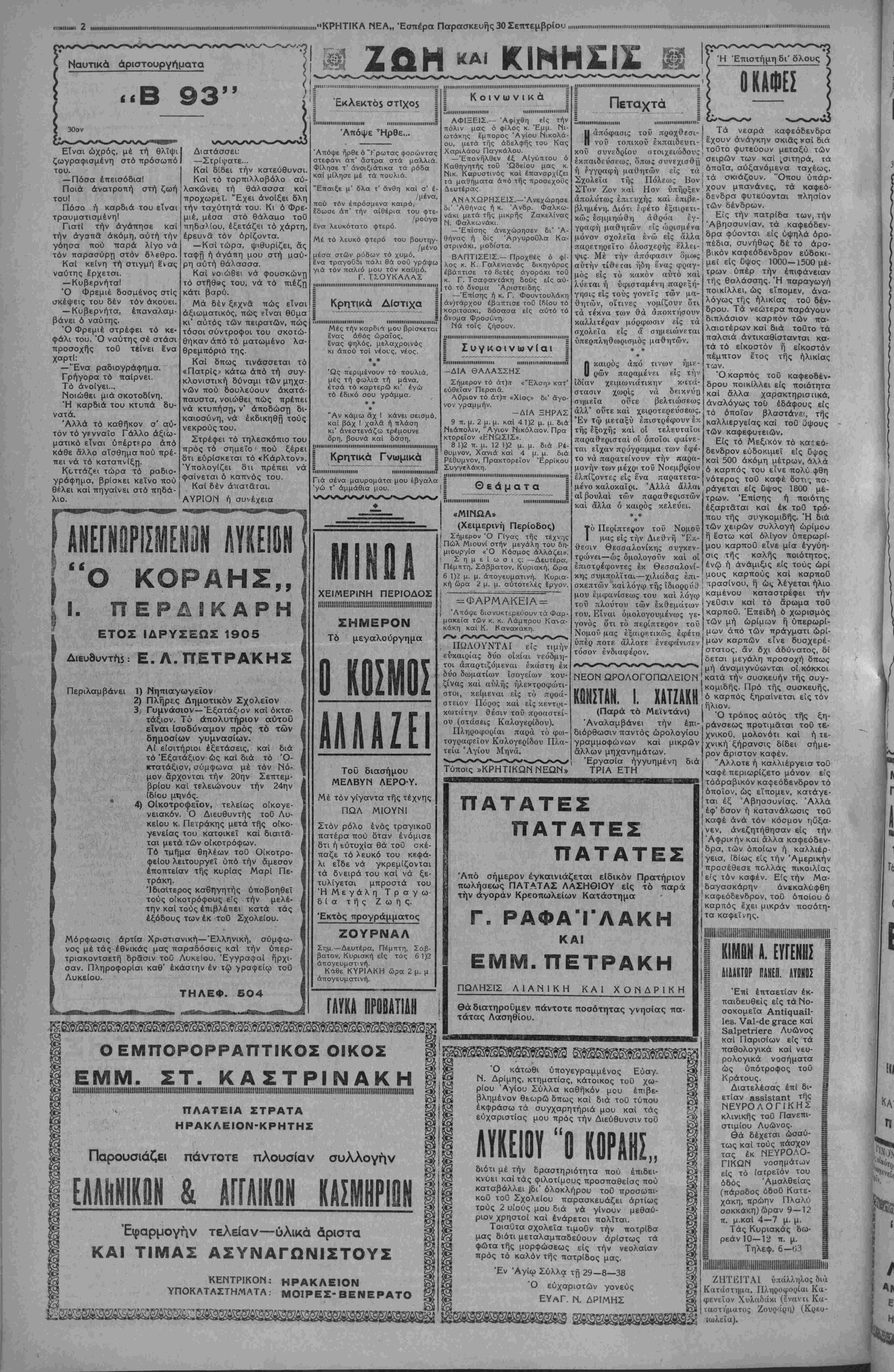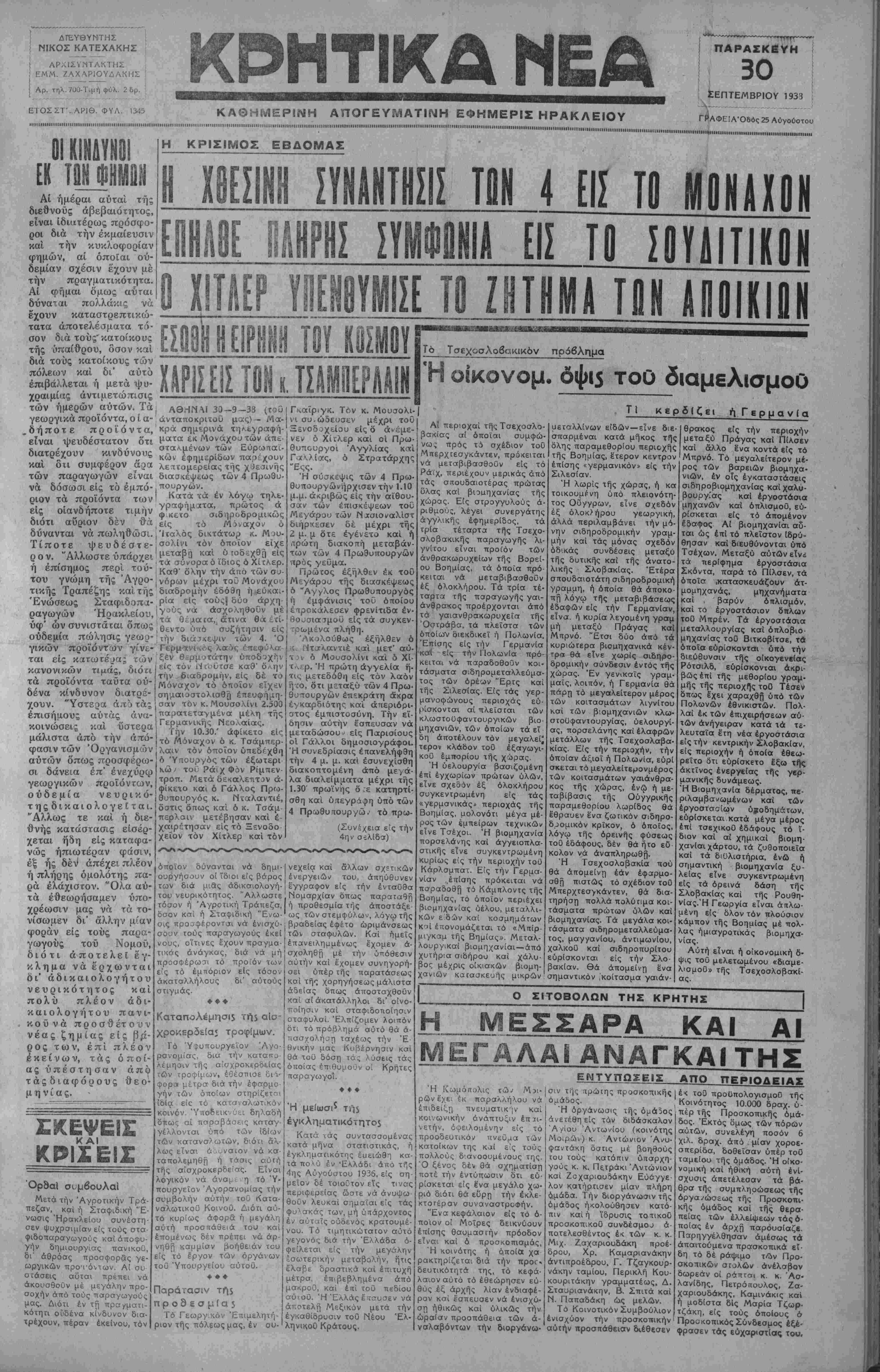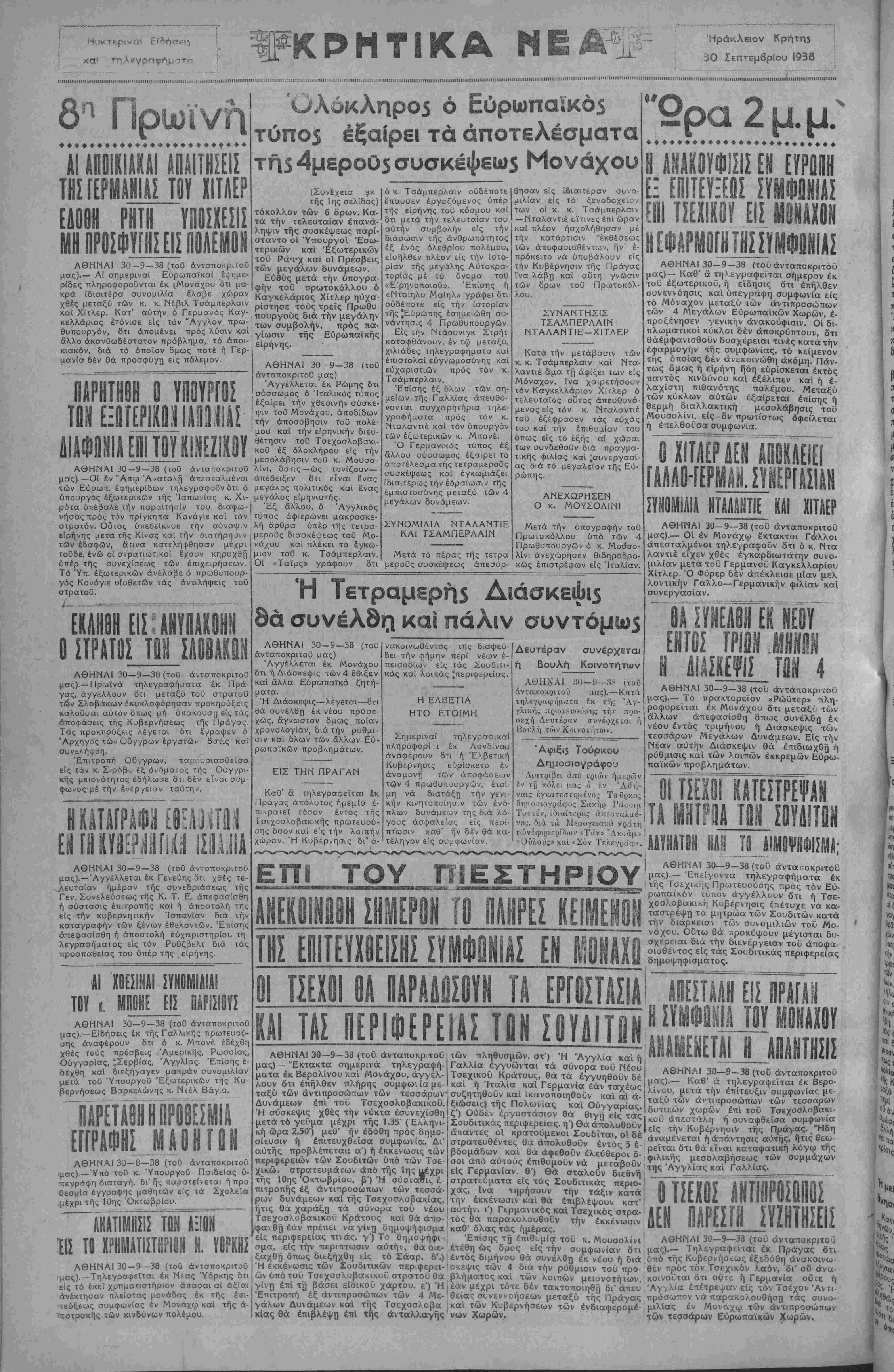 Σταφιδοπα- Ρία ε1ζ του^1 δύο <*ΡΧΜ- Σταφιδοπα Ρ ς ς) ρχη Ήοακλείου,ΐν^ς *« άσχοληθοΰν μέ ' τα Ο^ιιο: τα. άτινα θα^α- Ενώσεως ραγωγων υφ' ώνσυνιστάΐαι δπως Ιθ^ντο οΰδεμία πώλησις γεωρ-' την διά:τ/<εψιν "ιων 4. Ό γικών προϊόντων γίνε- Γερμίχνικός λα£»ς έπεφύλα ται βίε κατωτέρα: τών,'ξεν θερμοτάτην ύποδυχην είς κατωτέΛΓχ; τών,ζεν οερμ-»ταχ<ιν υιι««^Ί νίκων τιμάς, διόα |± ^^^^Γ^ΓΪ, ται κανονικων τα προϊόντα ταυτα ου¬ δένα κίνδυνον διατρέ- την διαδρομήν, είς δέ το Μόναχον τό οποίον είχεν σημαιοστολισθ?| έπευφήμη- χουν. "Υστερα άποτάς|σάν τόν κ. Μουσολίνι 2.500 επισήμου; αύτάς άνα-'<ΙΤηΓί10£τεΤα[νιιένα αέλτι τ"ε κοινώσεις καί υστεοα μάλιστα άπό τήν άκό· φασιν τών Όργανισμών αυτών όπως προσφέρω- σι δάνεια γεωργικών ούδε μία δ επ ενεχύρω προϊόντων, ν ε υ ρ ι κ ό- τηςδικαιολογείται. "Αλλως τε καί ή διε- θνής κατάστασις είσέρ- χεται ήδη είς καταφα- νώς ήπιωτέραν φάσιν, έξ ής δέν1 άπέχει πλέον ή πλήρης όμολότης πα- ρά ελάχιστον. "Ολα αϋ- τά έθεωρήσαμεν υπο¬ χρέωσιν μας νά τα το¬ νίσωμεν δι' άλλην μίαν φοράν είς τούς παρα- γωγούς τοΰ Νομοϋ, διότι αποτελεί έγ- κλημα νά ερχωνται δι' άδικαιολογήτου νευρικότητος καί πολύ πλέον άδι¬ καιολογήτου π α ν ι- κοϋνά προσθέτουν νέας ζημίας είς β/ί- ρ ο ς των, επί π λ έ ο ν β κ ε ί ν ω ν, τάς οποί¬ ας επέστησαν άπό τάςδιαφόρους θεο- μηνίας. παρατεταγμένα μέλη τής Γερμανικής Νεο.ναίας. Γήν 10.30/ αφίκετο είς τό Μόναχον ό κ. Τσάμπερ¬ λαιν τόν οποίον υπεδείχθη ό 'Υπουργός τών έξωτερι κώ ι τού Ράϊχ Φόν Ρίμπεν- τροπ. ΛΊετά δεκαλε-ητον α¬ φίκετο και ό Γάλλος Πρω¬ θυπουργός κ. Νταλαντιέ, όστις δπως καί ό κ. Τσάμ ττερλαιν μετέβησαν καί έ- χαιράτησαν είς τό Ξενοδο χεϊον τόν Χίτλερ καί τόν -ΚΕΨΕΙΕ ΚΑΙ ΚΡΙΧΕΙΣ ΌρδαΙ συμβουλαί Μετά τήν Άγροτικήν Τρά¬ πεζαν, καί ή Σταφιδική "Ε¬ νωσις Ηρακλείου συνέστη¬ σεν ψυχραιμίαν είς τούς στα φιδοπαραγωγούς καί αποφυ¬ γήν δημιουργιας πανικοϋ, δΓ άθρόας προσφοράς γε¬ ωργικών προνόντων. Αί ου σχάσεις αυται πρέπει νά άκουοθοΰν μέ μεγάλην προ¬ σοχήν άπό τούς παραγωγοΰς μας. Διότι έν τή πρανμαπ- κότητι ουδένα κίνδυνον δια- τρέχουν, πέραν έκείνου, τόν νεν ό Χίιλερ καί οί Πρω· θυπουργο'ι Αγγλίας κοΐί Γο£Α.>.ίας, ό Στρατάρχης