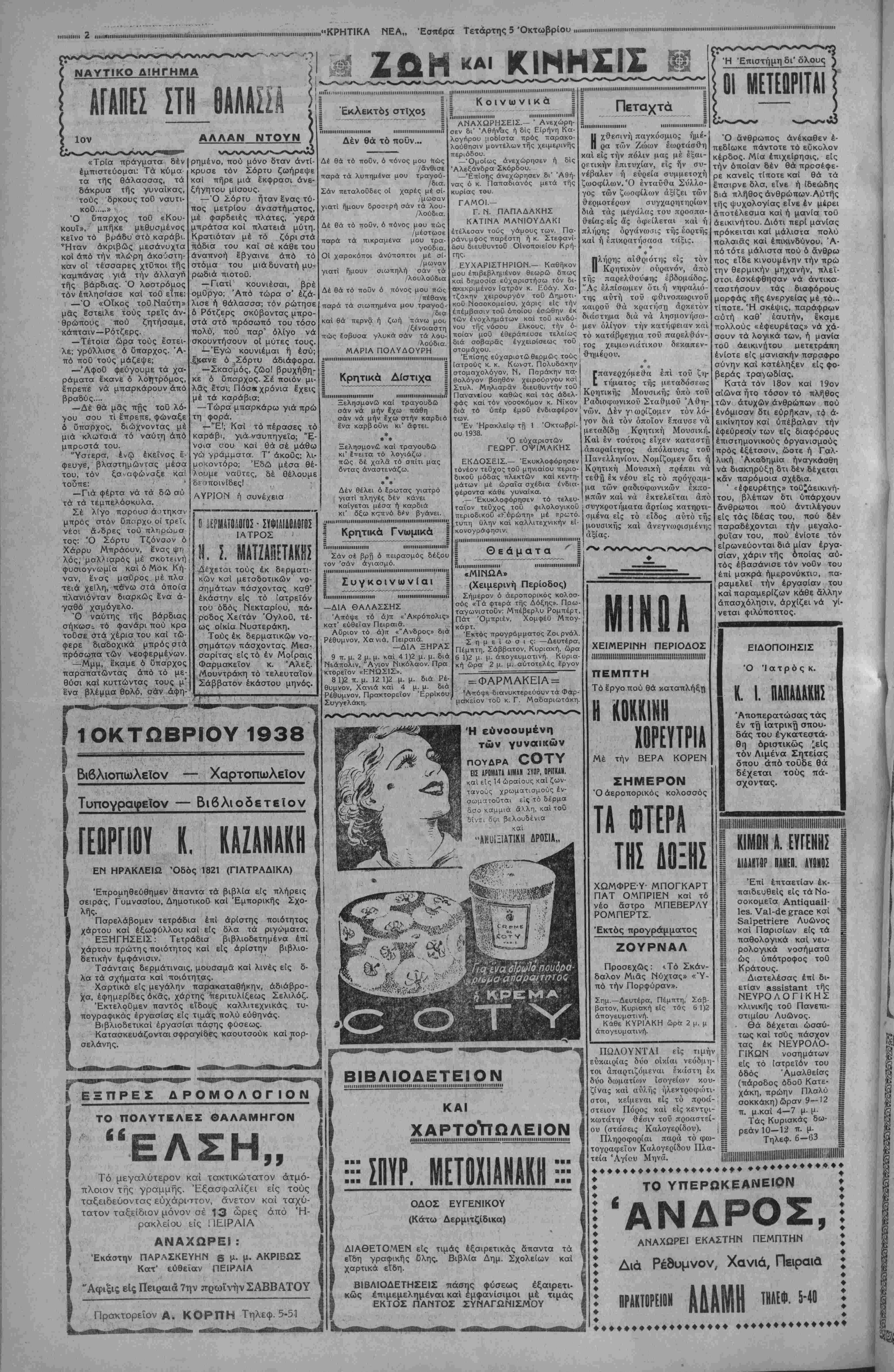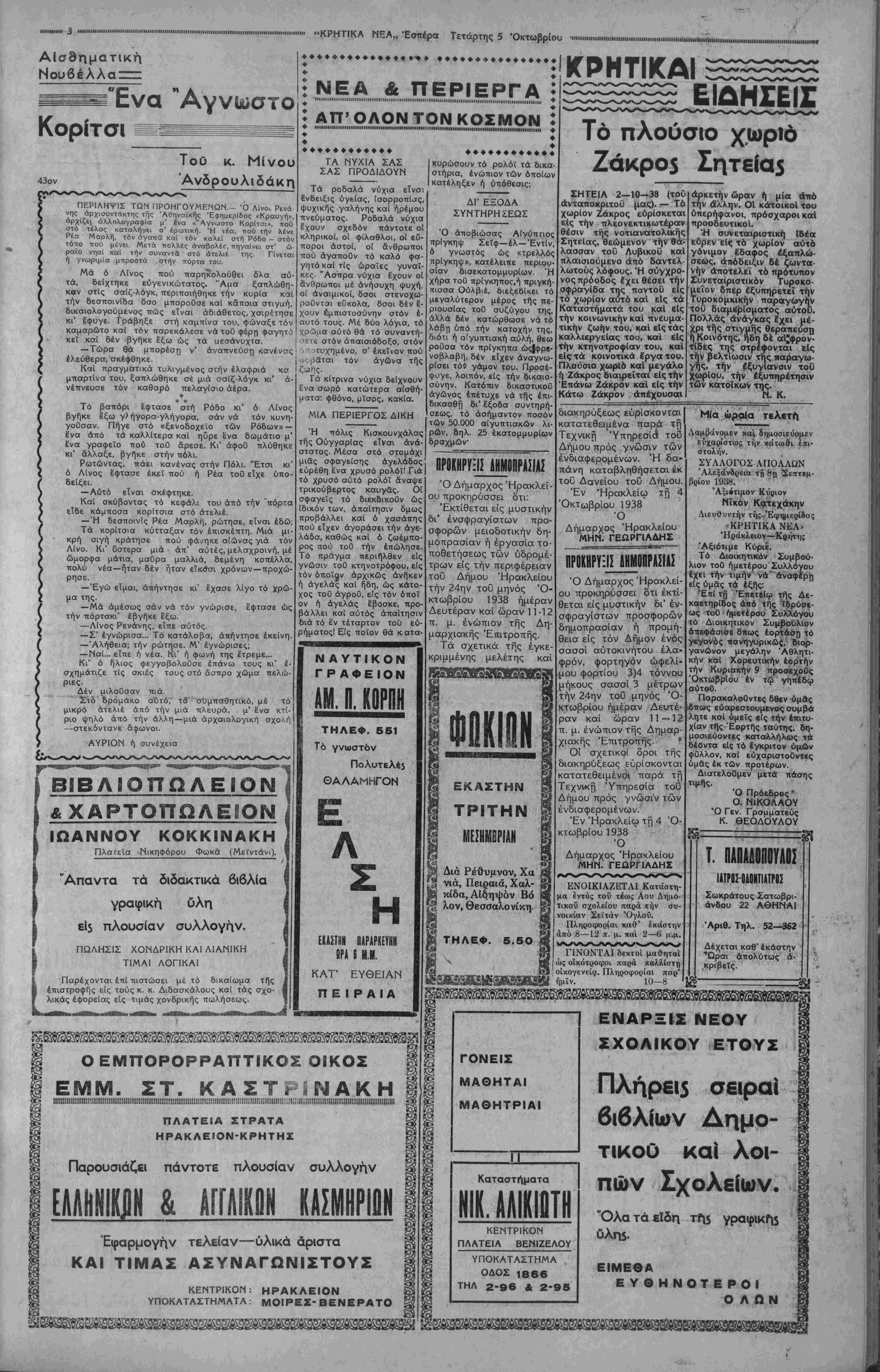 π. μ. ενώπιον τής Δημ<χρ- χιακής Έπιτροπής. · Οί σχετικοί δροι τής διακηρύξεως ευρίσκονται κατατεθειμένα παρά τή Τεχνική Ύπηρεσία τού Δήμου πρός γνώσιν ι ών ενδιαφερομένων. Έν Ηρακλείω τή 4 Ό¬ κτωβρίου 1938 Ό Δήμαρχος Ηρακλείου ΜΗΝ. ΓΕΩΡΓΙΑΔΗΣ Μία ώραία τελίΤΓ, Λαμβάνομεν χά), δΐ]μοσιεύομεν ευχαρίστως την κάτωθι επι¬ στολήν. ΣΥΛΛΟΙΌΣ ΑΠΟΛΛΩΝ Άλεξάνδρεια τή 8χι 2επτιμ- βρίου 1938. Αξιότιμον Κύριον Μικόν Κφτεχάκην Διευθυντήν τής^Έφημερίδος ^ΚΡΗΤΙΚΑ ΝΕΑ» Ήράκλειον—Κρήτης Άξιότιμε Κΰριέ, Τό Διοικητικόν Συμβού¬ λιον τοθ ήμετέρου Συλλόγου έχει Την τιμήν νά' άναψέρη είς ύμδς τα εξής: Επί τή Έπετείω τής Δε- καετηρίδος άπό τής ιδρύσε¬ ως τοθ ήμετέρου Συλλόγου τό Διοικητικόν Συμβούλιον απεφάσισε δπως έορτάση τό γεγονός πανηγυρικώζ, διορ- γανθνον μεγάλην Άθλητι- κήν καί Χορευτικήν εορτήν την Κυριακήν 9 προσεχούς Όκτωβρίου έν τφ γηπέδω αύτοϋ. Πορακαλοθντες δθεν υμάς ΐΰπως ευαρεστούμενοι συμβά λητε κσί ύμεΐς «ίς την επιτυ¬ χίαν τής "Εορτής ταύτης, δη- μοσιεύοντες καταλλήλως χά δέθντα είς τό έγκριτον υμών φθλλον, καί ευχαριστούντες ύμδς έκ των προτέρων. Διατελοθμεν μετά πάσης τιμή-ς. Ό Πρόεδρος* Ο. ΝΙΚΟΛΑΟΥ Ό Γεν. Γραμματεύς Κ. ΘΕΟΔΟΥΛΟΥ ΕΝΟΙΚΙΑΖΕΤΛΙ Κατάστη- μα εντός τοϋ τέως Αου Δηαο- τικοΰ σχολείου παρά την συ- νοικίαν Σείτάν Όγλοΰ. Πληροςρορίαι καθ' εκάστην άπό 8—12 π. μ. καί 2—6 μ.μ. £ ΓΙΝΟΝΤΑΙ δεκτοί μαθηταί ώς οίκότροφοι παρά καλλίστβ οίκογενεί)}:. Πληροφορίαι παρ' ημίν. 10—8 Τ. ΙΑΤΡΟΣ ΟΑΟΗΤΙΑΤΡΟΣ Σωκράτους Σατωβρι- άνδου 22 ΑΘΗΝΑΙ Αριθ. Τηλ. 52—362 Δέχεται καθ' εκάστην τΩραι απολύτως ά- κριβεΐς. ΓΟΝΕΙΣ ΜΑΘΗΤΑΙ ΜΑΘΗΤΡΙΑΙ Καταστήματά ΚΕΝΤΡΙΚΟΝ ΠΛΑΤΕΙΑ ΒΕΝΙΖΕΛΟΥ ΥΠΟΚΑΤΑΣΤΗΜΑ ΟΔΟΣ 1866 ΤΗΛ 2-96 Α 2-95 ΕΝΑΡΞΙΣ ΝΕΟΥ ΣΧΟΛΙΚΟΥ ΕΤΟΥΣ Πλήρεΐ5 σειραί βιβλίων Δημο- τικοθ καί λοι- πών Σχολείων. Όλα τα εϊδη τίι$ γραφικί*ι$ ΰλπ$. ΕΙΜΕΘΑ ΕΥΘΗΝΟΤΕΡΟΙ ΟΛΟΝ