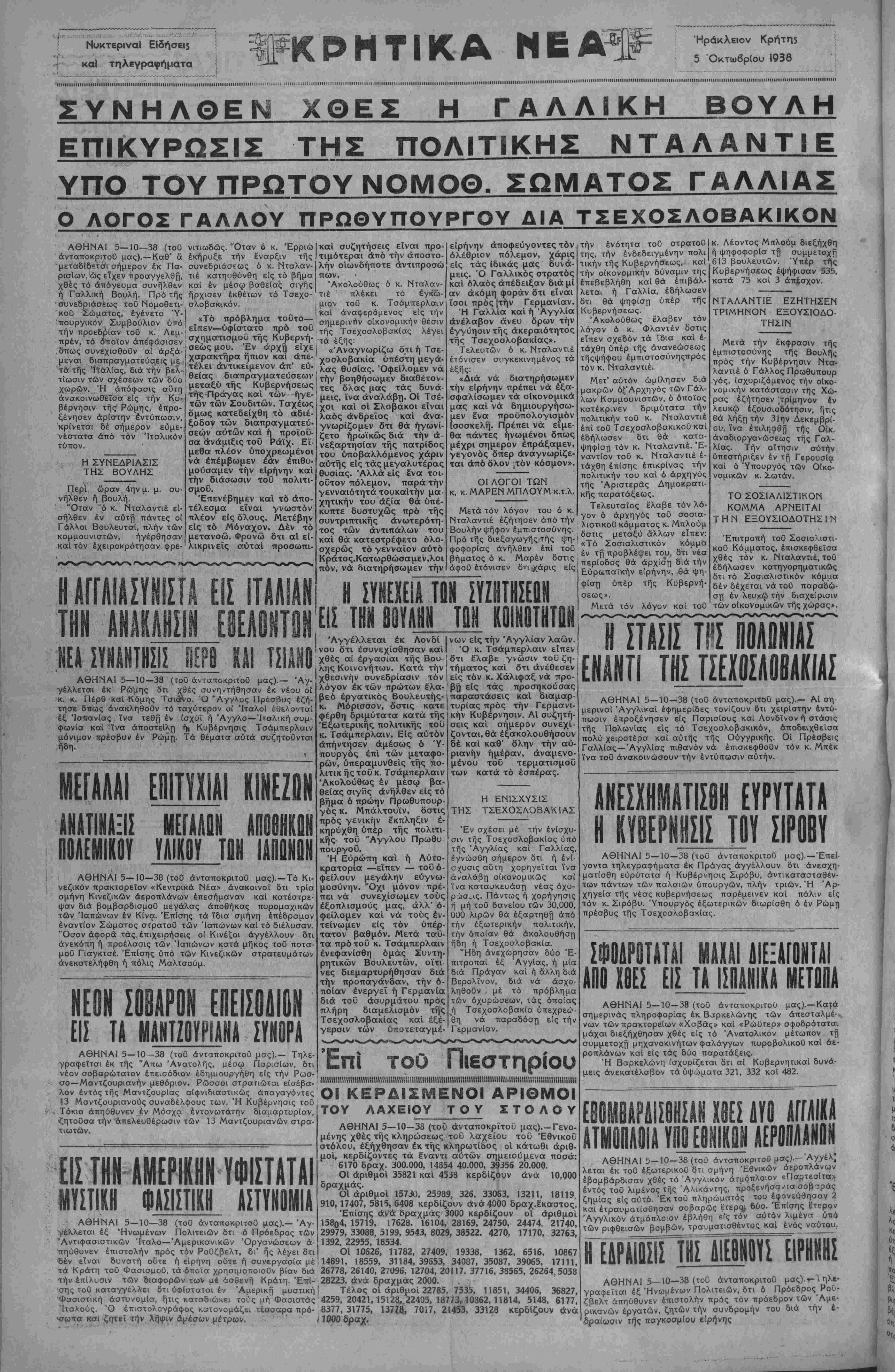 ■„„„„.......,,,,,,πιηιι........·ιι·...........ΙΙ......Ι..,,,..........ι.....................ι.ι.ι.πι·,.,,, ...... .ιι·.....,. ·■■■■··..■)·...............π..............π...................π............................"ΐ"»......<"■»..........................""""".............'........."'........."'..........'.............."..............."....."""........"""........'.......... ΣΥΝΗΛΘΕΝ ΧΟΕΣ Η ΓΑΛΛΙΚΗ ΒΟΥΛΗ ΕΓΤΙΚΥΡΩΣΙΣ ΤΗΣ ΠΟΛΙΤΙΚΗΣ ΝΤΑΛΑΝΤΙΕ ΥΠΟ ΤΟΥ ΠΡΩΤΟΥ ΝΟΜΟΟ. ΣΩΜΑΤΟΣ ΓΑΛΛΙΑΣ Ο ΛΟΓΟΣ ΓΑΑΑΟΥ ΠΡΟΘΥΠΟΥΡΓΟΥ ΔΙΑ ΤΣΕΧΟΣΑΟΒΑΚΙΚΟΝ ΑΘΗΝΑΙ 5—10—38 (τοϋ άνταποκριτοΰ μας).—Καθ* ά μεταδίδ^ταϊ σήμερον έκ Πα¬ ρισίων, ώς είχεν προαγγελθή, χθές τό άπόγευμα συνήλθεν ή Γαλλική Βουλή. Πρό τής • συνεδριάσεως τού Νομοθετι- κού Σώματος, εγένετο "Υ¬ πουργικόν Συμβούλιον υπό την προεδώίαν τοϋ κ. Λεμ- πρέν, τό οποίον απεφάσισεν δπως συνεχισθοϋν αί αρξά¬ μεναι διαπραγματεύσεις με 'τά τής Ιταλίας, διά την βελ¬ τίωσιν των σχέσεων των δύο χωρών. Ή απόφασις αυτή άνακοινωθεΤσα είς την Κυ¬ βέρνησιν τής Ρώμης, έπρο- ξένησεν αρίστην έντύπωσ.ν, κρΐνεται δέ σήμερον εύμε- νέστατα άπό τόν Ιταλικόν τύπον. Η ΣΥΝΕΔΡΙΑΣΙΣ ΤΗΣ ΒΟΥΛΗΣ Περί ώραν 4ην μ. μ. συ¬ νήλθεν ή Βουλή. 'Όταν ό κ. Νταλαντιέ εί- σήλθεν έν αυτή πάντες οί Γάλλοι Βουλευταί, πλήν των κομμουνιστών, ήγέρθησαν καί τόν έχειροκρότησαν φρε- νιτιωδώς. Όταν ό κ. Έρριω έκήρυξε την έναρξιν τής συνεδριάσεως ό κ. Νταλαν¬ τιέ κατηυθύνθη είς τό βήμα καί έν μέσω βαθείας σιγής ήρχισεν έκθέτων τό Τσεχο- σλοβακικόν. «Τό πρόβλημα τουτο— είπεν—ύφίστατο προ τοϋ • σχηματισμοϋ τής Κυβερνή¬ σεως μου. Έν άρχη εΐχε χαρακτήρα ήπιον καί άπε- τέλει αντικείμενον άπ' εύ- ■ θείας διαπραγματεύσεων 'μεταξύ τής Κυβερνήσεως τής Πράγας καί των ήγε- τών των Σουδιτών. Ταχέως δμως κατεδείχθη τό αδιέ- ξοδον των διαπραγματευ- σεών αυτών καί ή προιοΰ- σα ανάμιξις τοΰ Ράϊχ. Εί¬ μεθα πλέον ύποχρεωμένοι νά έπέμβωμεν εάν έπιθυ- μούσαμεν την είρήνην καί την διάσωσιν τού πολιτι- σμοΰ. Επενέβημεν καί τό άπο- τέλεσμα είναι γνωστόν πλέον είς δλους. Μετέβην είς τό Μόναχον. Δέν τό μετανοώ. Φρονώ δτι αί εί- λικρινεϊς αυταί προσωπι- Η ΑΓΓΑΙΑΣΥΝΙΣΤΑ ΕΙΣ ΙΤΑΛΙΑΝ ΤΗΝ καί συζητήσεις είναι προ- τιμότεραι άπό την αποστο¬ λήν οιονδήποτε άντιπροσώ πων. Ακολούθως ό κ. Νταλαν¬ τιέ πλέκει τό εγκώ¬ μιον τοΟ κ. Τσάμπερλαιν καί άναφερόμενος είς την σημερινήν οικονομικήν θέσιν τής Τσεχοσλοβακίας λέγει τα εξής: «Άναγνωρίζω δτι ή Τσε¬ χοσλοβακία υπέστη μεγά¬ λας θυσίας. "Οφείλομεν νά την βοηθήσωμεν διαθέτον¬ τες όλας μας τάς δυνά¬ μεις, Ίνα αναλάβη. Οί Τσέ- χοι καί οί Σλοβάκοι είναι λαός άνδρεΐος καί ανα¬ γνωρίζομεν δτι θά ήγωνί- ζετο ήρωϊκώς διά την α¬ νεξαρτησίαν τής πατρίδος τού υποβαλλόμενος χάριν αυτής είς τάς μεγαλυτέρας θυσίας. Άλλά είς ένα τοι¬ ούτον πόλεμον, παρά την γενναιότητά τουκαίτήν μα· χητικήν τού άξία θά ύπέ- κυπτε δυστυχώς πρό τής συντριπτικής άνωτερότη- τος των αντιπάλων τού καί θά κατεστρέφετο όλο- σχερώς τό γενναΐον αύτό Κράτος.Κατωρθώσαμεν,λοι πον, νά διατηρήσωμεν την ειρήνην άποφεύγοντες τόν όλέθριον πόλεμον, χάρις είς τάς Ιδικάς μας δυνά¬ μεις. Ό Γαλλικός στρατός καί δλαός άπέδειξαν διά μί αν ά<όμη φοράν δτι είναι ϊσοι πρός (την Γερμανίαν. Ή Γαλλία καί ή Αγγλία ανέλαβον άνευ δρων την εγγύησιν τής άκεραιότητος τής Τσεχοσλοβακίας». Τελευτών ό κ. Νταλαντιέ ετόνισεν συγκεκινημένος τα εξής: «Διά νά διατηρήσωμεν την είρήνην πρέπει νά εξα¬ σφαλίσωμεν τα οίκονομικά μας καί νά δημιουργήσω¬ μεν £να προϋπολογισμόν Ισοσκελή. Πρέπει νά είμε¬ θα πάντες ηνωμένοι δπως μέχρι σημερον έπράξαμεν, γεγονός όπερ άναγνωρίζε- ται ά