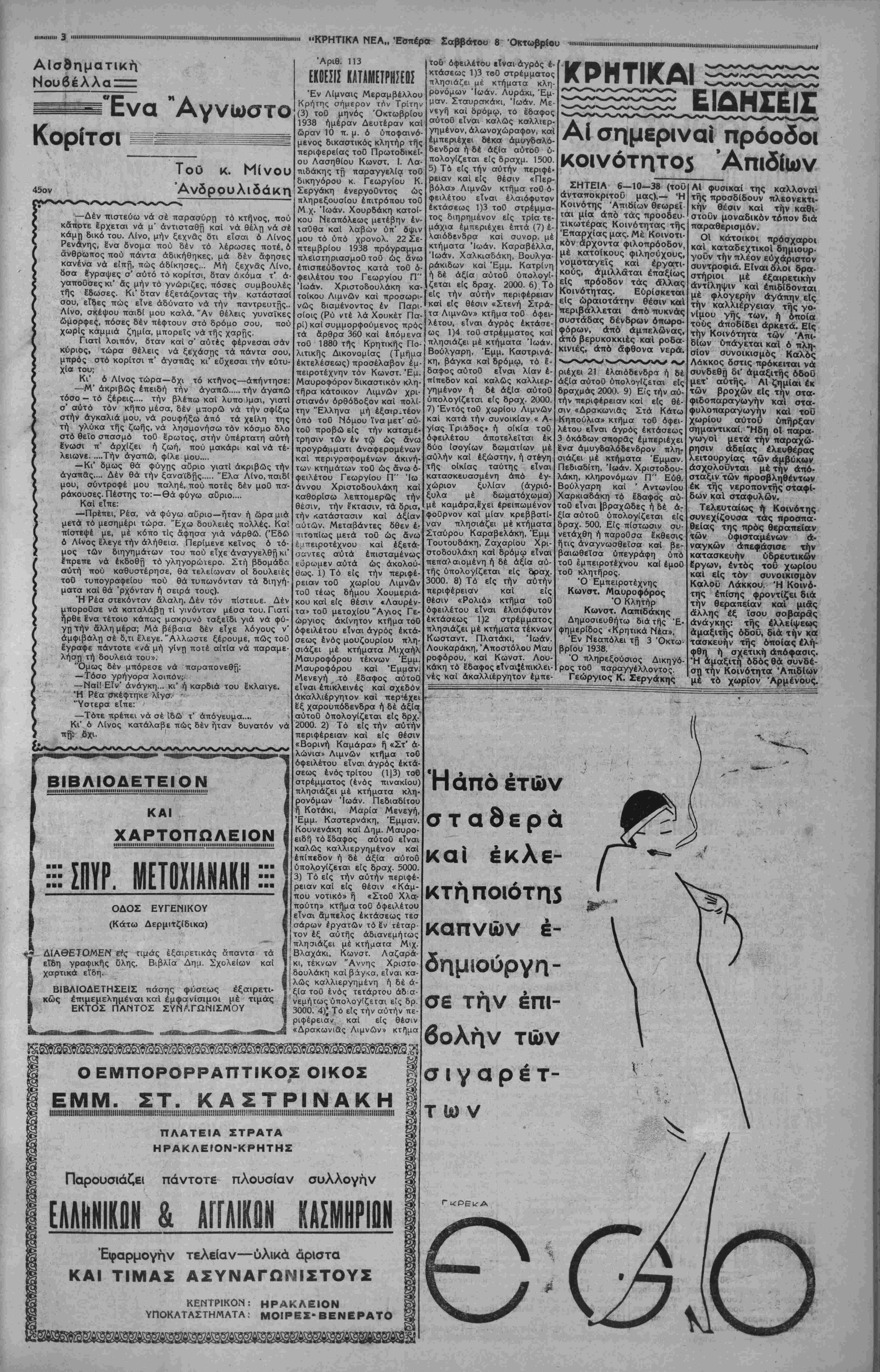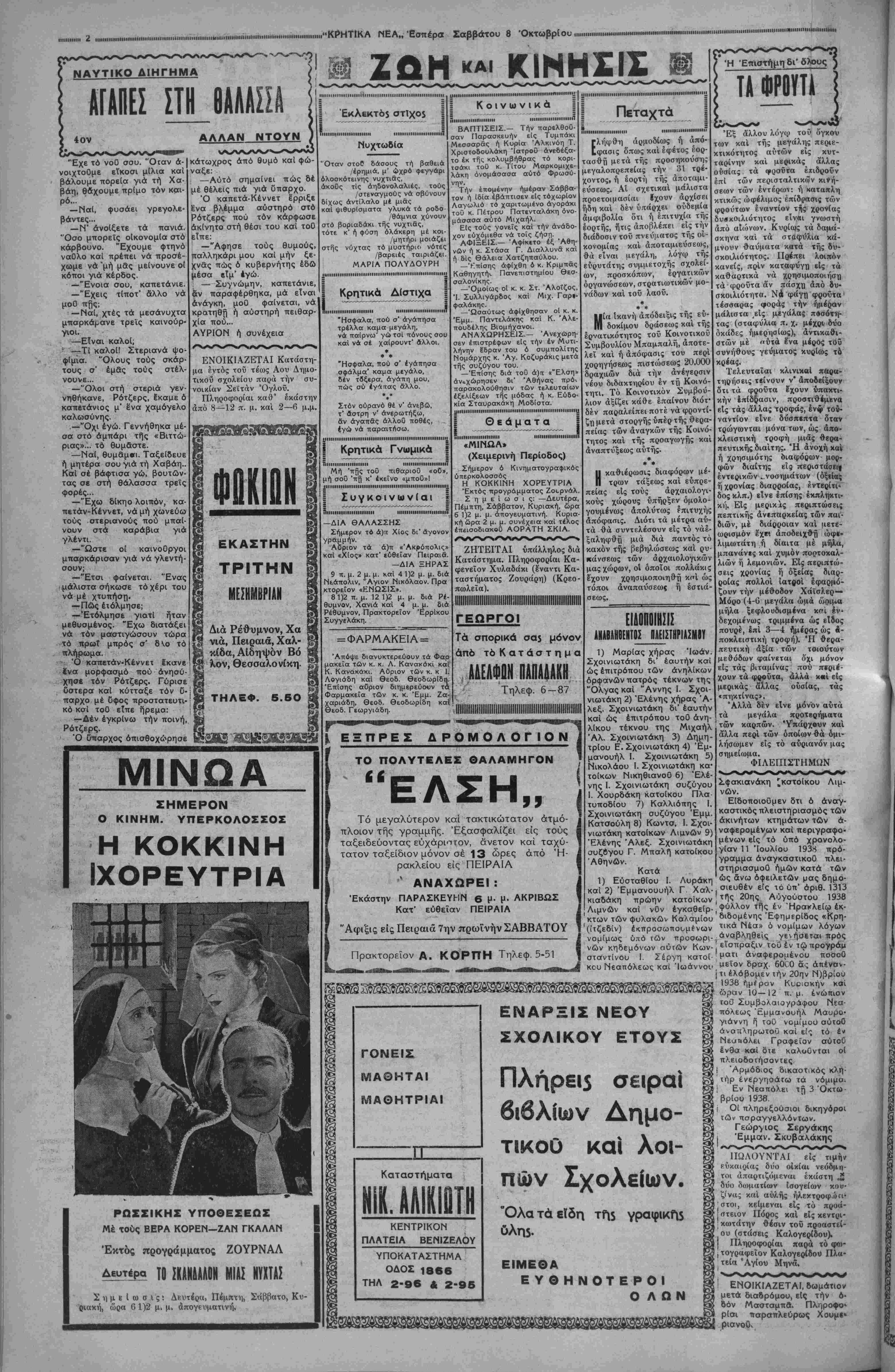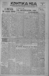 < Αρ. τηλ.. 700-7 ιμή φύλ. 2 δρ. | ι - '■- - -*·— ΕΤΟΣ^Γ'. ΑΡΙΘ. ΦΥΛ. 1352 ΙΙΙΙΙΠΙΐηΐΙΙΙΙΙΙΙΗΙΙΙΙΠΙΙΜΙΙΙ.........Ι..........Ι.......ΙΙΙΙΙΙΙΙΙΙΙΙΙΙΙΜ.....ΜΙΙΙΙΙΙΙΜΙΙΙ1ΙΙΙΙΙΙΙΙΙΙΜΜΙΙΙΙΙΙΙΙΙΙΙΙ Η ΠΡΟΣΤΑΣΙΑ ΤΟΥ ΕΞΑΓΟΓΙΚΟΥ Ε ΚΡΗΤΙΚΑ ΝΕΑ ΣΑΒΒΑΤΟΝ 6 ΟΚΤΩ3ΡΙΟΥ 1938 ΚΑΘΗΜΕΡΙΝΗ ΑΠΟΓίΕΥΜΑΤΙΝΗ ΕΦΗΜΕΡΙΣ ΗΡΑΚΛΕΙΟΥ ΓΡΑΦΕΙΑΌδός 25 Αύγοόστου ιιιιιιιΐιιιιιιιιιιιιιιιιιιιιιιιιιιιιιιιιιιιιιιιιιιιιιιιιιιιιιιιιιιιιιιιιιιιιιιιιιΐϋΐιιιιιιι.....ιιιιιιπιιιΐΜΐιιΐΜΐιιιιιιιιιιιιιιιιιιιιιιπιιιιιιιιιιιιιηιυΑιπηιΐΝΐιιιιιιιιιιιιιιιιιιΐιιιιιιιιΐΜΗΐιιιιιι Κατόπιν των συντό-|τοΰ νων μέτρων, τά όποία έλαβεν ή σημερινή Κυ¬ βέρνησις διά την αύξη¬ σιν τής Έθνικής Γεωρ- γικής παραγωγής, ήεο φυσικώτατον νά μερι¬ μνήση καί διά την πε¬ ριφρούρησιν τής καλής φήμης των προϊόντων μας έν τώ εξωτερικώ, έ| ής έξαρτάται ή έπω- φελής «αι ποθέτησις ευχερής το- αύτών. Τό πρόβλημα αΰτό άαησχό- λησεν είς επανειλημμέ¬ νας συσκέψεις τάς αρ¬ μοδίας Υπηρεσίας τοϋ Ύπουργείου Έθνικής Οίκονομίας τελευταίως, ληφθέντων έν τέλει μέ- τρων, τα όποία ό'χι μό¬ νον άποτελεσματικώτα- τα ,θά άποδειχθοϋν εν τη έφαρμογή, άλλ' εί¬ ναι καί δίκαια καί προσηκόντως αύστηρά. Όσοι είς τό μέλλον θά άποδείξουν τόσην άσυνειδησίαν ώστε νά έπιχειρήσουν νά κερδο- σκοπήσουν είς βάρος τής καλής φήμης καχ τοΰ όνόματος των γεωργι- κών προϊόντων μας, θά στεροΰνται αυτής τής αδείας έξασκήσεως έπαγγέλματος των καί θά διώκωνται αύ- στηρότατα ποινικώς. Ό φραγμός αύτός ήτο ε¬ πιβεβλημένον νά τεθή- Διότι υπήρχον δυστυ- χώς οί άσυνείδητοι, οί έτοιμοι νά έμπορευθοϋν τούςπάν- εφθανον μέχρι τής δυσφημίσεως των προϊόντων μας διά τής νοθείας τής ποιό¬ τητος των, ίνα επιτύ¬ χουν μεγαλύτερα, πά- ράνομα, κέρδη. Τό έ- τα παντα και τας, οΐτινες ξαγωγικόν μας ριον σμός, είναι ο όστις εμπο- μηχανι· στηρίζει ΑΙ ΕΠΑΡΧΙΑΙ ΜΑΣ ΤΟ ΟΡΟΠΕΔΙΟΝ ΤΟΥ ΤΖΕΡΜΙΑΔΩ ΛΑΣΗΘΙΟΥ ΕΝΤΥΠΩΣΕΙΣ ΑΠΟ ΠΕΡΙΟΔΕΙΑΣ , ωστε είναι δυνατή εναντίον τού την Χώραν και τό Έ- θνος. Έτΐιβάλλεται λοι- πόν νά ασφαλισθή καί νά περιφρουρηθη όμη- χανισμός αύτός νά μή καμμιά έπιβουλή. Τό Κράτος, έξ άλλου, καταβάλλει τρομακτικάς προσπαθεί¬ ας διά νά επιτύχη την προώθησιν καί αύξησιν των γών. τού; θετον τό αύτό έργον βεβαία. 'Εθνικών έ! αφίση. ;αγω- είς άσυνειδήτους εκ- έπίμοχθον τού; 'Όχι ΚΑΙ ΚΡΙΙΕΙΣ Τό τηλέφωνον τού Μουσείου Υπό τού διειιθύνοντος Έπΐ- μελητοϋ τοϋ Μουσείου μας κ. Χρ Πέτρου ελάβομεν την κατωτέρω επιστολήν: Άξιότιμε Κύριε Διευθυντά, Σδς εύχαριστώ, πού εΐχα- τε τό ενδιαφέρον ν' άσχολη- θήτε είς τό χθεσινόν φύλλον σας μέ την έλλειψιν τηλε- Φώνου είς τό Μουσείον καί νά συνηγορήσετε γιά εγκατάστασιν τού. Μέ την την πλη- εύκαιρΐαν ταύτην σδς ροφορώ, δτι άπό πολ- λοθ επανειλημμένας έ'- χουν γ'νει - σχετικαί ενέρ¬ γειαι, άλλά χωρίς, δυστυχώς, άκόμη κανέν άποτέλεσμα. "Ας ελπίσωμεν δτι καί ή I- δική σας συνηγορία, προστι· θεμένη είς την Ιδικήν μας προσπάθειαν, θά συντελέση νά εξευρεθή έπίτέλους τρό- πος νά έγκατασταθή είς τό Μουσείον τηλέφωνον, άφοϋ πρόκειται περί μιδς άνάγκης απαραιτήτου, ή όποία έχει σχέσιν δχι μόνον μέ την διε- ξαγωγήν τής υπηρεσίας, άλ¬ λά πρό παντός μέ την α¬ σφάλειαν καί μέ την τουρι- στικήν κίνησιν καί σημα¬ σίαν τοθ ίδρύματος. Μέ πολλήν εκτίμησιν Ό Διευθύνων Έπιμελητής τοϋ Μουσεΐου ΧΡΗΣ. ΠΕΤΡΟΥ ♦ ♦♦ Αί ΠαιδικαΙ έξο- χαΐ Χερσονήσου Έκ πλείστων αναγνωστών μας μδς δισβιβάζονται ένθου σιώδεις έντυπώσεις έξ επι¬ σκέψεως των είς τάς Πααδι- κάς έξοχάς Χερσονήσου καΐ τιμητικώτατσι κρίσεις διά την δρα