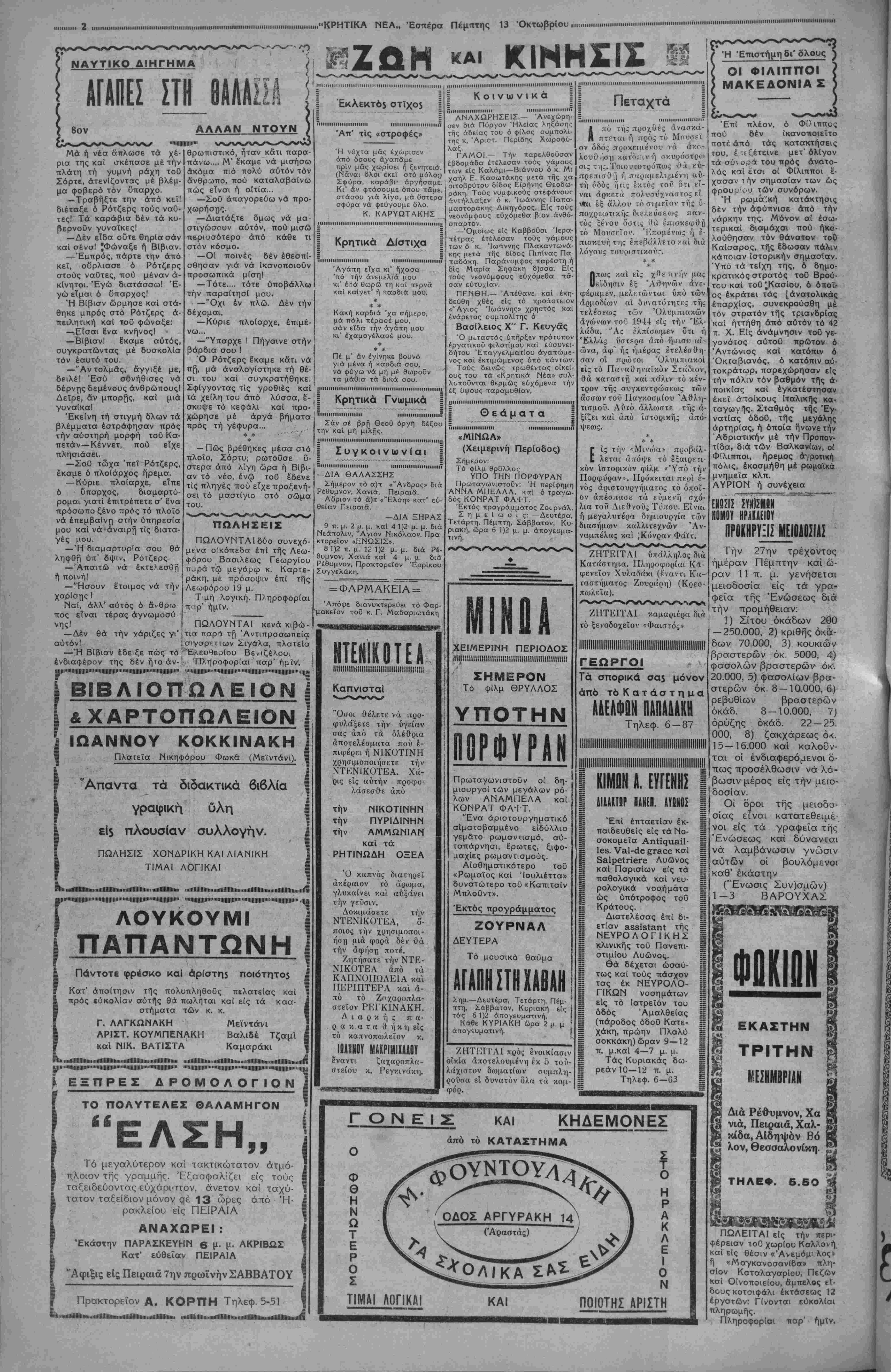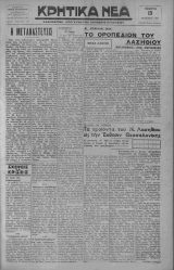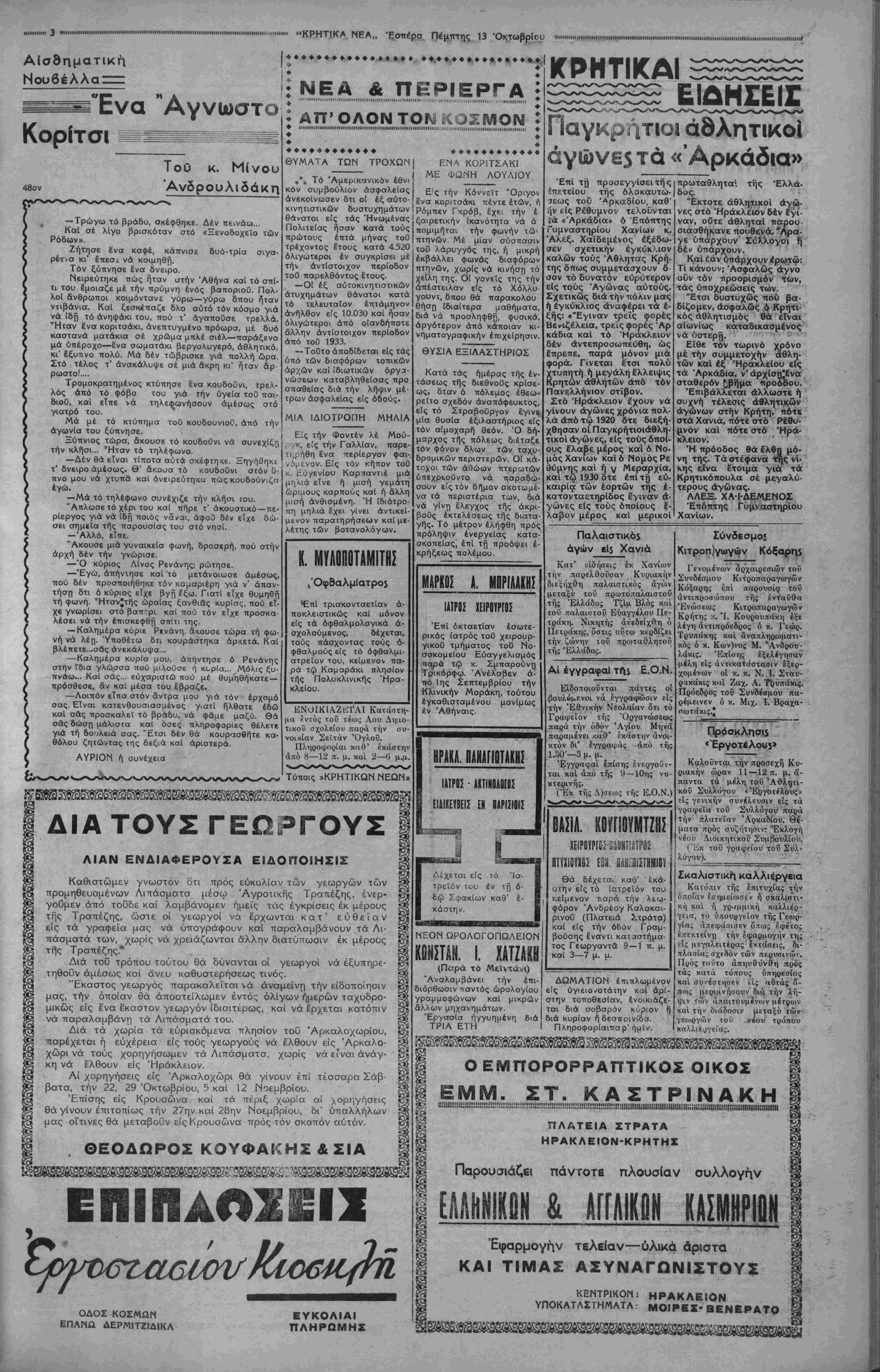 "Ωρα <) μ. μ. Μετεωρ. δελ¬ τίον, Χρηματιστήριον, (3.15' έργα πιάνου (δίσκοι), 6.45'ρεσι- τάλ τραγουδιοΰ υπό δίδος Άλ- κμήνης Κούνιου, 7,05' ρεσιτάλ βιολιοϋ υπό τής δίδος Λουκί- ας Άραπίδου, 7,ο0' έλαφρά μουσική ορχήστρα Σεϊνανίδη Βισβάρδη, 8.15' όμιλία τού Ύ- πουργείου Ύγιεινής, 8.30' δη- μοτικά τραγούδια τοΰ Χηρο- πούλου συνοδεία λαϊκών όρ- γάνων, ί) ρεσιτάλ τραγουδιοΰ υπό τοϋτενόρου Διονυσίου Θά- νου, 9.10' είδήσεις, 9.30' συ- ναυλία τής συμφωνικής όρχή- σιρας τής ΥΡΕ υπο την Δι¬ εύθυνσιν τοΰ κ. Εύαγγελάτου πρόγραμμα 1)Γκρέτρου χωριά- τικη δκκιμασια είσογωγή, 2) Βιβόλντι Κοντσέρτο Γκρόσο α¬ ριθ. 11 έκ ρέ έ'λασσον ϊ!) Μό- τσαρτ συμφωνία αριθ. 88 είς ορ μεΐζον χα)ρίς μενουέτο, 4) Χουμ,περντηκ εϊσαγωγή άπό την όπερέττα Χανσέλ καίγκρέ- τσιλ, 5) Φράγκ άπολύτρωσις, 0) Βιίγνερ Ποελούδιον τής 3ης πράξεως καί είσαγωγή των μα- θητών άπό τό μελόδραμα άρ- χιτραγουδιστ«ί τής Νυρεμβέρ- γης, κατά τό διάλλειμμα τής συναυλίας θά μεταδοθοΰν αί τελευταίαι είδήσεις, 11.30' μουσική χορόν, (δίτκοι) κσί έ¬ λαφρά τραγούδια υπό τής δί¬ δος Στέλλας Συριανοΰ. Χορηγήση πιστώσει«3 Μεταδίόεται αρμοδίως ότι ή Γε,νική Διοίκησις Κρήτης διέ¬ θεσεν ετέρας 100.000 δραχ. διά την αποπεράτωσιν τής πά- ραλιακής δδοΰ Άμμουδιοΰ, 'οωρινά σημειώματα, εξετάση ι" κ Χανίων ά- μεταξύτών ο- Παραιτήση τού κ. Ιππολύτου Ό Γενικός Γραμματεύς τής Γεν. Διοικήσεως Κρήτης κ.Έπ- όλ υπέβαλεν την άπό τής ί ή ρ β η ής θέαβως τού παραίτησιν , ήνις καί εγένετο δεκτή. Ό κ. "Ιπ- πόλυτος αναχωρεί αυριον (σή¬ μερον) την εσπέραν δι' Αθή¬ νας. ΑΙ άδειαι κυνηγΐου °Υπο τοΰ Προίσταμένου τοϋ Δασονομείου κ. Μητρο¬ πουλου εκοινοποιήθη ή κάτο)- θι Διαταγή: «-Φέρομεν είς γνώσιν των ορ γάνων Χωροφυλακής καί Ά- γροφυλακής καί των κυνηγών ότι έταχυδρομήθησαν είς ό- λους αί άδειαι κυνηγίου καί έπομένως δρν ίσχύουν πλέον τα Ό Πάπαχ κατακρίνει διωγμόν Έκκλησία5 ΑΘΗΝΑΙ 13—10—38 (το άνταποκριτοϋ μας)— Ειδή σεις έκ Ρώμης άνσφέρου δτι ό Πάπας Πΐος ό 11ος ά πηύθυνεν επιστολήν είς τού καθολικ,ούς τής Αμερικής, καταφερόμενος κατά των χω ρών ποϋ εχουν θέσει έν δι ωγμώ την καθολικήν έκκλη οίαν. Παραιτήση 'Αλσατοϋ βουλευτού Τελευταίαι είδήσειςέκ Πά ρισίων άναφέρουν δτι συ νήλθεν ή Κοινοβουλευτική έ- πιτροπή επί των εξωτερικών έν τή Βουλή αποδεχθείσα την παραίτησιν τοθ Άλσα τοΰ Βουλευτού Μπαλαίν. Πρό τής άποδοχής τής πα· ραιτήσεώς τού άνεγνώσθη γ έπιστολή τού πρός την επι τροπήν. Ή όδό5 Ίεραπέτραχ - "Ανατολή* Καθ' α γνωρίζομεν αί έρ γασίαι διά την αποπεράτωσιν τής όδοΰ Ιεραπέτρας—Άνα- τολής συνεχίζονται έντατικώς, τή; Κοινότητος διαθεσάσης με- χρι τής στιγμής 2000 ήμερομί- σθια^καί 20.000 δραχμάς διά την αγοράν έργαλείίον. Ποδοσφαιρικό$ Αγών Τό άπόγευμα τής παρελθού¬ σης Κυριακής είς την Ίερά πετρΓχν, έλαβε χώραν φιλικύς ποδοσφαιρικός αγών μεταξύ των όμάδων <'Θύ?λλα» καί «Λιβυκός». Τόν άγώνα παρηκο- ^ύιίησεν ό Νομάρχης Λαοη- λέ η μρχης Λαοη , ό Θεοφιλέστατος Φιλό- θεος, τό Σ. τής Κοινότητος καί πλή&η κόσμου. Συνεδρίασι$ Συμβουλίου Χθΐ,ς είς τα ενταύθα γρα- φεΐα τής Κιτρενοόσεως συνήλ¬ θον τα μέλη τής Διοικούσης <αί Έποπτικής Έπιτροπής αί έ'λαβον διαφόρους άποφά- χβρηγηθέντα αυτοίς προ- εις, |πί ζητημάτων τής Κιτρε- νωσεως. ΑΘΗΝΑΙ 13—10—38 (τού άνταποκριτοϋ μας).—Αγγέλλεται έκ Λονδίνου δτι μέγα λη Αγγλικη Εφημερίς έθεσε είς τούς αναγνώστας της τρία έρωτήματα. Ιον) Εάν έττρετίε να ·γί. τ) ή συνάντησις τοΰ Μονάχου. 2ον) Έάν'αί συμφωνίαι υπήρ¬ ξαν δίκαιαι. 3ον) Εάν άπειράπη δι" αύ- των ή δχι ό πόλεμος. Είς την πρ