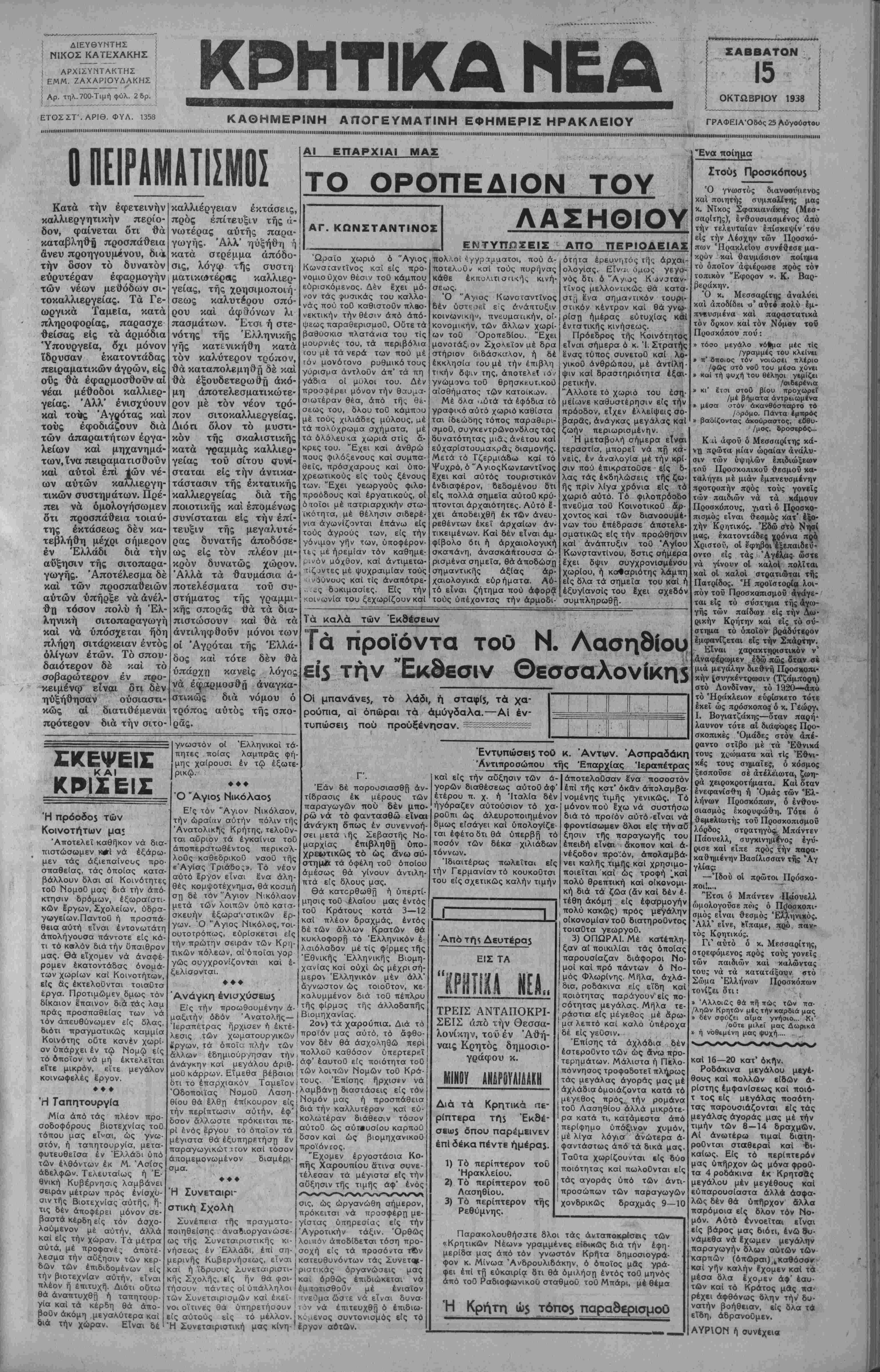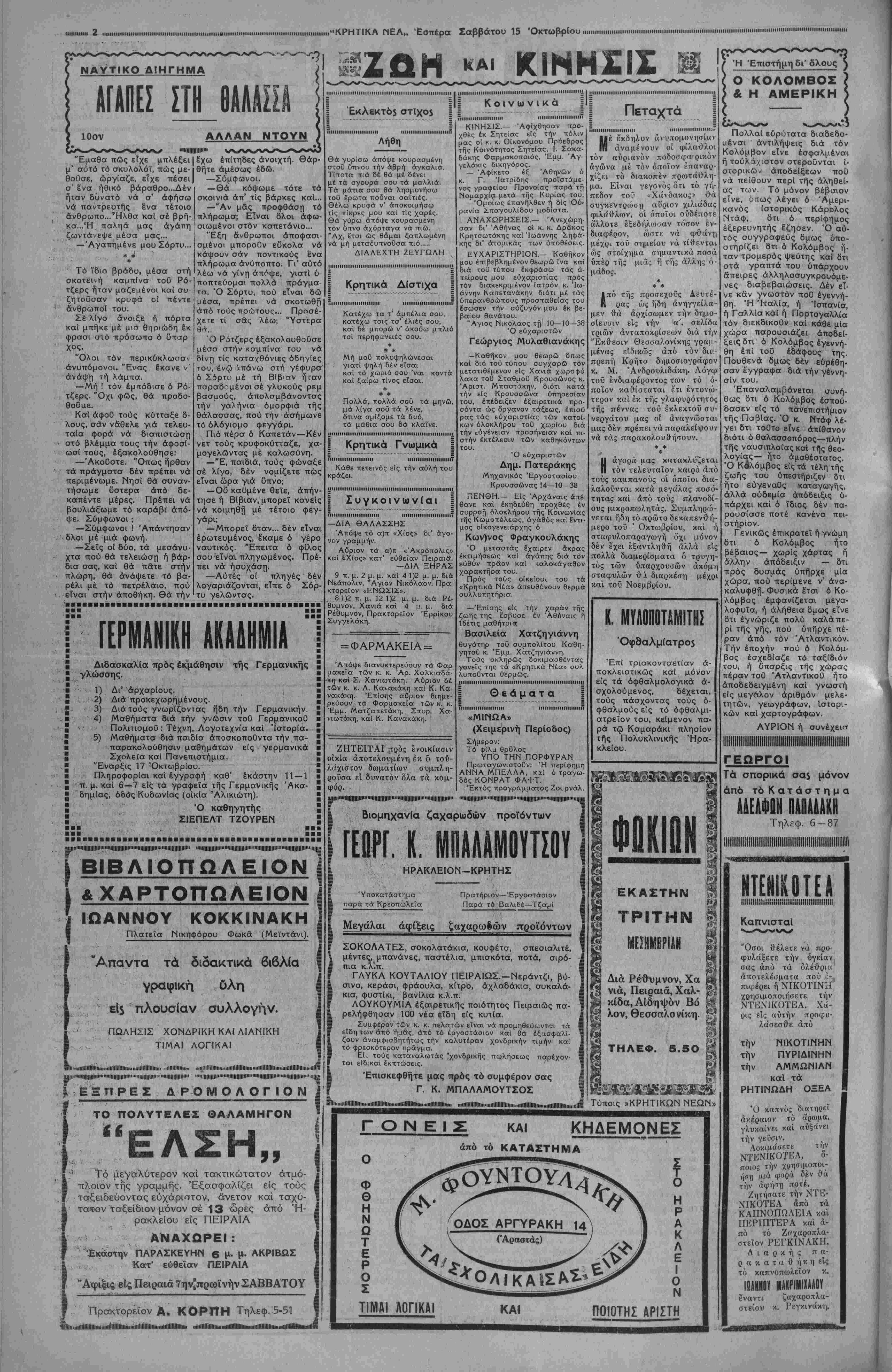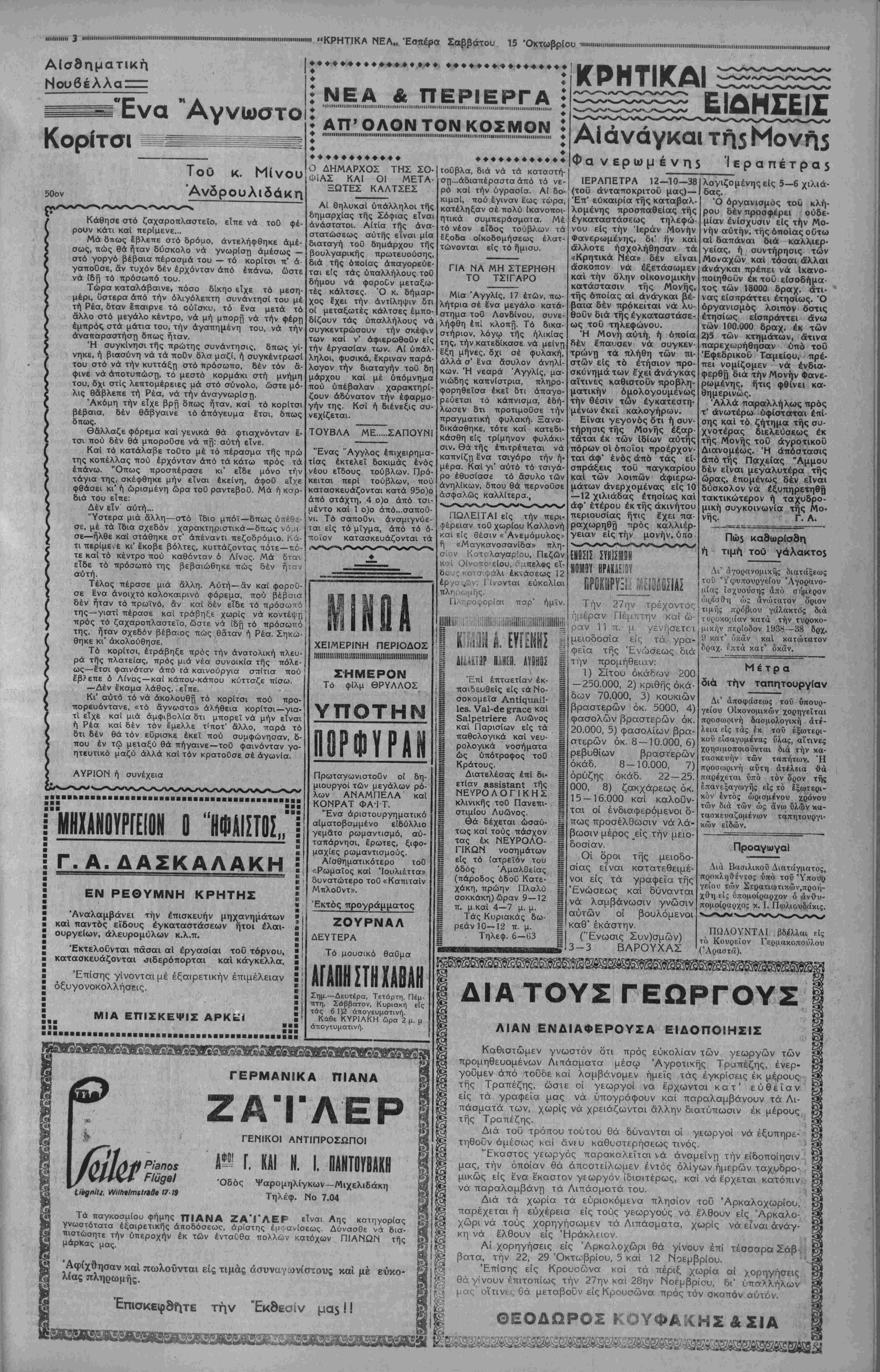 Αρ. τηλ.700-Τιμή φύλ. 2 δρ. < ΕΤΟΣΣΤ'. ΑΡΙΘ. ΦΥΛ. 1358 ΚΡΜΤΙΚΑ ΜΕΑ ΚΑΘΗΜΕΡ1ΝΗ ΑΓΪΟΓΕ ΥΜΑ ΓΙΝΗ ΕΦΗΜΕΡΙΣ ΗΡΑΚΛΕΙΟΥ ΣΑΒΒΑΤΟΝ 15 ΟΚΤΛ ΒΡΙΟΥ 1938 ΓΡΑΦΕΙΑΌδός 25 Λύγοοστου ,,,ΙΙΙΙΙΙΙΙΙΙΙΙΙΙΙΜΗΠΙΙΙΙΙΙΙΙΙΙΙΜΙΙΐηΐΙΙΐηΐΙΙΙΙΙΙΙΙΙΙΙΙΙΙΙΙΗΙΚΙΙΝΙΙίΙΙΙΙΙΙΙΙΙΙΜΜΙΙΙΙΙΙΙΠΙΙΙΙΙΙΙΙΙΙΙΙΐηΐΙΙΙΙΙΙΙΗΙΙΙΙΙΙΙΙΙΙΙΙΙΙΙΙΙίΙΙΙΙΗΙΙΙΙΙΙΙΙΙΙΙΙΙΙΙΙΙΙΙ ι ΙΙΙΙΙΙΙΙΙΜΙΙΙΙΙΙΙΙΙΠΙΙΙΙΙΙΙΙ1ΙΙΙΙΙΙΙΙΙΙΙΙΙΙΙΙΙΙΠΙΙΙΙΙΙΙΙΙΙΙΙΙΙΙΙΙΙΙΜΙΙΙΙΙΙΙΙΙΙΙΙΙΙΙΙΙΙΙΙΙΙΙΙΙΙΙΙΜΙΙΙΙΙΙ1ΙΠΙΗΙΙΙΙΙΙΙΙΙΙΜΙΙΙΙΙΙΙΠΙΙΙΙΙΙΙΙΗΙΙΙΙΙΙΙΙΙΙΙΙΜΙΙΙΙΙΙΙΙΙΜΙΙΠΙΙΙΙΙΙΙΙΜΗΙΙΙΙΙΙΙΙΙΙΙΙΙΙΙΙΙΙΙΙΙΙΙΝΙΙ Κατά την εφετεινήν καλλιεργητικήν περίο¬ δον, φαίνεται ότι θά καταβληθ^ προσπαθεία ανευ προηγουμβνου, δι«* την όσον τό δυνατόν ευρύτερον εφαρμογήν των νέων μέθοδον σι- τοκαλλιεργείας. Τα Γε- ωργικά Ταμεία, κατά πληροφορίας, παρασχε θείσας είς τα αρμοδία Ύπουργεία, δχι μόνον ΐδρυσαν εκατοντάδας πειραματικών άγρών, είς οΌς θά εφαρμοσθούν αί νέαι μέθοδοι καλλιερ- γείας. Άλλ' ένισχύουν καί τοΐις Αγρότας καί τούς έφοδιάζουν διά των άπαραιτήτων έργα- λείων καί μηχανημά- των,ίνα πειραματισθοϋν καί αύτοι επί |ών νέ¬ ων αυτών καλλιεργη- τικών συστημάτων. Πρέ- πει νά ομολογήσωμεν δτι προσπαθεία τοιαύ¬ της εκτάσεως δέν κα- τεβλήθη μέχρι σήμερον έν Ελλάδι διά την αύξησιν τής σιτοπαρα- γωγής. Άποτέλεσμα δέ καί των προσπαθειών αυτών υπήρξε νά ανέλ¬ θη τόσον πολύ ή Έλ- ληνική σιτοπαραγωγή καί νά ύπόσχεται ήδη πλήρη σιτάρκειαν έντός ολίγων έτών. Τό σπου¬ δαιότερον δέ «αί τό σοβαρώτερον έν ττρο- κειμένω είναι δτι δέν ηυξήθησαν οΰσιαστι- κώς αί διατιθέμεναι πρότερον διά την σιτο- ΑΙ ΕΠΑΡΧΙΑΙ ΜΑΣ ΤΟ ΟΡΟΠΕΔΙΟΝ ΤΟΥ καλλιέργειαν έκτάσεις, πρός επίτευξιν τής α¬ νωτέρας αυτής παρα-1 γωγής. Άλλ' ηυξήθη η κατά οτρέμμα απόδο¬ σις, λόγω τής συστη ιατικοηέρας καλλιερ- γείας, τής χρησιμοποιή¬ σεως καλυτέρου σπό- ρου καί ώφί)όνων λι πασμάτων. "Ετσι ή στε- νότης τής Έλληνικής γής κατ^νικήθη κατά τόν καλύτερον τρόπον, θά καταπολεμηθή όέ καί θά εξουδετερώση άκό- μη άποτελεσματικώτε- ρον μέ τόν νέον τρό¬ πον σιτοκαλλιεργείας. Διότι όλον τό μυστι¬ κόν τής σκαλιστικής κατά γραμμάς καλλιερ- γείας τοϋ σίτου αυνί- σταται είς την αντικα¬ τάστασιν τής έκτατικής καλλιεργείας διά τής ποιοτικής καί έπομένως συνίσταται είς την επί¬ τευξιν τής μεγαλυτέ¬ ρας δυνατής αποδόσε¬ ως είς τόν πλέον μι¬ κρόν δυνατώς χώρον. Άλλά τα θαυμασία ά- ποτελέσματα τοΰ συ- στήματος τής γραμμι- κής σποράς θά τα δια- πιστώσουν και θά τα άντιληφθοΰν μόνοι των οί Αγρόται τής Ελλά¬ δος καί τότε δέν θά υπάρχη κανείς λόγος νά εφαρμοσθή άναγκα- στικόά,ς διά νόμου ό τρόπος αύτός τής σπο¬ ράς. ΑΓ. ΚΩΝΣΤΑΝΤΙΝΟΣ ΛΑΣΗΘΙΟΥ ΕΝΤΥΠΟΖΕΙΣ ΑΠΟ ΠΕΡΙΟΔΕΙΑΣ Ώραΐο χωριό ό Άγιος Κωνσταντίνος καί είς προ¬ νομιούχον θέσΐι' τού κάμπου ευρισκόμενος. Δέν έχει μό- ν'ον τάς φυσικάς τού καλλο- νάς πού τοθ καθιστοΰν πλβο- νεκτικήν την θέσιν άπό από¬ ψεως παραθερισμοϋ. Ουτε τα βαθυσκισ πλατάνια τού τίς μουρνιές τού, τα περιβόλια τού μέ τα νερά των ποΰ μέ ίόν μονότονο ρυθμικό τους γυρισμα άντλοθν άπ' τα πή γάδια οί μυλοι τού. Δέν προσρέρει μόνον την θαϋ^α- σιωτέραν θεσ, άπό τή', θέ¬ σεως τού, δλουτοϋ κάμπ^υ μέ τοϋς χιλιάδες μύλους, μέ τα ποΛύχρωμα σχηματα, μέ τα όλόλευ-ςα χωρία στίς ά- κρες τού. "Εχει καί άνθρώ πους φιλόξενους καί συμπα- θεϊς, πρόσχαρους καί ύπο- χρεωτικούς είς τοΰς ξένους των. "Εχει γεωργούς φιλο- προόδους καί έργατικούς, οί ό'χοΐοι μέ πατριαρχικήν στω- ικότητα, μέ θέλησιν σιδβρέ- νια άγωνίζονται επάνω είς το