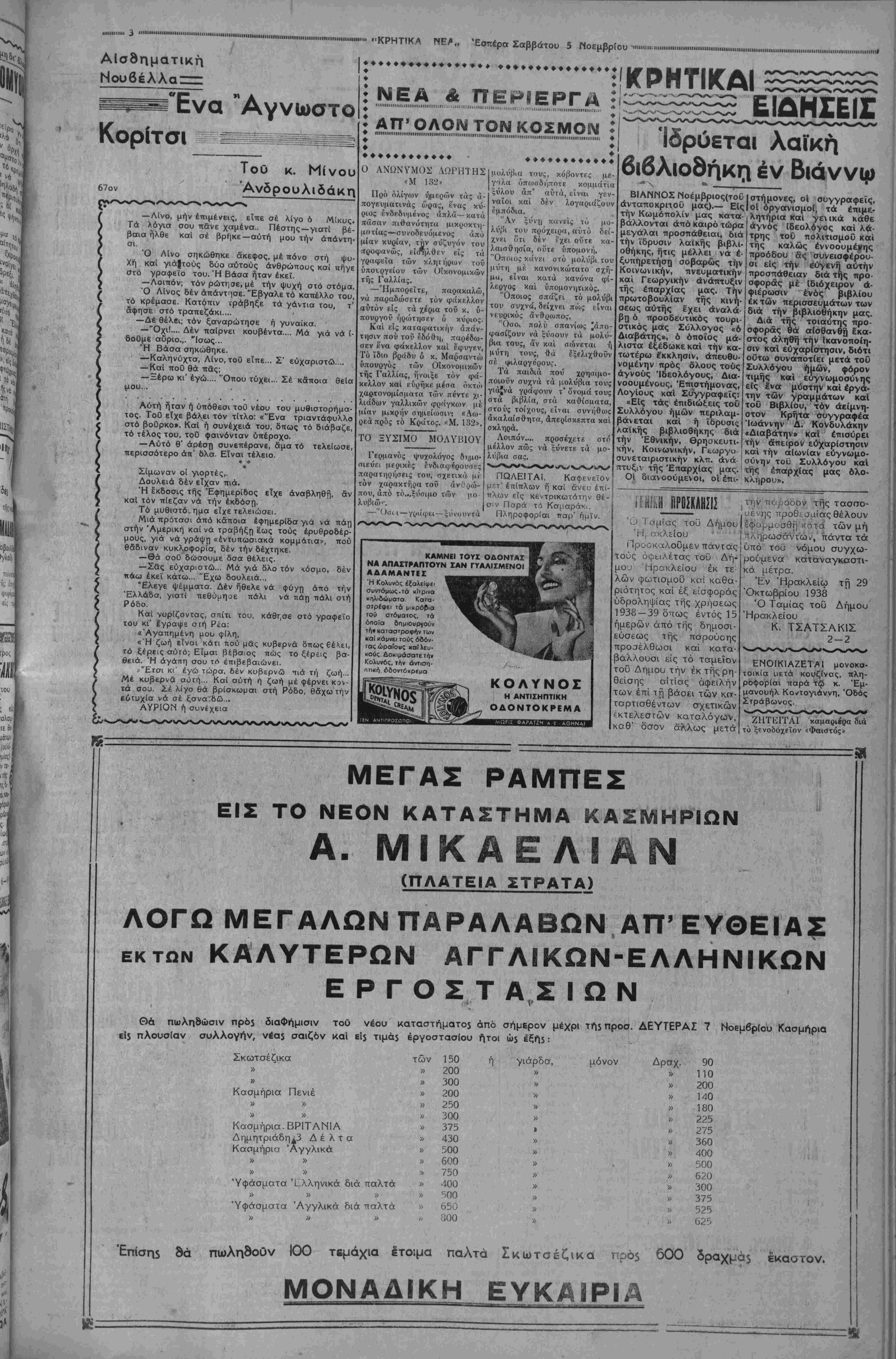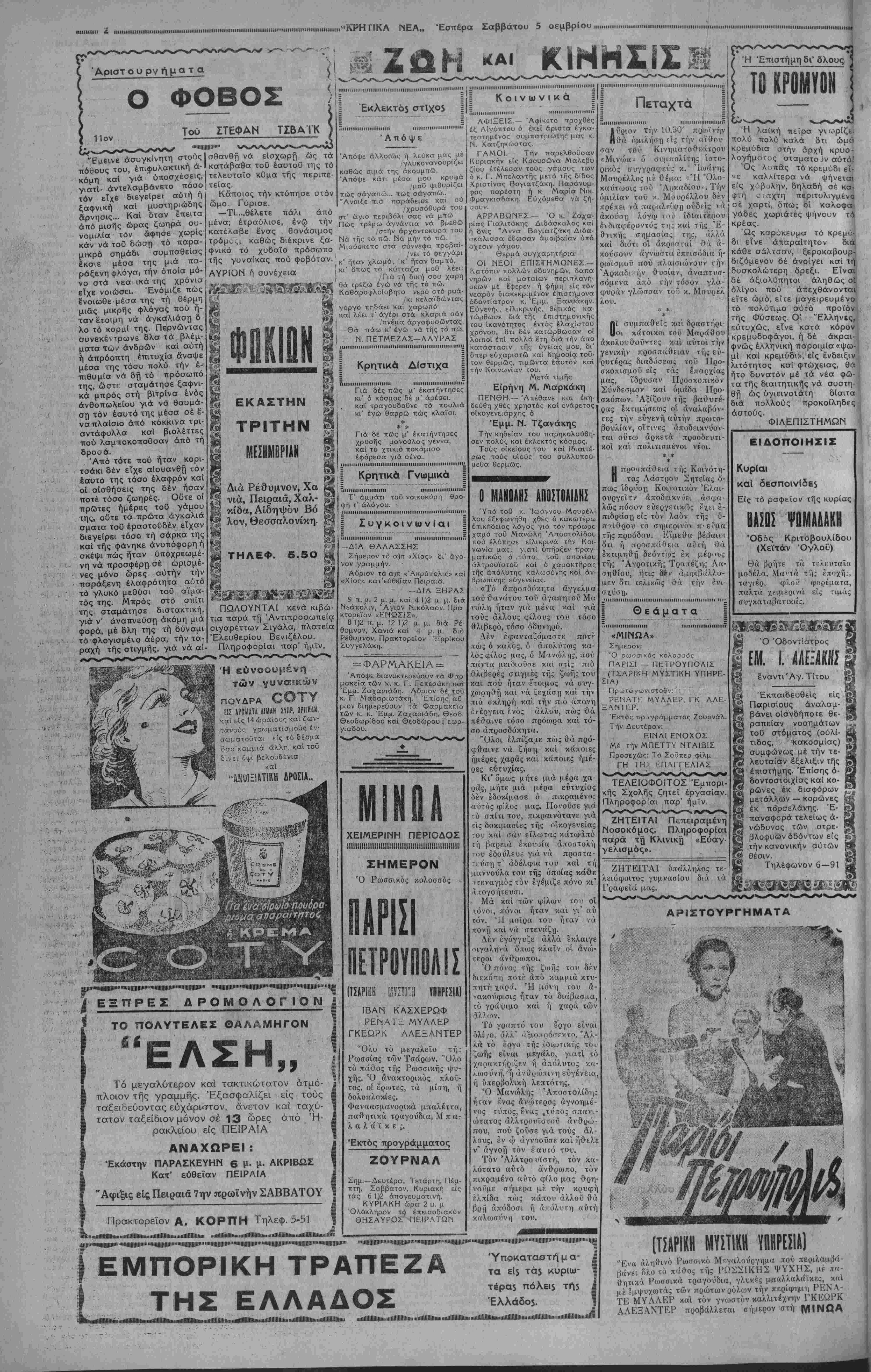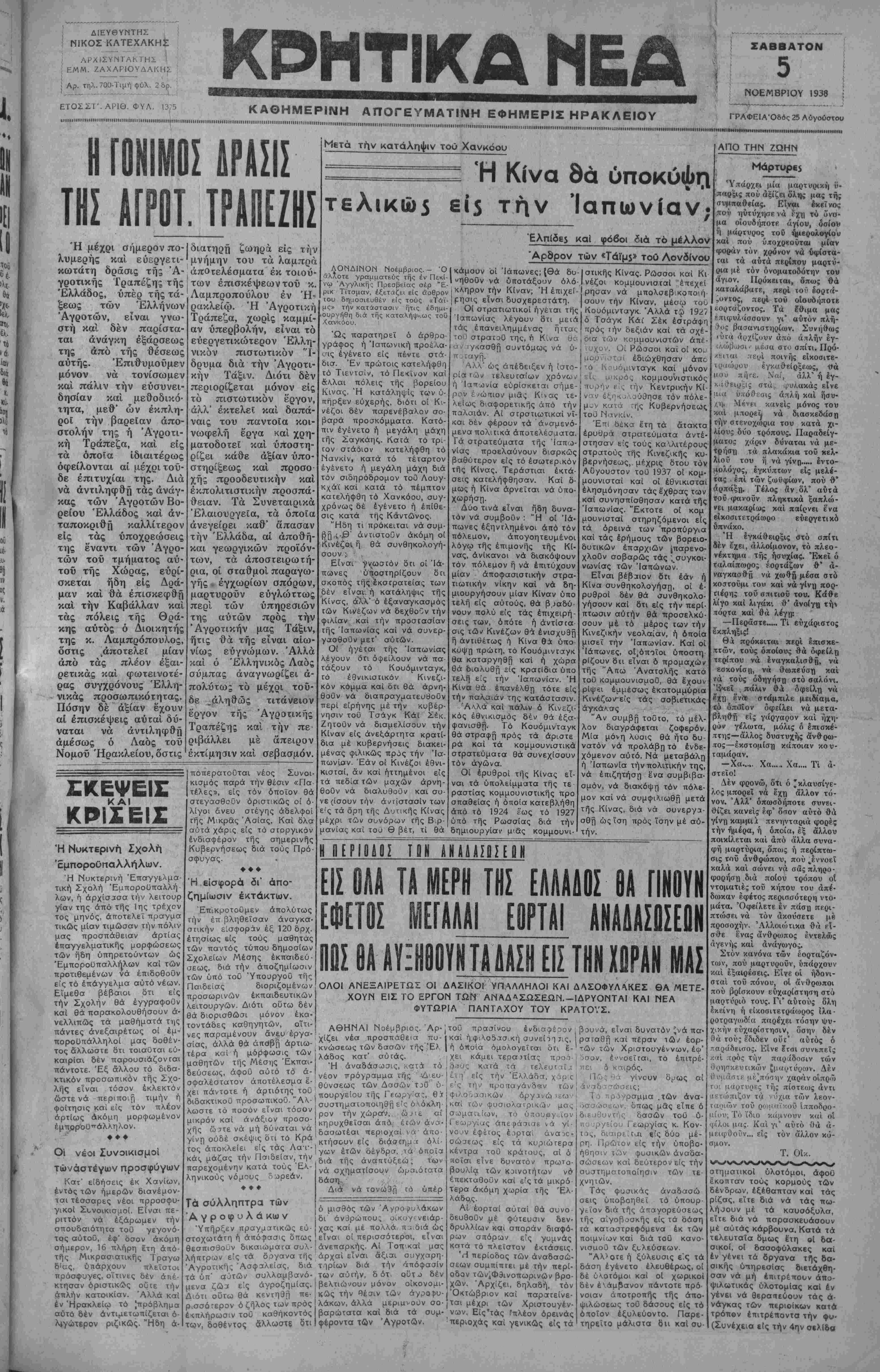 ΙΙ1ΗΙΙΙΙΙΗΙ·ΙΗΙΙΗ>·"ΙΜΙ<Η"·ΙΙΗΠΙΙΙΙΙΙΙΙΙΙΙΜΙΙΙΙΙΙΙΙΙΙΙΙΙΙΙΙΙΙΙΙΙΜΜΙΙΙΗΙΙΙΙΙΙΙΙΙΙΙΗΗΙΙΙΙΙΙΙΙΙΙΙΙΙΙΙΙΙΙΙΙΙΙΜ II Ι ΔΡΑΣΙΣ ΤΗΣ ΑΓΡθυΡΑΠΕΖΗΣ Ή μέχρι σήμερον πό-1 διατηρή ζωηρά είς την λυμερής καί εύεργετι-'μνήμην τού τα λαμπρά κωτάτη δράσις τής Ά- άπθτελέσματα έκ τοιού- γροτικής Τραπέζης τής των έπισκέψεωντοΰ κ. Ελλάδος, υπέρ τήςτά-;Λαμπροπούλου έν Ή- ξεως των Έλλήνων Άγροτών, είναι γνω- στή καί δέν παρίστα- ται άνάγκη έξάρσεως της άπό τής θέσεως αυτής. Έπιθυμοΰμεν μόνον νά τονίσωμεν καί πάλιν την εύσυνει- δησίαν καί μεθοδικό- τητα, μεθ' ών έκπλη- ροϊ την βαρείαν απο¬ στολήν της ή Άγροτι- κή Τραπέζα, καί είς τα όποϊα ιδιαιτέρως όφείλονται αί μέχρι τού¬ δε έπιτυχίαι της. Διά νά αντιληφθή τάς ανάγ¬ κας των Άγροτών Βο- ρείου Ελλάδος καί αν¬ ταποκριθή καλλίτερον είς τάς ύποχρεώσεις της έναντι των Άγρο¬ τών τοΰ τμήματος αΰ- τοΰ τής Χώρας, ευρί¬ σκεται ήδη είς Δρά- μαν καί θά επισκεφθή καί την Καβάλλαν καί τάς πόλεις τής Θρά- κης αύτός ό Διοικητής της κ. Λαμπρόπουλος, όστις ^αποτελεί μίαν άπό τάς πλέον έξαι- ρετικάς καί φωτεινοτέ- ρας συγχρόνους Ελλη¬ νικάς προσωπικότητας. Πόσην δέ αξίαν έχουν αί έπισκεψεις αύται δύ¬ ναται νά αντιληφθή άμέσως ό Ααός τοΰ Νομοΰ Ηρακλείου, όστις ρακλείώ. Ή Άγροτική Τραπέζα, χωρίς καμμί¬ αν ύπερβολήν, είναι τό εΰεργετικώτερον Ελλη¬ νικόν πιστωτικόν "Ι-1 δρυμα διά την Άγροτι- κήν Τάξιν. Διότι δέν περιορίζεται μόνον είς τό πιστωτικόν έργον, άλλ' εκτελεί καί δαπά- ναις τού παντοία κοι- νωφελή εργα καί χρη- ματοδοτεί καί ύποστη- ρίζει κάθε αξίαν υπο¬ στηρίξεως καί προσο- χής προοδευτικήν καί εκπολιτιστικήν προσπά¬ θειαν. Τα Συνεταιρικά Έλαιουργεϊα, τα όποΐα άνεγείρει καθ" άπασαν την Έλλάδα, αί αποθή¬ και γεωργικών προϊόν- των, τα άποσιιειρωτή- ρια, οί σταθμοί παραγω- γης» εγχωρίων σπόρων, μαρτυροΰν εύγλώττως περί των ύπηρεσιών της αυτών πρός την Άγροτικήν μας Τάξιν, ήτις θά τής είναι αιω¬ νίως εύγνώμων. Άλλά καί ό Ελληνικάς Λαός σύμπας άναγνωρίζει α¬ πολύτω; τό μέχρι τού¬ δε ^άληθώς τιτάνειον έργον τής Άγροτικής Τραπέζης καί την πε ριβάλλει μέ άπειρον εκτίμησιν καί σεβασμόν. -ΚΕΨΕΙΕ ΚΑΙ ΚΡΙΣΕΙΣ Ή Νυκτερινη Σχολίι Έμποροϋπαλλήλων. Ή Νυκτερινή Έπαγγ&λμα- τική Σχολή Έμποροϋπαλλή λων, ή αρχίσασα την λειτουρ γίαν της άπό τής 1ης τρέχον τος μηνός, αποτελεί πραγμσ τικώς μίαν τιμώσαν την πόλΐν μας προσπάθειαν άρτιας έπαγγελματικής μορφώσεως των ήδη ύπηρετούντων ώς Έμποροϋπαλλήλων καί των προτιθεμένων νά έπιδοθοθν είς τό έπάγγελμα αύτό νέων. Είμεθα βεβαιοί δτι είς την Σχολήν θά εγγράψουν καί θά παρακολουθήσουν α¬ νελλιπώς τα μαθήματά της πάντες άνεξαιρέτως οί έμ- ποροϋπάλληλοί μας δοθέν¬ τος άλλωστε δτι τοιαθται εύ- καιρίαι δέν παρουσιάζονται πάντοτε. Έξ άλλου τό διδα¬ κτικόν προσωπικόν τής Σχο- λής είναι τόσον εκλεκτόν ώστε νά περιποιή τιμήν ή φοΐτησις κα'ι είς τόν πλέον άρτΐως άκόμη μορφωμένον έμπρροϋΤΓάλληλον. ♦ ♦♦ Οί νέοι Συνοικισμόν Τώνάστέγων προσφύγων Κατ' είδήσεις έκ Χανίων, έντός των ημερών διανέμον- τσιτέσσαρες νέοι πρροσφυ- γικοΐ Συνοικισμοί. Είναι πε¬ ριττόν νά εξάρωμεν Γήν σπουδαιότητα τού γεγονό- τος αύτοϋ, έφ' όσον άκόμη σήμερον, 16 πλήρη ετη άπό- της Μικρασιατικήν Τραγω δ<'ας, ΰπάρχουν πλεΐστοι πρόσφυγες, οΐτινες δέν άηέ- κτησαν οριστικώς ου τε την απλήν κατοικίαν. Άλλά καί έν "Ηρακλείω τα )πρόβλημα αύτό δέν άντιμετωπίζεται ο¬ λιγώτερον ριζικώς. "Η&η ά- Μετο την κατάληψιν τού Χανκόου — Ή Κίνα θά υποκύψη τελικώ5 εί5 την Ιαπω