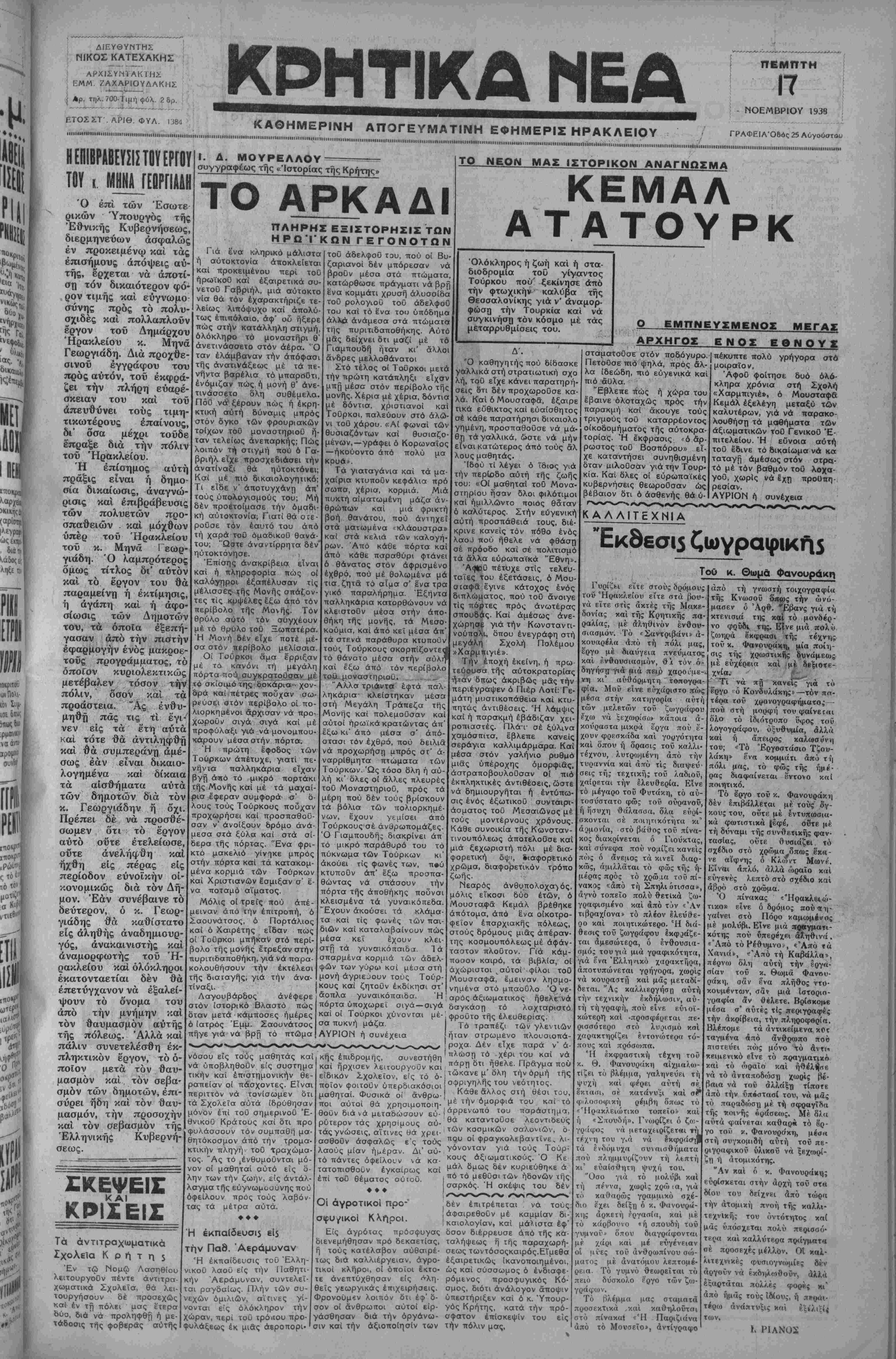 ΙΙΙΙΙΙΙΙΙΠΙΙΙ)ΙΙΙΐΙΙΙ1ΙΙΠΙΙΙ<Ι)ΙΙ<ΠΙΙΙΙΙΙΙ<ΙΙΙΙΙΠΙΙΙΙ1ΙΙΙΙΙ|||ΙΙιιΙιιΙΙΙΠΙΙ>ΙΙ<Ι1<ΙΜΙΙΙΙΙΙΙΙΙΙΙΙ>ΙΜ<<11Ι1Ι1,ι1ΙΙΙΙΙ,ΙΙΙΙΙΙΙΙ1!Ιιι<Ιιιι,ΗΙΙΙΗΐΙΙ.....ΙΙΙΙΙ1ΙΙΙΙ......ΙΙΙΐΜΙΙΙΙΙΙΙΙιΙΙΙΙ1ιΠΙΙΙΙΙΐηΐΙΜΙΙΙΙ>ΐΗΙΙΙΙΜΙΠΙΙΙΙΙΙ,ΙΙΙΙ4ΙΙΜΙ!.......ΙΙΙΙ|ΙΙΜΙΙΙ<Ι<ΙΙΙ1ΙΙΙΐ)ΐίΐ11ΐίΐΙΙ1ΙΜΠΙΙΙΙ1ΙΙ<ΙΙΙ<ΙΙΙ>Ι<Ι4ΙΙΙΙΙΙΙΝ|<1Ι·1ΙΙΙΜΙ«ΙΙΙΙΙΙ1ΙΙΙΙΙΙΙΙΐηΐΙΙΙΙΙΙΙΙ1Ι1ΙΙΙΜΙΙΙ11ΙΙΙΙΙΙΙ1ΙΙΜΙ1ΙΙΙ1ΙΙΙΙΙ1ΙΙ]11ΙΙ1ΙΙΗΙΙΙ Η ΕΠΙΒΡΑΒΕΥΣΙΣ ΤΟΥ ΕΡΓΟΥ ΤΟΥ ι ΜΗΝΑ ΓΕΟΡΠΑΑΗ Ό επί των Έσωτε ρικών Ύπουργός τής Έθνικής Κυβερνήσεως, διερμηνεύων ασφαλώς έν προκειμένον καί τάς έπισήμους άπόψεις αύ- τήδ» έρχεται νά άποτί- ση τόν δικαιότερον φό¬ ρον τιμής καί εύγνωμο συνης πρός τό πολυ- σχιδές καί πολλαπλοΰν έργον τοΰ Δημάρχου Ηρακλείου κ. Μηνά Γεωργιάδη. Διά προχθε- σινοΰ έγγράφου τού πρός αυτόν, τοΰ έκφρά- ζει την πλήρη εύαρέ- σκειαν τού καί άπευθύνει τούς Ι. Δ. ΜΟΥΡΕΛΛΟΥ------------- συγνραφέως τής «Ίστορίας τής Κρήτης» ΤΟ ΑΡΚΑΔΙ ΤΤΛΗΡΗΣ ΕΞΙΣΤΟΡΗΣΙΣ ΤΩΝ Η.Ρβ'ΓΚ ΩΝ Γ Ε_Γ ΟΝ Ο Τ Ω Ν τού τιμη- τικωτέρους έπαίνους, δι* δσα μέχρι τοΰδε έπραξε διά την πόλιν τοΰ Ηρακλείου. Ή έπίσημος πράξις είναι ή αυτή δημο- - - - ι -II --- σία δικαίωσις, άναγνώ- ρισις καί έπιβράβευσις των πολυετών προ- σπαθειών . καί μόχθων υπέρ τοϋ Ηρακλείου τοΰ κ. Μηνά Γεωρ¬ γιάδη. Ό λαμπρότερος δμως τίτλος δι' αυτόν καί τό έργον τού θά παραμείνη ή έκτίμησις, ή άγάπη καί ή άφο- σίωσις των Δημοτών τού, τα όποϊα έξεπή- γασαν, άπό την πιστήν εφαρμογήν ενός μακρον Γιά £να κληρικό μάλιστα ή αύτοκτονία άποκλείεται καί προκειμένου περί τοϋ ήρωϊκοϋ καί έξαιρετικά συ- νετοϋ Γαβριήλ, μιά αύτοκτο νία θά τόν έχαρακτήριζε τε¬ λείως λιπόψυχο καί απολύ¬ τως έπιπόλαιο, άφ' ου ήξερε πώς στήν κατάλληλη στιγμή, όλόκληρο τό μοναστήρι θ' άνετινάσσετο στόν άέρα. Ό ταν έλάμβαναν τήν άπόφασι τής άνατινάξεως μέ τα πε- νήντα βαρέλια τό μπαροθτι, ένόμιζαν πώς ή μονή θ' άνε¬ τινάσσετο ολη συθέμελα. ΠόΟ νά> ξέρουν πώς ή έκρη-