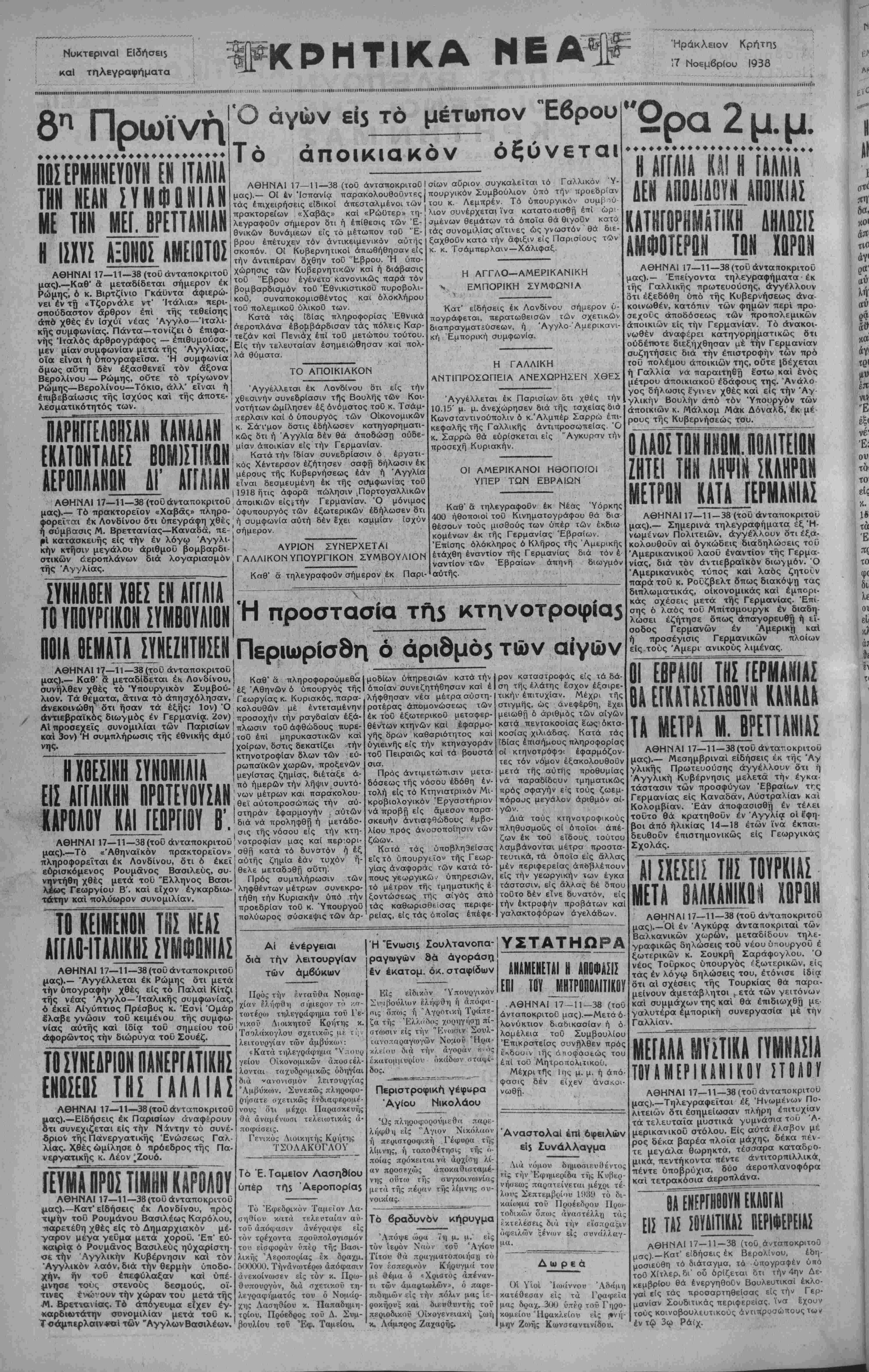 ΑΘΗΝΑΙ 17—11—38 (τού άνταποκριτοΰ