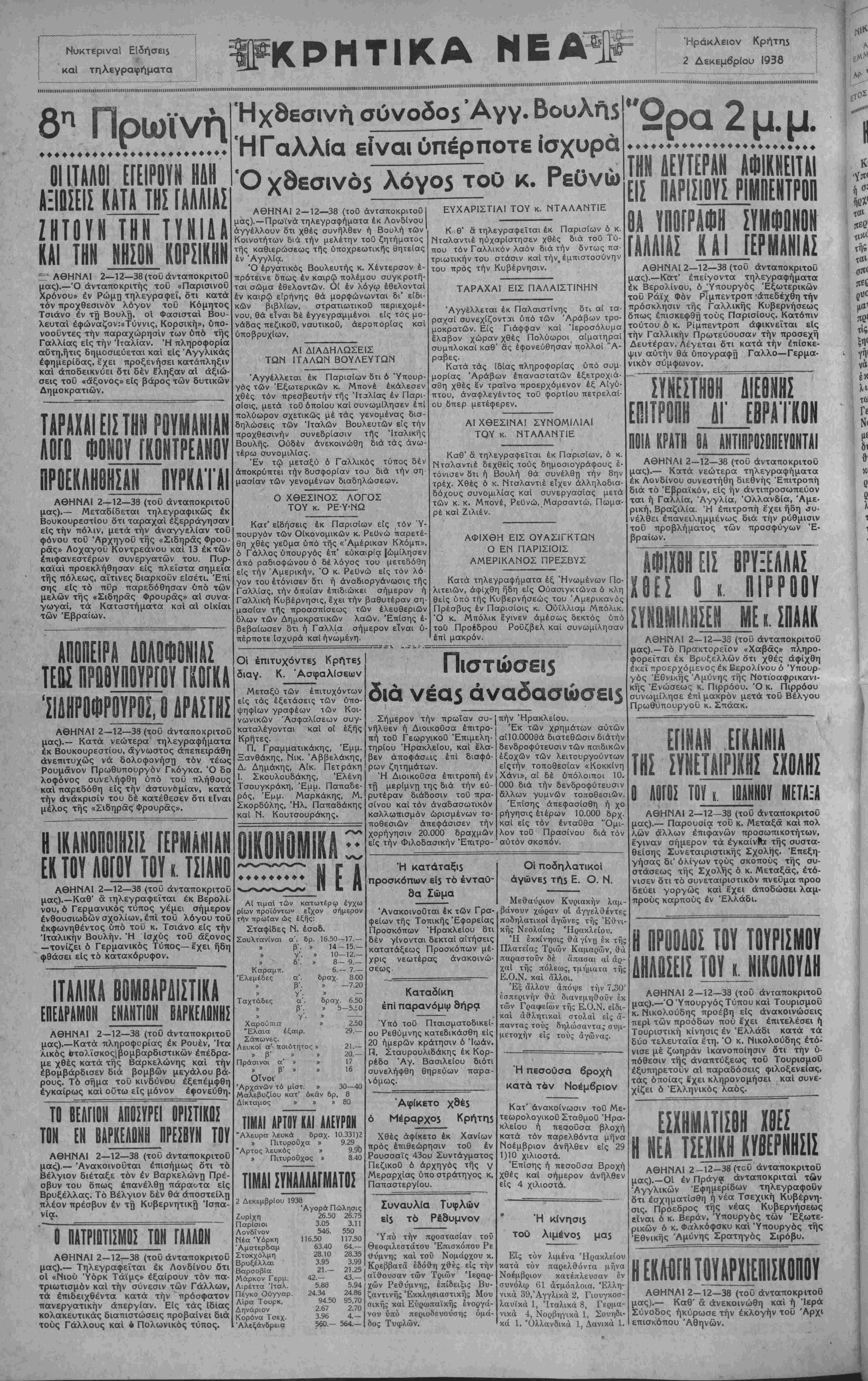 βεν άποφάσ<ας επί διαφό¬ ρων ζητημάτων. Ή Διοικοθσα έπιτροπή έν τή μερίμντ} της διά την εύ- ρυτέραν διάδοσιν τοϋ πρα- σίνου καΐ τόν άναδασωτικόν καλλωπισμόν ωρισμένων το- ποθεσιών απεφάσισεν την χορήγησιν 20.000 δραχμών είς την Φιλοδασικήν Επιτρο¬ πήν "Ηρακλείου. Έκ των χρημάτων αυτών αΊΙΟ.ΟΟΟΘά διατεθώσιν διάτήν δενδροφύτευσιν των παιδικών έξοχών των λειτουργούντων είςτήν τοποθεσίαν «Κοκκίνη Χανι», αί δέ ύπόλοιποι 10. 000 διά την δενδροφύτευσιν άλλων γυμνών τοποθεσιών. Έπίσης απεφασίσθη ή χο ρήγησις έτέρων 10.000 δρχ. καί είς τόν ένταϋθα Όμι¬ λον τοθ Πρασίνου διά τόν αυτόν σκοπόν. Ή κατάταξΐ5 προσκόπων εί$ τό ένταΰ- δα Σώμα Ανακοινούται έκ των Γρα¬ φείων τής Τοπικής ΈφορεΙας Προσκόπων Ηρακλείου δτι δέν γίνονται δεκταί αίτήσεις κατατάξεως Προσκόπων μέ¬ χρις νεωτέρας άνακοινώ- σεως ΟΙ ποδηλατικοΐ άγώνε5 τγϊ5 Ε. Ο. Ν. Καταδίκη επί παρανόμω δήρα "Υπό τοθ Πταισματοδικεί- ου Ρεθύμνης κατεδικάσθη είς 20 ημερών κράτησιν ό Ιωάν. Π. Σταυρουλιδάκης έκ Κορ- ρέδο Αγ. Βασιλείου διότι συνελήφθη θηρεύων παρα- νόμως. "Αφίκετο χδέ$ Μέραρχο5 Κρήτη5 Χθές αφίκετο έκ Χανίων πρός επιθεώρησιν τοθ έν Ρουσσαΐς 43ου Συντάγματος ΠεζικοΟ ό άρχηγός τής γ ΜεραρχΙας υπο στράτηγος κ. ΠαπαστεργΙου. Συναυλΐα Τυφλών εΐ3 τό Ρέθυμνον "Υπό την προστασίαν τοΰ Θεοφιλεστάτου Έπισκόπου Ρε ϋύμνης καί τοΰ Νομάρχου κ. Κρεββατά εδόθη χθές είς την αίθουσαν των Τριών Ίεραρ- χών Ρεθύμνης, έπίδειξις Βυ- ζαντινής Έκκλησιαστικής Μου σικής καί Εύρωπαϊκής ένοργά- νου υπό περιοδευούσης ομά¬ δος Τυφλών. Μεθαύριον Κυριακήν λαμ- βάνουν χώραν οί άγγελθέντες ποδηλατικοί άγώνες τής Έθνι κης Νεολαίας Ηρακλείου. Ή έκκίνησις θά γίνη εκ τής Πλατείας Τριών Καμάρων, θά παραστοΰν δέ απασαι αί αρ¬ χαί τής πόλεως, τμήματα τής Ε.Ο.Ν. καί άλλοι. Έξ άλλου άπόψε την 7.30' εσπερινήν θά διανεμηθούν έκ των Γραφείων τής Ε.Ο.Ν. εϊδι- καί άθλητικαί στολαί είς ά¬ παντας τούς δηλώσαντας συμ¬ μετοχήν είς τούς αγώνας. Ή πεσοϋσα κατά τόν Νοέμβριον Κατ' ανακοίνωσιν τοθ Με- τεωρολογικοθ ΣταθμοΟ "Ηρα¬ κλείου ή πεσοΰσα βλοχή κατά τόν παρελθόντα μήνα Νοέμβριον ανήλθεν είς 29 1)10 χιλιοστά. Έπίσης ή πεσοΰσα Βροχή χθές καΐ σήμερον ανήλθεν είς 4 χιλιοστά. Ή κινήση τού λιμένο5 μα$ Είς τόν λιμένα Ηρακλείου κατά τόν παρελθόντα μήνα Νοέμβριον κατέπλευσαν έν συνόλορ 61 άτμόπλοια. Έλλη- νικά 39,'Αγγλικά 2, Γιουγκοσ- λαυϊκά 1, Ίταλικά 8, Γερμα- νικά 4, Νορβηγικά 1, Σουηδι- κά 1. Όλλανδικά 1, Δανικά 1. ι#2ρα 2 μ. μ ♦♦♦♦♦♦♦♦♦♦♦♦♦♦♦♦♦♦♦♦♦♦♦♦♦ ΤΗΝ ΔΕΥΤΕΡΑΝ ΑΦ ΕΙΣ ΠΑΡΙΣΙΟΥΣ ΡΙΜ ΚΚΕΙΤΑΙ ΓΑΑΛΙΑΣ ΚΑΙ ΕΡΜΑΝΙΑΣ ΑΘΗΝΑΙ 2—12—38 (τοθ άνταποκριτοΰ μας).—Κατ' έπείγοντα τηλεγραφήματα έκ Βερολίνου, ό^Υπουργός Εξωτερικών τοΰ Ράϊχ Φόν Ριμπεντροπ "απεδέχθη την πρόσκλησιν τής Γαλλικής Κυβερνήσεως δπως επισκεφθή τούς Παρισίους. Κατόπιν τούτου ό κ. Ριμπεντροπ αφικνείται είς την Γαλλικήν Πρωτεύουσαν την προσέχη Δευτέραν. Λέγεται δτι κατά την επίσκε¬ ψιν αύτην θά υπογραφή Γαλλο—Γερμα¬ νικόν σύμφωνον. ΕΠΙ1 ίΥΝΕΣΤΗΟΙ Δ Ε )Μ ΚΟΝ ΠΟΙΑ ΚΡΑΤΗ 8Α ΑΝΤΙΠΡΟΣΟΠΕΥΟΝΤΑΙ ΑΘΗΝΑΙ 2—12—38 (τοΰ άνταποκριτοΰ μας).— Κατά νεώτερα τηλεγραφήματα έκ Λονδίνου συνεστήθη διεθνής Έπιτροπή διά τό Έβραϊκόν, είς ήν άντιπροσωπεύον ται ή Γαλλία, Αγγλία, Όλλανδία, Άμε- ρική, Βραζιλία. Ή έπιτροπή εχει ήδη «ΐυ- νέλθει έπανειλημμένως διά την ρύθμισιν τοΰ προβλήματος των προσφύγων "Ε¬ βραίων. ΑΦΙΧΘΗ ΕΙΣ ΧΘΕΣ Ο ι ΒΡΥΞ Π _________ ΡΟ ΣΥΝΩΜΙΑΗΣΕΝ_ΜΕ κ. ΣΠΑΑΚ ΑΘΗΝΑΙ 2—12—38 (τοΰ άνταποκριτοΰ μας).—Τό Πρακτορειον «Χαβάς» πληρο- φ