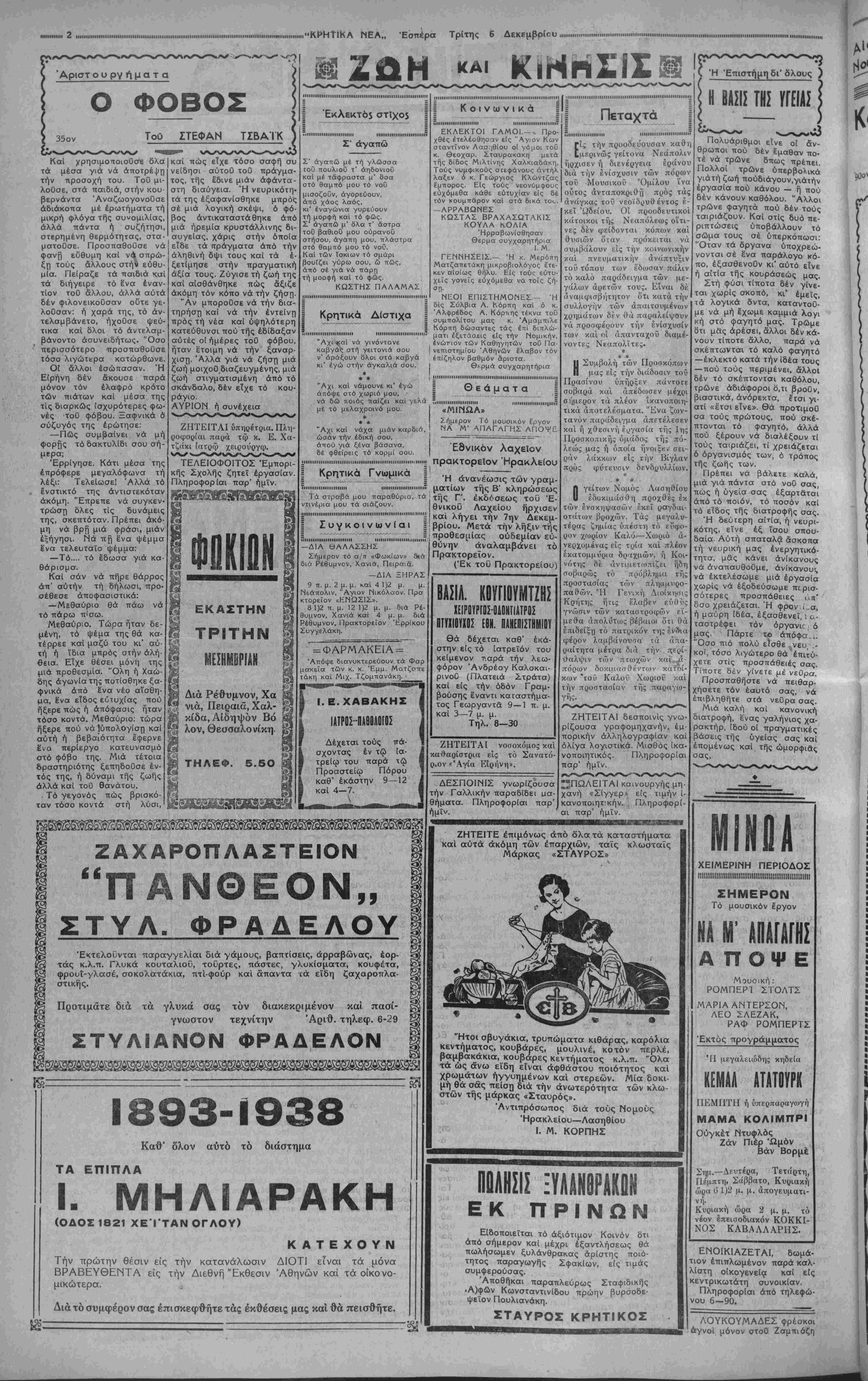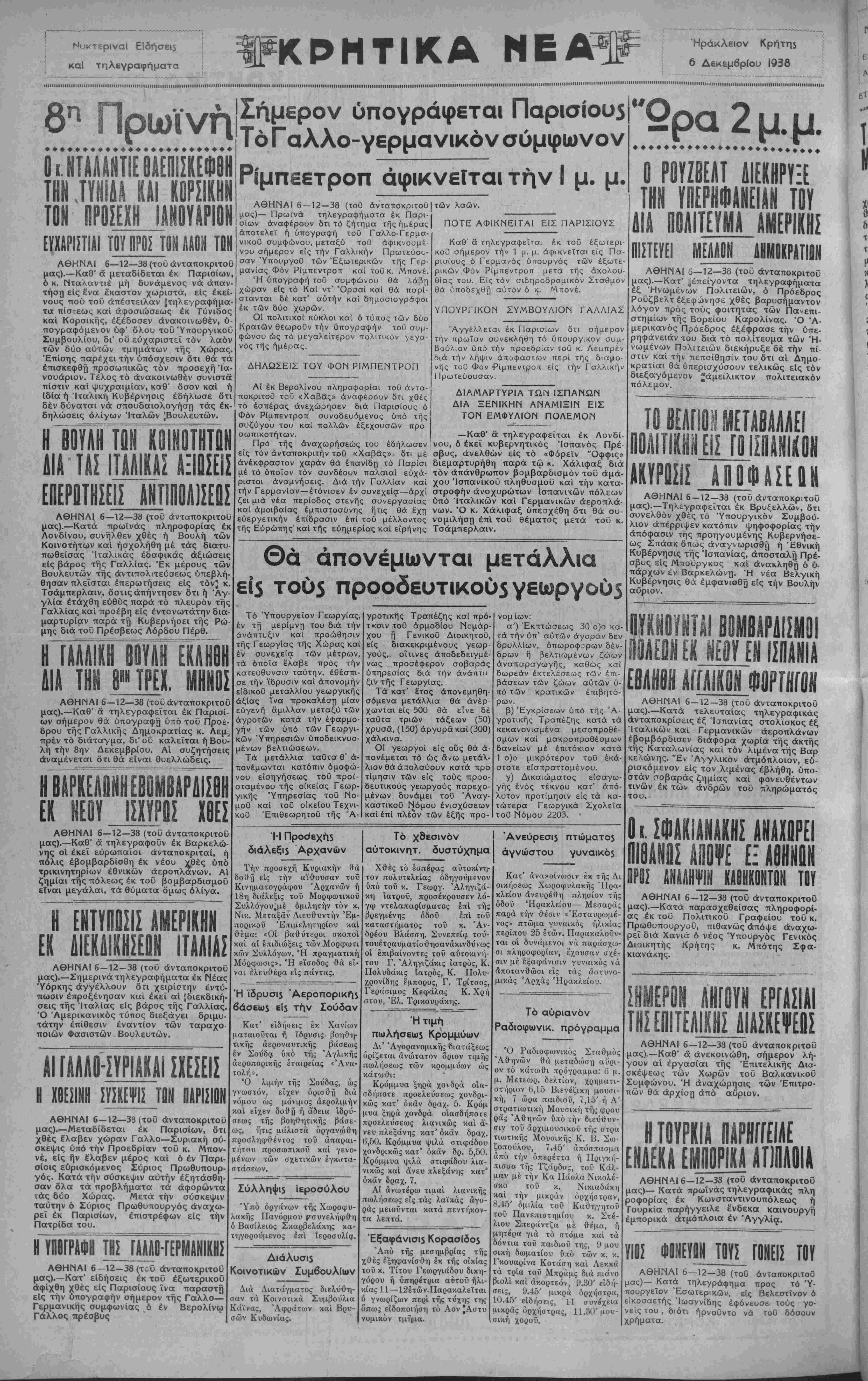 μένων των σχετικών έγκ»<τα- στάσεων. Σύλληψΐ5 ίεροσύλου Υπό όργάνων τής Χωροφυ- λακής Πανόρμου ^συνελήφθη δ Βασίλειος Σκαρβελάκης κα- τηγορούμενος επί ίεροσυλία. Διαλύση Κοινοτικόν Συμβουλίων Διά Διατάγματος διελύθη¬ σαν τα Κοινοτικά Συμβούλια Κάινας, Άφράτων καί Βρυ- σών Κυδωνίαςν Τό χΒεσινον αύτοκινητ. δυστύχημα Χθές τό εσπέρας αυτοκίνη¬ τον πολυτελείας όδηγοΰμενον υπό τοΰ κ. Γεωργ. Άληγιζά- κη ΐατροϋ, προσέκρουσεν λό¬ γω ντελαπαρίσματος επί τής βρεγμένης όδοΰ επί τοΰ καταστήματος τοΰ κ. Άν- δρέου Βλάσση. Συνεπεία τού- τουέτραυματίσθησανάκινδύνως οί έπιβαίνοντες τοΰ αύτοκινή- του Γ. Άληγιζάκις Ίατρός, Κ. Πολυδάκις ίατρός, Κ. Πολυ- χρονίδης έμπορος, Γ. Τρίτσος, Γεράσιμος Κεφάλας Κ. Χρη στου, Έλ. Τρικουράκης. Ή τιμί, πωλήσεω5 Κρομμύων Δι' Άγορανομικής διατάξεως όρίζεται ανώτατον όριον τιμής πωλήσεως των κρομμύων ώς κάτωθι: Κρόμμυα ξηρά χονδρά οία- σδήποτε προελεύσεως χονδρι¬ κώς κατ' οκάν δραχ. 5. Κρόμ μυα ξηρά χονδρά οίασδήποτε προελεύσεως λιανικώς καί ά¬ νευ πλεξάνης κατ' οκάν δραχ. 6,50. Κρόμμυα ψιλά στιφάδου χονδρικώς κατ' οκάν δρ. 5,50. Κρόμμυα ψιλά στιφάδου λια¬ νικώς καί άνευ πλεξάνης κατ' οκάν δραχ. 7. Αί ανωτέρω τιμαί λιανίκης πωλήσεως είς τάς λαϊκάς άγο- ράς μειοΰνται κατά πεντήκον¬ τα λεπτά. Εξαφανίση Κορασίδο$ Άπό τής μεσημβρίας τής χθές εξηφανίσθη έκ τής οικίας τοΰ κ. Τίτου Γεωργιάδου δικη- γόρου ή ύπηρέτρια α·6τοΰ ήλι- κίας 11—12έτών·Παρακαλεΐται ό γνωρίζων περί τής τύχης της όπως ειδοποιηθη τό Αον ^Α νομικόν τμήμα. Άνεύρεσι$ πτώματο5 αγνώστου γυναικό$ Κατ' ανακοίνωσιν έκ τής Δι οικήσεως Χωροφυλακής Ηρα¬ κλείου ανευρέθη πλησίον τής όδού Ηρακλείου— Μεσαράς παρά την θέσιν «Έσταυρωμέ- νος» πτώμα γυναικός ήλικίας περίπου 25 έτών. Παρακαλοΰν- ται οί δυνάμινοι νά παράσχω- σι πληροφορίαν, έχουσαν σχέ¬ σιν μέ εξαφάνισιν γυναικός νά άποτανθώσι είς τάς αστυνο¬ μικάς Αρχάς Ηρακλείου. Τό αυριανόν Ραδιοφωνικ. πρόγραμμα Ό Ραδιοφωνικός Σταθμός Αθηνών θά μεταδώσιι αύρι¬ ον τό κάτωθι πρόγραμμα: (5 μ. μ. Μετιωρ. δελτίον, χρηματι¬ στήριον 0,15 Βιενέζικη μουσι- κή, 7 ώρα παιδιοΰ, 7,15' ή Α' στρατιωτικαι Μουσική τής φρου ράς Αθηνών υπό την διεύθυν¬ σιν τοΰ άρχιμουσικοΰ τής στρα τιωτΐκής Μουσικής Κ. Β. Σω- ζοπούλου, 7,45' άπόσπασμα άπό την όπερέττα ή Πριγκή- πισσα τής Τζάρδσς, τοΰ Κάλ- μαν μέ την Κα Πάολα Νικολέ- σκο τοϋ κ. Νικιαδάκη καί την μικράν ορχήστραν, ΗΛδ' όμιλία τοΰ Καθηγητού τοΰ Πανεπιστημίου κ. Στέ- λιου^ Σπεράντζα μέ θέμα, ή μητέρα γιά τό στόμα καί τα δόντια τοΰ παιδιοΰ της, 9 μου σική δωματίου υπό των κ. κ. Γκουαρίνα Κοτάση καί Λεκκά τα τρΐα τοΰ Μπράμς διά πιάνο βιολί καί άκορτεόν, 9.30' είδή¬ σεις, 9.45' μικρά δρχήστρα, 10.45' είδήσεις, 11 συνέχεια μικράς δρχήστρας, 11.30' μου¬ σική χοροΰ. "Ορα2μ.μ ΟΡΟ ΤΗΝ ΕΛΤ Δ ΉΦΑΝ ΕΚΗΡΥΞΕ Μ ΤΟΥ ΛΙΤΕΥΜΑ ΑΜΕΡΙΚΗΣ ΠΙΣΤΕΥΕΙ ΜΕΑΛΟΝ ΛΗΜΟΚΡΑΤΙΟΝ ΑΘΗΝΑΙ 6—12—38 (τοΰ άνταποκριτοϋ μας).—Κατ' ^έπείγοντα τηλεγραφήματα έξ Ήνωμένων Πολιτειών, ό Πρόεδρος Ροΰζβελτ εξεφώνησε χθές βαρυσήμαντον λόγον πρός τούς φοιτητας των Πανεπι- στημίων τής Βορείου Καρολίνας. Ό Ά- μερικανός Πρόεδρος εξέφρασε την ύπε- ρηφάνειάν τού διά τό πολίτευμα των Ή¬ νωμένων Πολιτειών διεκήρυξε δέ την πί στιν καί την πεποίθησιν τού δτι αί Δημο- κρατίαι θα ύπερισχύσουν τελικώς είς τόν διεξαγόμενον *άμείλικτον πολιτειακόν πόλεμον. ΤΟ ΒΕΛΠΟ! ΜΕΤΑβΑΑΑΕΙ ΠΟΑΙΤίΚΗΙΙΕΙΙ ΓΟΙΣΠΑΗ1ΚΟΝ ΑΚΥΡΟΣ1Σ ΑΠΟΦΑΣΕΠΝ ΑΘΗΝΑΙ 6 — 12—38 (τοΰ άνταποκριτοϋ μας).—Τηλεγραφείται έκ Βρυξελλών, δτι συνελθόν χθές τό Υπου