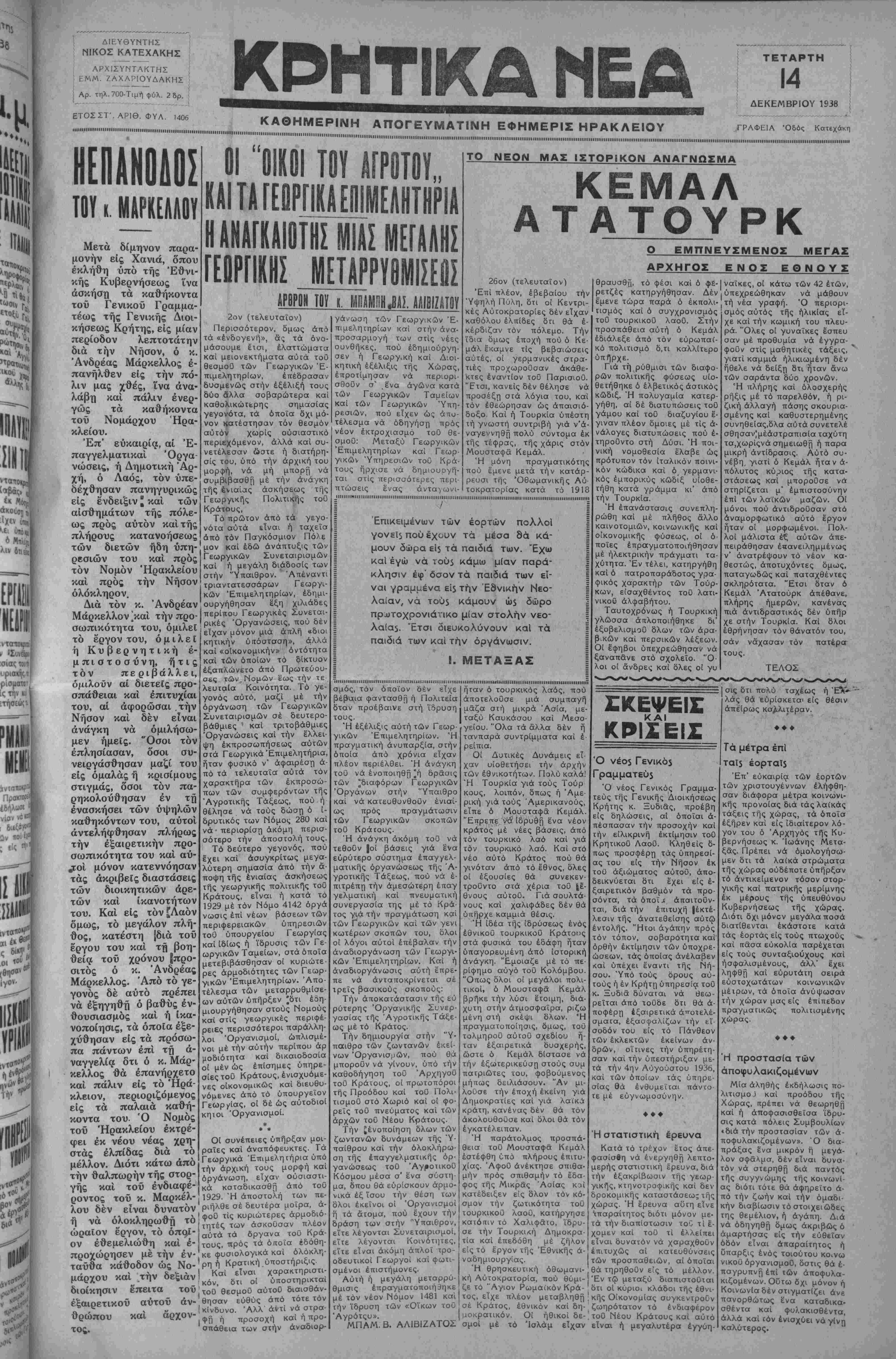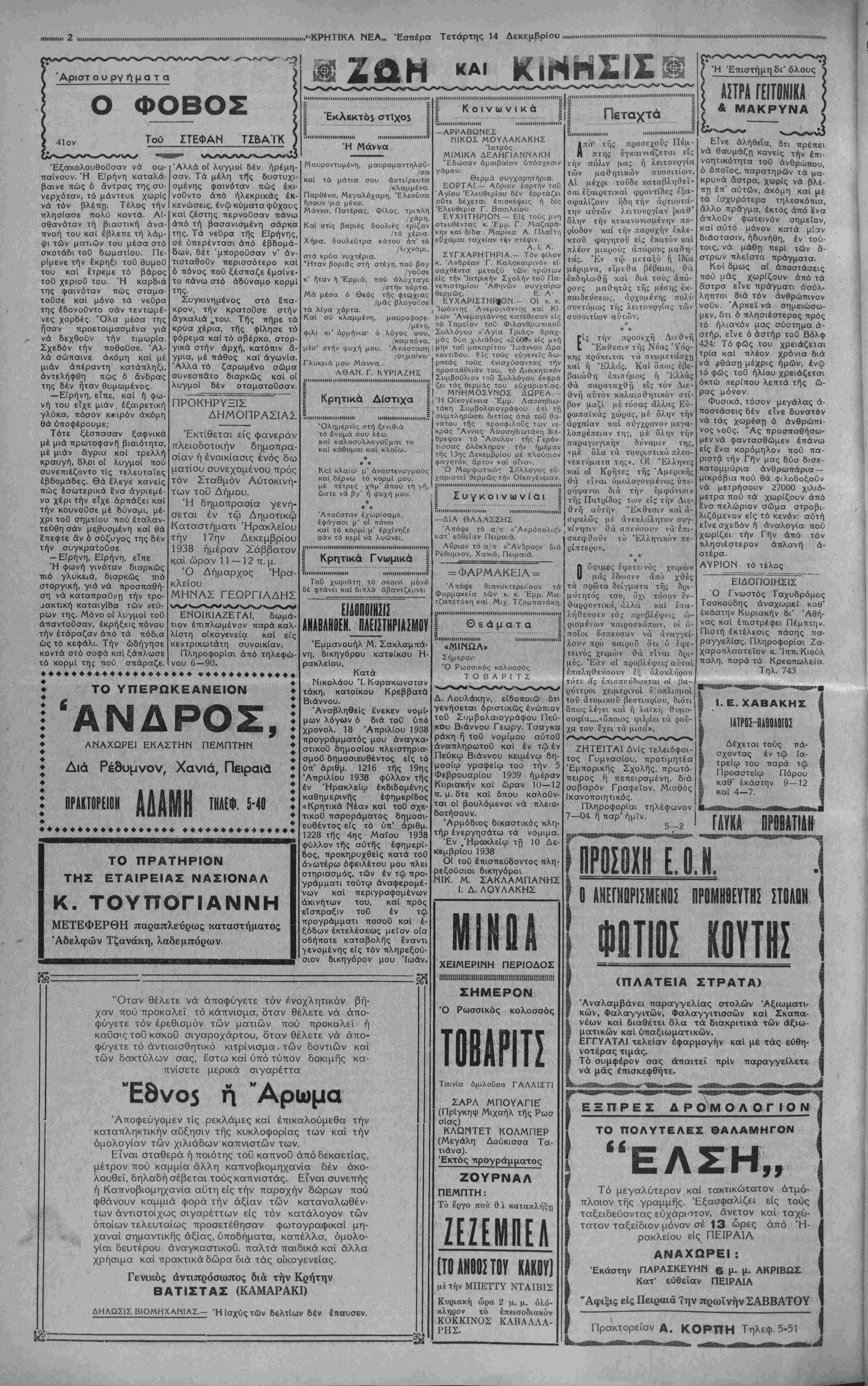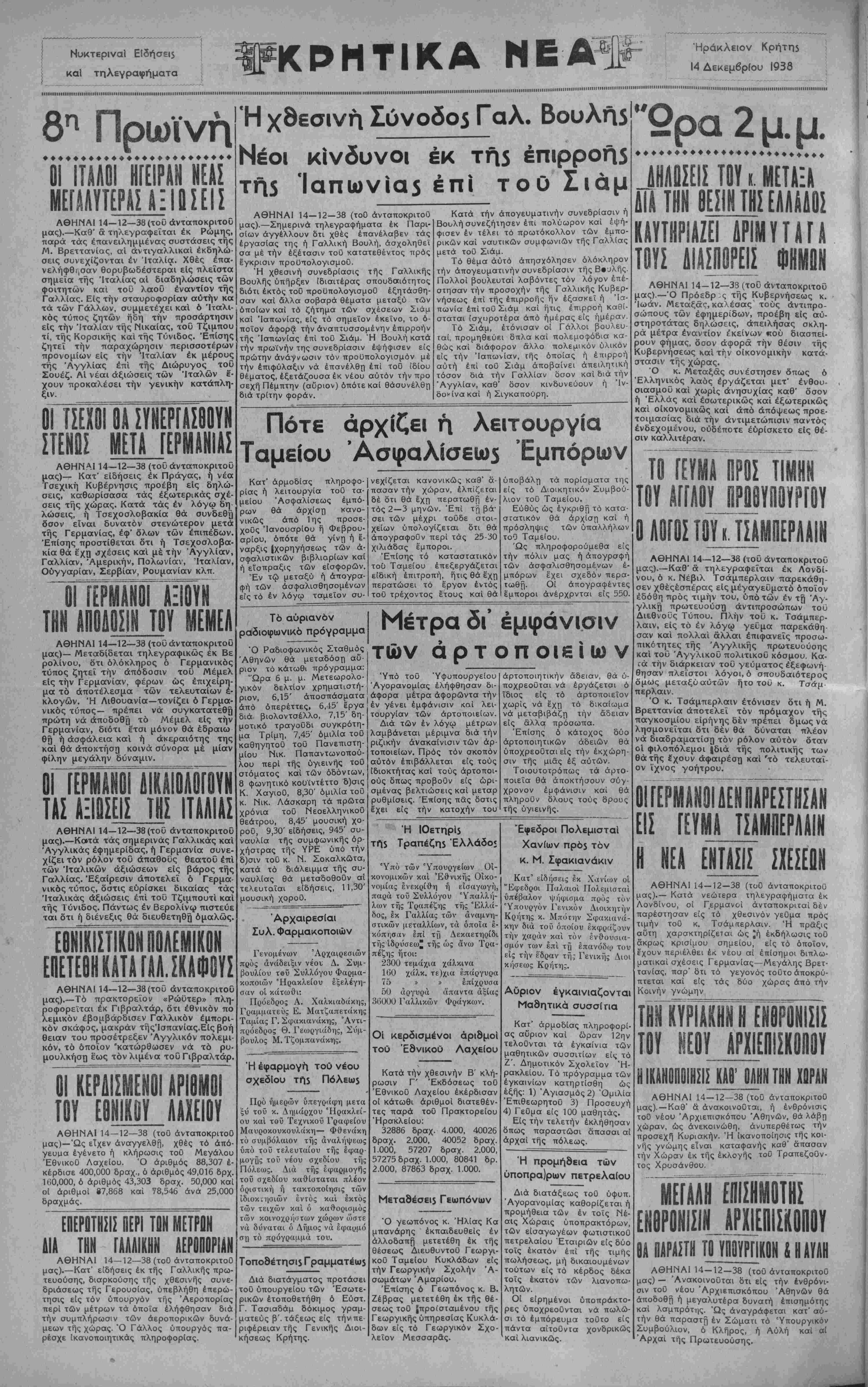 ΑΘΗΝΑΙ 14—12—38 (τού άνταποκριτοθ