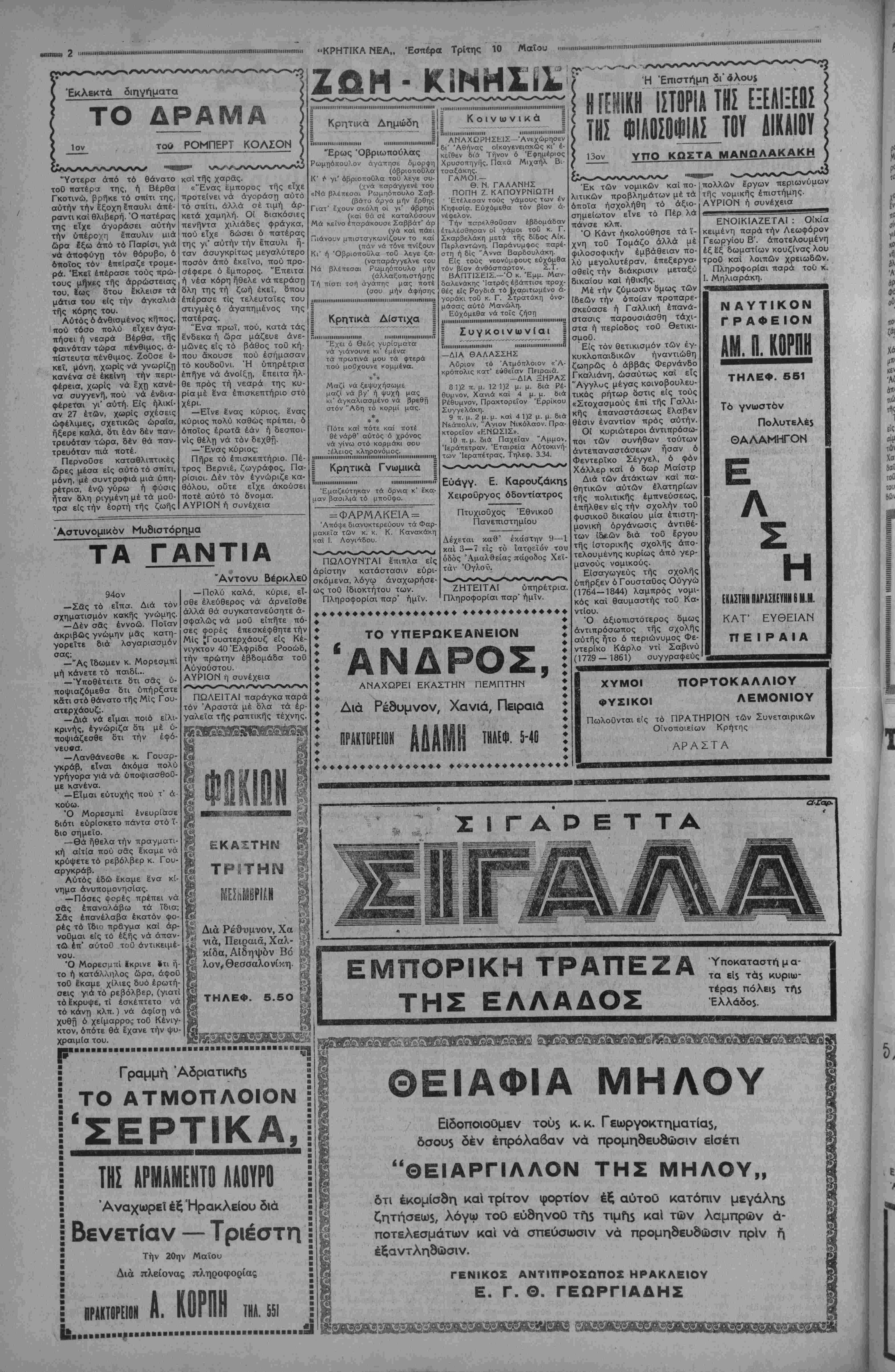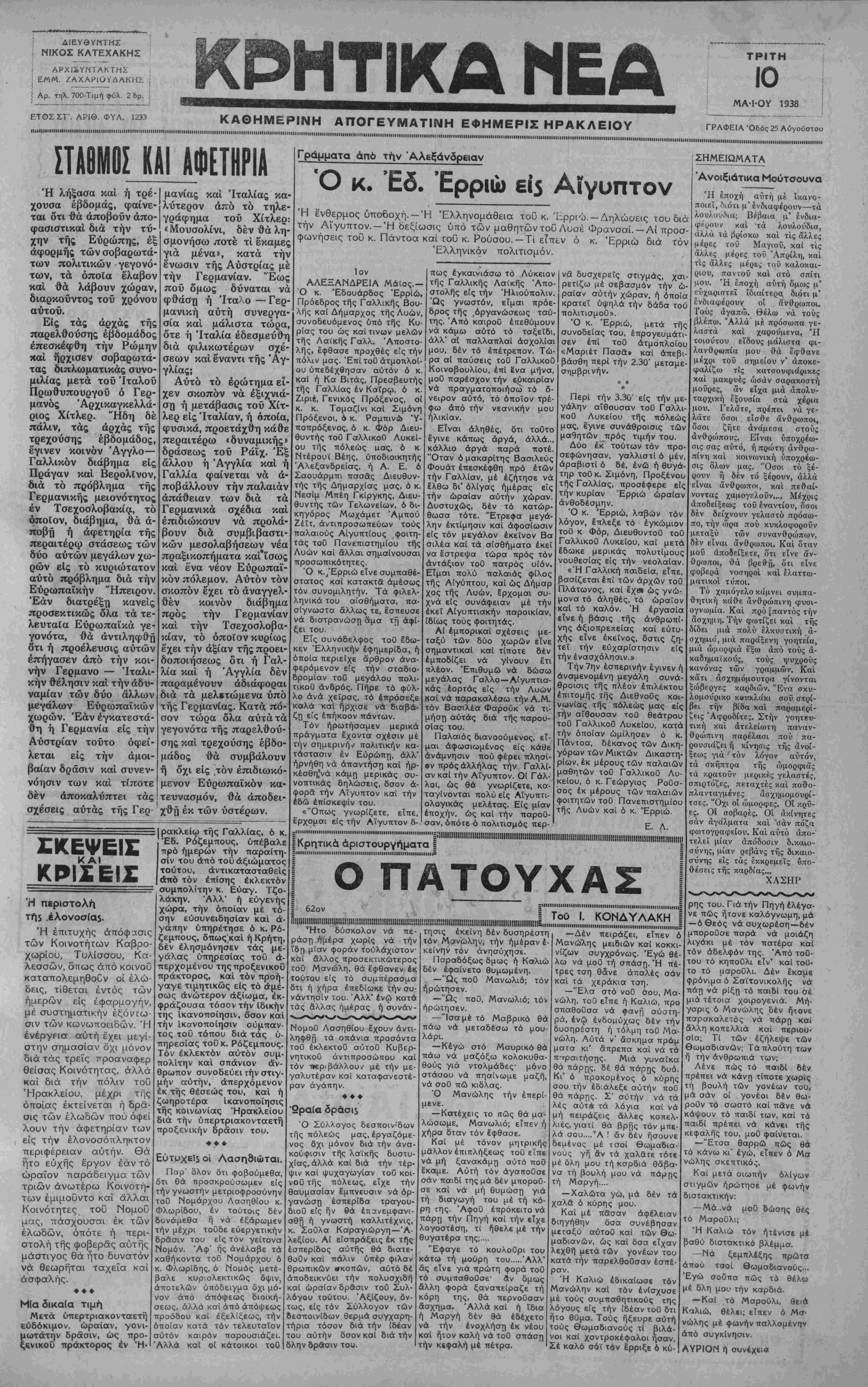||Ι1ΙΙΙΙΙΙΙΙΙΙΙΙΙ·>·ΙΙΙΙ>ΙΙΙΙΙΙ1ΜΙΙΙΙΙ(ΙΜΙΙΙΙΙΙΙ(Ι1<ΙΠΙΜΙΙΙΙΙΙΙΙ11ΙΙΜ1ΙΙΙΗΙΙΙΙ.....Ι1ΙΙΙΙΙ11Ι1|ΙΙΙΙ1ΙΙΙΙΙΙ1ΙΙΙΙ1ΙΙ1ΙΙΙΙ1Ι>1ΙΙΙΙΙΙΙΙ!Μ1ΙΙ|ΙΙΙ|1||ΠΙΙ|ΙΙ·ΙΠΙΙΜΙΙΙΙΠΙΙ·ΜΙΙΙΙΙΙΙΙΙΙΙΙΙ1ΙΙΙΠΙΙΙΙΙΙΙΙΙΙΙ.....ΙΙΙΙΙΙ)ΙΙΙΜΙΙ)ΙΙΙ1ΙΙΙΙΙΙΙΙΙΙΙΙΙ1·ΙΙΙΙΙΙ·ΙΙΙ1Ι·ΙΙΙΙΙΙΙ·ΙΙΜΙΙΠΙΙΙΙΙΙΙΙΙΙΙ*ΙΙΙΙΙΙΙΙΙΙΙΙΙΙΙΙΙ<ΙΗΗΙΙΙΙΙΙΙΙΙΙΙΙίΙΙΙΙΙΙ<ΙΙΙΙΙΙΙΙΙΗΙΙ|1ΙΙ|ΜΙΙΙΙΙΙΙΙΙΙΙΙΙΙ|ΙΙΙΙ||||Ι||||||||||ΙΙΙΙΙΙΙΙΙΙΙ··ΙΙΙΙΙΙΙ<ΜΙΙΙΙ ΤΡΙΤΗ 10 ΜΑ-Ι-ΟΥ 1938 ΣΤΑθΜΟΣ ΚΑΙΑΦΕΤΗΡΙΑ Ή λήξασα καί ή τρέ· χουσα έβδομάς, φαίνε- ται ότι θά άποβοΰν άπο- φασιστικαί διά την τύ¬ χην τής Εύρώπης, έξ άφορμής των σοβαρωτά¬ των πολιτικών γεγονό- των, τα όποία έλαβον καί θά λάβουν χώραν, διαρκοϋντος τοΰ χρόνου αυτού. Είς τας αρχάς τής παρελθούσης εβδομάδος επεσκέφθη την Ρώμην καί ήρχισεν σοβαρωτά- τας διπλωματικάς συνο- μιλίας μετά τοΰ Ιταλού Πρωθυπουργοΰ ό Γερ- μανός Άρχικαγκελλά- ριος Χίτλερ. "Ηδη δέ πάλιν, τάς αρχάς τής τρεχούσης εβδομάδος, έγινεν κοινόν Άγγλο— Γαλλικόν διάβημα είς Πράγαν καί Βερολίνον, διά τό πρόβλημα τής Γερμανικής μειονότητος έν Τσεχοσλοβακία, τό οποίον, διάβημα, θά ά ποβη ή άφετηρία τής περαιτέρω στάσεως των δύο αυτών μεγάλων χω- ρών είς τό κυριώτατον αύτό πρόβλημα διά την Εύρωπαϊκήν "Ηπειρον Εάν διατρέξη κανείς προσεκτικώς δλα τα τε¬ λευταία Εΰρωπαϊκά γε- γονότα, θά αντιληφθή Οτι ή προέλευσις αυτών επήγασεν άπό την κοι¬ νήν Γερμανο — Ίταλι- κήν θέλησιν καί την αδυ¬ ναμίαν των δύο άλλων μεγάλων Εύρωπαϊκών χωρών. Εάν εγκατεστά¬ θη ή Γερμανία είς την Αύστρίαν τούτο όφεί λεται είς την άμοι βαίαν δράσιν καί συνεν νόησιν των καί τίποτε Γράμματα άπ6 την Αλεξάνδρειαν μανίας καί Ιταλίας κα¬ λύτερον άπό τό τηλε- γράφημα τοΰ Χίτλερ: Μουσολίνι, δέν θά λη- σμονήσω Λοτέ τί εκαμες γιά μενά», κατά την ένωσιν τής Αυστρίας μέ την Γερμανίαν. "Εως ποΰ δμως δύναται νά φθάση ή Ίταλο — Γερ- μανική αυτή συνεργα- σία καί μάλιστα τώρα, ότε ή Ιταλία έδεσμεύθη διά φιλικωτέρων σχέ¬ σεων καί έναντι τής Αγ¬ γλίας; Αύτό τό έρώτημα εί¬ χεν σκοπόν νά έξιχνιά- ση ή μετάβασις τού Χίτ¬ λερ είς Ιταλίαν, ή όποία, φυσικά, προετάχθη κάθε περαιτέρω «δυναμικής» δράσεώς τοΰ Ράϊχ. Έξ άλλου ή Αγγλία καί ή Γαλλία φαίνεται νά ά- ποβάλλουν την παλαιάν άπάθειαν των διά τα Γερμανικά σχέδια καί έπιδιώκουν νά προλά- βουν διά συμβιβαστι- κών μεσολαβήσεως νέα πραξικοπήματα καί ϊσως καί ένα νέον Εύρωπαϊ- κόν πόλεμον. Αυτόν τόν σκοπόν εχει τό άναγγελ θέν κοινόν διάβημα πρός την Γερμανίαν καί την Τσεχοσλοβα- κίαν, τό οποίον κυρίως έχει την αξίαν τής προει- δοποιήσεως δτι ή Γαλ¬ λία καί ή Αγγλία δέν παροεμένουν άδιάφοραι διά τα μελβτώμενα υπό τής Γερμανίας. Κατά. πό¬ σον τώρα δλα αύτάτά γεγονότα τής παρελθού σης καί τρεχούσης εβδο¬ μάδος θά συμβάλουν ή δχι είς /εόν έπιδιωκό- μενον Εύρωπαϊκόν κα- Ό κ. Έό. Έρριω ει'5 Αίγυπτον Ή ενθερμος ύποδοχή. — Ή Έλληνομάθεια τού κ.'Ιϊρρΐ'ό. —Δηλώαεις τού δια την Αίγυπτον. —Ή δεξίωσις υπό των μαθητώντου Λυοέ Φρανσαί. —Αί προσ- φωνήσεις τού κ. Πάντοα καΐ τοθ κ. Ροΰσου. — Τί είπεν ό κ. Έρριω διά τόν τευνασμόν, θά άποδει- δέν άποκαλύπτει τάς σχέσεις αύτάς τής Γερ-' χθή έκ των ύστέρων. ΐΚΕΨΕΙΕ ΚΑΙ ΚΡΙ-ΕΙΣ Ιον ΑΛΕΞΑΝΔΡΕΙΑ Μάίος.- Ό κ. Έδουάρδος Έρριω, Πρόεδρος τής Γαλλικής Βου- λής καΐ Δήμαρχος τής Λυών, συνοδευόμενος υπό τής Κυ- ρίας τού ώς καί τίνων μελών τής Λαίκής Γαλλ. Άποστο- ής, έφθασε προχθές είς την πόλιν μας. Επί τού ατμοπλοί¬ ου ύπεδέχθησαν αυτόν ό κ. καΐ ή Κα Βιτάς, Πρεσβευτής τής Γαλλίας έν Καιρώ, ό κ. Ζιριέ, Γενικάς Πρόξενος, ο