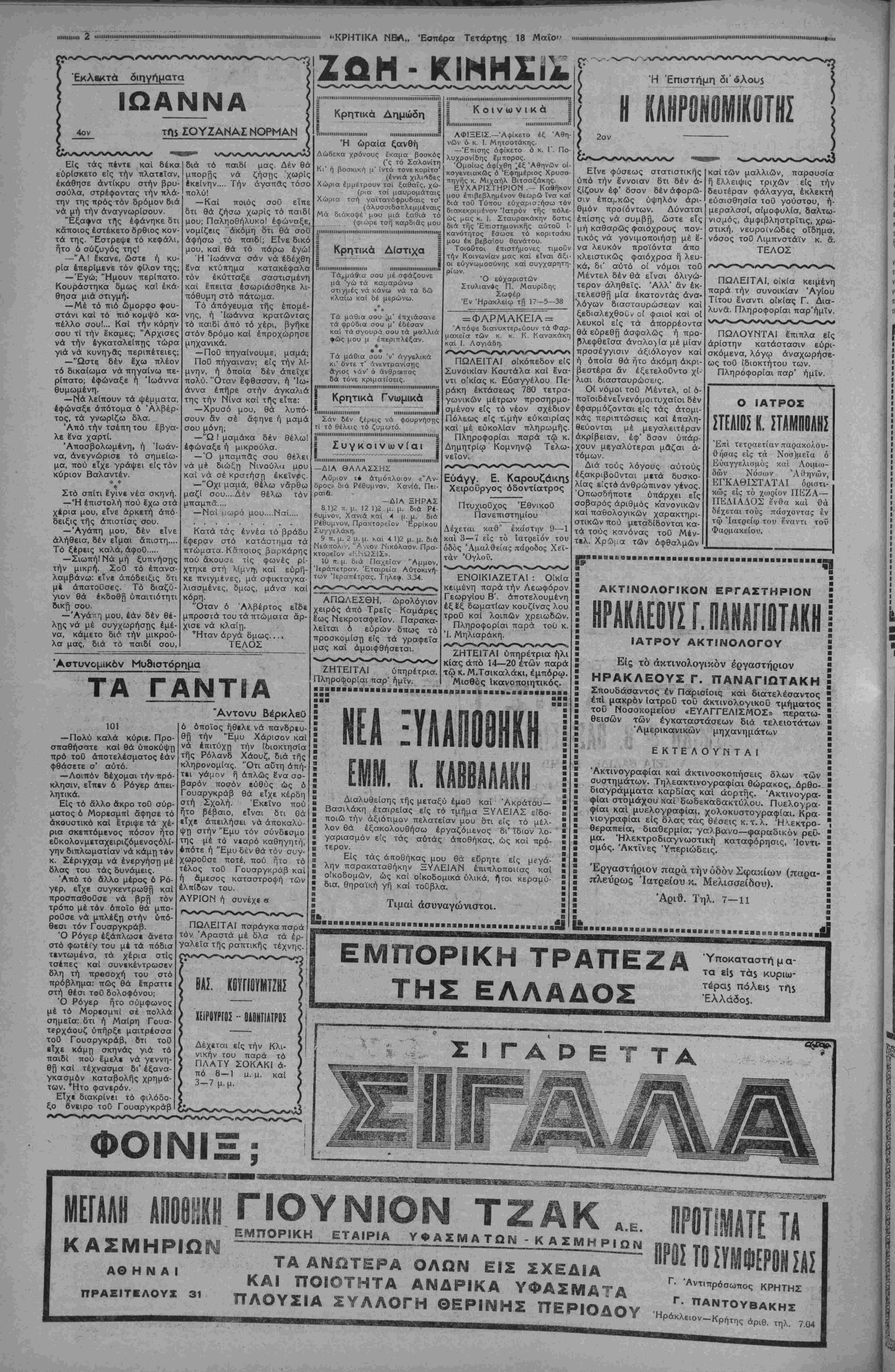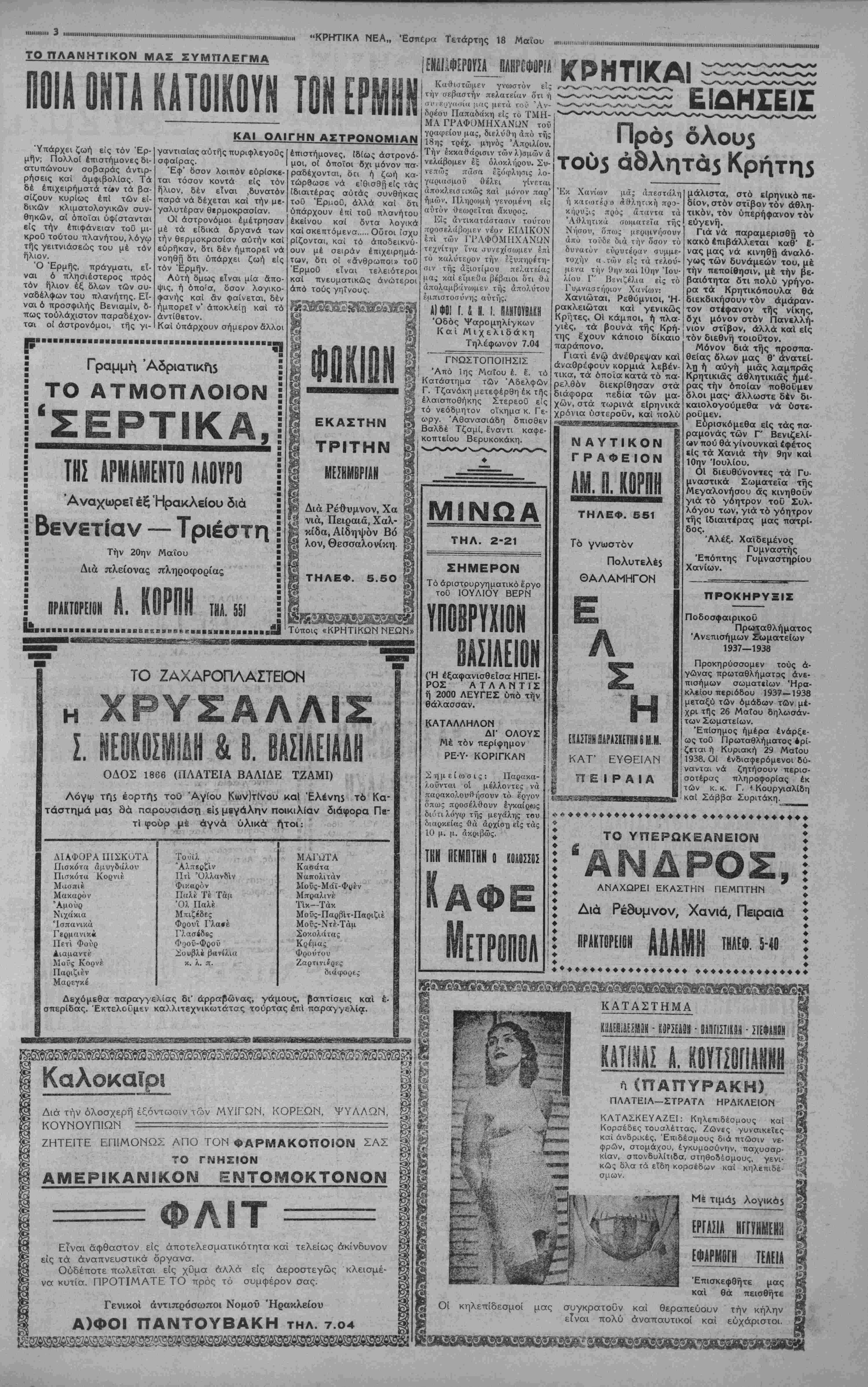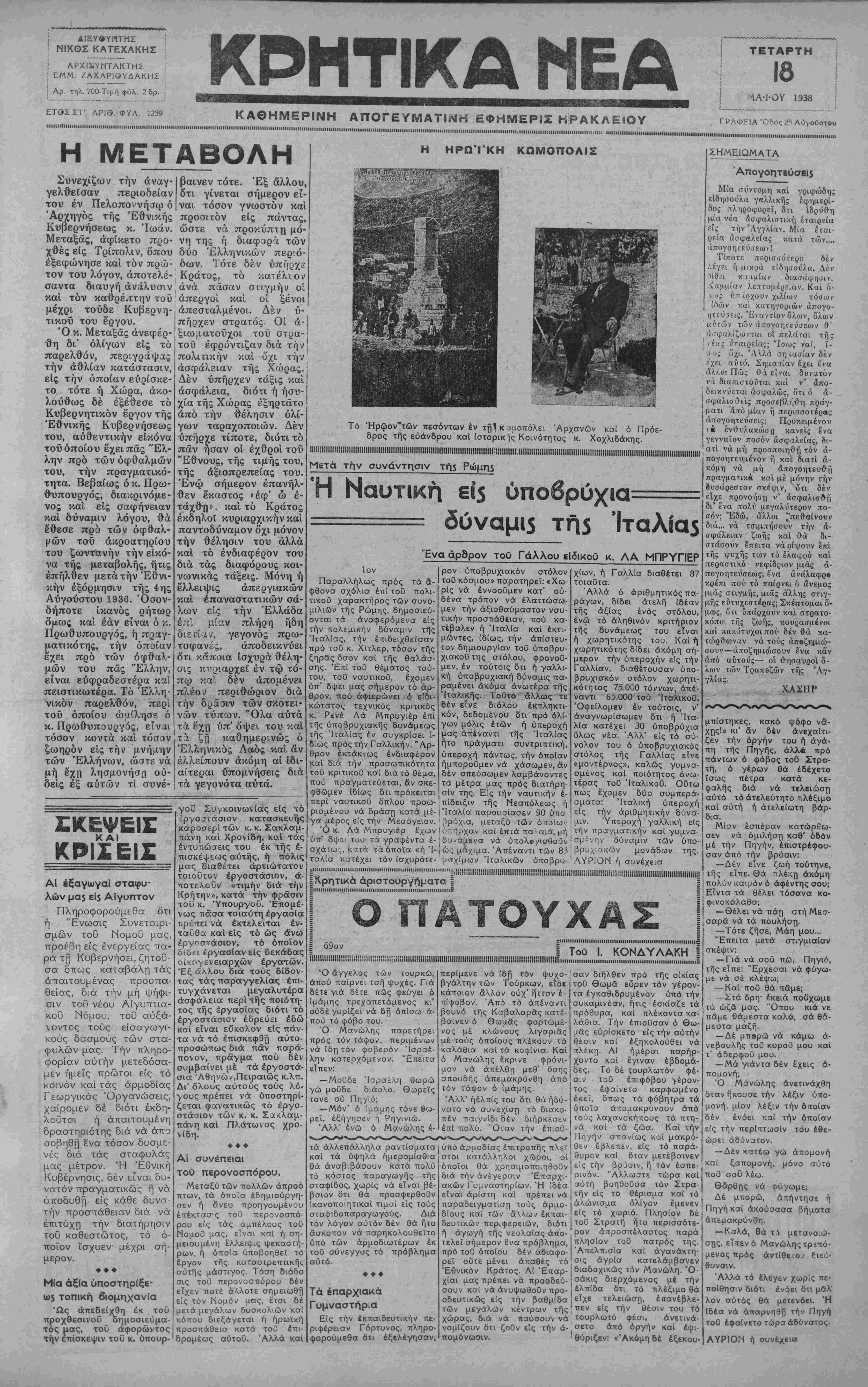■ ΙΙΙΙ11(ΐΙΙΙΙΙΜΙΙΙΙΙΙΙΙ|ΙΙ<Ι<1ΙΙ|ΙΙΙΙΙΙ<Ι1ΙΙΙΙΙΙΙΙΙΙΙΙΙ1·ΙΙΙΙΙ·ΙΙΙΙΙΙΙΙΙΙΙΙΙΙΙΙΙ«ΙΙΙΙΙΙΜ·)ΙΙΙΜΙΙ»ΙΙΙΙΙΙΙΙ<1ΙΙΙΐΜΙΙΙΙΙΙΙΙΙΙ1ΙΙΜΙΜ11ΙΙΙΙΙΙ1ΙΙΜΙΙΙΙΙ1ΙΙΙΙΙΙΙ1ΙΙ1ΙΙΙΙΙΙΙ]|||Ι1Ι11ΙΙϋ|ΙΙΙΐυΐ1<ΙΙΙΙΙ11Ι|Ι.....ΙΙΙΙΙΐ:ΐΙΙΕ1Ι1ΙΜΙ1ΙΜΙΙΜΙΙΙΙΙΙΙΙΙ111ΙΙΙ1ΙΙΙ.....ΜΙΙΙΙΙΙΙΙ1ΙΙΙΙΙΙΙΙΙΙΙ1Ι! III) ΙΙΙΗΙΙΙΙΙΙΙΙΙΙϋΙΙΙΙΙΙΙΙΙΙΙΙΙΙΙΙΙΙΙΙΙΙΙΙΙΙΙΙΙΙΙΙΙΙΙΙΙΙΙΙΙΙΙΙΙΙΙΙΙΙΙΙΙΙΙΙΙΙΙΜΙΙΙΙΙΙΙΙΗΙΙΙΙΙΙΙΙΙΙΙΙΙΙΙΙΙΙΙΙΙΙΙΙΙΙΙΙΙΙΙΙ Η ΜΕΤΑΒΟΛΗ Συνεχίζων την άναγ- γελθείσαν περιοδείαν τού έν Πελοποννήαω ό βαινεν τότε. Έξ άλλου, ότι γίνεται σήμερον εί¬ ναι τόσον γνωστόν καί Άρχηγός τής Έθνικής προσιτόν είς πάντας, Κυβερνήσεως κ. Ιωάν. ώστε νά προκύπττ) μό- Μεταξάς, αφίκετο προ- νη τη; ή διαφορα των χθέςείς Τρίπολιν, οπου δύο Έλληνικών περ-ό- εξεφώνησε καί τόν πρώ- δών. Τότε δέν ύπήρχε τον τού λόγον, άποτελέ- Κράτος, τό κοπ έλιον σαντα διαυγή ανάλυσιν, άνά πάσαν στιγμήν οί καί τόν καθρέπτην τοϋ άπεργοί καί οί ξένοι μέχρι τούδε Κυβερνη- άπεσταλμένοι. Δέν ύ- Η ΗΡΩΊ'ΚΗ ΚΩΜΟΠΟΛΙΣ τικου τού εργου. Ό κ. Μεταξάς άνεφέρ- θη δι' ολίγων είς τό παρελθόν, περιγραφάς την αθλίαν κατάσεασιν, είς την οποίαν ευρίσκε¬ το τότε ή Χώρα, άκο- λοΰθως δέ εξέθεσε τό Κυβερνητικόν έργον τής Έθνικής Κυβερνήσεως τού, αΰθεντικήν είκόνα "Ελ τοΰ όποίου εχει πάς λ ό όθ Ελ¬ λην πρό των όφθαλμών τού, την πραγματικό- τητα. Βεβαίως ό κ. Πρω- θυπουργός, διακρινόμε- νος καί είς σαφήνειαν καί δύναμιν λόγου, θά έθεσε πρό των όφθαλ¬ μών τοϋ άκροατηρίου τού ξωντανήν την είκό- να τής μεταβολής, ήτις επήλθεν μετά την Εθνι¬ κήν έξόρμησιν τής 4 ης Αύγούστου 1936. Όσον- δήποτε ίκανός ρήτωρ δμως καί εάν είναι ό κ. Πρωθυπουργός, ή πραγ¬ ματικότης, την οποίαν εχει πρό των όφθαλ¬ μών τού πάς "Ελλην, είναι εύφραδεστέρα και πειστικωτέρα. Τό Έλλη νικόν παρελθόν, περι τοΰ όποίου ωμίλησε ό κ. Πρωθυπουργός, είναι τόσον κοντά και τόσον ζωηρόν είς την μνήμην των Έλλήνων, ώστε νά μή έχη λησμονήση ού- πήρχεν στρατός. Οί ά·| ξιωματούχοι τοϋ στρα-! τοϋ εφρόντιζαν διά τήν| πολιτικήν καί δχι την" ασφάλειαν τής Χώρας. Δέν υπήρχεν τάξις καί άσφάλεια, διότι ή ήσυ- χία τής Χώρας έξηρτάτο άπό την θέλησιν ολί¬ γων ταραχοποιών. Δέν ύπήρχε τίποτε, διότι τό πάν ήσαν οί έχθροίτού Έθνους, τής τιμής τού, τής αξιοπρεπείας τού. Ένω σήμερον επανήλ¬ θεν έκαστος «έφ' ώ έ- τάχθη». καί τό Κράτος έκδηλοί κυριαρχικήν καί παντοδύναμον δχι μόνον την θέλησιν τού άλλά καί τό ενδιαφέρον τού διά τάς διαφόρους κοι¬ νωνικάς τάξεις. Μόνη ή έλλειψις άπεργιακών καί έπαναστατικών σά- λων είς την Έλλάδα έκΐ μίαν πλήρη ήδη διετίαν, γεγονός πρω¬ τοφανές, άποδεικνύει δτι καποια ίσχυρά θέλη¬ σις κιιριαρχεί έν τφ τό¬ πω καΐ δέν άπομένει πλέον περιθώριον διά την δράσιν των σκότει νών τύπων. "Ολα αύτά τα έχη ύπ' όψει τού καί τϊ ζή καθημερινώς ό Ελληνικάς Λαός καί άν έλλείπουν άκόμη αί ίδι- αίτεραι ύπομνήσεις διά Μετά δείς έξ αυτών τί συνέ- τα γεγονότα αύτά. Τό Ήρώον'τών πεσόντων έν τή! κ ομοπόλει Αρχανών καΐ ό Πρόε- δρος τής εύάνδρου καί ίστορικ ΐς Κοινότητος κ. Χοχλιδάκης. συνάντησιν τή$ Ρώμη$ Η Ναυτική ει'5 ύποβρύχια όυναμΐ5 τη5 Ιταλίας Ένα άρδρον τού Γάλλου «Ισΐκου κ. ΛΑ ΜΠΡΥΠΕΡ ΚΑΙ ΚΡΙ-ΕΙΣ κού Νόμου, νοντος τούς Αί έξαγωγαί σταφυ- λών μα$ εί$ Αίγυπτον Πληροφορούμεθα ότι ή "Ενωσις Συνετοαρι- σμών τοθ ΝομοΟ μας, προέβη είς ενεργείας πα- ρά τρ Κυβερνήσει, ζητού¬ σα όπως καταβάλη τάς απαιτουμένας προσπα¬ θείας, διά την μή ψήφι¬ σιν τού νέου Αίγυπτια- τοθ αύξά- είσαγωγι- κούς δασμοϋς των στα- ψυλών μας. Την πληρο¬ φορίαν αυτή