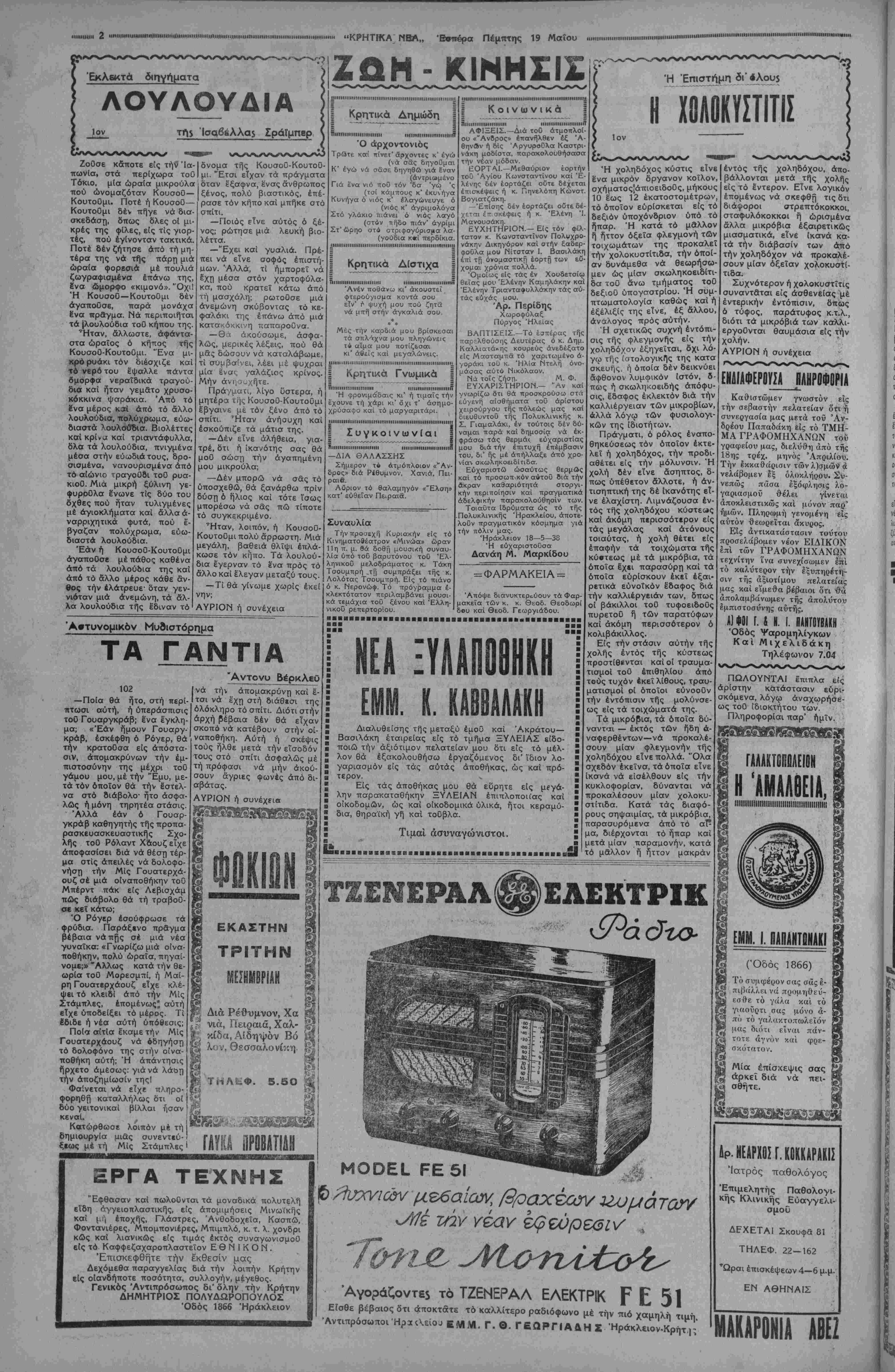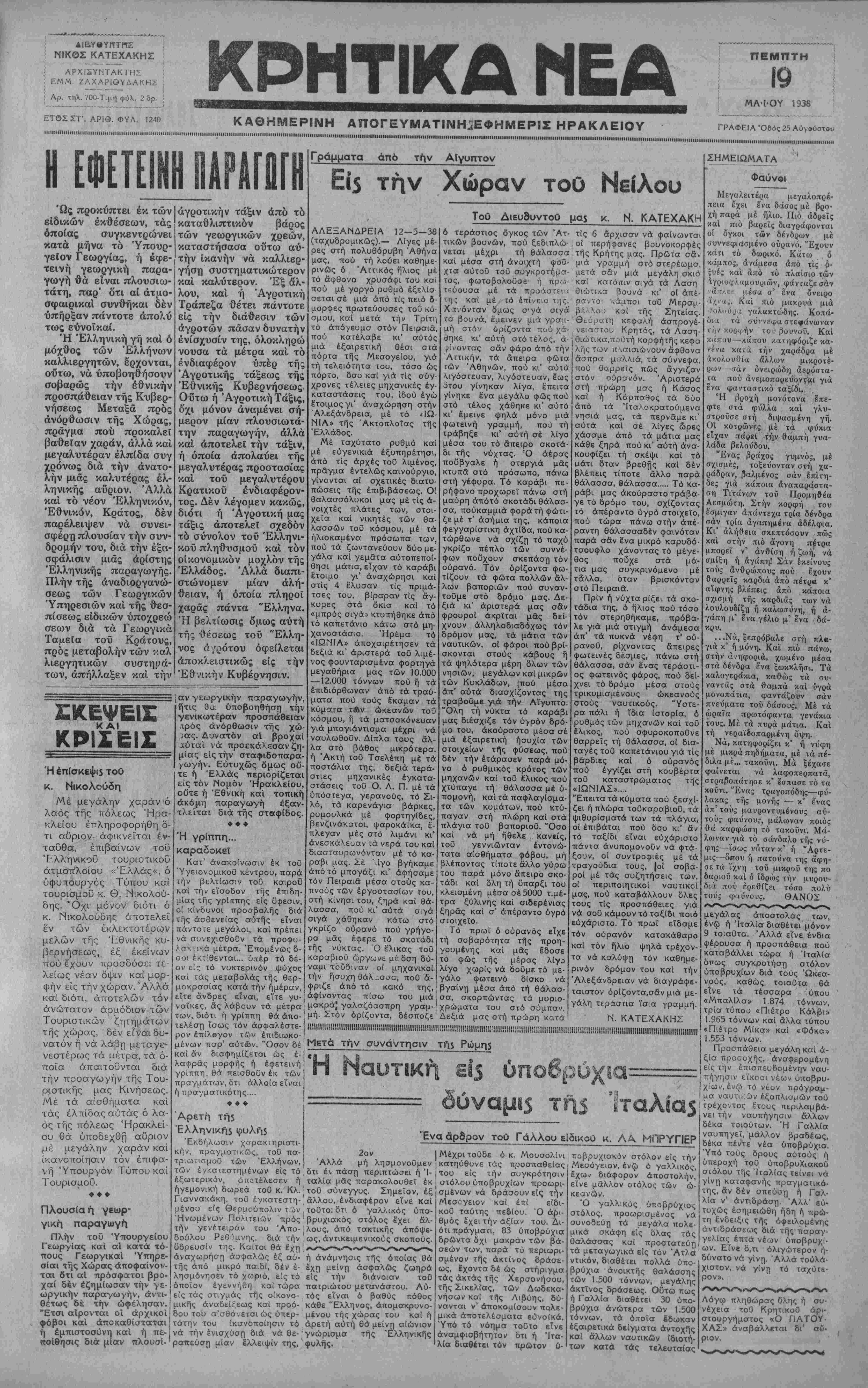 • ■<><1<ΠΙΙΐΙΙ<1ΐίΐΙΙΙί1ΙΙΐΙίΙΙΙΙ1ιιΙι1ΐΐΗ<<ΙΙ1Ιΐ·ΐΙ·ΜΙΙΐ!ΙΙ11ΐ!Μ1Ι1ΙΙΙΙΙΙ<ΙΙΙΙΙΙΙΜΙΙΙΙΙ111ΙΙΙΙ1Ι1|ΙΙΙΙ]Ι11Ι1Ι>ΙΙΙΙΙΙΙΜΙΙΙΙΙΙΙΙΙΙΙΙ1Ι||Ι1ΙΙ||||4«|ΙΙΙΙΙΙΙΙΙΙ.....ΙΙΙΙΙΙ1ΙΙΙΙ|ΙΙΙΙ1Ι||ΙΙΙΜ·1ΙΙΙ1ΙΙΙΙΓΙΙΙΙ<ΜΙΙΙΙΙΙ)ΙΜ·>ΜΙΙΙΙΙΙ1·ΙΜ·1ΙΙΙΙ·ΙΙΙ'·ΙΙΙΙΙΙΙΙ>Ι>ΙΙΙΓΙΙΜΙΜ<ΙΙΙΙΙΙΙ(«Ι<Ι·1ΙΙΙΙΙΙΙ>Ι·ηΜΙΙΙΙ·ΙΙΙΙΙΙΙΙΙΙΙΙΜΙ11ΙΜΙΙΙΙΙ1ΙΙΙΙΙΐηΐ1ΙΙΙΙΙΙ<||1Ι|ΐ||||ΙΙΙ1ΙΙΙΙΙΙΙΙΙΙΙΙΙΙΙΙ1.....]ΙΜΙΙΙΙ(Ι1Ι:ΜΙΙΙΙΙΙ1·<·1···Ι II Ώς προκύπτει έκ των είδικών οποίας έκθέσεων, τάς συγκεντρώνει κατά μήνα τό Υπουρ¬ γείον Γεωργίας, ή έφε- τεινή γεωργική παρα- γωγή θά είναι πλουσιω- τάτη, παρ' ότι αί άτμο- σφαιρικαί συνθήκαι δέν υπήρξαν πάντοτε άπολύ τως ευνοικαί. Ή Έλληνική γή καί ό μόχθος των Έλλήνων καλλιεργητών, ερχονται, ούτω, νά ύποβοηθήσουν σοβαρώς την εθνικήν προσπάθειαν τής Κυβερ¬ νήσεως Μεταξά πρός άνόρθωσιν τής Χώρας, πράγμα πού προκαλεϊ βαθείαν χαράν, άλλά καί μεγαλυτέραν έλπίδα συγ χρόνως διά την ανατο¬ λήν μιάς καλυτέρας έλ- ληνικής αυριον. Άλλά καί τό νέον Ελληνικόν, Εθνικόν, Κράτος, δέν παρέλειψεν νά συνει- σφέρη πλουσίαν την συν δρομήν τού, διά την εξα¬ σφάλισιν μιάς αρίστης Έλληνικής παραγωγήν Πλήν τής άναδιοργανώ- σεως των Γεωργικών Ύπηρεσιών καί τής θεσ- πίσεως είδικών ύποχρεώ σεων διά τα Γεωργικά Ταμεία τοϋ Κράτους πρός μεταβολήν των καλ λιεργητικών συστημά- των, άπήλλαξεν καί τή άγροτικήν τάξιν άπό τό καταθλιπτικόν βάρος των γεωργικών χρεών, καταστήσασα οΰτω αύ¬ την ικανήν νά καλλιερ- γήση συστηματικώτερον καί καλύτερον. Έξ άλ- λου, καί ή Άγροτική Τραπέζα θέτει πάντοτε είς την διάθεσιν των άγροτών πάσαν δυνατήν ενίσχυσιν της, όλοκληρώ νουσα τα μέτρα καί τό ενδιαφέρον υπέρ τής Άγροτικής τάξεως τής Έθνικής Κυβερνήσεως. Οϋτω ή Άγροτική Τάξις, δχι μόνον άναμένει σή¬ μερον μίαν πλουσιωτά- Γράμματα άπό την Αίγυπτον Εΐ'5 την Χώραν τοθ Νείλου ΤοΟ Διευθυντού μα$ κ. Ν. ΚΑΤΕΧΑΚΗ ΑΛΕΞΑΝΔΡΕΙΑ 12—3—38 (ταχυδρομικώς).— Λίγες μέ- ρες στή πολυθόρυβη Άθήνα μας, ποΰ τή λούει καθημε¬ ρινώς ό Άττικός ηλιος μέ τό αφθονο χρυσάφι τού και πού μέ γοργό ρυθμά έξελίσ σεται σέ μιά άπό τίς πειό δ- μορφες πρωτεύουσες τοθ κό- σμου, καί μετά την Τρίτη τό άπόγευμσ στόν Πειραια, πού την παραγωγήν άλλά καί αποτελεί την τάξιν, ή όποία άπολαύει τής μεγαλυτέρας προοτασίας καί τοΰ μεγαλυτέρου Κρατικοϋ ένδιαφέρον- τος. Δέν λέγομεν κακώς, διότι ή Άγροτική μας τάξις αποτελεί σχεδόν τό σύνολον τοϋ Ελληνι¬ κόν πληθυσμοΰ καί τόν οικονομικόν μόχλον τής Ελλάδος. Άλλά διαπι- στώνομεν μίαν αλή¬ θειαν, ή όποία πληροϊ χαράς πάντα 'Έλληνα. Ή βελτίωσις δμως αυτή τής ΐΐέσεως τοϋ "Ελλη¬ νος ό /ρότου όφείλεται αποκλειστικώς είς την Εθνικήν Κυβέρνησιν. -ΚΕΨΕιΈ ΚΑΙ ΚΡΙ-ΕΙ- Ή έπίσκ«ψΐ5 τοϋ κ. Νικολούδη Μέ μεγάλην χαράν ό λαός τής πόλεως Ήρα- κλείου έπληροφορήθη ό¬ τι αυριον αφικνείται έν- ταθθα, έπιβαίνων τοθ ΈλληνικοΟ τουριστικοθ ατμοπλοίου «Έλλάς«, ό ύφυτΐΌυργός Τύπου καί τουρισμοθ κ. θ. Νικολου- δης. "Οχι μόνον διότι ό κ. Νικολουδης αποτελεί εν των έκλεκτοιέρων μελών τής Έθνικής κυ¬ βερνήσεως, έξ εκείνον τΓ,ού εχουν προσδόοει τε¬ λείως νέαν όψιν καϊ μορ¬ φήν είς την χώραν. Άλλά κ<χί διότι, ατιοτελών τόν ανώτατον αρμόδιον των Τουριοτικών ζητημάτων τής χώρας, δέν είναι δυ¬ νατόν ή νά λάβη μεταγε¬ νεστέρως τα μέτρα, τα ό¬ ποία άπαιτοθνται διά την προαγωγήν τής Του- ριστικής μας Κινήσεως. Μέ τό αίοθήματα καί τάς ελπίδας αύτάς ό λα¬ ός τής πόλεως Ηρακλεί¬ ου θά ΰποδεχθή αυριον μέ μεγάλην χαράν καί ικανοποίησιν τόν έπιφα- νή Υπουργόν Τΰπου καί Τουρι