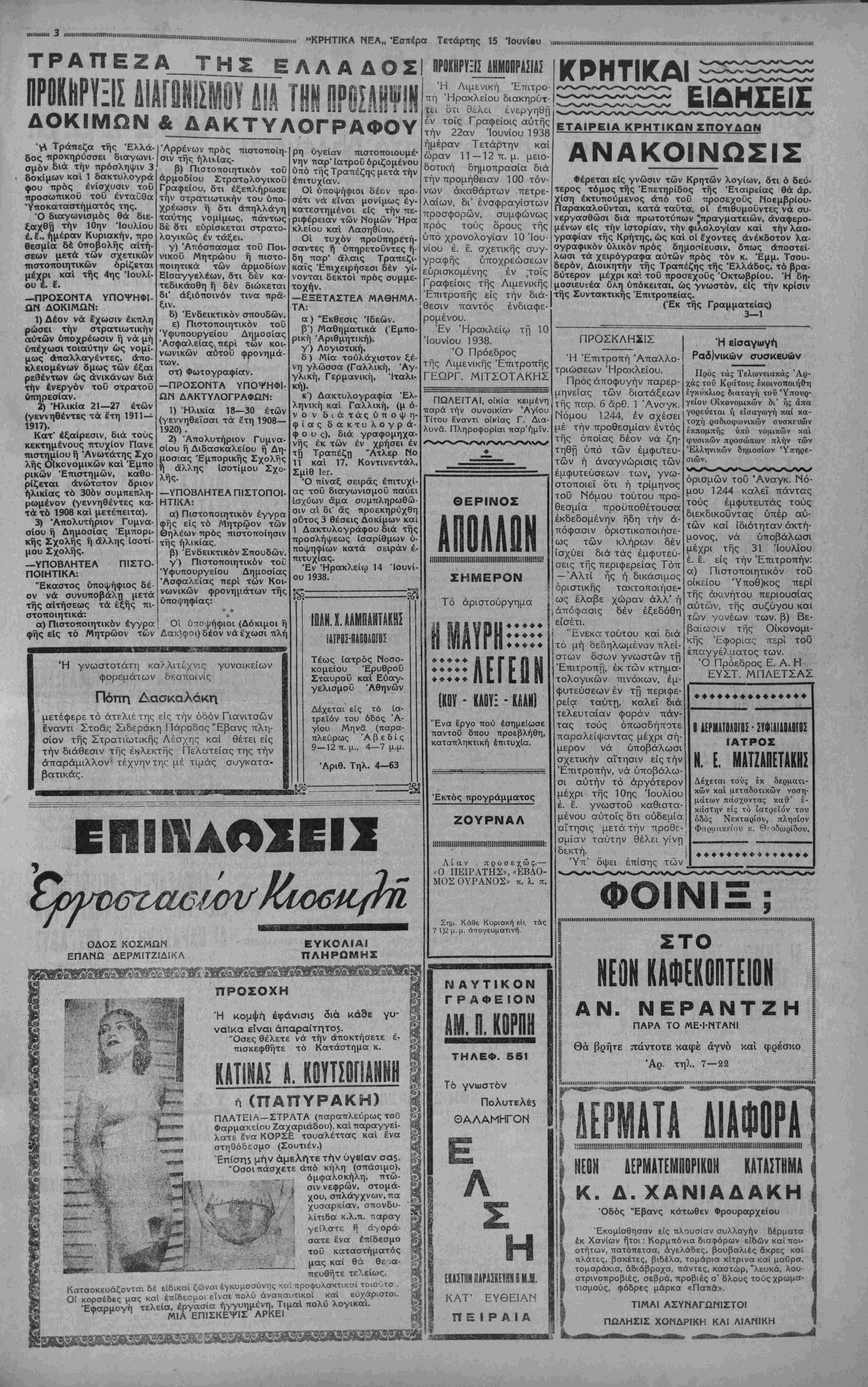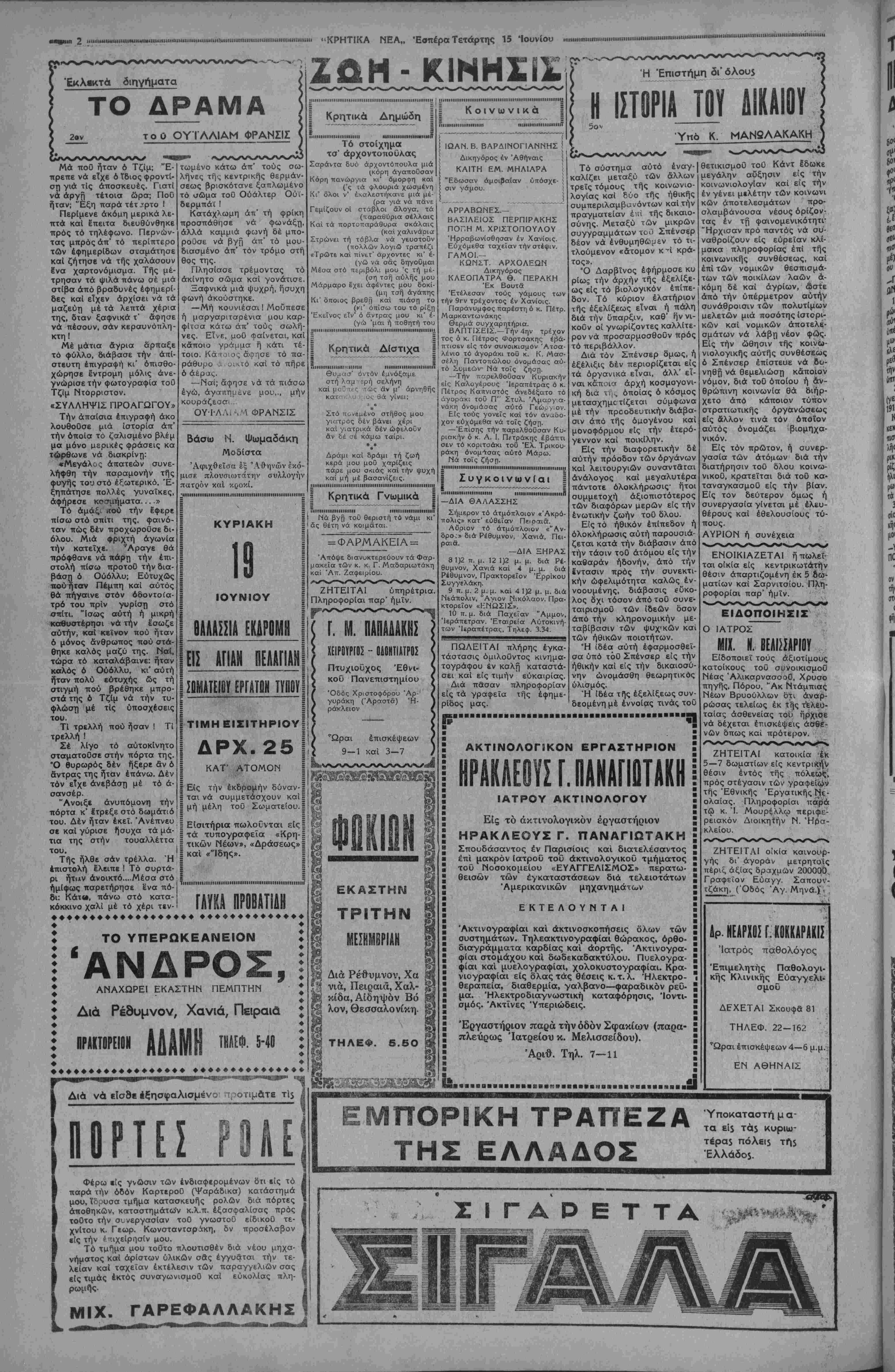 κός τοΰ Κινηματοθεάτρου <Α¬ πόλλων», έ'σαοσε χθίς παρά τΠ 14 στρατιωτικαί έπιδείξεις θά λάβουν χώ ραν κατά την διάρκειαν τής παραμονής έν Γαλλία των Αγγλων Βασι/ έων. Έ·'τήν <2κτήν Τρυπητής πνιγόαε- τιίσης υπό των Γάλλον άεροη^ρων θα·νον νέον τή; πόλεως μας, ήλι-, τελεσθοΰν όμαδικαί πτήσ&ις μάχης μέ κίας 15 &τών. κινδικεύσας σο-ί Ό Δήμαρχος Ηρακλείου τολμηρότατα άκροβατικά γυμνάσια. | βαρώς. ' Μήνας Γεωργιάδης άρχαΐα Έλληνικά τα νέα Έλ ληνικά, τα φυσικά καί τα μα θηματικά καί ή γυμναστική, διά τα έμπορικά τμήματακαί τα άστικά σχολεΐα τα άρ¬ χαΐα Έλληνικά, τα νέα Έλ¬ ληνικά, τα φυσικά, τα είδικά μαθήματα (γεωπονίας, άλι- εΐας κλπ.) καί ή γυμναστική. Μή λαμβάνων την βάσιν είς πλείονα των δύο θεωρη- τικών μαθημάτων, ή είς πλείονα τοϋ ενός θεωρητι- κά μαθήματα καί την γυ¬ μναστικήν άπορρίπτεται. Μή λαμβάνων την βάσιν είς £ν πρωτεθον καί έν δβυ- τερεΰον μάθημα, παραπέμπε¬ ται είς συμπληρωματικήν εξέτασιν κατά Σεπτέμβριον είς τα μαθήματα ταυτα. Μή λαμβάνων την βάσιν είς £ν έκ των πρωτευόντων μαθημάτων παραπέμπεται είς συμπληρωματικήν εξέτα¬ σιν κατά Σεπτέμβριον. Ύστερήσας είς μόνον τό πρωτεθον μάθημα τής γυμ- ναστικής προάγεται εάν έχη μέσον δρον των βαθμών πάν¬ των των πρωτευόντων μαθη¬ μάτων ούχι κατώτερον τοΰ «σχεδόν καλώς 10», άλλως άπορρίπτεται. ΑΘΗΝΑΙ 15—6—38 (τοΰ άνταποκριτοΰ μας).—Υπό των έγκυροτέρων σημερινον Γαλλικον "Εφημερίδων άναγράφεται, δτι πρό των θερινών διακοπών τής Βουλής, θά διεξαχθή έν αύτί} εύρεία συζήτησις επί τής Έξωτερικής πολιτικής τής Χώ¬ ρας. "Ηδη ό ήγέτης των κομμάτων τής δεξιάς κ. Φλαντέν κατέθεσεν επερώτησιν πβρί τής 'Εξοτερικής πολιτικής τής Κυ¬ βερνήσεως Νταλαντιέ, ήτις θά αποτελέση την αφετηρίαν καί τόν πυρήνα δλης τής σχετικής συζητήσεος Ή Γαλλική · Κυβέρνησις—τονίζεται— δέν θά διατρέξη κίνδυνον έκ τής συζητή¬ σεος αυτής, ΤεονικοΓυΙειξαν" ουδετερουσ λιμενλσ καταπαουν__αγγ σκαφον ΑΘΗΝΑΙ 15—6—38 (τοΰ άνταποκριτοΰ μας).—Έκτακτα τηλεγραφήματα έξ Ί- σπανίας, των άπεσταλμένων τον Αγγλι¬ κών "Εφημερίδων, τονίζουν δτι ή Κυβέρ¬ νησις τοΰΜποΰργκος έπέδοσε εύνοϊκήν απάντησιν είς την Κυβέρνησιν τής Μ. Βρετ τανίας, είς τό ζήτημα τοΰ βομβαρδισμοθ των φορτηγον πλοίων. Ή Έθνικιστική Κυβέρνησις δέχεται δπως τα καταπλέον- τα είς Ισπανίαν Άγγλικά σκάφηπροσεγ- γίζουν είς ωρισμένους έκ των πρωτέρων λιμένος, ίνα άποφεύγουν τάς έξ αέρος έπιθέσεις. ΣΥΣΤΛΣΕΙΣ ΜΕΤΡΙΟΠΑΟ ΑΓΓΛΙΑΣ ΠΡΟΣ ΤΣΕΧ1 ΙΑΣ ΥΣ Ή των έμπορευμάτων Διά Β. Διατάγματος κοινο- ποιηθέντος δι' έγκυκλίου πρός τάς αρχάς δύναται νά επιτρα¬ πή ή έν ώρα νυκτός άποβίβα- σις έμπορευμάτων κομιζομένων υπό φορτηγών πλοίων είς τούς λιμένος, παρά τοίς όποίοις έ- δρεύουσι διευθύνσεις τελωνεί- ων ή τελωνεΐα α' τάξεως, είς έκτάκτους περιπτώσεις, καθ ά'ς άναπόφευκτος άνάγκη επι¬ βάλλει τουτο. Ι Παράδΐιγμα πρό5 μίμησιν 'Υπό ωργίου τοϋ καθηγητού κ. Γε- Βουρλάκη κατετέθΐ|- ΕΗΑΝΑΑΗνΐΣ ΑΗΜΟΗΡΑΣΙΑ! Κατατεθείσης μείζονος ττροσφοράς έπαναλαμ- βάνεται καΐ αδθις ή δη- μοπρασία ενοικιάσεως τοθ φόρου μεταφερομέ- νων εγχωρίων προϊόντων διά ξηράς διά τό οΐκ. έ- τος 1938-39 Ή Δημοπρασία γενή- βεται την προσέχη Πέμ¬ πτην 16ην τρέχοντοςκαί ώραν 11 —12 π. μ. έν τω Δημοτικω Καταστήματι Ηρακλείου καί ενώπιον της Δημαρχιακής τροττης. Έν Ηρακλείω Ίουνίου 1938. Επι- σαν δραχμαί εκατόν είς τό 8ον Δημοτικόν Σχολείον, ώ; έ'θλ ό ΗΧΒΕΣΙΝΗ ΣΥΝΑΝΤΗΣΙΣ ΤΟΥ ΑΟΝΑΙΝΟΥ ΑΘΗΝΑΙ 15—6—38 (τοΰ άνταποκριτοΰ μας).—Ό έν Λονδίνο άνταποκριτής τοϋ πρακτο