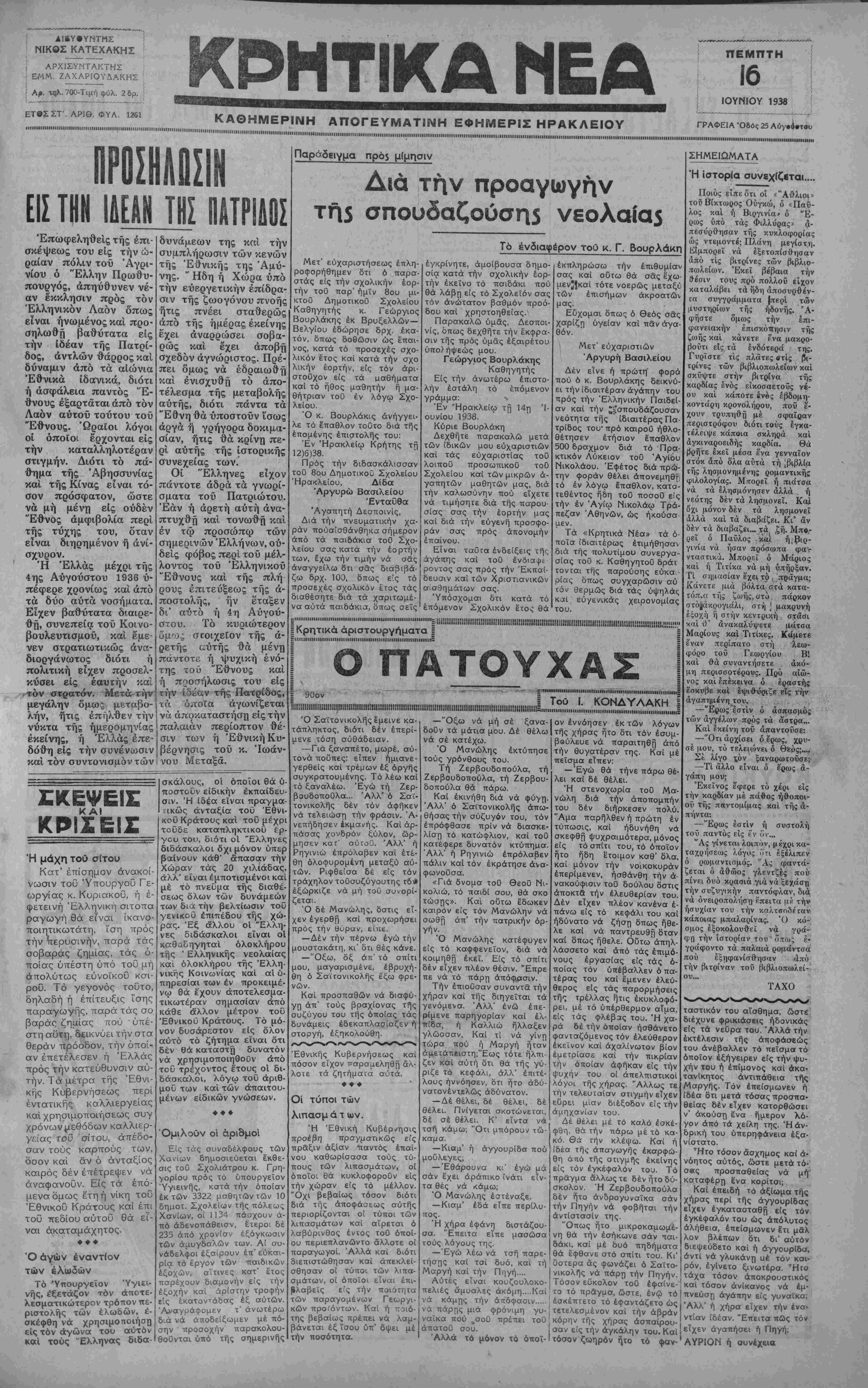 < ΕΜΜ. ΖΑΧΑΡΙΟΥΔΑΚΗΣ Α». τ-ηΚ. 700-1 ιμή φύλ. 2 δρ. | ΕΤ·ΣΣΤ'. ΑΡΙΘ. ΦΥΛ. 1261 ΚΡΗΤΙΚΑ ΜΕΑ ΠΕΜΠΤΗ ΙΟΥΝΙΟΥ 1938 ■ ΙΙΙΙΙΙΙΙΙΙΙΙΙΙΙΙΗΙΙΙΙΙΙΙΙΙΙΙΙΙΙΙΙΙΙΙΙΙΙΙΙΙΙΙΙΠΙΙΙΙ......ΙΙΙΙΙΙΙΙΙΙΙΙΙΙΙΙΙΙΙΠϋΙΙΙΙ......,!„„„ ΚΑΘΗΜΕΡΙΝΗ ΑΠΟΓΕΥΜΑΤΙΝΗ ΕΦΗΜΕΡΙΣ ΗΡΑΚΛΕΙΟΥ ΙΙΙΙΙΙΙ1ΙΙΙΙΙΙΙΙΙΙΙΙΙΙΙΙΙΙΙΙΙΙΙΙΙΙΙΙΙΙΙΙΙΙΙΙΙΙΙΙΙΙΙΙΙΙΙΙΙΙΙΙΙΙΙΙΙΙΙΙΙΙΙΙΙΗΙΙΙΙΙΙΙΙΙΙΙΙΙΙΙΙΙ ΓΡΑΦΕΙΑ Όδός 25 Αύγββ·τβυ ιιιιιιιιιιιιιιιιιιιηιιιιιιιιιιιιιιιιιιιιιιιιιιιιιιιιιιιιιιιιιιιιιιιιιιιιιιιιιιιιιιιιιιιιιιιιιιιιιΐιιιιιιιιιιιιιιιιιιιιιιιιιιιιιιιιιιιιιιιιιιιιιιιιιιιιιιιιιιιιιιιιιιιιιιιιιιιιιπιιιιιιιιιιιιιιιιιιιιιιιι ΕΙΣ ΤΗΝ Ι&ΕΑΗ ΤΗΣ ΠΑΤΡΙΔΟΣ Έπωφεληθείς τής επι¬ σκέψεως τού είς την ω¬ ραίαν πόλιν τοϋ Αγρι¬ νίου ό "Ελλην Πρωθυ- πουργός, απηύθυνεν νέ¬ αν έκκλησιν πρός τόν Ελληνικόν Λαόν όπως είναι ηνωμένος καί προ- σηλωθη βαθύτατα είς την ιδέαν τής Πατρί¬ δος, άντλών θάρρος καί δύναμιν άπό τα αίώνια Έθνικά ίδανικά, διότι ή άσφάλεια παντός "Ε- θνους έξαρτάται άπό τόν Λαόν αύτοΰ τούτου τού Έθνους. Ώραΐοι λόγοι οί όποίοι ερχονται είς την καταλληλότερον στιγμήν. Διότι τό πά- θημα τής Άβησσυνίας καί τής Κίνας είναι τό¬ σον πρόσφατον, ώστε νά μή μένη είς ουδέν "Εθνος άμφιβολία περί τής τύχης τού, δταν είναι διηρημένον ή άνί- σχυρον. Ή Ελλάς μέχρι τής 4ης Αύγούστου 1936 ϋ- πέφερε χρονίως καί άπό τα δύο αύτά νοσήματα. Είχεν βαθύτατα διαιρε- θή, συνεπεία τοΰ Κοινο¬ βουλευτισμόν, καί εμε- νεν στρατιωτικώς άνα- διοργάνωτος διότι ή πολιτική είχεν προσελ- κύσει είς εαυτήν καί τον στρατόν. Μετά;-την μεγάλην δμως μεταβο¬ λήν, ήτις επήλθεν την νύκτα τής ήμερομηνίας έκείνης, ή Ελλάς επε¬ δόθη είς την συνένωσιν καί τόν συντονισμόν των δυνάμεων της καί την συμπλήρωσιν των κενών τής Έθνικής της Αμύ¬ νης. " Ηδη ή Χώρα υπό την ευεργετικήν επίδρα¬ σιν τής ζωογόνου πνοής ήτις πνέει σταθερώς άπό τής ημέρας έκείνης εχει άναρρώσει σοβα¬ ρώς καί εχει αποβή σχεδόν άγνώριστος. Πρέ- πει δμως νά εδραιώθη καί ενισχυθή τό άπο- τέλεσμα τής μεταβολής αυτής, διότι πάντα τα Έθνη θά ύποστοΰν ϊσως άργά ή γρήγορα δοκιμα¬ σίαν, ήτις θά κρίνη πε¬ ρί αυτής τής ίστορικής συνεχείας των. Οί "Ελληνες είχον πάντοτε άδρά τα γνωρί- σματα τοΰ Πατριώτου. Εάν ή άρετή αύτη άνα- πτυχθό καί τονώθη καί έν τώ προσώπψ των σημερινήν Έλλήνων, ου¬ δείς φόβος περί τοΰ μέλ- λοντος τοϋ Έλληνικοΰ Έθνους καί τής πλή ρους έπιτεύξεως τής ά- ποστολής, ήν έταξεν δι' αύτο ή 4η Αύγού¬ στου. Τό κυριώτερον ύμ'ϋ± στοιχείον τής ά- ρετής αυτής θά μένη πάντοτε ή ψυχική ένό- της τού Έθνους καί ή προσήλωσις τού είς την ιδέαν τής Πατρίδος, τα υ^τοία άγωνίζεται νά αποκαταστήση είς την παλαιάν περίοπτον θέ¬ σιν των ή Έθνική Κυ¬ βέρνησις τοΰ κ. Ίωάν- !νου Μεταξά. Παράδειγμα προ$ μίμησιν Διά την προαγωγήν σπουδαζούση5 νεολαία5 Τό ενδιαφέρον τού κ. Γ. Βουρλάκη ΕΚΕΨΕΙΕ ΚΑΙ ΚΡΙΣΕΙΣ Ή μάχη τοΰ σίτου Κατ' επίσημον ανακοί¬ νωσιν τοϋ Ύπουργοΰ Γε- οοργίας κ. Κυριακού, ή έ- φετεινή Έλληνικη σιτοπα ραγωγή θά είναι ίκανο- ποιητικωτάτη, ί'ση πρός την περυσινήν, παρά τάς σοβαράς ζημίας, τάς ο¬ ποίας υπέστη υπό τοϋ μή απολύτως εΰνοί'κου κσι- ροθ. Τό γεγονός τουτο, δηλαδή ή επίτευξις ί'σης παραγωγής, παρά τάς σο βαράς ζημίας ιτοΰ υπέ¬ στη αυτή, δεικνύει την στα θεράν πρόοδον, την όποι¬ αν έπετέλεσεν ή Ελλάς πρός την κατεύθυνσιν αυ¬ τήν. 1 ά μέτρα τής Έθνι¬ κής Κυβερνήσεως περί έντατικής καλλιεργείας καί χρησιμοποιήσεως συγ χρόνωνμεθόδων καλλιερ- νείας τού σίιου, άηέδο- σαν τούς καρπους των, όσον καί αν ό άντα