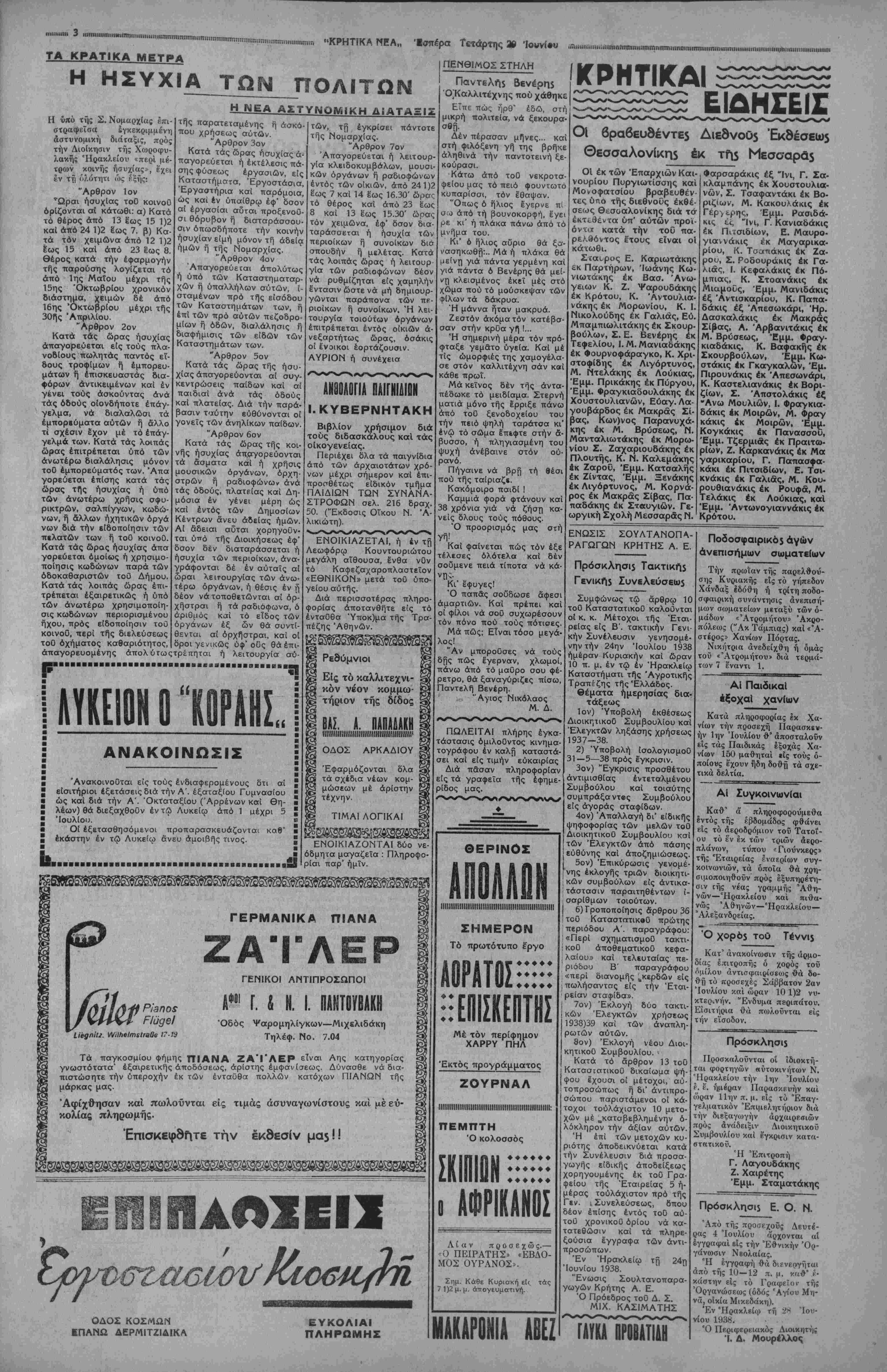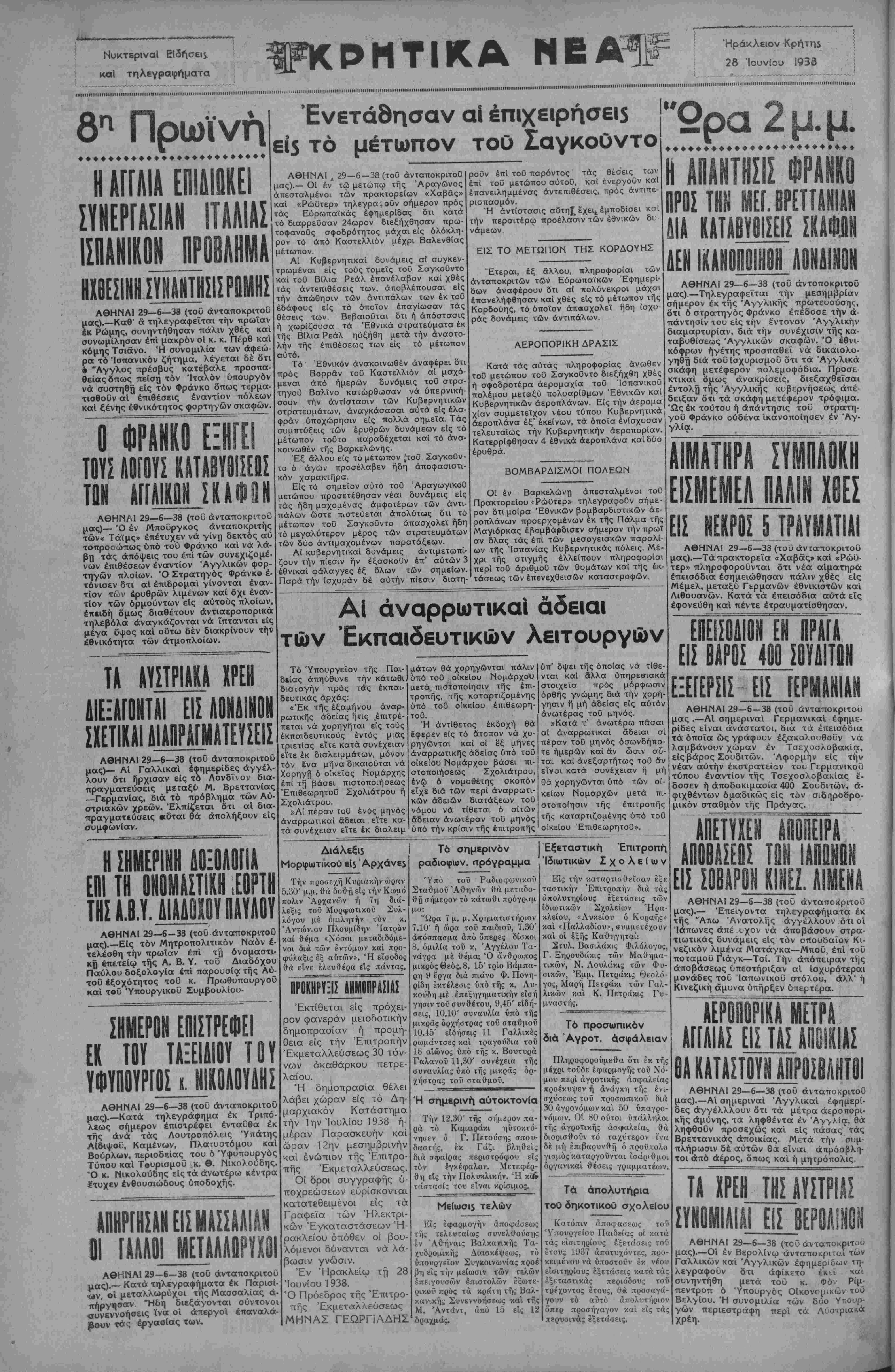 ΑΘΗΝΑΙ 29—6—38 (τού άνταποκριτοΰ