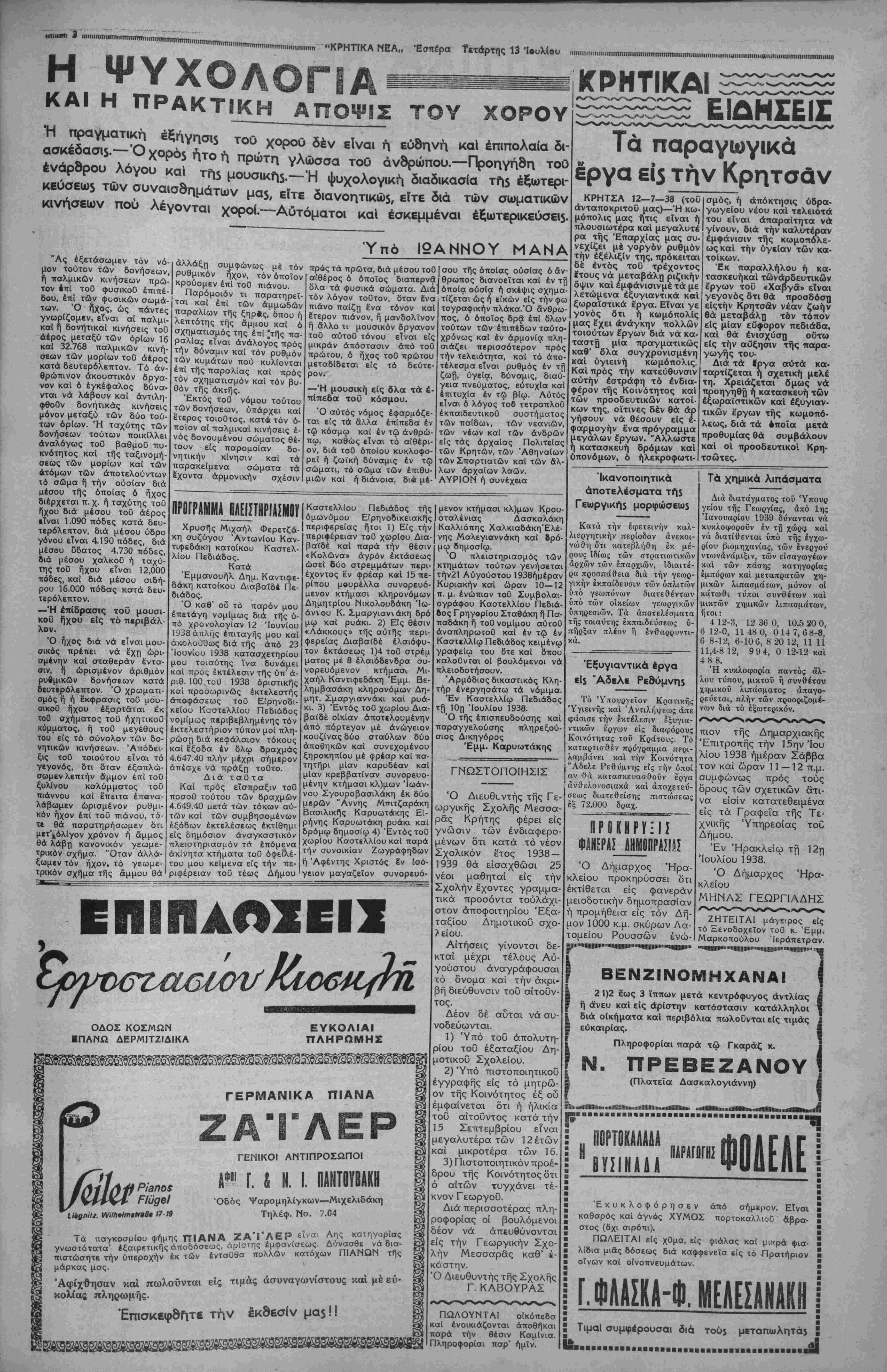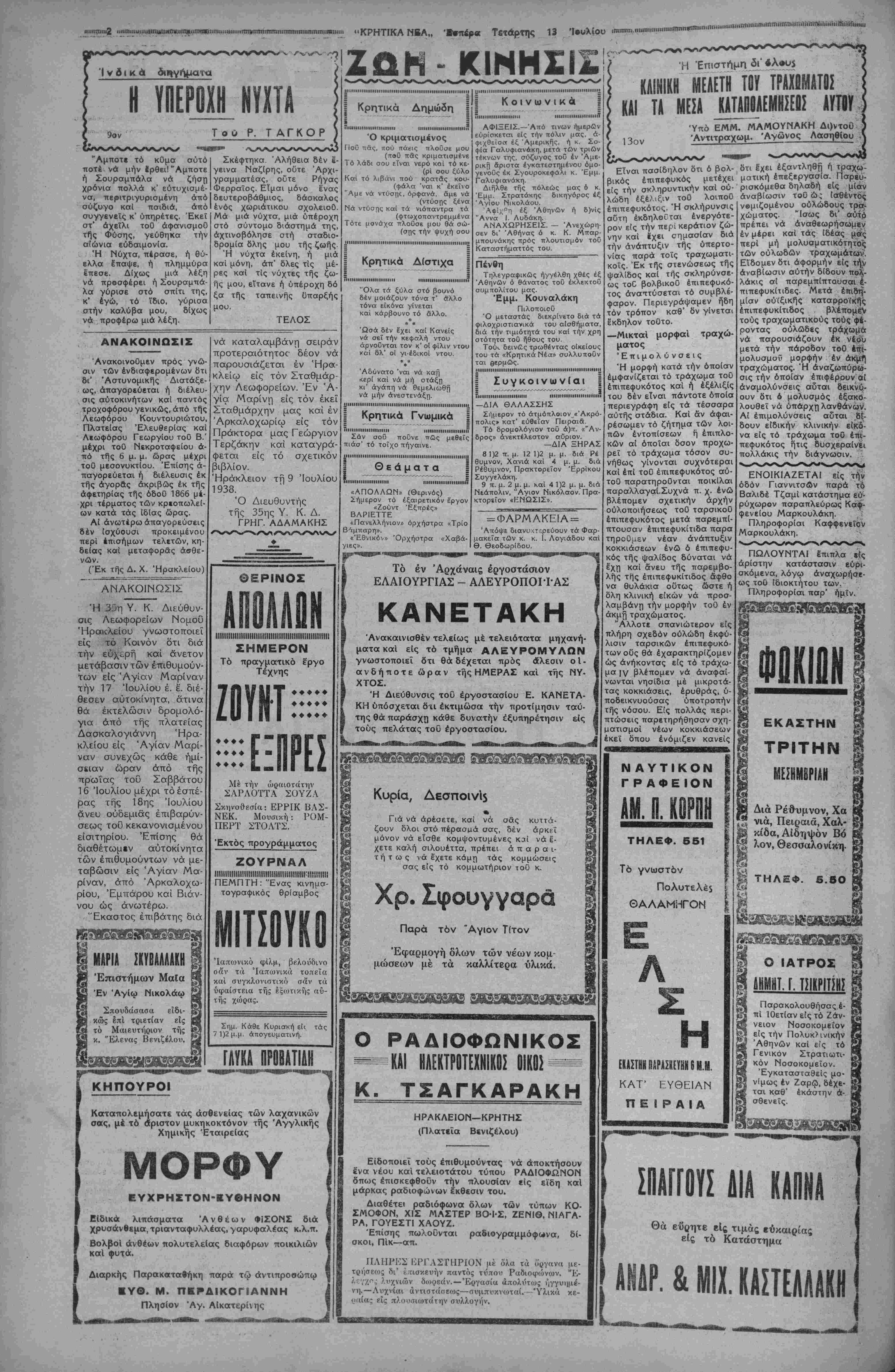 Είς την <'Εφημερίδα τής Κυβερνήσει»; εδημοσιεύθη τό διάταγμα διά τοϋ όποίου κα- θορίζονται τα τέλη των ρα¬ διοτηλεγραφημάτων. Ούτω τό τέλος σταθμοϋ ξηρας επί ραοιοτηλεγραφημάτων, δια- μειβομένων μεταξύ έλληνικοϋ κινητοΰ σταθμοϋ καί τριατα- τικοΰ γραφείου όρίζεται είς δραχ. 1.50 κατά λέξιν, μέ ε¬ λάχιστον όριον είσπράξρως τ ό τέλος δέκα λέξεων. Τ ο τέ¬ λος σκαφους ελληνικοΰ κινη¬ τοΰ σταθμοϋ διά τα αύτά ραδι,οτηλεγραφήματα όρίζεται είς δραχμήν μίαν μέ ελάχι¬ στον όριον εισπράξεως το τέ¬ λος 10 λέξεων. Αναχωρήση Έργατών διά Μακιδονίαν Τό «Γραφείον εύρέσεως ερ¬ γασίας Θεσσαλονίκης» διά τη- τηλεγραφήματός τού πρός την Γενικήν Διοίκησιν ^Κρήτης παρακαλεΐ όπως απαγορευθή ή άναχώρησις έργατών διά Μακεδονίαν άνευ προηγουμέ¬ νης συννενοήσεοος μετ' αυτού. Τό ανωτέρω τηλ)μα έκοινο- ποίησεν ή Γενική Διοίκησις Κρήτης πρός τάς αρμοδίας αρχάς τής νήσου πρός γνώσιν καί λήψιν των ένοεικνυομέ- νων μέτρων Τό άποψινόν ραδιοφων. πρόγραμμα '() Ραδιοφωνικος σταθμός Αθηνών θά μεταδόσιι σήμε¬ ρον τό κάτωθι πρόγραμμα. "Ωρα 7 μ. μ. μετεωρολογικόν δελτίον, Χρηματιστήριον, 7.15' ή ώρα τοϋ παιδιοΰ 7.35'μουσι κή /ιοροϋδίσκοι, Η.ΙΟ'ρεσιτάλ κιθάρας υπό τοΰ κ. Βούλγαρη Η,ίϊΟ' όμιλία υπό τοΰ κ. 'Άγγε- λου Τανάγρα περί όνείρων, 8.45' ρεσιτάλ τραγουδιοΰ υπό δίδος Μαυρίδου Άριστείου τοΰ Έθ νικοΰ 'Ωδείου 9,15' συγκρό- τημα Κολογερίδη. Κρητική μου σική, 9,45' είδήσεις, 10 συναυ- λία υπό τή; μικράς δρχήστρας τοϋ σταθμοϋ 10,45' είδήσεις, 11 ρεσιτάλ τραγουδιοΰ υπό τοΰ βαρυτόνου κ. Μποτάση 11.30' συνέχεια τής συναυλίας τής μικράς όρχήστρας τοΰ σταθμοϋ. ΕύχαριστΙαι Βιαννιτών Δήμαρχον Ηρακλείου Σήμερον την πρωίαν το Προεδρείον τοΰ Συλλόγου Βιάννου ό «-Διαβάτης» μετά τοΰ άδελφοΰ τοϋ αειμνήστου Ί. Κονδυλάκι, παρουσιασθέν είς τόν Δήμαρχον κ. Μηνάν Γεωργιάδην έξέφρασεν είς α υ τόν τάς ευχαριστίας τβυ διά τό υπό τοΰ Δήμου τελούμενον την 24ην ένταΰθα μνημόσυ¬ νον είς μνήμην τοϋ μεγάλου Κρητός λογθτέχνου καθώς έπί- σης καί διά τό ενδιαφέρον όπερ επιδεικνύει πάντοτε τι- μών ρϊς κάθε ευκαιρίαν την μνήμην τοΰ αειμνήστου Συγ- γραφέως Ι. Κονδυλακη. Διορεαί υπέρ Προσκόπων Μοιρών Ώς πληροφορούμεθα υ Πρό εδρος τοΰ Τοπικοΰ Προσκοπι κου Συνδέσμου Μοιρών κ. Μ Ζαχαριουδάκης ηύχαρίστησε τόν Δήμαρχον κ. Μ. Γεωργιά δην διά την υπέρ τοΰ Προσκο ςΐικοΰ συνδέσμου Μοιρών δυ; ρεάν τού. Έπίσης ό ϊδιος ηύχαρίστη σιν θερμώς τόν Θεοφιλέστατον Επίσκοπον Άρκαδίας Βασίλει¬ ον Μαρκάκην καί τόν έκ Τυμ- πακίου κ. Παπαδογιοιργάκην διά την δωρεάν των υπέρ τοΰ Πκοσκοπικοΰ Συνδέσμου Μοι¬ ρών. Μνημόσυνον εί; Βιάννον υπέρ Ιωάν. Κονδυλακη Ώ; πληροφορούμεθα υπό τοΰ Προοδευτικοΰ Συλλόγου Βιάννου «Διαβάτης* τελεΐται την 24ην τρέχοντος είς την Γραφικήν Κωμόπολιν Βιάννου άρχιερατικόν μνημόσυνον είς μνήμην τοϋ άειιινή-ττου Κρη τύς Λογοτέχνου Ιωάννου Κον δυλάκη. Έκδρομη Κουρέων Καθ' ά γνωρίζομεν την 27ην τρέχ. ό σύλλογος Κομμωτών καί Κουρέων τής πόλεως μας θα έκδράμη είς την Ιεράν Μο νήν Έπανωσήφι. Κατά την η¬ μέραν τής έκδρομής όλα τα Κουρεΐα θά είναι κλπστά κα τόπιν σχετικής αδείας τοϋ "Υ φυπουργείου Εργασίας. "2ρα 2 μ. μ. ♦♦♦♦♦♦♦♦♦♦♦♦♦♦♦♦♦♦♦♦♦♦♦♦♦ Η ΕΝΑΡΞΙΣ ΤΗΣ ΙΣΧΥΟΣ ΑΓΓΛΟ-ΙΤΑΛΙΧΗΣ ΣΥΜΦΩΝΙΑΣ Αγ ΕΙ ΛΩΣΕ Σ κ ΒΟΥΛΗΝ ΤΣΑΜιΊ ΚΟΙΝ ■ΡΛΑ ΤΗΤ1 Ν Ν ΑΘΗΝΑΙ 13—7—38 (τοΰ άνταποκριτου μας)— Μεσημβριναί τηλεγραφικαί πλη¬ ροφορίαι έκ Λονδίνου άγγέλλουν δτι έν ττ| Βουλ5 των Κοινοτήτων διεξήχθη ό- ξέΐα συζήτησις πάλιν χθές έξ άφορμής τής Ίταλο-Άγγλικής συμφωνία