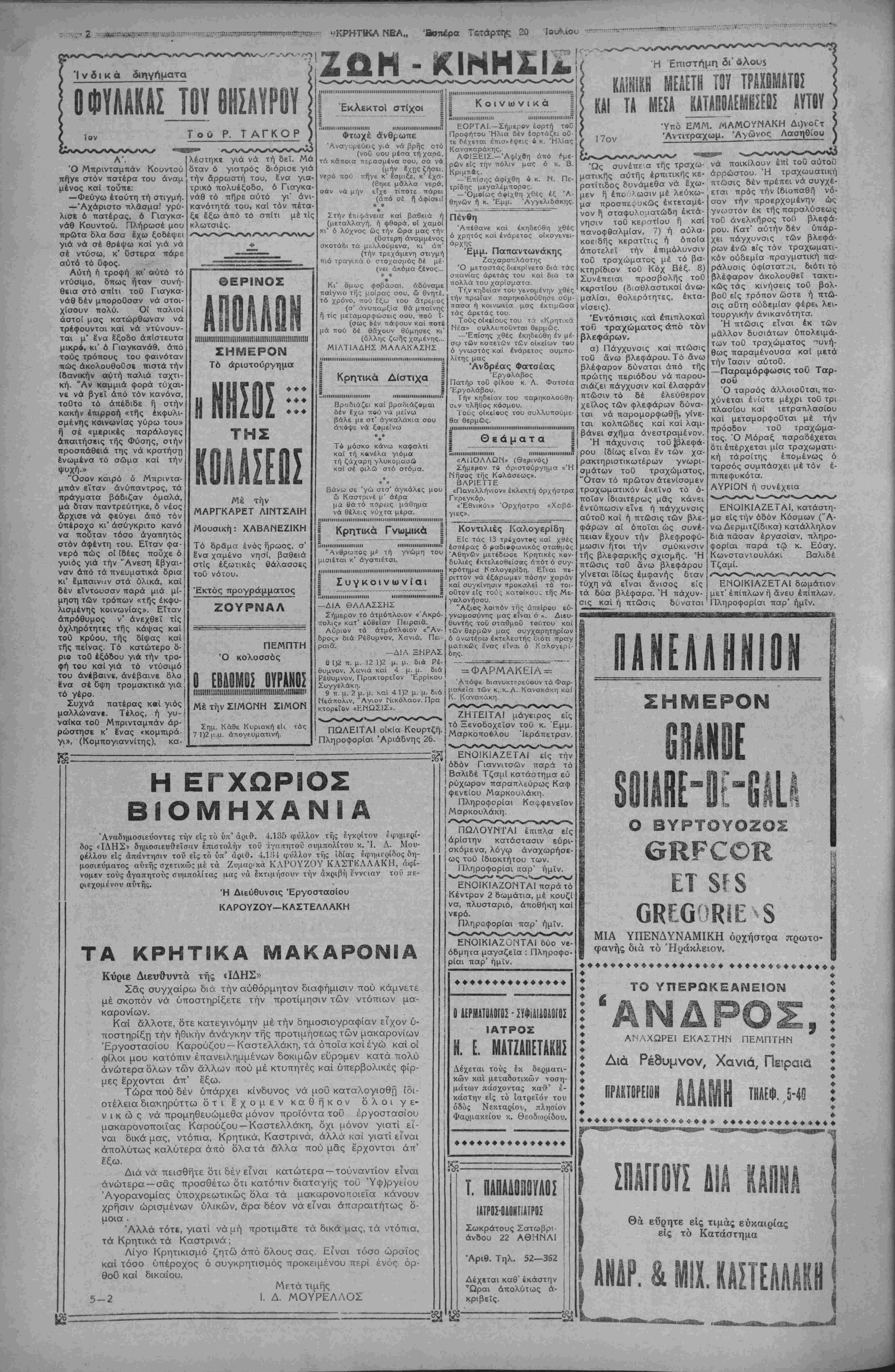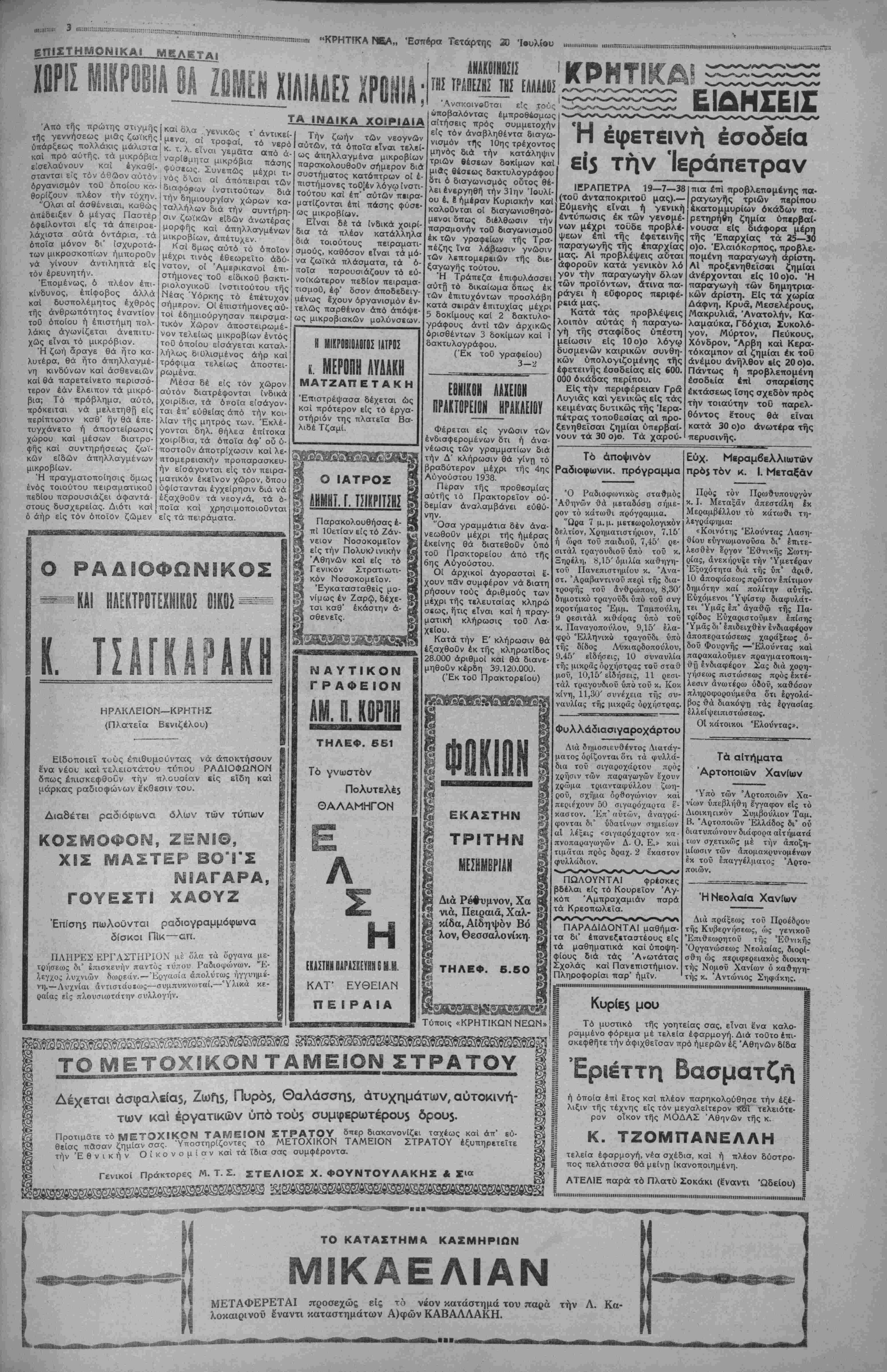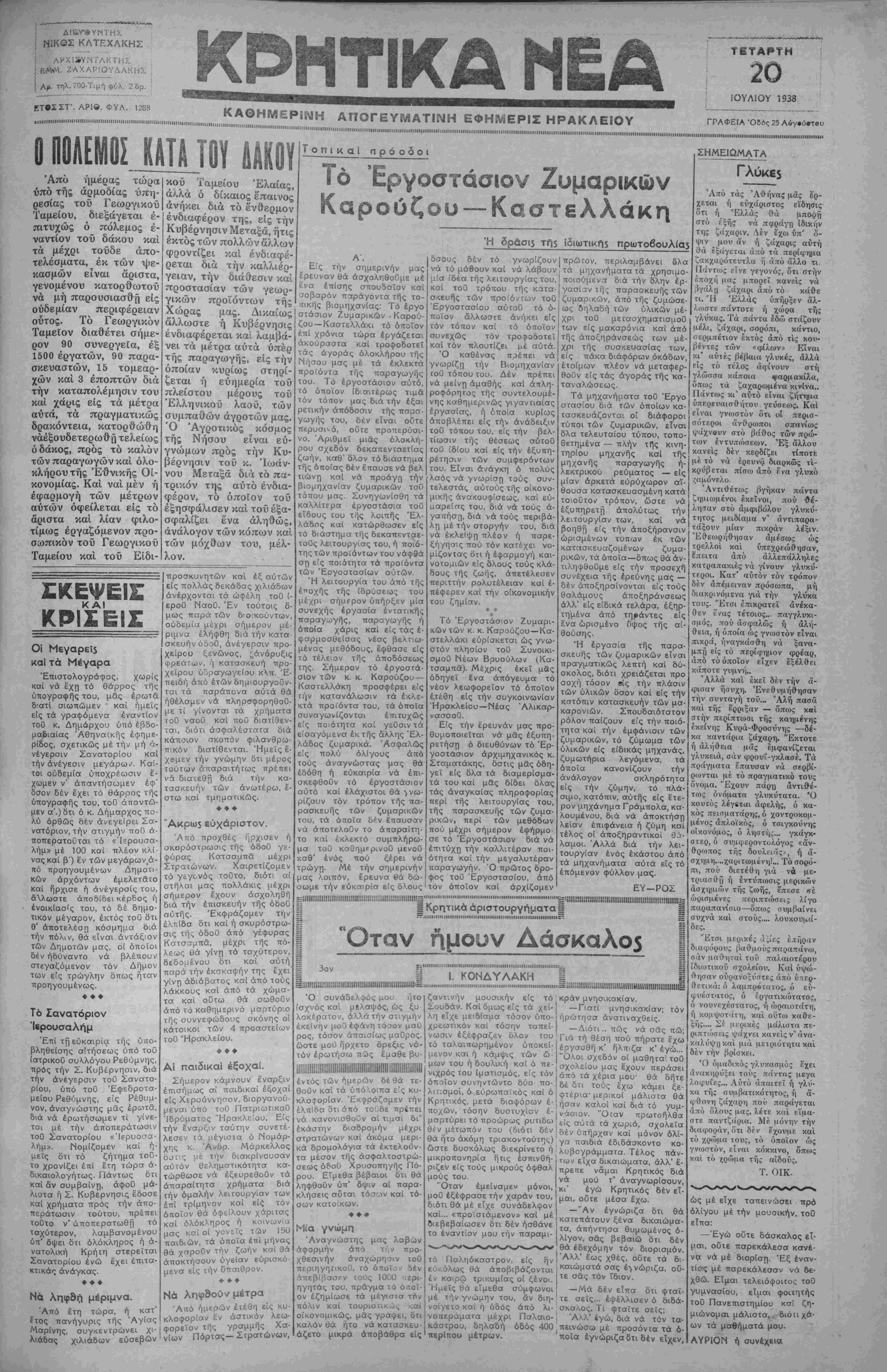 ΕΜ<Μ. ΖΑΧΑΡΙΟΥΔΑΚΗ*·. Αρ· τηλ ,00-Τ.μή φίλ ? ορ ΕΤΘΣΣΤ'. ΑΡΙβ. ΦΥΛ. 1288 II .....ΠΙΙΙΙΙΙΙΗΙΙΗΙΙΙΙΙΙΙ.....Ι......ΙΙΙΙΙΙΙΙΙΙΙΙΙΙΙΙΙΙΙΙΜ......ΙΙΙΙΙΙΙΙιΐιι.ιιιι,,,,,,,,,,......., ΚΡΗΤΙΚΑ ΜΕΑ Τ1ΤΑΡΤΗ ι ΙΟΥΛΙΟΥ 1938 ΑΠΟΓΕΥΜΑΤΙΝΗΕΦΗίνΐΕΡΙΣΗΡΑΚΛΕΙΟΥ γραφει α Όδός 25 Αύν.ο.τβυ ""...........'......."""""".......'".........'"".....'"".........""............""".......'""......■'»'■....."'"'..................................................................................................„.„............,„„...........,......................... Ο ΠΟΛΕΜΟΣ ΚΑΤΑ ΤΟΥ ΑΑΚΟΥ Άπό ημέρας τώρα υπό τής αρμοδίας υπη¬ ρεσίας τοΰ Γεωργικοΰ Ταμείου, διεξάγεται ε¬ πιτυχώς ό πόλεμος ε¬ ναντίον τοΰ δάκου καί τα μέχρι τοΰδε άπο- τελέσματα, έκ των ψε- κασμών είναι αρίστα, γενομένου κατορθωτοΰ νά μή παρουσιασθή είς ουδεμίαν περιφέρειαν ούτος. Τό Γεωργικόν Ταμείον διαθέτει σήμε¬ ρον 90 συνεργεία, έξ 1500 έργατών, 90 παρα- σκευαστών, 15 τομεαρ- χών καί 3 έποπτών διά την καταπολέμησιν τού καί χάρις είς τα μέτρα αύτά, τα πραγματικώς δρακόντεια, κατορθωθή νάέξουδετερωθί τελείως όδάκος, πρός τό καλόν των παραγωγών καί ολο¬ κλήρου τής Έθνικής Οί- κονομίας. Καί ναί μέν ή έφαρμογή των μέτρων αυτών όφείλεται είς τό αρίστα καί λίαν φιλο- τίμως έργαζόμενον προ¬ σωπικόν τοΰ Γεωργικοΰ Ταμείου καί τοΰ Είδι- κοΰ Ταμείου Έλαίας, άλλά ό δίκαιος επαινος άνήκει διά τό ένθερμον ενδιαφέρον της, είς την Κυβέρνησιν Μεταξά, ήτις έκτός των πολλών άλλον φροντίζει καί ένδιαφέ- ρεται διά την καλλιέρ¬ γειαν, την διάθεσιν καί προστασίαν των γεωρ- γικών προϊόντων τής Χώ Δ Τοπι κ α Ι π ρ ό ο δ ο ι Τό Εργοστάσιον Ζυμαρικών Καρούζου —Καστελλάκη Ή δράσΐ5 τή$ πρωτο6ουλία3 Είς την Α'. σημερινήν μας έρευναν θά άσχοληθοθμε μέ ενα έπίσης σπουδαίον καί σοβαρόν ποτράγοντα τής το- τικής βιομηχανίας: Τό έργο ά Ζ Κύ ιδσους δέν τό γνωρίζουν Ι πρώτον, περιλαμβάνει δλα νά τό μάθουν καϊ νά λάβουνι τα μηχανήματα τα χρησιμο- Λωρας μας. Ζλικαΐως στάσιον Ζυμαρικών > Καρού-