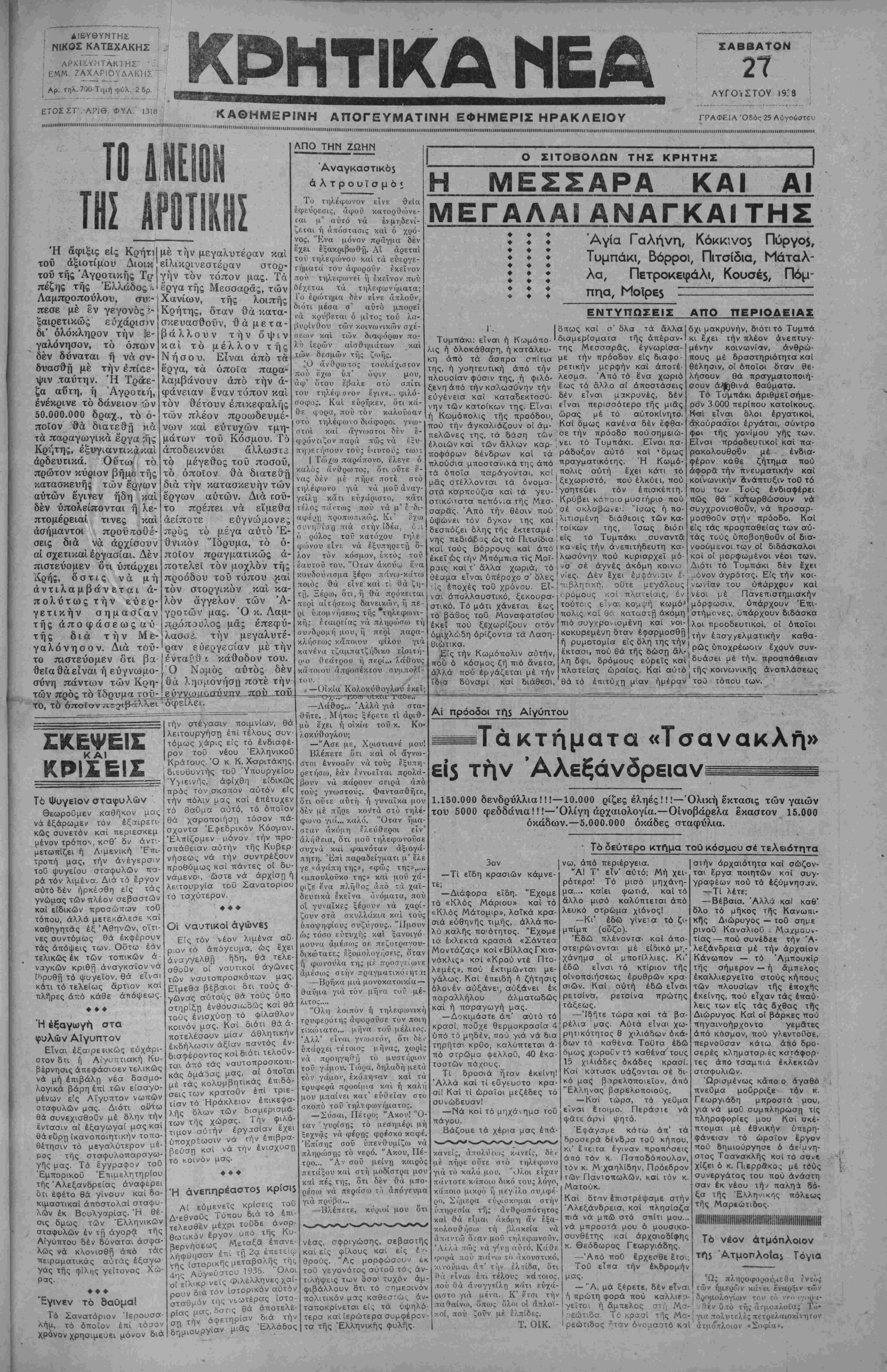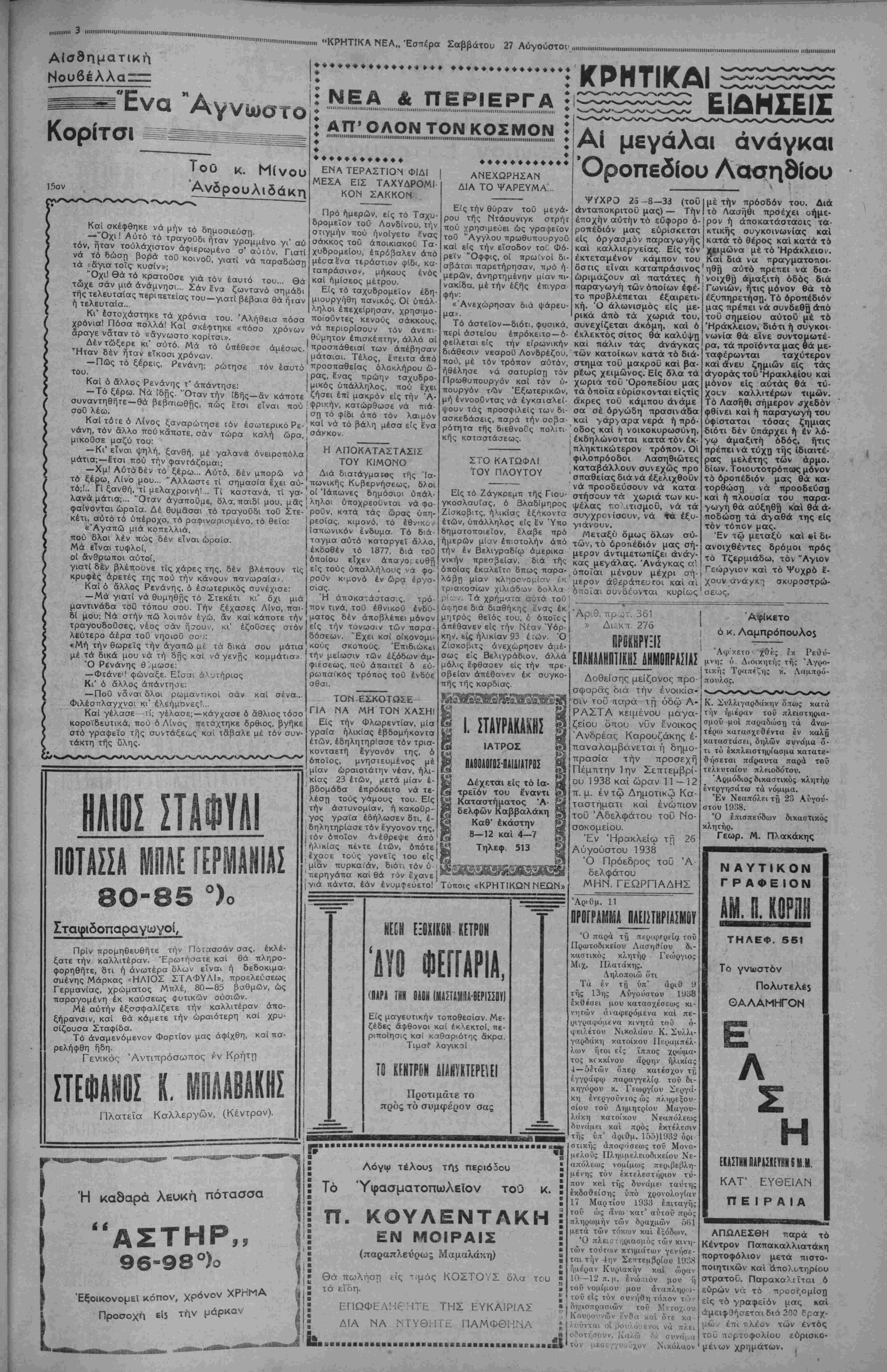 ΚΑΘΗΜΕΡΙΝΗ ΑΓΪΟΓΕΥΜΑΤΙΝΗ ΕΦΗΜΕΡΙΣ ΗΡΑΚΛΕΙΟΥ γραφεια·< .ΙΙ,ϋΐΜΙΙΙΜ 111ΙΚ11111.(111 ΙΙΙΜΜΙΙΜΙΜΙ11ΜΙ1Μ111) 1)1 ΙΠΐΜΐυΐιιΙΙΙΙΙ·· ΙΜΙ ΙΙΙιιιΙΙ,Μ,ι,,,,,,,,,,...,.,,,.,,,, ΙΙΠΙΙΙΙΙΗΙΙΙΙΙΙΙΙΙΙΙΙΙΙΙΙΜΙΙ1ΙΙΙΙΙΙ.....ΙΙΙΙΜΠΙΙΙΙΙΙΙΙΙΙΙΐηΐΙΙΙΙΙΙΙΙΙΙΙΙΙΙΙΙΙΙΙΙΙΙΙΙΙΙΙΙΙΙΙΙΙΙΙΙΙΙΙΙΙΙΙΙΙΙΙΜΙΙ.....ΙΙΙΙΙΙΙΙΙΙΙΙΙΙΙΙΙΜΙΙΙΙΙΙΙΙ1ΙΜΙΙΙΙΙΙΙΙΙΙΜ.....ΙΙΠΙΙΙΠΙΙΙΙΙΙΙΙΙΙΙΙΙΙΙΙΙΠΙ1ΙΙΙ......ΙΙΙΙΙΙΗΙΙΙΜΙ1ΙΙΙΙΜΙΙΙΙΙΙΙΙΙΙΙΙΜΜΙΙΙΙΙΙΙΙΠΙΙ1ΙΙΙΙΙΙΙΙΙΙΙΙΙΙΙΙΙΙ1ΙΙΙΙΙΗΙΙΙΙΙΜ ΑΠΟ ΤΗΝ ΖΩΗΝ Ή άφιξις είς Κρήτι τοΰ άξιοτίμου Διοικ τοΰ τής Άγροτικής Τρ· πέζης τής Ελλάδος γ. μέ την μεγαλυτέραν καΐ είλικρινεστέραν στορ¬ γήν τόν τόπον μας. Τα εργα τής Μεσσαράς, των Λαμπροπούλου, συ--: Χανίων, τής λοιπής πεσε μέ εν γεγονός 5- Κρήτης, δταν θά κατα- & Μ Ι /Ο^Ι β Ϊλ .·* Ο -. -ι# Λ» Λ· Λ» «-» ■ *-Τ?* Ι — 1 · *ν. «Α _ ^~. . . —Ο. * . _ _ ξαιρετικώς εύχάρισ»ν δι' ολόκληρον την Ιε- γαλόνησον, τό όπων οέν δύναται ή νά σν- δυασθη. μέ την έπίοε- ψιν ταύτην. Ή Τρότε- ζα αυτή, ή Άγροτιή, ενέκρινε τό δάνειον Φν 50.000.000 δραχ., τό ό- ποϊον θά διατεθή κά τα παραγωγικά εργα :ής Κρήτης, έξυγίαντικά καί άρδευακά. Ούτω) τό πρώτον κύριον βήμο τής κατασκευάς των έργων αυτών έγινεν ήδη «αί δέν ύπολείπονται ή λε¬ πτομερειαι άσήμαντοι τίνες και προϋαοθέ- σεις διά νά άρχίσουν αί σχετικαί εργασίαι. Δέν πιστεύομεν ότι ύπάρχει Κρής, όστις νά μή άντιλαμβάνετοιι α¬ πολύτως την ευερ¬ γετικήν σημασίαν τής άποφάσεωςαύ τής διά την Μ ε- σκευασθοϋν, θ ά μ ε τ α - βάλλουν την όψιν καί τό μέλλον τής Νήσου. Είναι άπό τα εργα, τα όποϊα παρα- λαμβάνουν άπό την ά- φάνειαν έναν τόπον καί τόν θέτουν έπικεφαλής των πλέον προωδευμέ- νων καί εύτυχών τμη- μάτων τοϋ Κόσμου. Το άτεοδεικνύει αλ,λωστ,ο τό μέγεθος τοΰ ποσοΰ, τό οποίον θά διατε&η διά την κατασκευήν των έργων αυτών. Διά τού¬ το πρέπει νά είμεθα άείποτε εύγνώμονε; πρός τύ μέγα αύτό Ε¬ θνικον "Ιορυμα, τό ο¬ ποίον πραγματικώς α¬ ποτελεί τόν μόχλον τή; προόδου τοϋ τόπου ,καί τόν στοργικόν καί κα¬ λόν άγγελον των Ά- γροτών μας. Ό κ. Λάμ¬ πρου όλος μάς έπεφύ- λασοε. την μεγαλυτέ- γαλόνησον. Διά τοΰ-'ραν εύεργεσίαν μέ την το πιστεύομεν δτι βα- θείαθά είναι ή εύγνωμο- σύνη πάντων των Κρη- τών πρός τό ΐδρυμα το, τό κάθοδον τού. Ό Νομός αύτός δέν 0ά λησμονήση ποτέ την πού τοΰ οφείλει. Άναγκαστικό$ άλτρουϊσμό* Τυ τηλέφωνον είνε θεία εφεύρεσίς, άφοϋ κατορθώνε.- ΐαι μ' αύτό νά έ*μηδένί- ζεται ή απόστασις καί ό χρύ- νος. Ένα μόνον πράγμα δέν έχει εξακριβωθή. Αί άρεταί τοϋ τηλεφ(όνου καί τα εύεργε- τήματά τού άφοροΰν εκείνον πού τηλεφο)νεΐ ή εκείνον πυύ δέχετια τα τηλεφωνήαατα; Γο έρώτημα δέ ν είνε ά πλούν, διότι μέσα σ' αύτό μπορεΐ ΐ'ά κρύβεται ό μϊτυς τού λα- βυρΐνθου των κοινωνικών σχέ- σεων καί των διαφόρων πο- λύ ίερών αίσθηιιάτων καί των δεσμών τής ζο>ής.