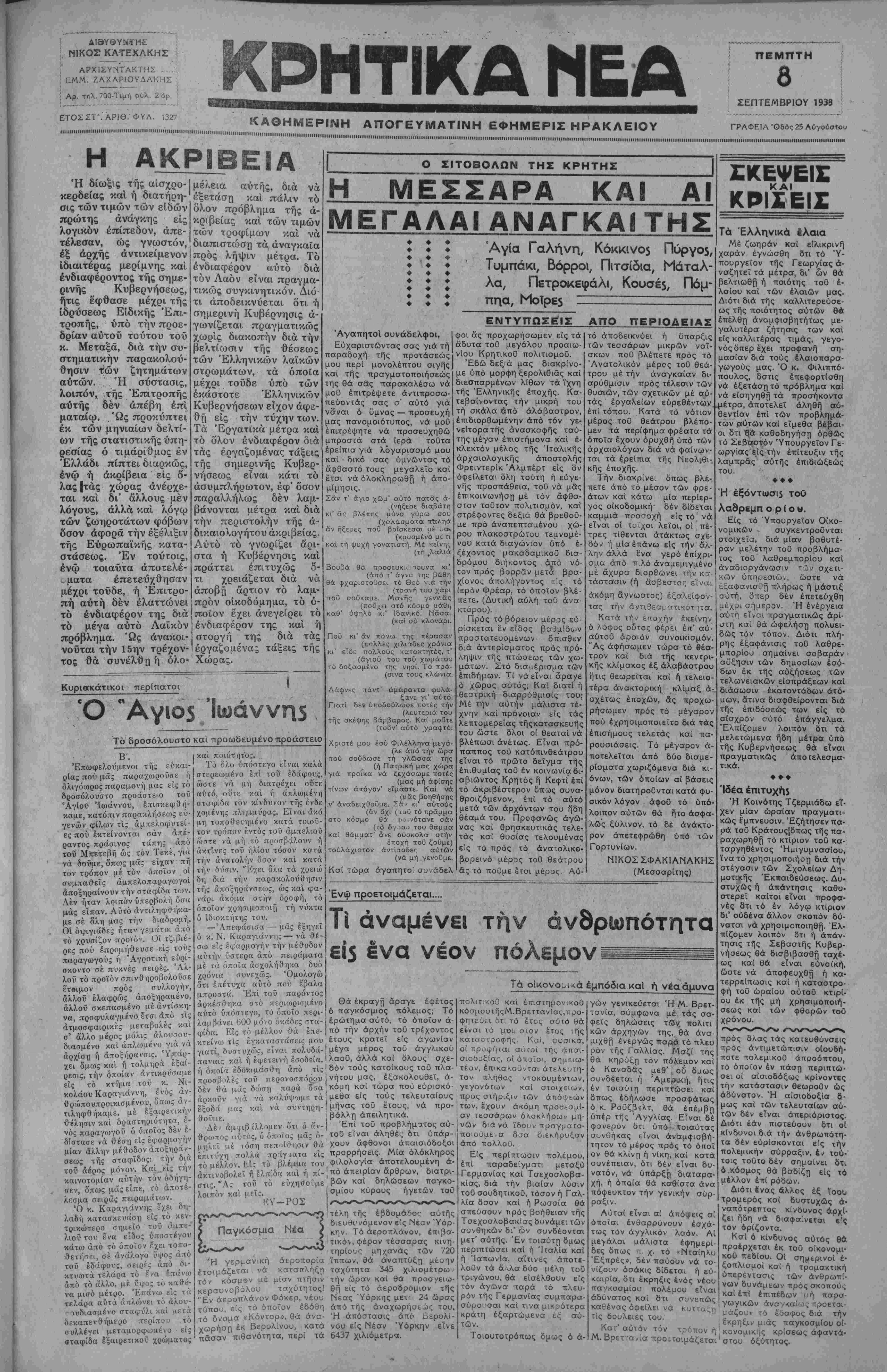 < Αρ. τηλ.700-Τιμη φυλ 2 δρ Ι — '- - - ετοσστ αριθ φυλ 327 ΚΑΟΗΜΕΡΙΝΗ ΑπθΓΕΥΜΑΤΙΝΗ ΕΦΗΜΕΡΙΣ ΗΡΑΚΛΕΙΟΥ γραφεια ΙΙΙΙΙΙΙΙΙΙΙΙΙΙΙΙΙΙΙΙΙΙΙΙΙΙΙΙΙΙΙΙΙΙΙΙ.....■■■■■■■■■■■••■«■■■ΙιΙΕΙΙΙΙΙΙΙΙΙΙΙΙΙιιιιιιΐιιιιι.....ιιιιπτιιιιίι.....„,, .....ιιιιιι"ΐ"Η!ΐιιιιιιιιιιιιιιιιιιιιιιιιιηιιιιιιιιιιιιιιιιιιιιιιιιιιιιιι.......ιιιιιιιιιμιιιιιιιμιιιιιιιιιιιιιιι........ιιιιιιιιιιιιιιιιιιιιιιιιιιιΐΜΜΐιιιπ.....1ΙΙΙΙΙΙΙΙ1Ι1ΙΙΙΙΙΙΙΙΙΙΙΙΜΙΙ.....ιιιι.....ιιιιι......ιιιιιιιιιιιιιιιιιιιιιιιιιιιιιιιιιιιιιιιιιιιιιιιιιιιιιηιι ΣΕΠΤΕΜΒΡΙΟΥ 1938 Η ΑΚΡΙΒΕΙΑ να Ή δίωξις τής αίσχρο-1 μέλεια αυτής, διά κερδείας καί ή διατήρη- εξετάση καί πάλιν τό ------,*«-..α,. *ι?νι. οΐκ,τ». 5λον πρόβλημα τής ά- σις των τιμών των πρώτης άνάγκης είς ό δ λογικόν επίπεδον, απε¬ τέλεσαν, εξ άρχής ως γνωστόν, αντικείμενον ιδιαιτέρας μερίμνης καί ένδιαφέροντος τής σημε- ρινής Κυβερνήσεως, ήτις έφθασε μέχρι τής ιδρύσεως Είδικής Έπι- τροπής, υπό την προε- δρίαν αύτοϋ τούτου τοΰ κ. Μεταξά, διά την συ¬ στηματικήν παρακολού¬ θησιν των ζητημάτων αυτών. Ή σύστασις, λοιπόν, τής Έπιτροπής αυτής δέν άπέβη επί ματαίω, Ώς προκύπτει έκ των μηνιαίων δελτί- ων τής στατιστικής υπη¬ ρεσίας ό τιμάριθμος έν Ελλάδι πίπτει διαρκώς, ένφ ή άκρίβεια είς ό¬ λας |τάς χώρας άνέρχε- ται καί οι' άλλους μέν λόγους, άλλά καί λόγω των ζωηροτάτων φόβων όσον άφορά την εξέλιξιν τής Εύρωπαϊκής κατα¬ στάσεως. Έν τούτοις, ένω τοιαΰτα άττ,οτελέ- .. ματα επετεύχθησαν μέχρι τούδε, ή Έπιτρο- ♦ ♦ ♦ ♦ ♦ ♦ ♦ ♦ ♦ ♦ ♦ ♦ ♦ ♦ ♦ ♦ ♦ ♦ ♦ ♦ ♦ ♦ κριβείας καί των τιμών των τροφίμων καί νά διαπιστωθη τα, άναγκαία πρός λήψιν μέτρα. Τό ενδιαφέρον αύτό διά τόν Λαόν είναι πραγμα¬ τικώς συγκινητικόν. Διό¬ τι άποδεικνύεται ότι ή σημερινή Κυβέρνησις ά- γωνίζεται πραγματικώς χωρίς διακοπήν διά την βελτίωσιν τής θέσεως των Έλληνικών λαϊκών στρωμάτων, τα όποΐα μέχρι τούδε υπό των εκάστοτε Έλληνικών Κυβερνήσεων είχον άφε- θή είς την τύχην των. Τα Έργατικά μέτρα καί τό όλον ενδιαφέρον διά τάς εργαζόμεναι τάξεις τής σημερινής Κυβερ¬ νήσεως είναι κάτι τό άσυμπλήρωτον, έφ' όσον παραλλήλως δέν λαμ- βάνονται μέτρα καί διά την περιστολήν τής ά- δικαιολογήτου ακριβείας. Αύτό τό Υνωρίζεΐ αθΐ- «αι τή ψυχή γονατΓστή. Μέ κείνης στα ή Κυβέρνησις και πράττει επιτυχώς Ι Ο ΣΙΤΟΒΟΛΩΙΜ ΤΗΣ ΚΡΗΤΗΣ Ι Η ΜΕΣΣΑ ΡΑ ΚΑ Ι ΑΙ Μ ΕΓΑΛΑΙ Α ΝΑ Γ ΚΑΙ Τ ΗΣ Αγία Γαληνη, Κόκκινο5 Πυργθ5, Τυμπάκι, Βόρροι, Πιτσίδια, Μάταλ- λα, ΠετροκεφάΑι, Κουσέ$/ Πόμ- πηα, Μοϊρε$ ΕΝΤΥΠΩΣΙΣ ΑΠΟ ΠΕΡ1ΟΔΕΙΑΣ Άγαπητοί συνάδελφοι, Εύχαριστώντας σας γιά τή παρα&οχή τής προτάσεως μου περί μονολέπτου σιγής και τής πραγματοποιήσεως της Θά σδς παρακαλέσω νά μου έπιτρέψετε ά^τιπροσω- πεύοντάς σας σ' αϋτό για νδναι ό ϋμνος — προσευχή φοι άς προχωρήσωμεν είς τα άδυτα τοΰ μεγάλου προαιω- νίου Κρητικού πολιτισμοΰ. Έδώ δεξιά μας διακρίνο· με υπό μορφη ξερολιθιας καί διεσπαρμένοι λίθων τα ϊχνη τής Έλληνικής έποχής. Κα- τεβαίνοντας την μικρή τού τή σκάλα άπό άλάβαστρον, μας πανομοιότυπος, νά μοθ ιέπιδιορθωμένην άπό τόν γε- έπιτρέψητε νά προσευχηθώ νείτορατής άνασκαφής ταύ- μπροστά στά ίερά τοΰτα έρείπια γιά λόγαριασμό μου καί δικό σας ύμνώντας τό άφθαστο τους μεγαλεΐο καί έτσι νά όλοκληρωθή ή απο¬ μίμησις. Σάν τ' άγιο χώμ' αύτο πατας ά- λ(«ηξερε διαβάτη κι' άς βλέττης υονο γύρω σου ( ά άν ηξεμες ποϋ γ (χσΛ,ασματα πΤΐΛηά ϋ βί βρίσκεσαι με (κρυσμένο Ο- νά τι χρειάζεται διά άποβί| άρτιον τό λαμ- πή αύτη δέν έλαττώνειιπρόν οίκοδόμημα, τό ό- τό ενδιαφέρον της διά ποίο