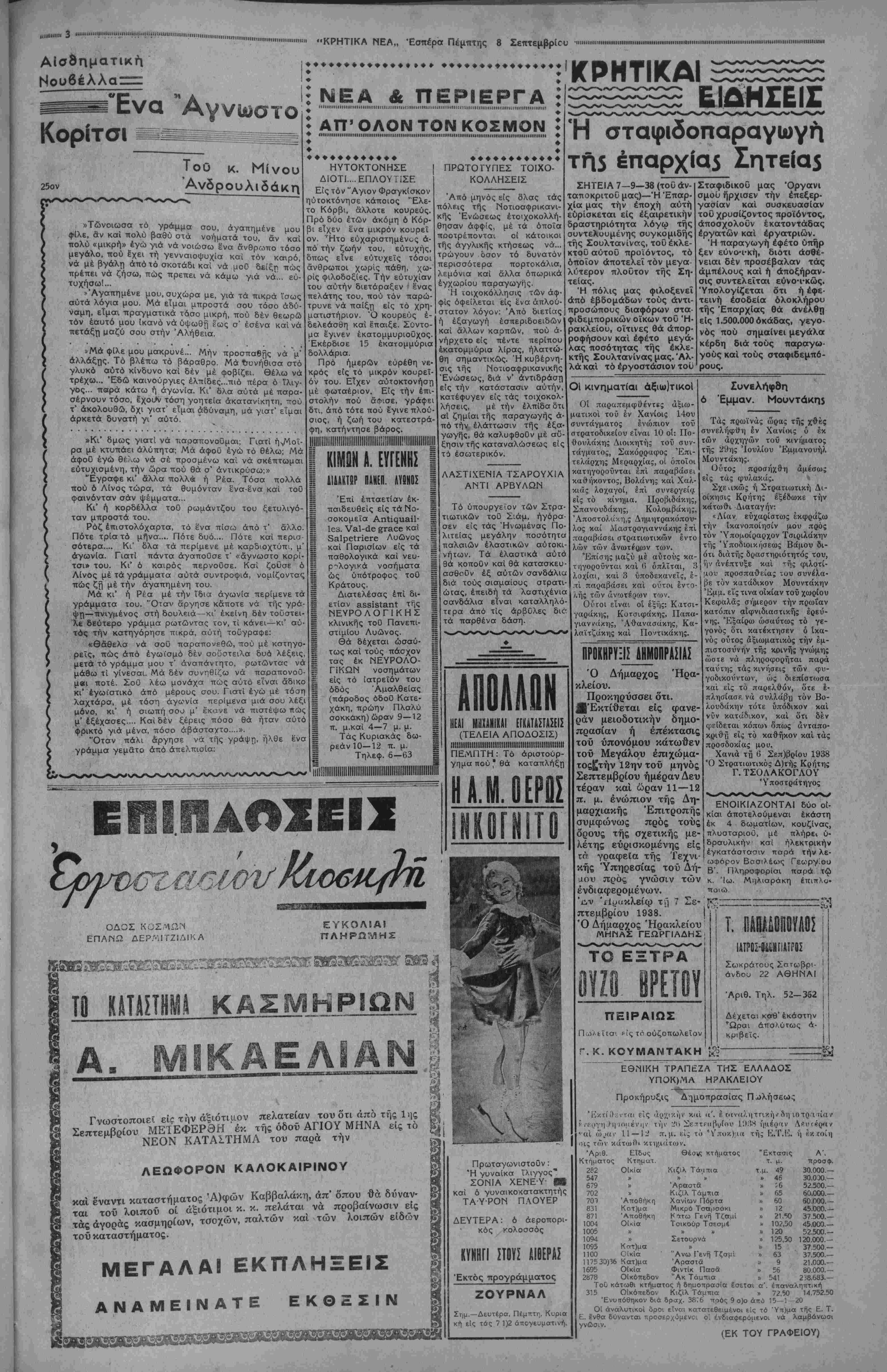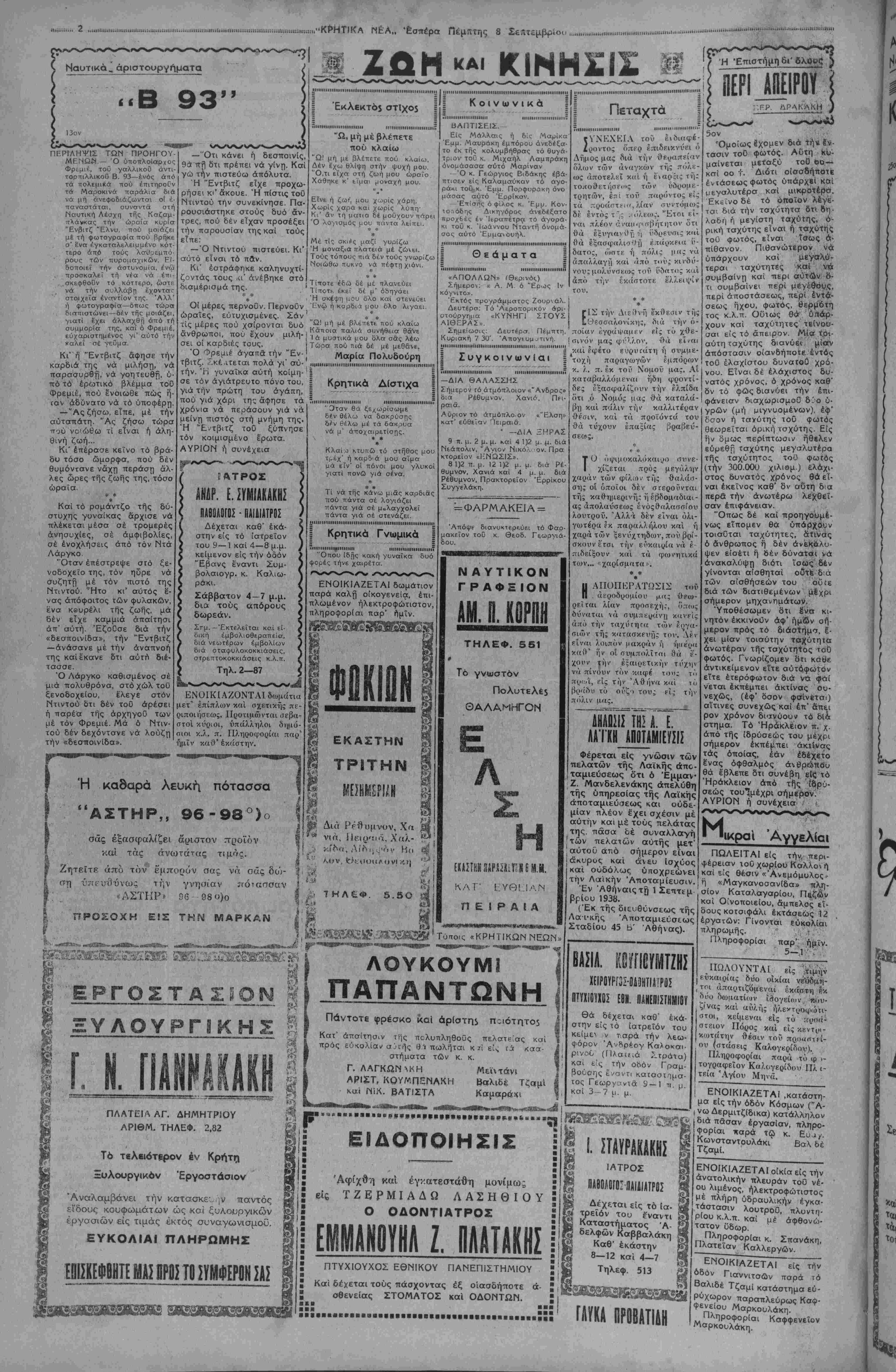 < 8 41.50 5.94 24.86 2 59 3 94 '«54 - δι' έξέταστρα. Έπίσης τό νέον διάταγμα καθορίζει δτι είς την Νομι- κήν Σχολήν θά είσαχθοθν 300 είς την Ιατρικήν 200 είς την Όδοντο'ΐ'ατρικήν 40 είς την Φιλοσοφικήν 100 καί είς την Φυσικομαθηματι- κήν 145 τοθ Πανεπιστημίου Αθηνών. Είς τό τής Θεσ¬ σαλονίκης θά εισ χθοθν είς την Σχολήν Νομικών καί Οι¬ κονομικόν επιστήμων 200 είς την Φυαικήν 40 καί Δασο- λογικήν 60. ΕΙΙΡίΙϋΠΙΙΜΕΪεΕΪ ΑΘΗΝΑΙ 8—9—38 ,(τοΰ ανταποκριταί) μας).— 'Επείγοντα τηλεγραφήματα έκ Πράγας, άγγέλλουν δτι έητά Γερμανικά άεροπλάνα ένήργησαν χ9ές άνΐχνευΐΐ- κάς πτήσεις υπεράνω ΤσεχοσλοβακικόΟ έδάφους. Τα άεροπλάνα ·κ·ατηυθύνθησαν κατόπιν πρός την Βοημίαν («ερΐοχίιν των Σουδιτών) δπου έπίσης ένήργησαν είς μεγάλον βάθος άνιχνεϋτικάς ίή σεις. ·'· Ι ΑΥΣΤΡΙΑΣ ΝΕ9ΑΑΙΑ ΙΑ Ι Λ Α Σ Ε Η η ΕΝΟΠΙΟΝ ΤΟΥ ΧΙΤΛ ΕΣ ΕΡ Ό έορτασμ05 τΓ$ παγκοσμίου ημέρα$ Των ζώων εΐ5 την πόλιν μα$ Πρωτοβουλία τοΰ άντιπρο σώπου έν τή πόλει μας τής Έταιρείας Προστασίας των Ζώων κ. Συγκελάκη, καί τοΰ Προέδρου τοΰ ενταύθα έδρεύοντος μαθητικοϋ Συλ- λόγου Ζωοφίλων κ. Εΰαγ- γέλου Γ, Συνατσάκη, ή έψε- ,ινή παγκόσμιος ήμερα των Ζώων θά έορτασθή πανη- γυρικώς διά πρώτην φοράν καί έν τή πόλει μας. Τό έντός των ημερών έκδοθησόμενον πρόγραμμα περιλαμβάν εί σχε τικάς διαλέξεις, παρελάσεις των Ζωοφίλων, εορτάς, πα- ρασημοφορίας, βρσβεύσεις "ίππων, διανομήν άνσμνηστι τοιχοκο,λΛήσεις διαφημιστι- κών έντύπα'ν κ.λ.π. Γενικά χάριν τοΰ νεοϊδρυ- θέντος είς τή./ πόλιν μας Συλλόγου Ζωοφίλων θά δύ¬ ναται καί ή πόλις μας νά συμπεριληφθή είς τάς άλλας Ζωοφιλικάς πόλεις Δράμαν, Θεσσαλονίκην, Χα¬ νιά καί Σύρον. ΕΤναι άξιος κάθε υποστη¬ ρίξεως ό Σύλλογος αύτάς διότι επί έ'να ετος τώρο: έρ γάζεται υπέρ τής άνθρωπι- στικής καί έκπολιτιστΐκής αυ¬ τής ίδέας, ή όποία είναι δείγ μα ενός άνωτέρου πολ·τι- κων ένσήμων είς τάς όδους,'σμοθ. ΑΙ κληρώσεΐ5 τού Έδνικοϋ ΛαχεΙου ΟΊ κερδίσαντε< άριδμοΐ • Κατ' άνακοίνοίσιν ?< τοΰ ένταΰθα Ποακτβρείου τοΰ Έθν. Λαχείουκατά την χ&εσι- νήν τρίτην ήιιέραν τής ε',κλη¬ ρώσεως εκέρδισαν οί κάτωθι άριθμοί τα έναντι εκάστου σηιιειούμενα ποσά: 74.932 δρ. 4000, 5.-561)1 :)000, καί '.ίύϋό-Ι 853!), άνά χ , 40218, 461^9, 53051, 7(>Χ8!>,