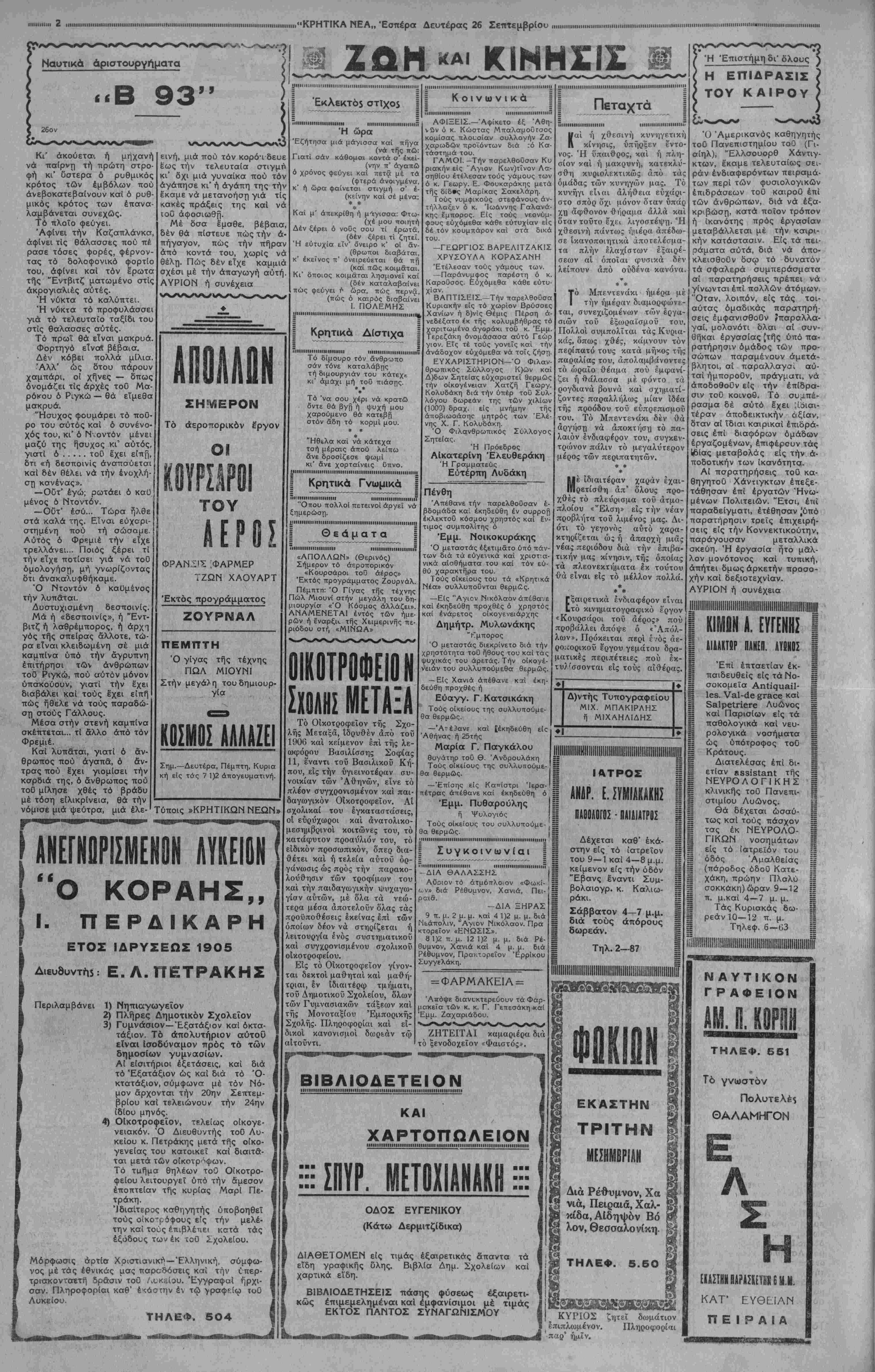 καί διά τό Γηρ< /.ομεΐον δραχ. 1000, πρός παροχήν φαγητού είς μνήμην τής ι '|τρός των Νι· κολέττας Χάλαρι;, άντί έννεαη- μέρου μνημοσύ.ιιυ. Έναρξι< πυρκαϊά* Σήμερον την μεσημβρίαν έξερράγη πυρκαϊά είς την οι¬ κίαν τοΰ κ. Έμμ. Χαρωνίτη, .ταρά την οδόν Κοραή. Αί ζη¬ μίαι είναι έλάχισται. Επί τό- που κατέφθασεν άμέσως ή Πυ ροσβεστική Ύπηρεσία. Ή κατάστασΐ3 εί5 την Τσεχοσλοβακίας ^ ΑΘΗΝΑΙ 2ΰ-9—38 (τοϋ άνταποκριτοϋ μας).— Νεώτε- ρα Τηλεγραφηματα έκ Πράγας, άγγέλλουν ο π ή Κυβέρνησις διαψεύδει τάς Γερμανικάς πλη ροφορίας περί αίματηρών συγ- κρούσεων είς τα Τσεχο—Πο- λωνικά σύνορα καί δολοφονιών των Σουδιτών. Πάντα τα Τε- λωνεΐα, τα καταληφθέντα υπό Σουδιτών, άνεκατελήφθησαν υπό των Τσεχικών στροτευμά- των. Οί Γερμανόφιλοι Σουδΐ- ται άφίνονται νά καταφεύγουν είς Γερμανίαν. 24ωρο5 συνεδρίασι* ΎπουργικοΟ Αγγλία* ^ ΑΘΗΝΑΙ 26—9—38 (τοΰ άνταποκριτοϋ 'μας).— Αγγέλ¬ λεται έκ Λονδίνου ότι τό Αγγλικόν "Υπουργικόν Συμ¬ βούλιον συνεδρίασεν καδ° όλην την ημέραν χθές μετά δέ την αποχώρησιν των Γάλλων Ύ- πουργών εσυνέχισεν την συνε¬ δρίασιν του μέχρις των πρωι- νών ώρών τής σήμερον. Ό Νομάρχη* Λασηθίου Διήλθεν τής πόλεώς μας σή¬ μερον προερχόμενος έκ Χανίων Νομάρχης Λασηθίου κ. Παπαδημητρίου. Διδασκαλιών συνέδριο Είς την αίθουσαν των τρι¬ ών Ίεραρχών άρχίζει σήμερον τάς εργασίας του, παρουσία των αρμοδίων^ Άρχών, τό Β'. Γενικόν Έκπαιδευτικόν Συ¬ νέδριον των Διμοδιδασκάλων τής Β'. Άκπαιδευνικής Περι¬ φερείας Ρεθύμνης. ΥΣΤΑΤΗ ΩΡΑ Ποίαι αί άξιώσεΐ5 τοΟ Χίτλερ, δΓ ά$ έτάχδη προδεσμία άποόοχη5 μέχρι τί5 ΙΟπ$ νυκτερινίι$ τοϋ προσεχοϋ$ Σαββάτου 2 μ. μ. ♦♦♦♦♦♦♦♦♦♦♦♦♦♦♦♦♦♦♦♦♦♦♦♦♦ ρ Α ΥΜΑΝΙΑ ΚΑΙ! Η ΣΕΡΒΙΑ 0Η8ΚΣ0ΥΝ ΤΗΝ ΠΡΑΓΑΝ ΑΘΗΝΑΙ 26—9—38 (τοΰ άνταποκριτοϋ μας)— ' Επείγοντα τηλεγραφηματα έκ Πράγας πρός τάς Εύρωπαΐκάς πρωτευ¬ ούσας ώγγέλλουν δτι ή Ρουμανία καΐ ή Σερβία έπέδοσαν1 διακοίνωσιν πρός την Τσεχοσλοβακίαν, δι' ής τής δηλούν δτι είς περίπτωσιν Γερμανικής έπιθέσεως θά ευρεθούν παρά τό πλευρόν της. Την δια¬ κοίνωσιν ταύτην, ήτις προεκαλεσεν βα¬ θείαν εντύπωσιν, έπεβεβαίωσε ήδη ή Ρου- μανική Κυβέρνησις. ΧΕΤΑΙ 9ΥΣΚ0Τ0Σ ΑΘΗΝΑΙ 26—9—38 (τοϋ άνταποκριτοϋ μας).—Εΐδήσεις έκ Πράγας, άναφέρουν ότι ή Τσεχική πρωτεύουσα διέρχεται <ϊηδ προχθές τάς νύκτας της είς βαθύ σκό- τος. Τό βαθύ σκότος τής Πρά¬ γας — προσθέτουν οί ανταποκρι¬ ταί—διακόπτουν μόνον κατά δια- στήματα οί φανοΐ των χιλιάδων αύ- τοκινήτων, τ« όποϊα μεταφέρουν στρα¬ τεύματα είς τα σύνορα. 1 ΤΣΑΜΠΕΡΛΑΙΝ ΣΥΝΑΝΤ ΕΚ ΝΕΟΥ Η_ΤΙ! ΧΙΤΑ . ΑΘΗΝΑΙ 26—9—38 (τού άνταποκριτοϋ μας).—Τό "Ιταλικόν πρακτορείον «Στέ- φανι» ανακοινοί δτι έ'χει έξ έγκύρου— ώς λέγει—πηγής την πληροφορίαν δτι ό κ. Τσάμπερλαιν θά αναχωρήση έκ νέου έντός τής εβδομάδος δια Γερμανίαν, ίνα συναντηθη μετά τοΰ Καγκελλαρίου Χίτλερ. Ή νέα αυτή μετάβασις τοΰ Άγ- γλου πρωθυπουργοΰ^ είς Γερμανίαν θά γίνη ώς λέγεται την προσέχη Πέμπτην, θά παρατείνη δέ ό κ. Τσάμπερλαιν την παραμονήν του έν Γερμανία καί τιέραν τής ήμερομηνίαςτήςέκπνοής^τοΰγερμανι- κοΰ τελεσιγράφου. ΠΟΤΕ ΕΚΠΝΕΕΙΗ ΠΡ ΤΟΥ ΓΕΡΜΑΝ. ΤΕΛΕΣ ΟΕΣΜ Α Υ ΑΘΗΝΑΙ 26—9—38 (τοϋ άνταποκριτοϋ μας)— Τηλεγραφηματα έκ Βερολίνου πρός τάς Εύρωπα·ι·κάς εφημερίδας, άγ¬ γέλλουν δτι τή συγκαταθέσει τού Χί¬ τλερ ή προθεσμία τού Γερμανικοϋ τελε¬ σιγράφου περί άποδοχής των νέων άξι¬ ώσεων τοϋ Ρά·ι·χ παρετάθη καί θά λήξη την ΙΟην εσπερινήν τοΰ προσεχούς Σαβ¬ βάτου. ΟΙ ΤΣΕΧΟ ΤΑΣ ΑΙΣ ΟΑΣΥΙ ΙΣ ΤΗΣ ΗΣΟΥΝ ΛΩΝΙΑΣ νάκοινωθέν, το ίζον δτι οί κ. Γί