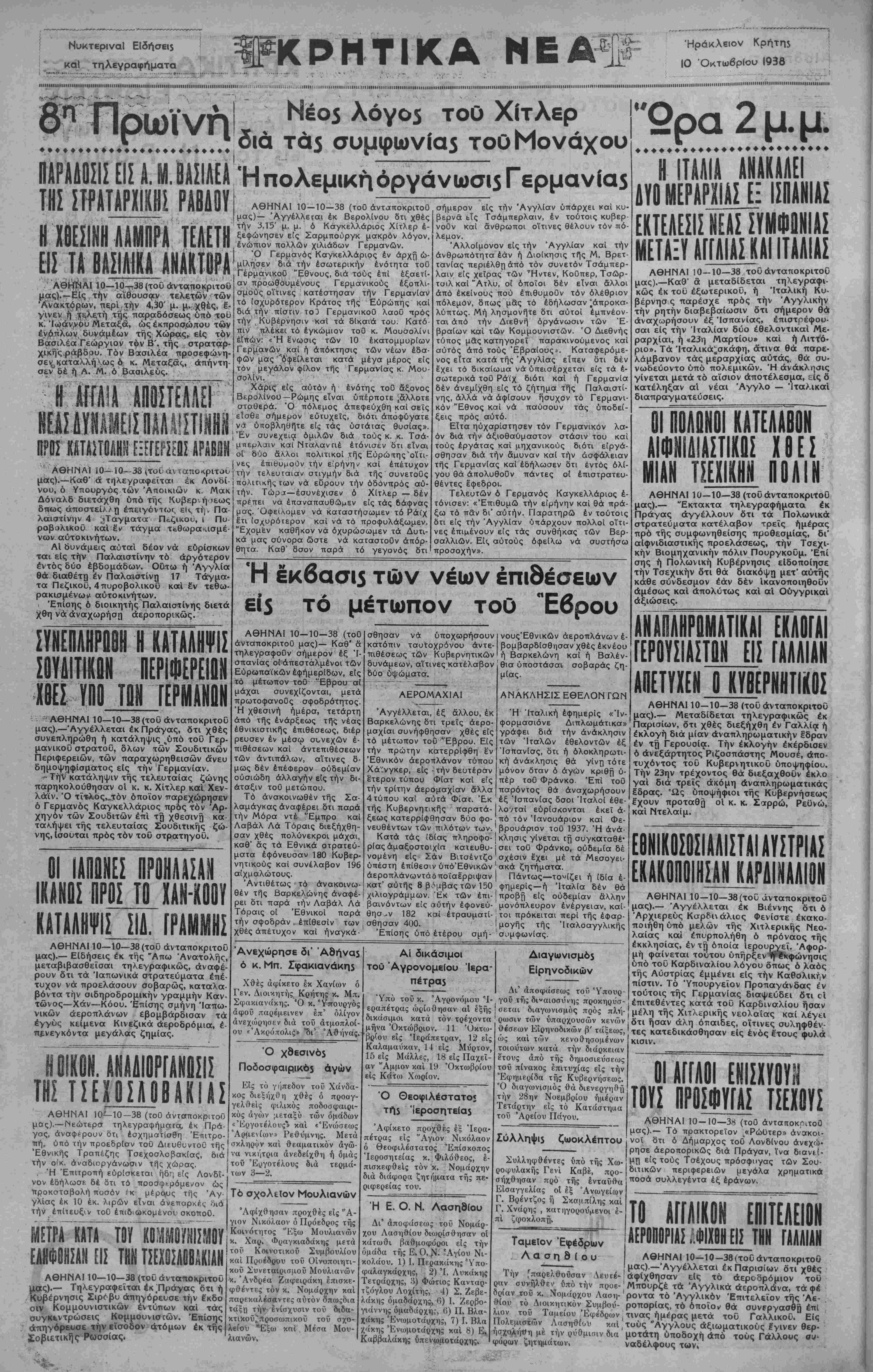 ΑΘΗΝΑΙ 10—10—38 (τού άνταποκριτοΰ