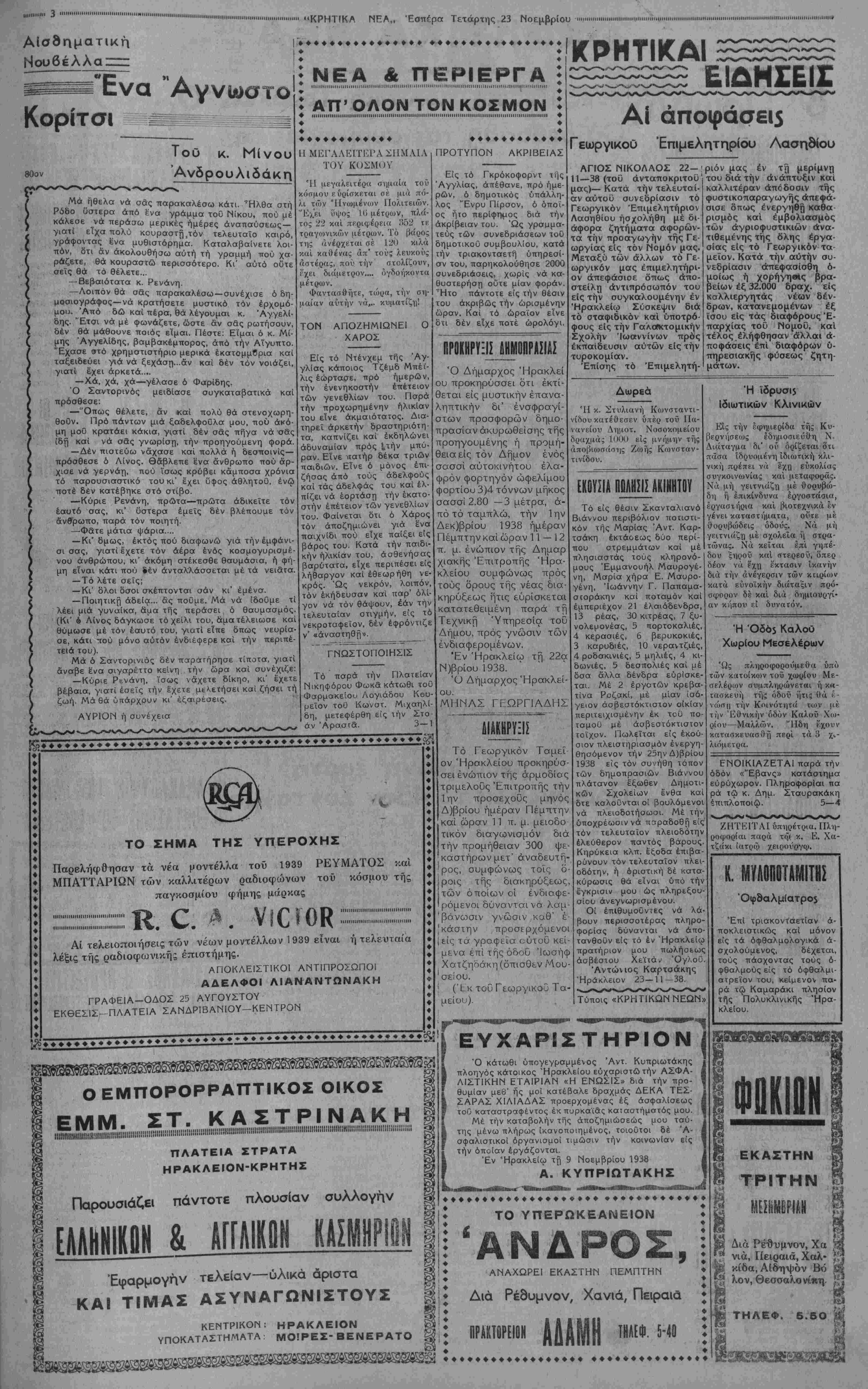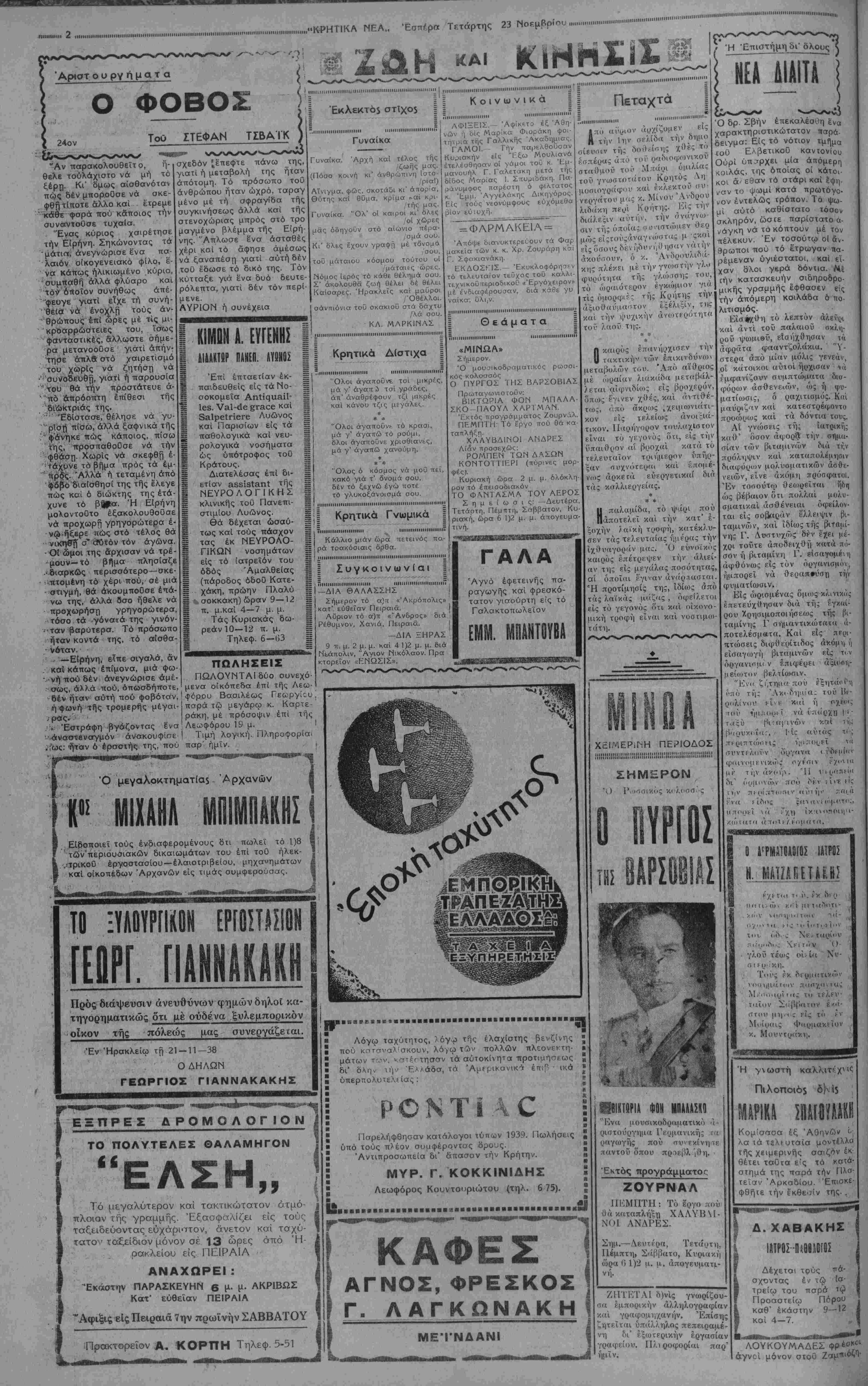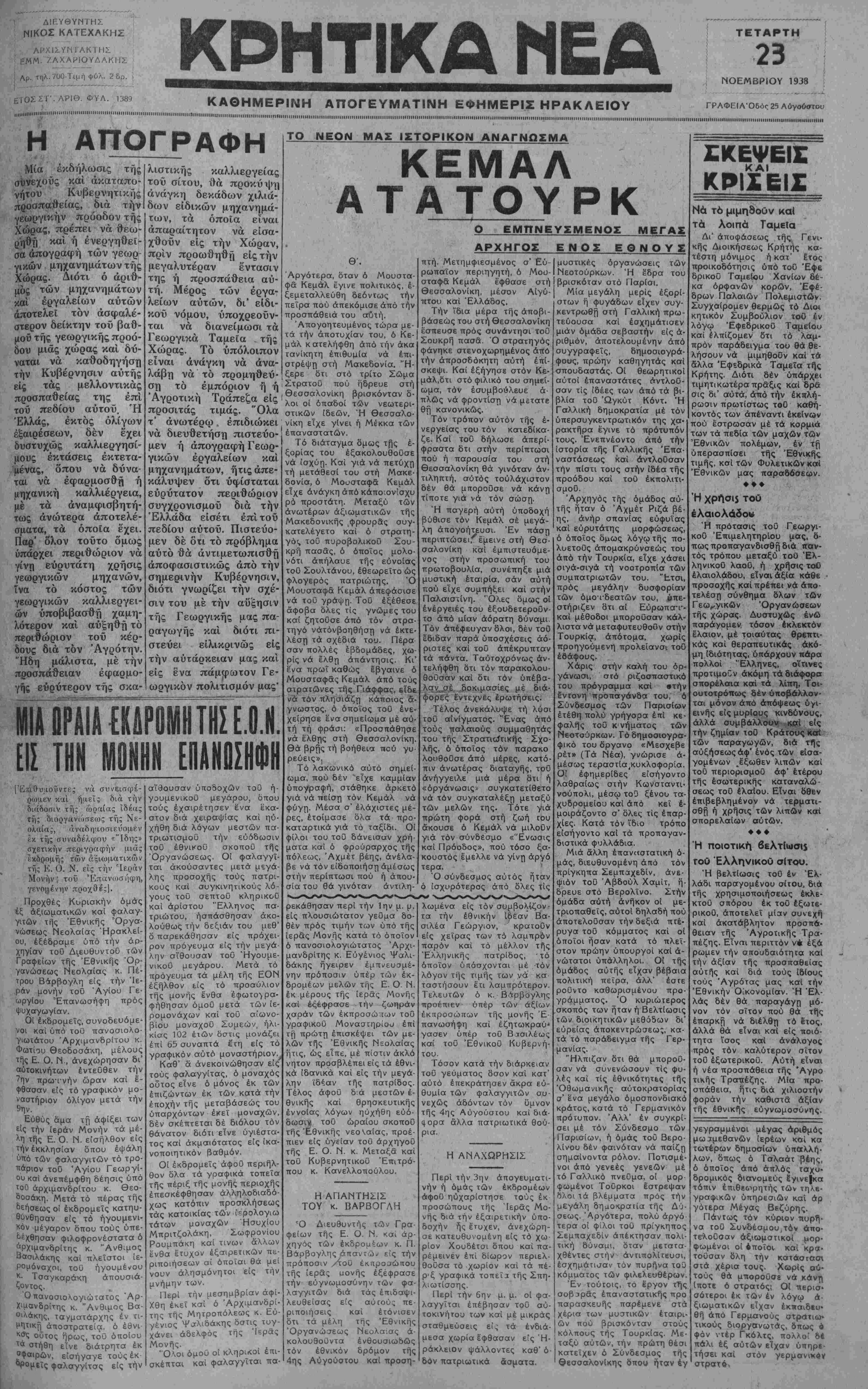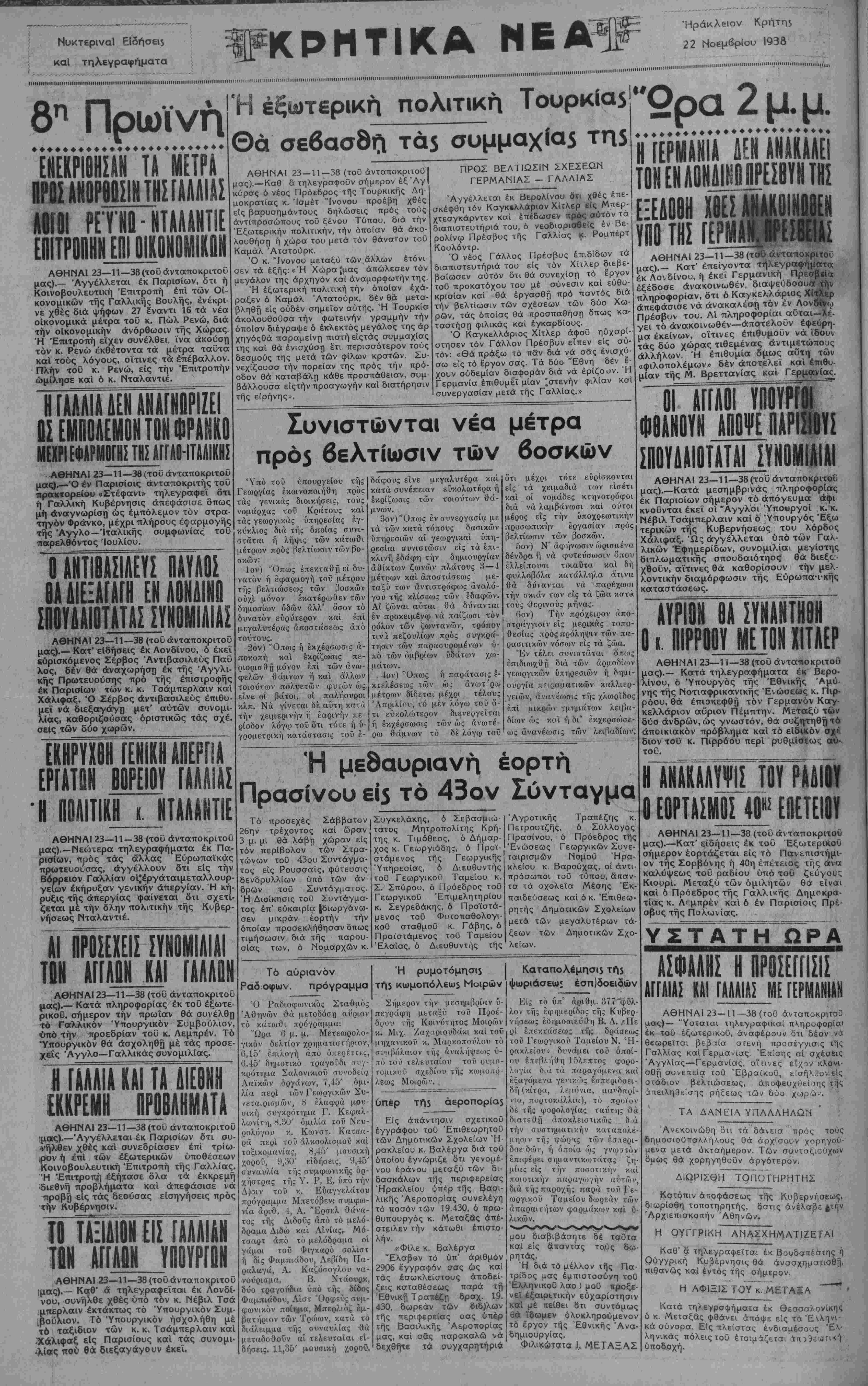 μί<ζς είς τήν ποσοτικήν καϊ ποιοτικήν παραγον/ήν «ντών, διά τής παροχή; παρά τοΰ Γε- ωργικαΰ ^ Ταμείου δωρεάν τών απαραιτήτων φαρμάκο^ν καί υ¬ λικών. μου διαβιβάσητε δέ ταΟτα και είς απαντάς το.ύς δω- ρητάς. Ή διά τό μέλλον τής Πα¬ τρίδος μας εμπιστοσύνη τοΟ Ελληνικού λαο 3 μοΰ προξε¬ νεί έξαιρ^τικήν εύχαρίστησιν καί μέ πείθει δτι συντόμως 6ά ϊβωμεν όλοκληρούμενον τό έργον της "Εθνικής "Ανα¬ δημιουργίας. Φιλικώτατα Ι ΜΕΤΑΞΑΣ "Ορα 2 μ. μ. ♦♦♦♦♦♦♦♦♦♦♦♦♦♦♦♦♦♦♦♦♦♦♦♦φ Η ΓΕΡΜΑΝΙΑ ϋΕΝ ΑΝΑΚΑΛΕΙ ΤΟΝ ΕΝ ΑΒΝΑΙΝβ ΠΡΕΣΒΥΝ ΤΗΙ ΕΞΕΔΟ 9Η ΧΟΕΣ ΑΝΑΚ01Ν Εϋ ΥΠΟ ΤΗΣ ΓΕΡΜΑΜΡΕ1 ΑΘΗΝΑΙ 23—11—38 (τ<Λ) ανταποκριτού μας).— Κατ' επείγοντα τηλεγραφήματα έκ Λονδίνου, ή έκεΐ Γερμανική Πρεσββία έξέδοσε ανακοινωθέν, διαψεύδοσυα τήν πληροφορίαν, δτι ό Καγκελλάριος Χίτλερ απεφάσισε νά άνακαλέση τόν έν Λον8&ω Πμέσβυν του. ΑΊ πληροφορίαι αύται—λέ¬ γει τό ανακοινωθέν—αποτελούν εφεύρη¬ μα εκείνων, οϊτινες επιθυμούν νά ϊδουν τάς δύο χώρας τιθεμένας αντιμέτωπους αλλήλων. Ή επιθυμία δμως αϋτη τών «φιλοπόλεμων» δέν αποτελεί και έπιθυ- μίαν τής Μ. Βρεττανίας καί Γερμανίας. ΑΓΓΛΟΙ ΥΠ ΑΠΟΨΕ ΙΑ ΣΠΟΥΔΑΙΟΤΑΤΑ! ΣΥΝΟΜΙΑΙΑΙ ΑΘΗΝΑΙ 23—11—38 (τοΰ ανταποκριτού μας).—Κατά μεσημβρινάς πληροφορίας έκ Παρισίων σήμερον τό απόγευμα άφι κνοΰνται έκεΐ οί "Αγγλοι Ύπο«ργοί .κ. κ. Νέβιλ Τσάμπερλαιν και ό' Υπουργός Έξω τερικών τής Κυβερνήσεως του λόρδος Χάλιφαξ. 'Ω,ς άγγέλλεται ύπό τών Γαλ¬ λικών Εφημερίδων, συνομιλίαι μεγίστης διπλωματικής σπουδαιότηος θά διεξς;- χθοΰν, αϊτινες θά καθορίσουν τήν μελ- λοντικήν διαμόρφωσιν τής Εύρωπα·ι·κής καταστάσεως. ΑΥΡΙΟΝ ΒΑ ΣΥΗΑΗΤΗΘΗ 01ΠΙΡΡΟΟΥ ΜΕ ΤΟΝ ΧΙΤΛΕΡ ΑΘΗΝΑΙ 23—11—38 (τοΰ ανταποκριτού μας).— Κατά τηλεγραφήματα έκ Βερο¬ λίνου, ό Υπουργός τής "Εθνικής Αμύ¬ νης τής Νοτιαφρικανικής Ενώσεως κ. Πιρ· ρόου, θά έπιακεφθη τόν Γερμανόν Καγ- κελλάριον αυριον Πέμπτην. Μεταξύ τών δυο ανδρών, ώς γνωστόν, θά συζητηθήτό άποικιακόν πρόβλημα καί τό είδικόν σχέ διον τοϋ κ. Πιρρόου περί ρυθμίσεως αύ- του. Η ΑΝΑΚΑΛΥυΟΥ ΡΑΔΙΟΥ 0 ΕΟΡΤΑΣΜΟΣ 40^ ΕΠΕΤΕΙΟΥ ΑΘΗΝΑΙ 23—11—38 (τοΟ ανταποκριτού μας).—Κατ' είδήσεις έκ τοΟ Εξωτερικού σήμερον εορτάζεται είς τό Πανεπιστήμι- ον τής Σορβόνης ή 40η επέτειος της άνα καλύψεως του ραδίου ύπό του ζεύγους Κιουρί. Μεταξύ τών ομιλητών θα είναι και ό Πρόεδρος τής Γαλλικής Δημοκρα¬ τίας κ. Λ^μπρέν και ό έν Παρισίοις Πρέ- σβυς τής Πολωνίας. ΑΣΦΑΛΗΣ Η ΠΡΟΣΕΓΠΣΙΣ ΑΓΓΛΙΑΣ ΚΑΙ ΓίΑΑΙίΐ ΜΕ ΓΕΡΜΑΗΙΑΝ ΑΘΗΝΑΙ 23-11—38 (τοϋ ανταποκριτού μας)— "Υσταται τηλε,γμαφικαί πηροφορίσι έκ τοΰ εξωτερικού, αναφέρουν όχι δέον νά θεωρείται βεβτάα στενή προσέγγισις τής Γαλλίας καί Γερμανίας Έκίσης αϊ σχέσεις "Αγγλίας—Γερμανίας, αΐπνες είχον κλονι- σθη συνεπεία του ΈβραίκοΟ, ε'σήλΰονείς στάδιον βελτιώσεως, αποφευχθεί 7ης τ?Κ άπειλη9είσης ρήδεως τών δύο ΤΑ ΔΑΝΕΙΑ ΥΠΑΛΛΗΛΩΝ Άνεκοινώθη διι τά δάνεια προς τους δημοοιουτταλλήλους θά αρχίσουν χορηγού¬ μενα μετά όκταήμερον. Τών συνταξιούχων Ομως θά χορηγηθούν άργότερον. Δ1ΩΡ1Σ9Η ΤΟΠΟΤΗΡΗΤΗΣ Κατρπιν άίχοφάσεως τής Κυβερνήσεως, διωρισθη τοποτηρητής, δστις ανέλαβε Ατην Λρχιεπισκοπήν Άθηνφν. Η ΟΥΓΓΡΙΚΗ ΑΝΑΣΧΗΜΑΤΙΖΕΤΑΙ Καθ' α τηλεγραφεϊτα·. έκ Βουδαπέστης ί Ουγγρική Κυβέρνησις θά άνασχημαμσθή, πιθανώς καί εντός τής σήμερον. Η ΑΦΙΞΙΣ ΤΟΥ κ. ΜΕΤΑ5Α ** ' ΚΜΤά ττ'λε>Ρ°"ίήμστ:α έκ θεσσαλονίκης