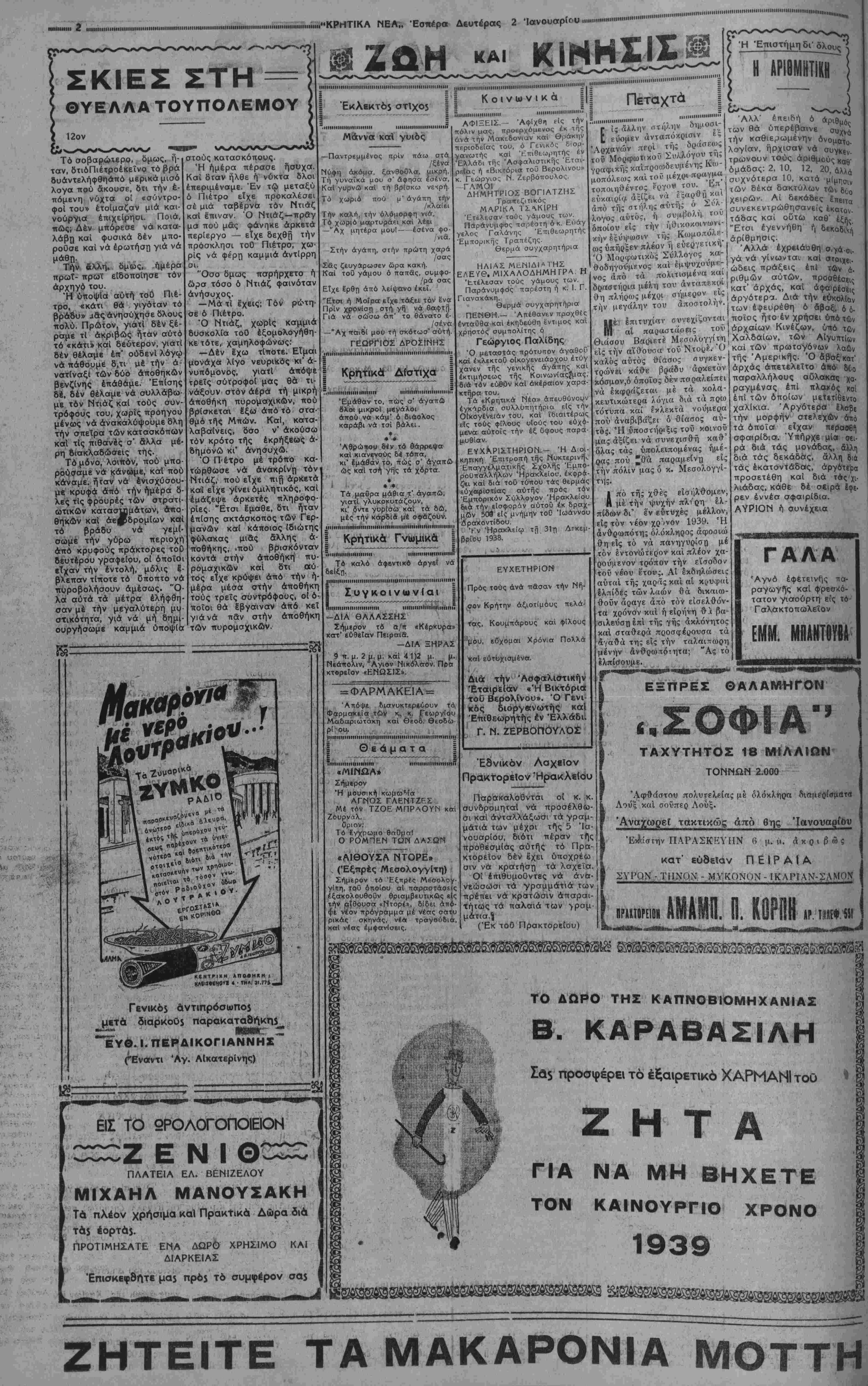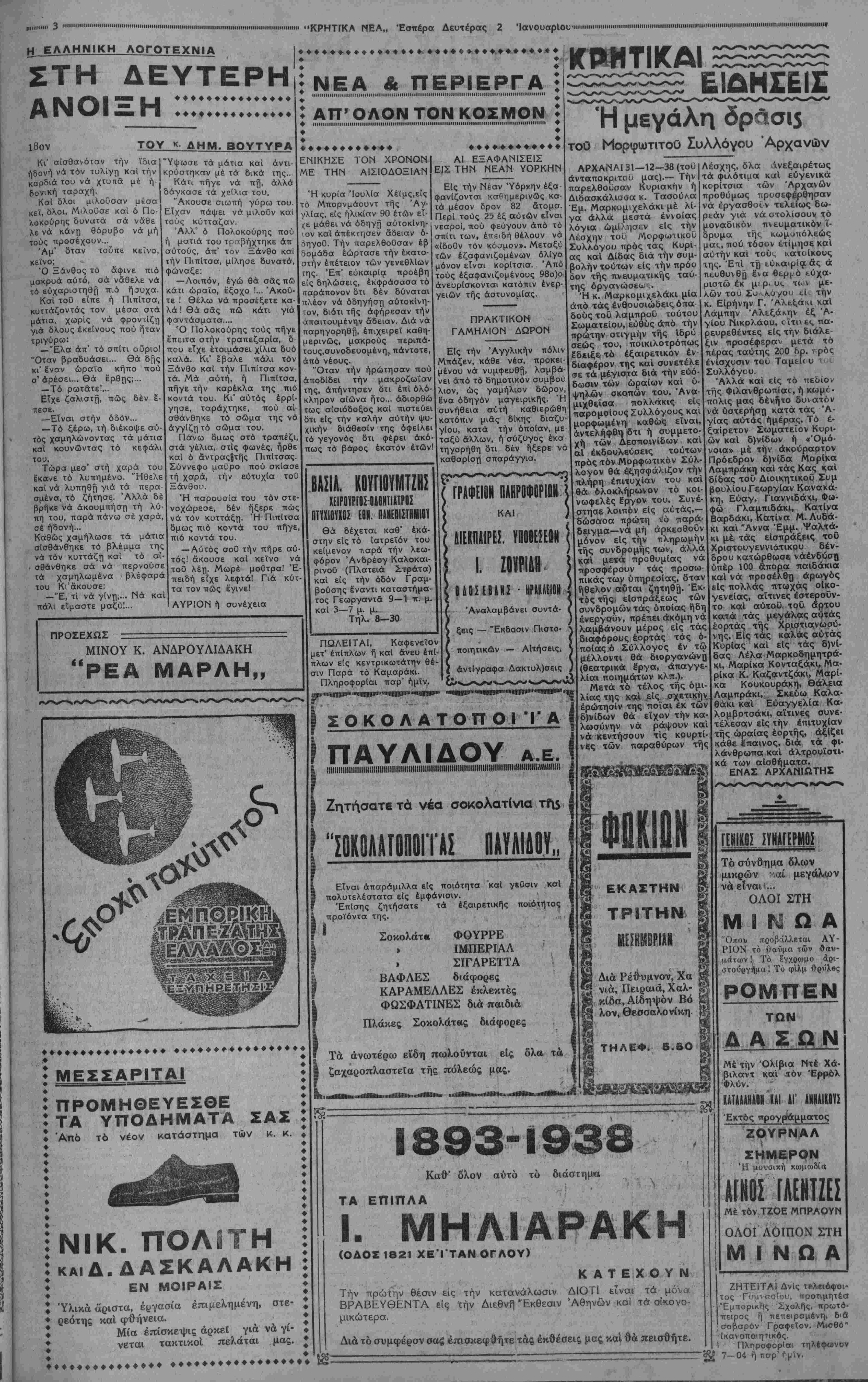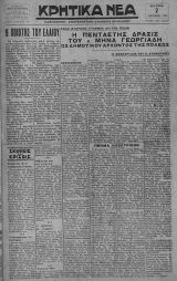 ΑΘΗΝΑΙ 2—1—39 (τοϋ <*νταποκριτοο μας).—Κατά τηλεγραφήματα έξ Ήνωμέ. νων Πολιτειών, 6 "Αμερικανικός τύπος έχει εγκαινιάσει πρωτοφανούς οριμύχη. τος έκσχρατείαν εναντίον τών ολόκληρο τικών κρατών καΐ Ιδία τής Γερμανίας καί Ιαπωνίας. Αί "Αμερικανικά! εφημερίδες τονίζουν δτι 6 "Αμερικανικός λαός θά 4ν· τιστϊ) οπωσδήποτε κατά των μεθόδων τών "χωρών αυτών καί θά λάβη ένεργόν μέρος είς τήν προσπάθειαν διά τήν τα· πείνωσίν των. Έν τέλει δηλοΰται δτι δέν άναγνο. ρίζεται οΟτε ή κατάκτησις τής Μαντζου¬ ρίας, οΟτε ή κατάκτησις τής Κίνας έκ μ£. ρους τής Ιαπωνίας, από τάς Ήνωμένας Πολιτείας. 9 ΝΤΑΛΑΝΤ1Ε Χ ΑΗΕΧαΡΗΣΕΝ 11 11 ΚΟ ΕΡΑΣ ΒΑ ΤΥΧΗ ΑΠΟΘΕΩΤΙΚΗ! ϊ Ή κηδεία Σφακιανάκη ε($ "Αγιον Νικόλαον Εί5 "Αγιον Νικόλαον έγέ· νετο χθες μβτά πάσης έπι- βλητικότητος καί έν συρροί) ολοκλήρου τής έκεΐ Κοινωνί¬ ας καί τής επαρχίας Μβραα- βέλλου ή κηδεία τοΟ άποβιώ σαντος Μιχαήλ Σφακιανάκη Π^λαΐοΟ ΠολιτευτοΟ καί πρώτου ΔημοτικοΟ "Αρχον¬ τος τής γείτονος Πρωτευού¬ σης. Είς τήν αορόν τοΟ μετα¬ στάντος κατετεθησαν πολλοί στέφανοι και έξεψωνήθησαν επικήδειοι λόγοι. Ή διατίμηση αμνού γάλακτο; Κατ1 άνακοίνωσιν εν. χής Άγορανομίβ; Ήρβκλβίου τό αρνί χοϋ γάλακχος διεχιμήθη είς 56 δραχμάς κατ" δκδν, Ι Διελύδη Δ. Συμβούλιον του ΆγΙςυ Νικολάου ^ια Βιισιλικβϋ Διατάγματος δΐιΐλΰβτνι χό Δηαοχικόν Σ«μ- βούλιον Αγίου Νιχολοίου διά λόγβυ; σο(5βροί)ς δημοσίου και δημοτικοί συμφέροντος. Λιά χήνδσκηβι* χών άρμβδιοτήτων χοΰ Δημοχιποΰ Συμβουλίου δι¬ ορίζεται ίξαμελής επιτροπή ?.κ χών δημοχών Νικ. Αλέξη, Ίω. Βούλγαρη, Ίω. Κοκχίνη, Δημ. Μαυροφόρου, Ίω. Σγου¬ ρού «αί Έμμ. Σχραχάχη. Εισαγωγή Κτηνών °Ως ?κ χής μειώββως χοΰ κιν δύνον εξαπλώσεως τοΰ αφθώ¬ δους πυρεχυν τό Ύπουργείον Γβωογίας επέτρεψε τήν βίσα- Υωγήν είς Ελλάδα μηρυκαστι¬ κών χ«ι χοίρων έξ Αλβανίας. Έπίβης επετράπη ή |ξ Ουγ¬ γαρίας κ«Ι Νοτκισλουΐας εΐσ«- γωγή. νωπών «ρειίχων. ΑΘΗΝΑΙ 2—1—39 (του ανταποκριτού μας).— Ώς εϊχεν αναγγελθώ τήν 12.15' χθες άνεχώρησε διά Τουλώνα ό Γάλλος Πρωθυπουργός. "Εκείθεν έπιβάς ταΰ θω· ρηκτοΰ «Φως», τό όποιον συνοδεύουν κα,Ι 15 όίλλα πολεμικά, άνεχώρησε διά Κορ- σικήν. Έν τω μεταξύ είς τήν ανωτέρω Γαλλικήν μεγαλόνησον συμπληροΰ>ται