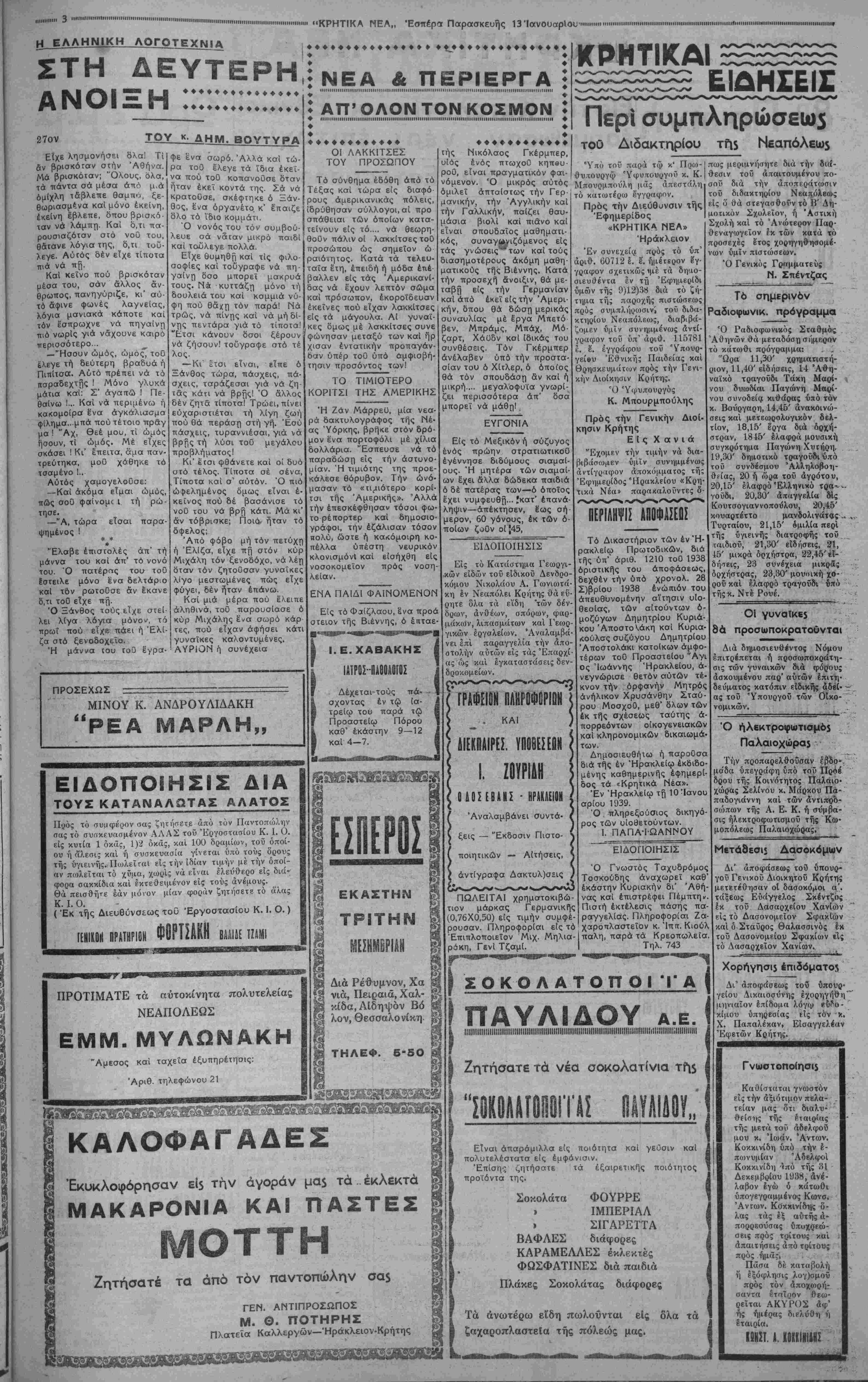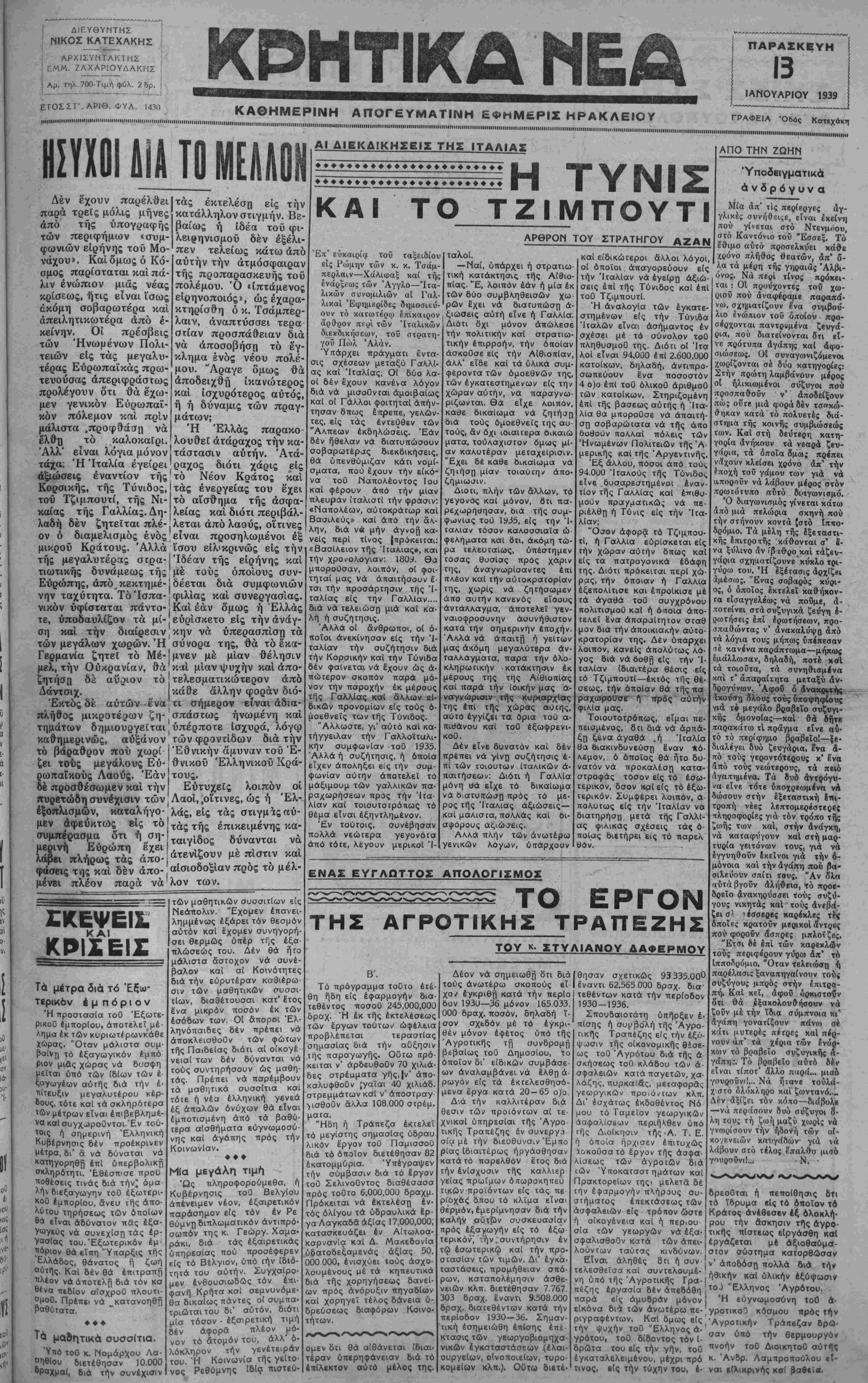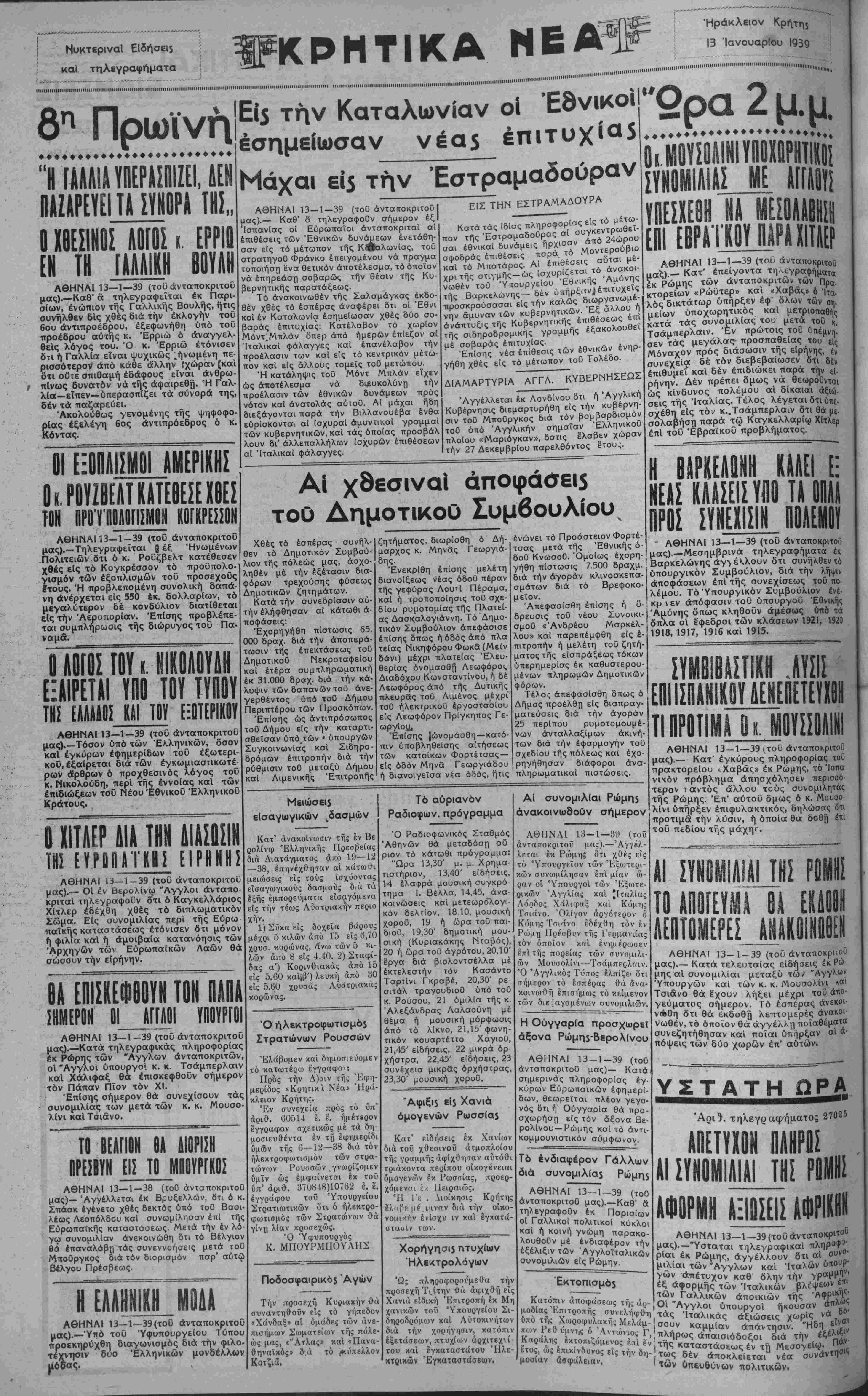 ΑΘΗΝΑΙ 13—1—39 (τοϋ ανταποκριτού