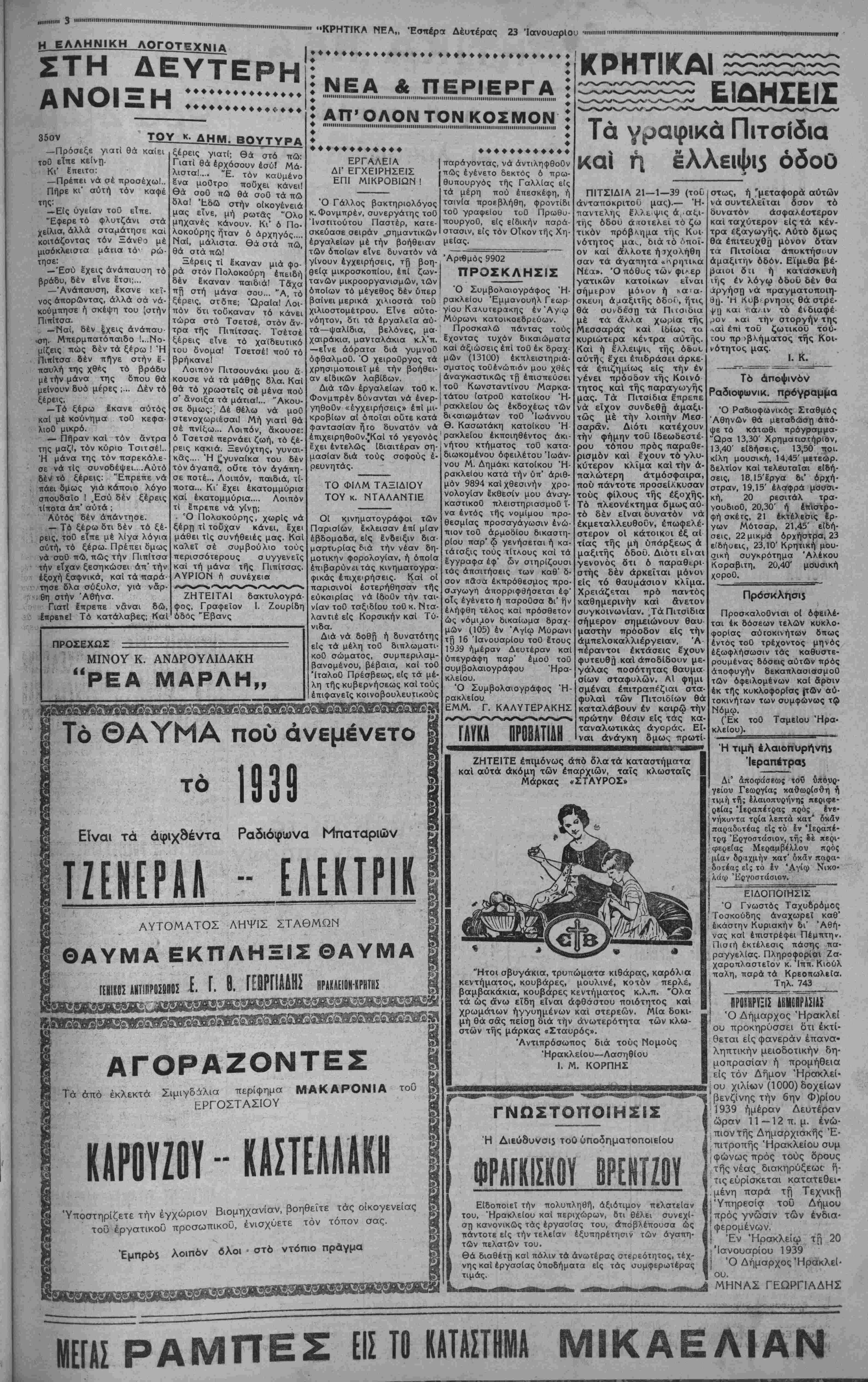 λένθια έβομβαρδίσθη δύο φοράς χθες ύπό ? λωσεν αϊ διαπραγματεύσεις των δύο χ<], μοίρας έθνικώΤαεροπλάνων προερχομένων! ρων θά επαναληφθούν τόν έρχόμενον έκ Μαγιόρκας. Κατά τής πόλεως έρρίφθη-| μήνα- σαν πολλαί βόμβαι. Μέχρι της στιγμής α¬ γνοείται ό ακριβής αριθμός τών θυαάτων. Επίσης εντός τοΟ λιμένος εβλήθησαν δύο Ατμόπλοια Αγγλικής καί Γαλλικής "Ε¬ θνικότητος. ΑΟΧΑΓΘΣ ΒΙΤΜΑ1 ΔΙΟΡΙΣΕ ΡΕ ΒΠ ΦΡΑΓΚΙΣΚΟ Η ΪΠ08ΕΣΙΣ ΚΑΤΑΣΚΟΠΕΙΑΣ ΑΘΗΝΑΙ 23—1—39 (του ανταποκριτού μας).—Άγγέλλεται έκ Βερολίνου δτι 6 λοχαγός Βίτμαν, υπασπιστής τοΰ Χίτλερ, διωρίσθη Πρέσβυς τής Γερμανίας είς "Α γιον Φραγκισκον. Ό .Αμερικανικός τύπο< εκφράζει τήν Μχπληξιν καΐ τήν δυσφο ρίαν του διά τήν άποφασιν αυτήν, καθ1 δσον ό Βίτμαν θεωρείται αναμεμιγμένος είς τήν ΰπόθεσιν κατασκοπείας, ήτις ά· πησχόλησε πρό ολίγου καιροΰ τήν Άμε- ρικανικήν δικαιοσύνην και τήν άμερικα- νικήν δημοσίαν γνώμην. Αί ΣΥΝΟΜΙΑΙΑΙ ΒΕΛΙΓΡΑΔΙΟΥ ΑΘΗΝΑΙ 23—1—39 (τοΰ ανταποκριτού μας)— Τό Πρακτορεϊον «Ανατολής» άγ- γέλλει δτι έγιναν επίσημοι ανακοινώ¬ σεις, επί τών συνομιλιών τοΟ Βελιγρα¬ δίου, μεταξύ κόμητος Τσιάνο καΐ κ. Στο- γιαντίνοβιτς. Κατά τάς έν λόγω δηλώ¬ σεις κατεβλήθη προσπάθεια προς ατενω- τέραν συνεργασίαν τών δύο χωρών, προς στερέωσιν και παγίωσιν τής εΙρήνης. Ε¬ πίσης διεξήχθησαν συζητήσεις έπι τών οικονομικών σχέσεων τών δύο χωρών. ΗΙΤΑΛ ΝΑ ΠΟΑ Α ΠΑΝΤΟΤΕ ΕΤΟΙΜΗ [«ΈΔΑΦΙ ΤΗΣ ΑΘΗΝΑΙ 23—1—39 (του άνταποκριτοΰ μας).—Μεταδίδεται έκ Ρώμης, δτι ό κ. Μουσολίνι, έγκαινιάζων χθες τό θέατρον τής πόλεως Άργεντίνα, έξεφώνησε λόγον ■προς τους Ιταλούς άγρότας, εϋχαρι- στήσας αυτούς διά τήν συμβολην των είς τήν παραγωγήν τής χώρας/Ακολούθως δ κ. Μουσολίνι έπεξετάθη επί τής ευρωπαϊ¬ κής καταστάσεως, τονίσας δτι πάντοτε ή Ιταλία είναι έτοιμη δπως λάβη τά δ¬ πλα δια νά υπεράσπιση τά εδάφη* της. ¥ ΓΥΜΗΑίΙΑ ΓΑΛΛΙΚΟΥ ΣΤΟΛΟΥ ΑΘΗΝΑΙ 23—1—39 (του ανταποκριτού μας)— Κατά τηλεγραφήματα έκ Παρισί¬ ων ήρχισαν τά γυμνάσια τοΰ Γαλλικού Στόλου παρά τά ΰδατα τ_ΰ Μαρόκου, θά διαρκέσουν δέ μέχρι τής δης Φεβρου¬ αρίου. Επίσης ήρχισαν τά μεγάλα γυ¬ μνάσια τής Γαλλικής Αεροπορίας είς Άλγέριον. Ή κλήρωση τών ενόρκων τοϋΚακουργιοόικείου Ηρακλείου Κατά τήν γενομενην εΙςτόΐΝ. Λογιάδης, Δημ. Θ. Χαλ-|Γ. Βασιλείου, Ιωάννης Άλ Προποδικεΐον κλήρωσιν τών κιαδάκης, Νικ. Γ. Βογιατζά- _ Ξυδιανάκη:, Γείορ. Κ. Ίερωνυ Δημητριάδης, ΠΑΡΕΛΗΦΘΗΣΑΝ ΥΠίΙΓΑΑΑΙλΙ ΑΕΡΟΩΑΑΗλ ΠΑΡΑΓ Γ ΕΛΒΕΗΤΑ ΑΜΕΡΙΚΗΗ ΝΕΑ ΠΑΡΑΓΓΕΑΙΑ ένορκων, έκληρώθησαν οΐ κά¬ τωθι συμπολίται μας διά τάς συνεδριάσεις τοΰ Κακουργιο- δικείου Ηρακλείου κατά τόν μήνα Φεβρουάριον: Α'.ΔΩΔΕΚΑΗΜΕΡΟΝ Τακτικοί.— Γεωργός Κ. Καρούζος, Νικόλαος Ι. Μπαλ- χζάκης, Μύρων Ν. Παναγιω- τάκης, Εν» .γγελος Καρουζά- χης, Βασίλειο; Ε. Τζανάκης, Κωνσταντίνος Ε. Καριωτάκης, Θο)μάς Α. Φανουράκη:, Έμμ. Ν. Ρεγκινάκης, Στυλιανός Δ- Δημόΐΐουλος, Μιχαήλ Ν. Μαρ- νελάκης, Νικόλαος Ε. Κεφα- λογιάννης, 'Εμμ. Ι. Παπαδά- κη:, Ευάγγελος Κ. Χατζάκης, Γεώργιος Σ. Πετράκης, °Ιωάν. κης. Έμμ. Δ. Αριστείδης Ι. Δουκουμετζίδης, Ιωάννης Έμμ. Χριστοδουλά¬ κη^ Αναπληρωματικοί,— Νι¬ κόλαος Ι. ΠαντατοσάκηΓ, Αν¬ δρέας Α. Καστελλάκη:, Έμμ. Ν. Κακουδάκης, Ίωάκωβος Λιανάκη^, Γεώργιος Ι. Άδά- μης, Μιχ. Ββλισσαρίον, Παν. Γ. Ξενάκης, Έμμ. Ν. Μααμιβ- δάκης. θεοχάρη; Κ. Λιιρατζά- κη:, Μιχ. Κ. Τζουλάχη:, Β'. ΔΩΔΕΚΑΙΙΜΕΡΟΝ Τακτικοί.—Μωάν. Έ. Καλ- λιατάκης, Άρκίτοτέλιις Γ. Χαλκιαδάκη;, Γεώργ. Μ. Τσα- χάκης, Έμμ. Κ- Ξ «νβιΐκηΓ, Γεώργ. Κ. * ''ργαζ·ίχη-, Έμμ. μάχης, Νικ. Ε. Φραγκιουδάκη: Άνδρ. ■ Α. Σκορ
