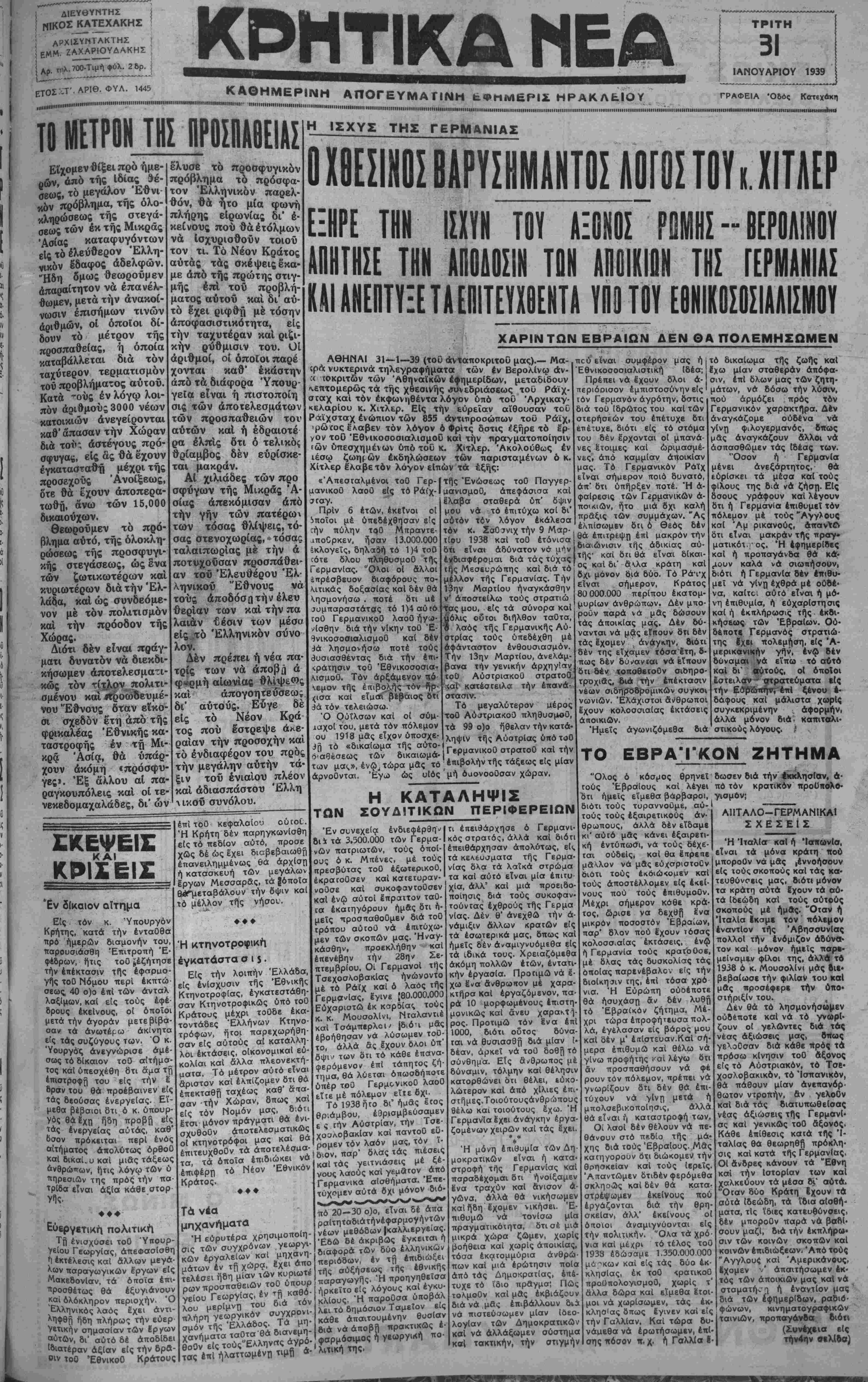 ΑΘΗΝΑΙ 31-1-39 (του |<*νταιΐοκρΐ^ μας).-·ας τηλεγραφουν οί έν Αον»ν» ξένοι άντσιοκριταί, ό χθεσινός λόγος^ Χίτλερ έχα,,ακτηρίσθη έκεΐ ώς με^Ρι% θης· ΟΙ "Αγγλικοί, Ιθύνοντες κύκλοι διαβλέπουν άπειλήν πολέμου, *κτό?-Λ*. η Ιταλία ήθελ-ν απειλήσει καθ" ο1^ ηοτε τρόπον %..ν Άγγλικήν Αύ&Φ* ρίαν, πι