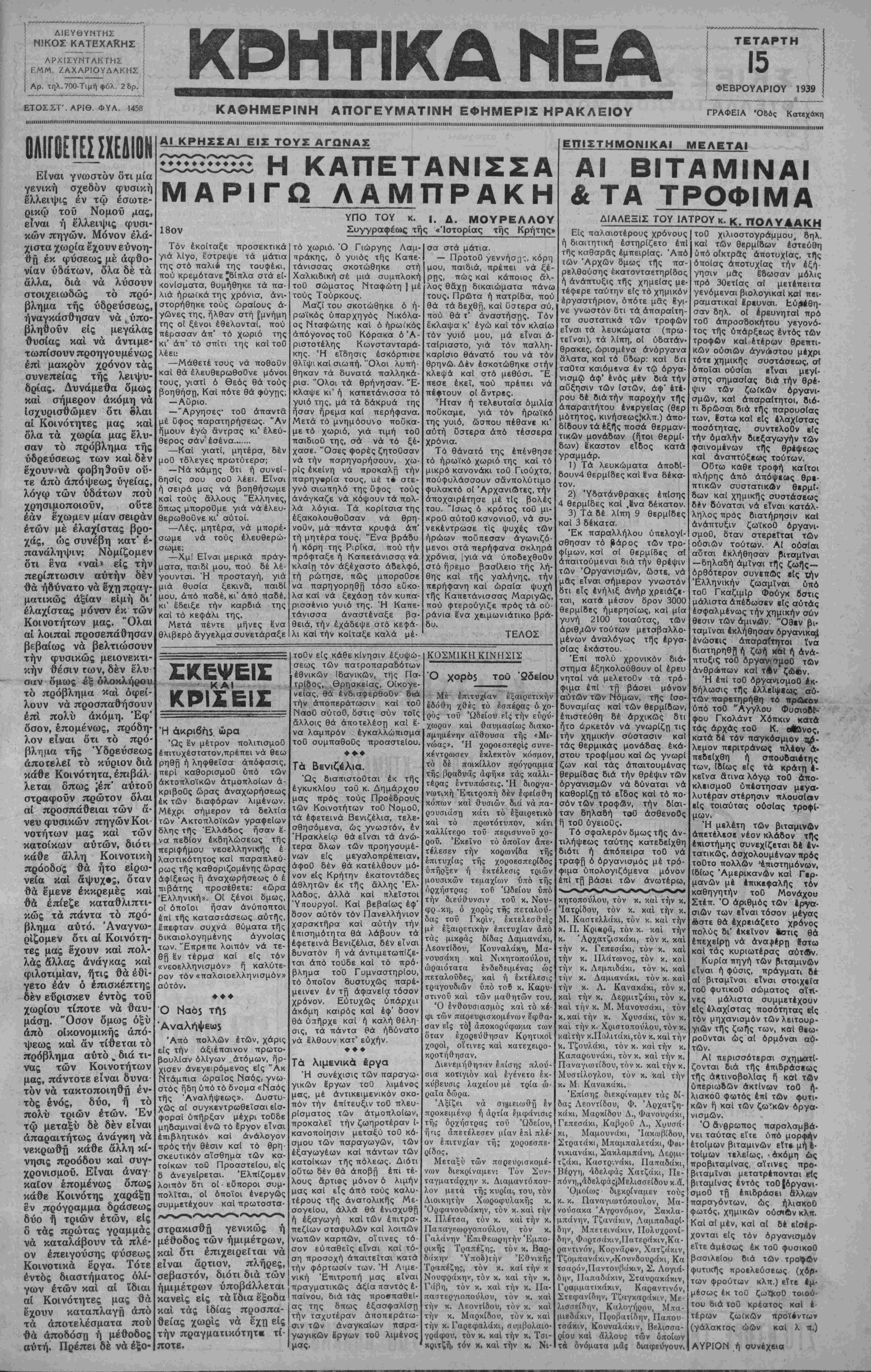 ■ ΙΙΙΙΜΚΙΙΙΙΙΙΙΙΙΙΙΙΙΐηΐΙΙΙΙΙΙΙΜΙΙΙΙΙΙΙΙ.....ΙΙΙΙΙ1ΙΙΙΙΙ1ΙΜΜΙ1ΙΙΙ1ΠΙΙΜΙΙΙΙ1ΙΙΙΙ1ΙΙΜΙΙΙΙΙΙΙΙΙΙΙΠ.....1ΙΙΙΙ1Ι1ΙΙΜΙΙ......ΙΙΙΙΙ.....1ΙΙΙΙΙΙΙΠΙΙΙΜΙΙΙΙ1ΙΜΙΙΙΙΙΙΙΙ..........ΙΙΙΙΙΙΙΗιΙΙΙΙΙΙΙ.....Ι<ϊΙΙΙΙΙ<ιΙ>1ΙΙ>1ΙΙΙΐΙΙΙΙΙΙΠΙΜ<Ι1.....ΙΙΙΚΙΙΙΙΙΙΙΙΙΜΙΙΙΙΙΜΙΙΙΙΙΙΙΙΙΙΙΙΙΙΙΙΙΙ.....ΙΙΙΙΙΙΙΙΙΙΙ0ΙΙΙΜΙΙΙΙΙΙΙΙΙΙΙΙΙΙΙΜΙΙ1ΙΙΙΙΙΙΙΙ1ΙΙΜΜΙΙΙΜΙΙ1ΙΙΙΙΙΙΙΙΙ1ΜΙΙΙΙΙΙΜΙΗΙΙΠ......ΠΙΙ1ΙΙ1ΙΙΜΙΙΜΙΚΙΙΙ1ΙΙΚ1Ι ΟΛΙΓΟΕΤΕΣ ΣΧΕΑΙΟΗ Είναι γνωστόν δτι μία γενική σχεδόν φυσική έλλειψις εν τφ έσωτε- ρικφ τοΰ Νομοΰ μας, είναι ή έλλειψις φυσι¬ κών πηγών. Μόνον ελά¬ χιστα χωρία έχουν εΰνοη- θη έκ φύσεως με άφθο- νίαν υδάτων, δλα δε τα άλλα, δια να λύσουν στοιχειωδώς το πρό¬ βλημα της υδρεύσεως, άθ ύ ΑΙ ΚΡΗΣΣΑΙ ΕΙΣ ΤΟΥΣ ΑΓΩΝΑΣ ♦♦♦♦♦♦♦♦♦♦♦♦ Η ΚΑΠΕΤΑΝΙΣΣΑ ΜΑΡΙΓΩ ΛΑΜΠΡΑΚΗ βημ η ήναγκάσθησαν να ^ύ βληθοΰν εις μεγάλας θυσίας και να αντιμε¬ τωπίσουν προηγουμένως επί μακρόν χρόνον τάς συνεπείας της λειψυ¬ δρίας. Δυνάμεθα δμως και σήμερον ακόμη να ίσχυρισθώμεν δτι ολαι αί Κοινότητες μας και δλα τα χωρία μας έλυ¬ σαν το πρόβλημα της υδρεύσεως των και δέν έχουν να φοβηθούν οΰ- τε άπό απόψεως υγείας, λόγω των υδάτων πού ΰ χρησιμοποιούν, έά έ ί οΰτε χ έάν έχωμεν μίαν σειράν ετών με έλαχίστας βρο- χάς, ώς συνέβη κατ' ε¬ πανάληψιν; Νόμίξομεν δτι ενα «ναι» είς τήν περίπτωσιν αυτήν δέν θα ήδύνατο να έχη πραγ- ματικώς άξίαν ειμή δι" έλαχίστας μόνον έκ των Κοινοτήτων μας. 'Όλαι αί λοιπαι προσεπάθησαν βεβαίως να βελτιώσουν τήν φυσικώς μειονεκτι- κήν θέσιν των, δέν έλυ σαν δμως «ξ ολοκλήρου το πρόβλημα και οφεί¬ λουν να προσπαθήσουν έπί πολύ ακόμη. Έφ' δσον, επομένως, πρόδη- λον είναι δτι το πρό¬ βλημα της Υδρεύσεως αποτελεί το κύριον δια κάθε Κοινότητα, έπιβάλ λεται δπως ;έπ" αύτοΰ 18ον Τόν έκοίταξε προσεκτικά γιά λίγο, έστρεψε τά μάτια της στο παλιέ της τουφέκι, πού κρεμότανε ^δίπλα στά ει¬ κονίσματα, θυμήθηκε τά πα¬ λιά ηρωικά της χρόνια, ανι¬ στορήθηκε τους ωραίους ά· ώνες της, ήλθαν στή [μνήμη ης οί ξένοι έθελονταί, πού πέρασαν άπ' το χωριό της ι' άπ' το σπίτι της και τοΟ έεΐ: —Μάθετε τους νά ποθοΟν αι θά έλευθερωθοΟνε μόνοι ους, γιατί ό θεός θά τους οηθήση, Και πότε θά φύγης; — Αϋριο. —"Αργησες· τοΟ άπαντα μέ ϋφος παρατηρήσεως. "Αν ήμουν έγώ άντρας κι" ελεύ¬ θερος σάν' εσένα....... —Και γιατί, μητέρα, δέν μοΟ τδλεγες πρωτύτερα; — Νά κάμης δτι ή συνεί- ησίς σου σοΟ λέει. Είναι ή σειρά μας νά βοηθήσωμε αϊ τους άλλους "Ελληνες, πως μποροΟμε γιά νά ελευ¬ θερωθούνε κι* αυτοί. —Λές, μητέρα, νά μπορέ- σωμε νά τους έλευθερώ- σωμε; —Χμ! Είναι μερικά πράγ¬ ματα, παιδί μου, πού δέ λέ- γουνται. Ή προσταγή, γιά μιά θυσία ξεκινά, παιδί μου, άπό παδέ, κι" άπό παδέ, κι' έδειξε τήν καρδιά της αί τό κεφάλι της. Μετά πέντε μήνες θλιβερό άγγελμα συνετάραξε ΥΠΟ ΤΟΥ κ. |. Δ. ΜΟΥΡΕΛΛΟΥ Συγγραφέως της «Ιστορίας της Κρήτης» στραφούν πρώτον δλαι αί προσπάθειαι των ά¬ νευ φυσικών πηγών Κοι¬ νοτήτων μας και των κατοίκων αυτών, διότι κάθε άλλη Κοινοτική πρόοδος θά ήτο ειρω¬ νεία και άψυχ·ς, δ τα ν θά έμενε εκκρεμές και θά έπίεζε καταθλιπτι- κώς τά πάντα τό πρό¬ βλημα αυτό. Άναγνω- ρίζομεν δτι αί Κοινότη¬ τες μας έχουν και πολ- λάς Λλλας άνάγκας και φιλοτιμιαν, ήτις θά έθί- γετο έάν ό επισκέπτης δέν εΰρισκεν εντός τοΰ χωρίου τίποτε νά θαυ- μάσχι· "Οσον δμως όξύ άπό οίκονομικής από¬ ψεως και αν τίθεται τό πρόβλημα αυτό „ διά τι- νας τών Κοινοτήτων μας, πάντοτε είναι δυνα τόν νά τακτοποιηθη έν τός ενός, δύο, ή τό πολύ τριών ετών. Έν τφ μεταξύ δε δέν είναι απαραιτήτως ανάγκη νά