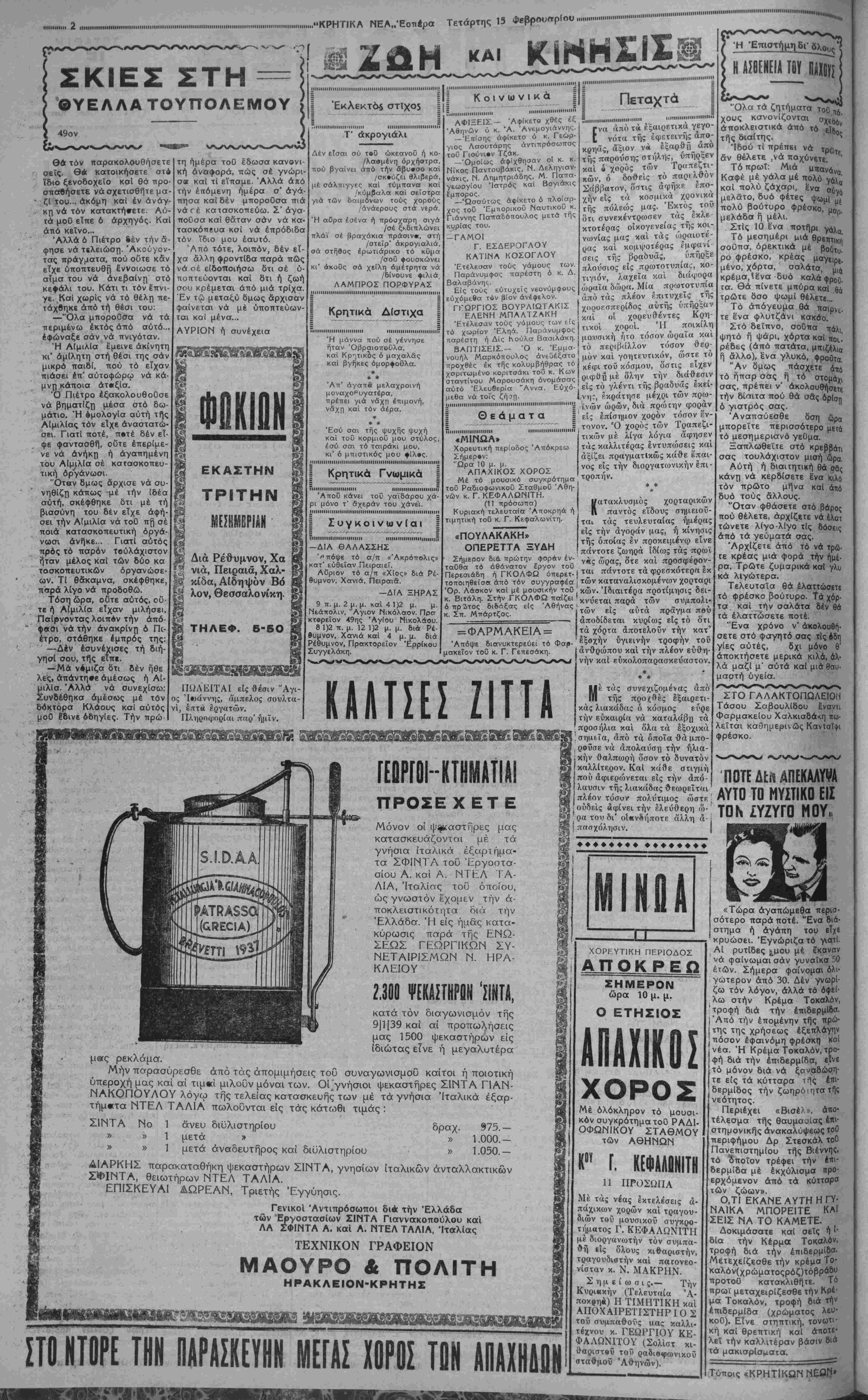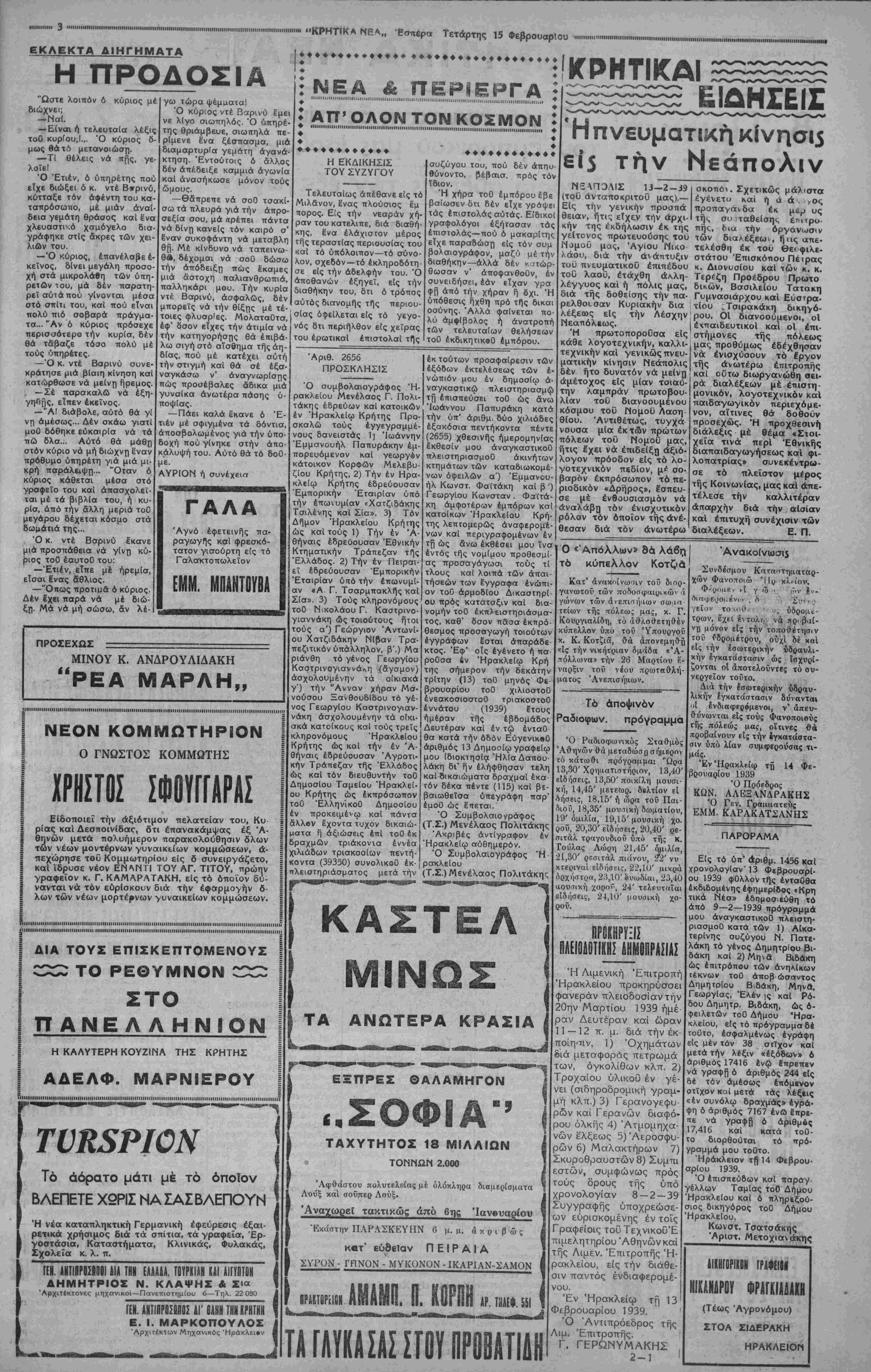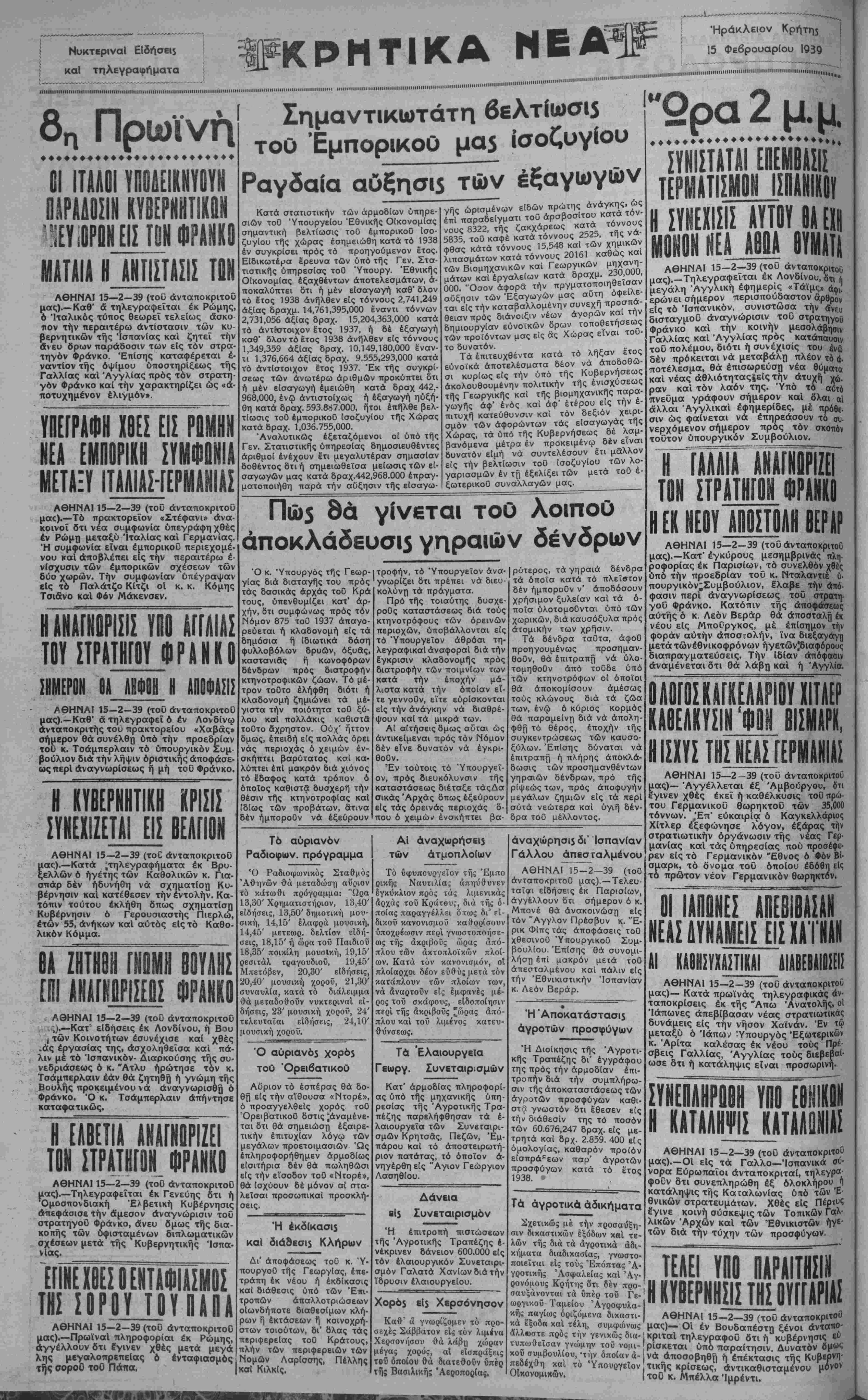 ΑΘΗΝΑΙ 15—2—39 (τοϋ ανταποκριτού