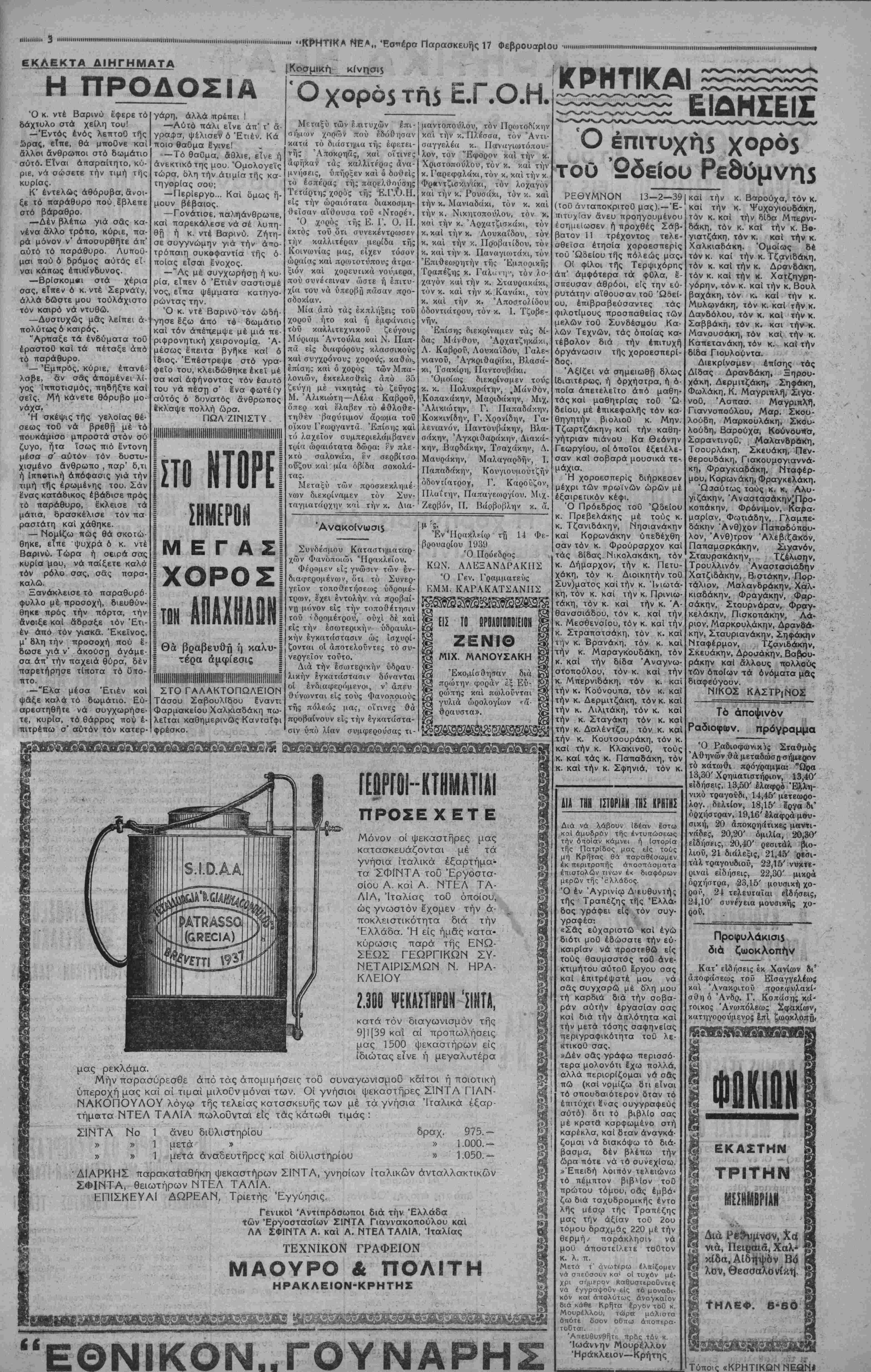 ΙΙ11ΙΙΙΙΙΙΙΙ1ΙΙΙΙΙΙ1ΙΙΙΠΙ1ΙΙΙΙΙΙΙΙΙΙ......ΙΙ1ΙΙΙΙΙΙΙΙΙΙΙ<ΙΙΙΙΙΙΙΙΙΙΙ(ΙΙΙΙΙΙΙΙΙΙΙΙ<ΙΙΙΙΙΙΙΙΙΙΙ1ΙΙΙΙΙΙΙΙΙ1ΙΙ1ΙΙΙ1ΙΙΙ1ΙΙΙΙΙΙΙΙΙΙΜΙΙΙΙΙ«ΙΙΙΙΙΙΙΙΙΙΙΠ«ΙΙΙΙΙ1ΙΙΙ1ΙΙΙΙΙΙΙΙΙΙΙΙΙΙΙΙΙΙΙ1ΙΙ>ΙΙΙΙΙΙΙΙ1ΙΙΙΙΙΙΙΙ1ΙΙΙΙΙ1.....·1ΙΙΙΙΙΙΙ)ΙΙ>ΙΙΙ>ΜΙΙΙΙΙΙΙΙΙΙΙΙΙΙΙΙΙΙ·ΙΙΙ1ΙΙΙ1ΙΙΙΙΙΙ!ΙΙΙΙΙΙΙΙΙΙΙΙΙΙΙ1ΙΙΙΙ1Ι11ΙΙΙΙΙΙΙΙΙΙ111Ι1|||1Ι|ΙΙ1Ι1ΙΙΙΙΙΙΙ1<ΙΙΙΙΙΙ<ΙΙΙΙΙΙΙΙΙΙΙΙΙΙ<ΙΙΙ||||||||1<|ΙΙ|||Ι|ΙΙΙΙΙ<ΙΙΙΙΙΙΜΙΙΙΙΙ1ΙΙΙΙΙΙΙ1ΙΙΙΙΙΙΙΙΙΙΙΙΠΙΙΙ 0■ΜΑ£ΚΕΑΑΟΣ Διά του ατμόπλοιου «Χίος», επανήλθε χθες &% Αθηνών, άναλαβών έκ νέου τά καθήκοντα του, 6 Νομάρχης Ηρα¬ κλείου κ. Ανδρέας Μάρ¬ κελλος, μεριμνήσας κα¬ τά τήν έν τη πρωτευού- ση παραμονήν του διά τά διάφορα προβλήμα¬ τα τοΰ Νομοϋ. Είναι ανέκφραστος και άπειρος ή χαρά τοϋ Λαοΰ τοΰ Νομοϋ Ηρα¬ κλείου, διότι έπαναβλέ- πβι έν τφ μέσψ αύτοϋ τήν σεβαστήν και προ- σφιλεστάτην μορφήν τοϋ κ. Μαρκέλλου. Διότι επί μίαν ήδη διετίαν υπήρξε 6 φύλαξ άγγελος τοΰ Νομοΰ αύ· τοΰ, ό πατρικός Άρχων, ό όποιος τον συνέτρε- ξε καΐ τον ενίσχυσε είς κάθε δημιουργικήν και ώραίαν προσπά- θειαν. Ό κ. Μάρκελλος θά παραμείνη διά τον τό πον αυτόν μία αλη¬ σμόνητος περίοδος δημιουργίας και πολιτισμού, μία πε¬ ρίοδος, ή οποία θά έ μ π ν ε ύ η και θά ζ ω ο γ ο ν ή και θά δεικνύη τήν όδόν τών ωραιότερων πραγματοποιήσε- ων. Αυτός είναι ό λό¬ γος δι' δν ό λαός τοΰ Νομοΰ Ηρακλείου, ανε¬ ξαρτήτως Κοινωνικής ύποδιαιρέσως και έπαγ γελματικών ασχολιών, τόν περιβάλλει με τόσον θερμήν και είλικρινή ά- γάπην και τρέφει τά ζωηρότερα αίσθηματα ευγνωμοσύνης έναντι της έν τφ Νομφ διε τους δημιουργικής δρά¬ σεως του. Τά αίσθήμα- τα δε αυτά τοΰ Λαοΰ τοΰ Νομού Ηρακλείου είναι γνωστά είς τόν κ. Μάρκελλον και διετρα νώθησαν κατ' έπανά ληψιν κβτά τόν πλέον επιτυχή τρόπον διά τών αλλεπαλλήλων ψήφισμα των ευγνωμοσύνης, τά άποΐα κατά καιρούς τοϋ Κχουν έπιδοθή. Τά «Κρητικά Νέα» τοΰ άπβυθύνουν τά πλέον θερμά των συγχαρητήρια έπίτη αίσία επιστροφή του «αι τή άναλήψει έκ νέου τών καθηκόντων του. ΑΘΗΝΑΪΚΑ ΣΚΙΤΣΑ ΚΑΡΝΑΒΑΛΟΙ ΚΑΙ Σια Εί$ τό φόρτε τη$ή άποκρηάτικη κ(νησι$.—Οί τελευ- ΕΚΕΨΕΙΕ ΚΑΙ ΚΡΙΣΕΙΣ ♦ ♦ ♦ ♦ ♦ ♦ ♦ ♦ ♦ ♦ ♦ ♦ ♦ ♦ ♦ ταίοι χοροί.—Τά παράπονα τών καθυστερημένων. Τό 4ο καΐ τελευταίο σκίτσο της σειράς τών Άτιοκρηάτικων, γραμμένο άπό Αθηναίο συνάδελφο, 6ιά τά «Κρητικά Νέα» ΤΑΜΠΛΩ 3 [Ή κ. Κομψιάδου, νεόνυμ¬ φος, σύζυγος τοΟ κ. Γιώρ- ου Κομψιάδου, Αεργου έκ νενετης ετοιμάζεται γιά τόν χορό τών «άδιορίστων»[. —Γιώργοοο..... —Τζιτζίκα μου... —Δέν έφερε τό φόρεμα Ι μοδίστρααα... —Γιατί; —Μά φαίνεται, θάθελε ά λεπτά άπαντα μέ συστο¬ λή ή νέα. —Τά λεπταάα; .. ρωτάει εμφαντικά ό Γιώργος. Διατί; Μήπως της φάγαμε τίποτα;... —Λέει καλέ, δτι της χρω¬ στάμε τό νυφιάτικο... —Τό νυφιάτικο; Δέν πήρε ε"να πεντακοσάρικο;., —Μά ήθελε χίλιες.,. —Χίλιες;... Τι εΐπβς;... —Δέν τό είπα έγώ Γιώρ¬ γο... Εκείνη τό λέει... άπαν¬ τα μαζεμένη ή κακομοι- ροΟλα. —Τότε θά πάω έγώ... ά- πειλεΐ ό κ. Κομψιάδης... νά Ιδώ αν Εχη μοΟτρα νά μοΟ μιλήση... ΤΑΜΠΛΩ 4ον [Ό κ. Μερεμετιάδης, αρ¬ ραβωνιασμένος, ετοιμάζεται γιά νά πάη στό χορό της Λουλουδένιας ΆλυσσΙδας» τήν αρραβωνιαστικιά του.....] —ΈπΙ τέλους (κυττάζε- ται Γστόν καθρέπτη) είμαι μιά χαρά..... Σμόκιν —μή μοΟ άπτου. Λουστρίνια— καθρέ¬ φτης..... Πουκάμισο—άστρα¬ ψε καΐ βρόντησε.... (τρίβει τά χέρια του ευχαριστημέ¬ νος). Τά κατάφερα επί τέ· λουςΙ... θά εύχαριστηθη πο¬ λύ ή Νινέττα.... Τ" δνειρο της, ί|τσν νά πάη στό χορό τής «Λουλουδένιας Άλυσσί- δας».... "Ας πηγαίνω.... θά μέ περιμένη πώς και πώς.... (Χάριν οικονομίας απο¬ φεύγε