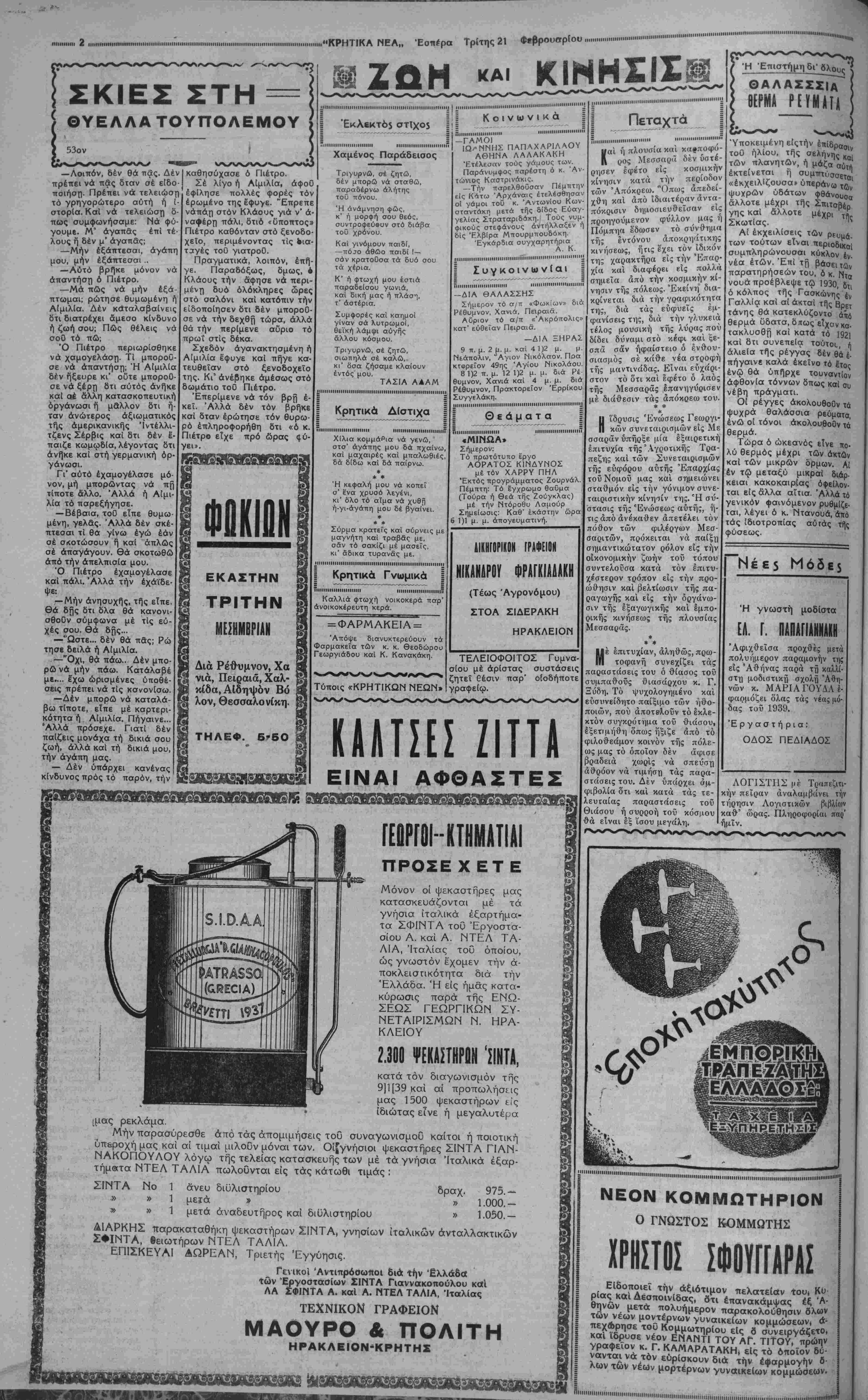 ομάδα τ<Ί5 Ε. Γ. Ο.Η. Ώς πληροφορούμεθα εις τι'ιν άφιχΰεΐσαν σήμερον εκ Πει¬ ώ δ Μνημόσυνον υπέρ τοΟ Πάπα ραιώς ομάδα Γυμναστικών Ηρακλείου, τής Ένώσεω; "Οργανώσεων παρετέθη χθες ΰ "Ολ ρη χς είς την Λέσχην τοΰ "Ολυμπια¬ κού γεύμα έκ μέρους τυϋ Δ. Συμβουλίου τοΰ ανωτέρου ΓΙει- ραίκοϋ Συλλόγου. πελλον τής "Ελλάδος μετα¬ ξύ τών ομάδων ΌλυμπιακοΟ Πειραιώς καϊ Ε. Γ. Ο. Ηρα¬ κλείου. Ό άγων έληξε υπέρ τής ομάδος τοΟ ΌλυμπιακοΟ διά τερμάτων 13-0. Σχετικώς έλάβομεν τό κάτωθι τηλεγρά φημα έκ μέρους τοΟ Προέ¬ δρου τής Ε. Γ. Ο. Η. «Όμάς άγωνισθεΐσα πρό λίμνης λάσπης υπό βροχήν έχασε δεκατρία». ΒΟΥΡΕΞΑΚΗΣ τοΟ Πάπα Πίου Είς τον ένταϋ&α ιερόν ναόν τον Αγίου 'Ιωάννου τών Κ«- θολίκών^ έτελέυίίη σήμερον τήν πρωίαν έπίσηιιον μνημό¬ συνον, επί της «ποδηαήσει είς Κυριοντης αΰτοϋ Άγιόοητος τοΰ Π(ίπο Πίου 11ου. Εις τό μνημόσυνον παρέστησαν αί το- πι_και άρχαί καί οί Πρόξενοι των ξένων κρατών. Εισαγωγή 10,000 τόννων κριδη$· Δι" αποφάσεως τών Ύπουρ γών Οικονομικών και Εθνι¬ κής Οικονομίας, ενεκρίθη ή εισαγωγή 10.000 τόννων κρι¬ θής, έπί πληρωμή τής άξιας αυτής δι' ελευθέρου συναλ¬ λάγματος. ίΤΕΦΑΝΟΙ Ε!Σ ΤΟ ΜΗΗΜΕΙΟΗ ΠίίΟΗΤΟΝ ΑΘΗΝΑΙ 21-2—39 (τοΰ άνταποκριΤοο [1(Χς),— Μεταδίδεται τηλεγραφικής έκ Βουκουρεστίου, δτι ήρχισαν χθες αί ίρ. γασίσι τοΰ μονίμου Συμβουλίου τών Χω. ρών τής Βαλκανικής Συνεννοήσεως. Πρό τής ενάρξεως τών εργασιών του Συμβου λίου οι αντιπρόσωποι "Ελλάδος κ. Ίωήν. νης Μεταξάς, Σερβίας κ. Μάρκοβιτς κ«ί Τουρκίας κ. Σαράφογλου μετέβησαν έν σώματι είς τό ηνημεΐον τών πεσόντων καί κατέθεσαν βαρύτιμον στέφανον. "ΤΪΣ ΣΥΚΑΜΤΙΙΣίΓ 0, Χ ΤΑΕΡ, ΜΟΥΣΟΛΙΝΙ ΕΠίΑίϊΙΧΒΗ ΠΛΗΡΗΣ ΗΝΕΡίΙΙΙί ΑΘΗΝΑΙ 21—2—39 (τοΰ ανταποκριτού μας).— Άγγέλλεται έκ Ρώμης, δτι τό «Πόπολο ντ' "Ιτάλια» αναγράφει τήν εϊ· δησιν, δτι προσεχώς είς μίαν Ίταλικήν πόλιν θά συναντηθούν οί κ. κ. Μουσο¬ λίνι, Φράνκο καί Χίτλερ, ϊνα καθορίσουν κοινήν πολιτικήν, έφ' δλων τών Εύρωπαϊ κών προβλημάτων. Πάντως έπιβεβαίωσις τής πληροφορίας αυτής έξ άλλης πηγής, δέν υπάρχει ακόμη. Ι ΚΑΤ ΙΟΝΗί ΓΑΛΛΙΚΐ ΕΤ ΣΣ Ι ΡΑΤΟΣ ΥΔΕ ΑΘΗΝΑΙ 21—2—39 (τοΰ ανταποκριτού μας)— Οί «Τάϊμς τής Νέας Υόρκης», είς εκτακτον έ'κδοσίν των σήμερον, ανήγγει¬ λαν τήν στρατιωτικήν κατάληψιν ύπό τής Γαλλίας τής οϋδετέρας ζώνης μεταξύ Τζιμπουτϊ καί "Ερυθραίας. Αί Άμερικσ· νικαί εφημερίδες χαιρετίζουν ενθουσιω¬ δώς τήν έγκαινιαζομένην άποφασιστικήν πολιτικήν τών Δυτικών Δημοκρατιών. Κ ΝΕΖΟΙΑΤΑϋΤΟΙ Ν ΥΠΟΥΡΓΟ Σ Ρ ΦΟΝΕΥ Κ ΪΕ 1ΣΕ0Σ ΣΑ II II Ιί ΑΘΗΝΑΙ 21—2—39 (τοΟ άνταποκριτοΟ μας).— Κατά τηλεγραφικός ανταποκρί¬ σεις έκ τής "Απω 'Ανατολήο, είκοσι Κινέ¬ ζοι άτακτοι, εϊσελθόντες αίφνιδιαστικώς είς τήν έν Σαγκάη οίκίαν του "Υπουργού Εξωτερικών τής σχηματισθείσης ύπό τών "Ιαπώνων τοπικής Κυβερνήσεως, έφόνευ- σαν αυτόν. ΟΒτος, ονόματι Τσέν—ΛοΟ, εθεωρείτο πρό πολλού δτι είχεν Ίαπω- νόφιλα αισθήματα. Ι' Τ ΓΪΊΠΓϋ ΡΙΣΚΑΙ Ι ΓΕϋ ΤΟ Α ΚΕΦ9Η ΑΘΗΝΑΙ 21-2-39 (τοΟ ανταποκριτού μας)— Κατά τηλεγραφικός πληροφορίας έκ τής "Αγγλικής πρωτευούσης, διαδίδε¬ ται ευρύτατα έκεΐ δτι περί τά τέλη τοϋ μηνός ή τάς αρχάς τοΰ Μαρτίου θάά- φιχθί) έκεΐ ϊνα διεξαγάγη συνομιλίας μετά τών "Αγγλων έπισήμω , ό "Υπουρ¬ γός Εξωτερικών τής Ίταλία^ κόμης Τσι¬ άνο. Πάντως ουδεμία πρόσκλησις τοΰ έ· γένετο έκ μέρους τής Μεγάλης Βρεττα¬ νίας, οϋτε είναι είσέτι απολύτως βέβο'- ον δτι θά τΐραγματοποιηθ3 ή επίσκεψις οΐύτή. ΑΘΗΝΑΙ 21—2—39 (τοΰ ανταποκριτού μας).— Διά τοΰ Ίταλικοΰ ύπερωκεανείοκ «Κόμης τής Σαβοΐα» αφίχθησαν χθες ένταΰθα προς έπί