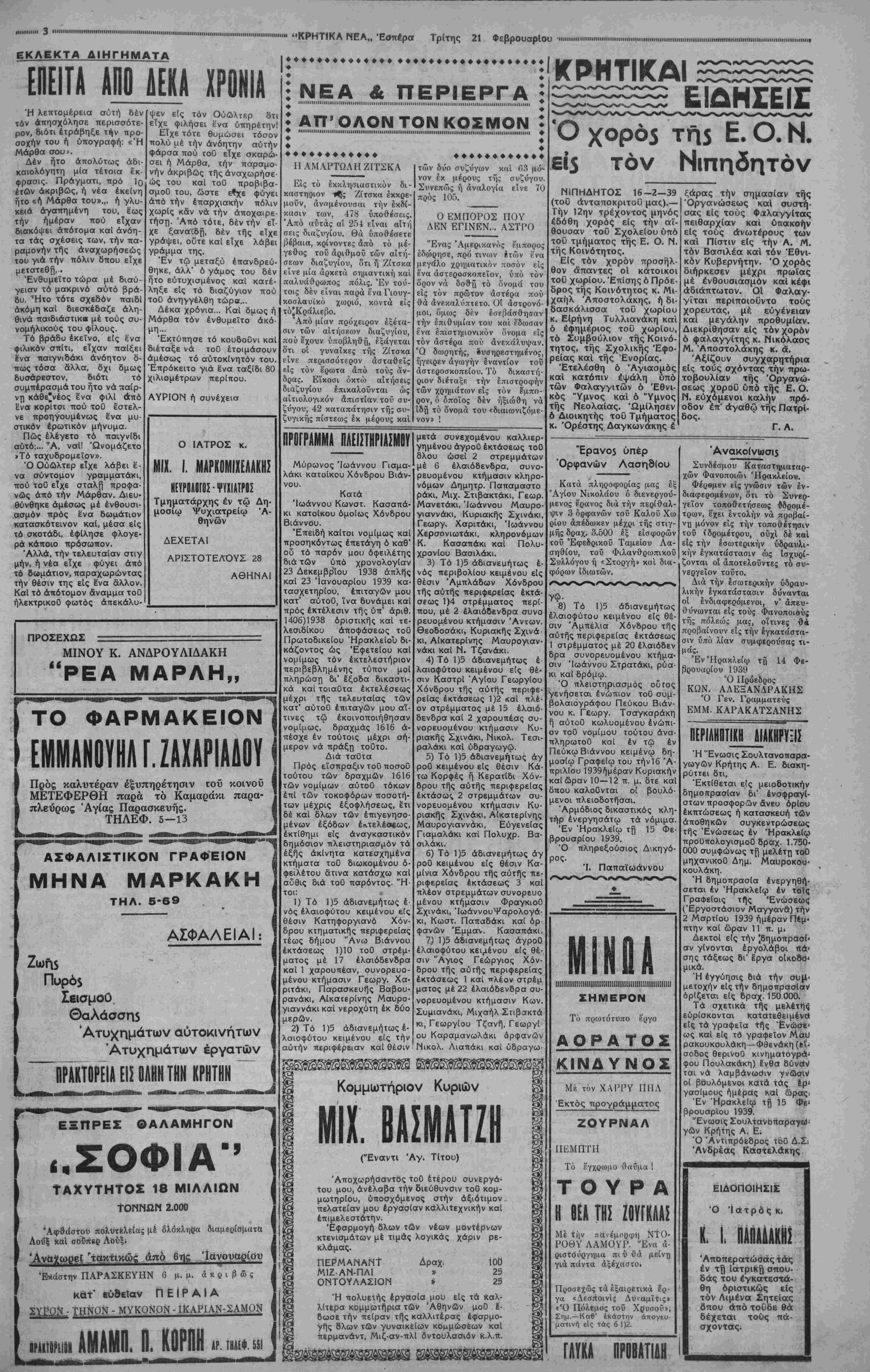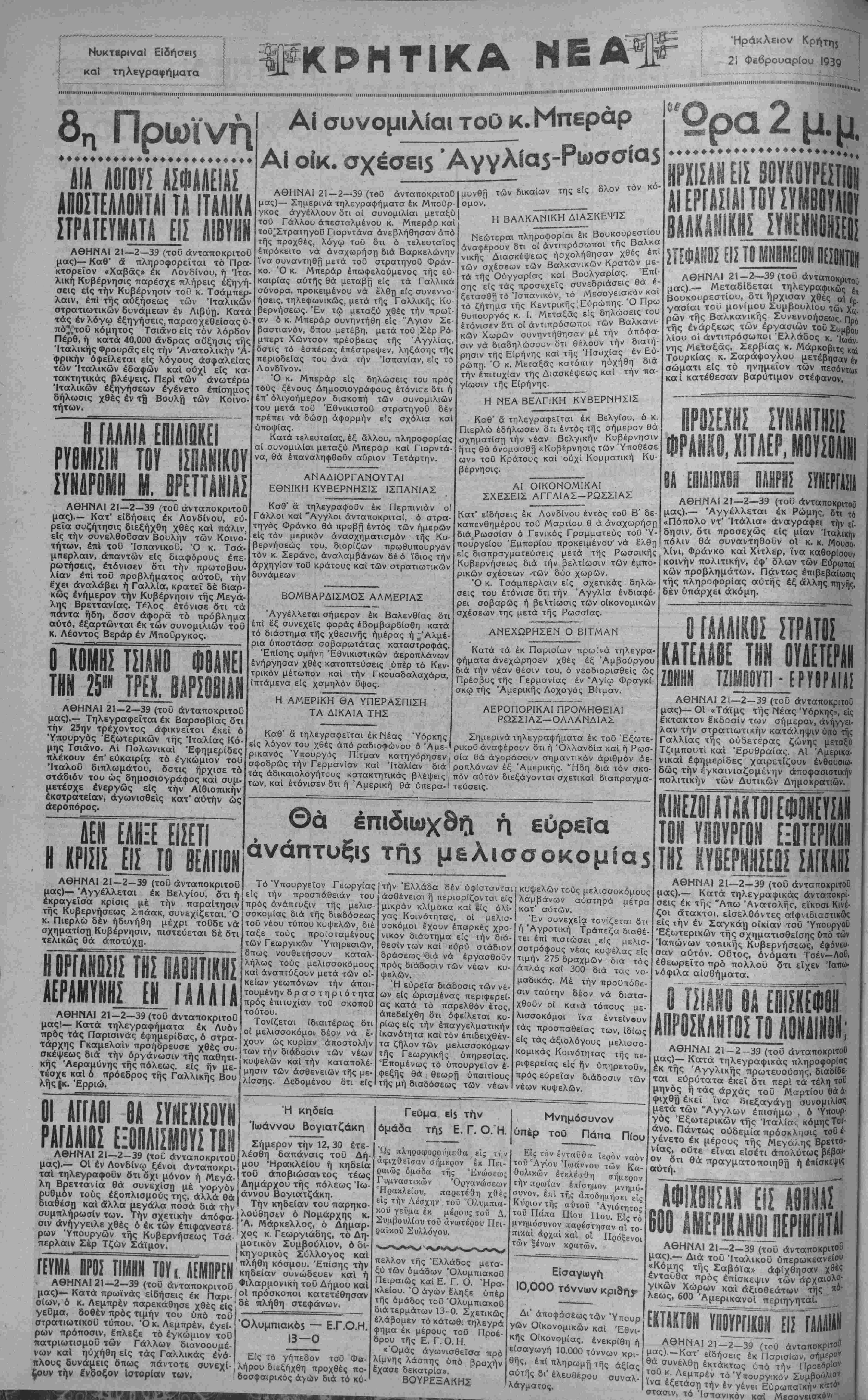 ΘΗΝΑΙ 21-2-39 (του ανταποκριτού, ^αρμονική