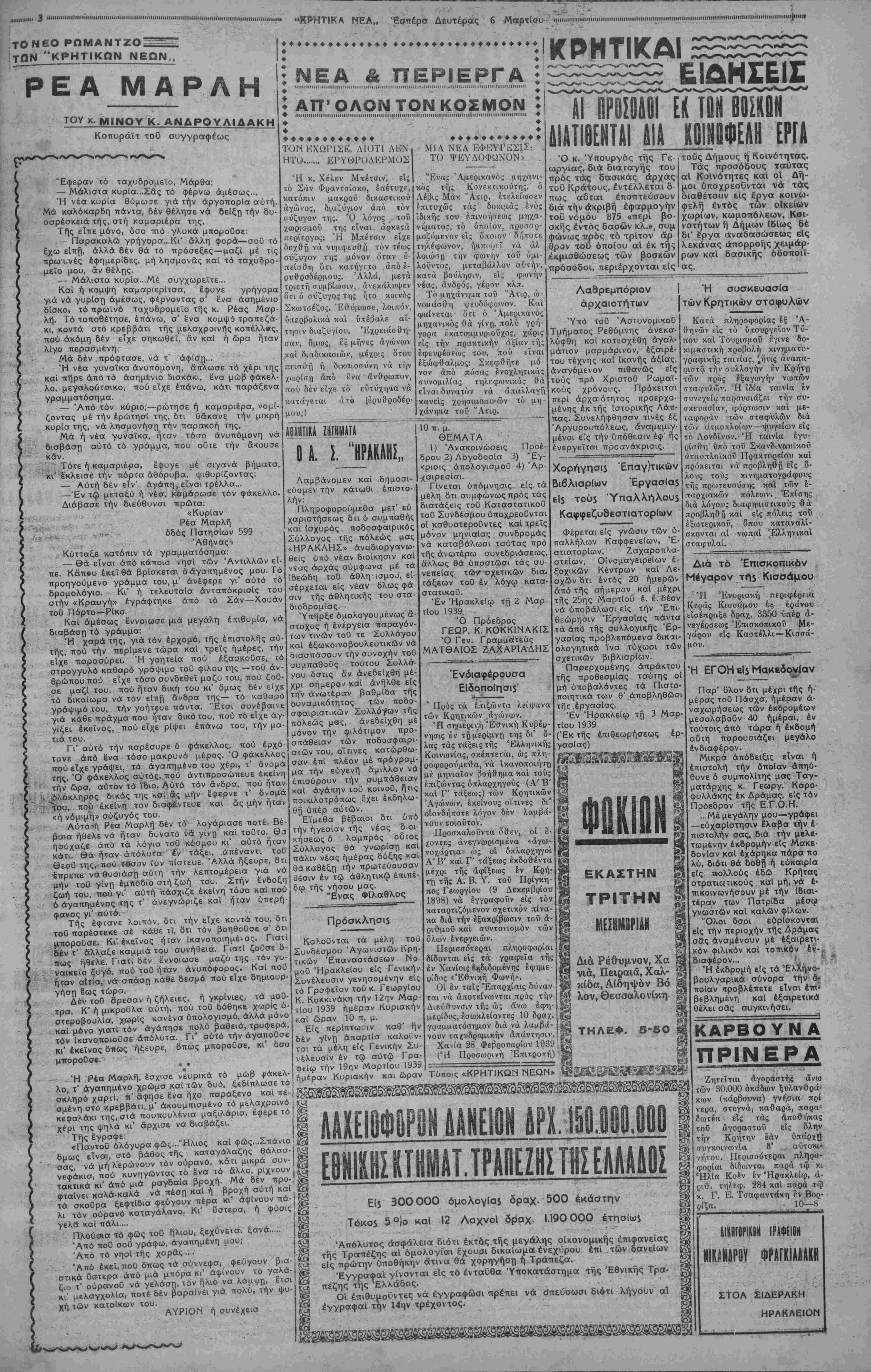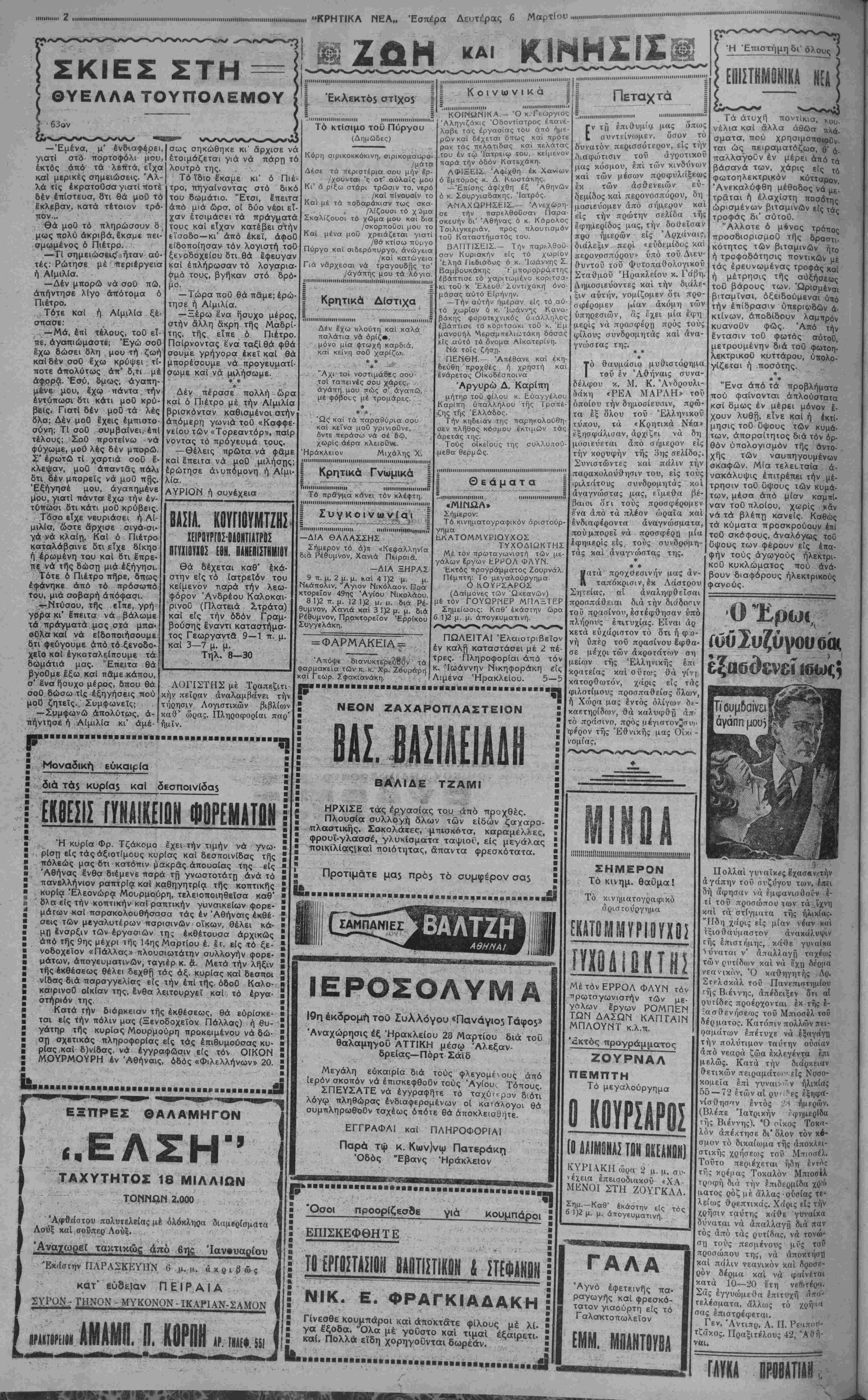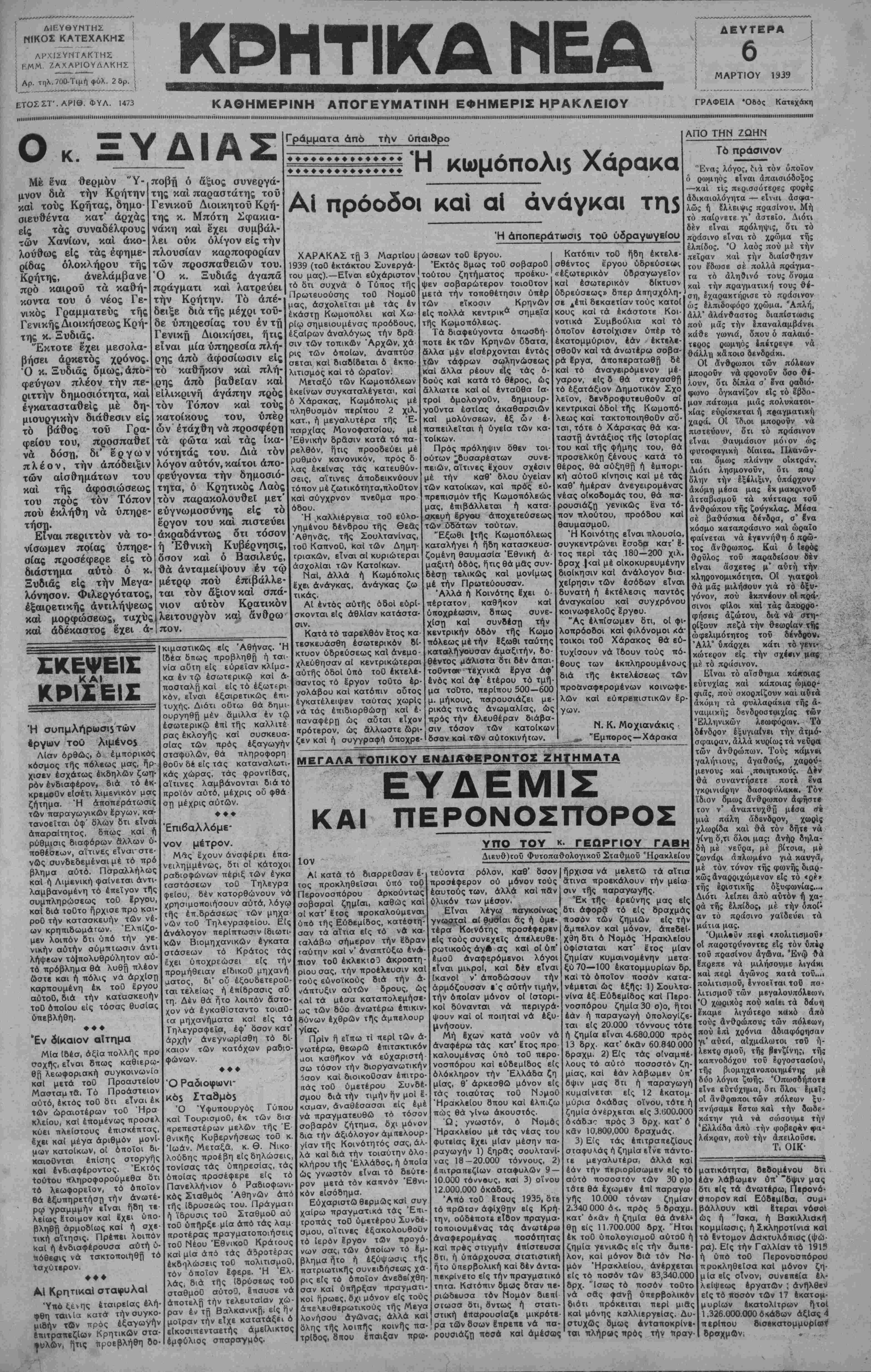 < ετοσστ.αριθ φυλ Η73 ΚΑΘΗΜΕΡΙΝΗ ΑΠΟΓΕΥΜΑΤΙΝΗ ΕΦΗΜΕΡΙΣ ΗΡΑΚΛΕΙΟΥ γραφειλ ·οβός |ΙΜΙΙΙΙΙΙΙΙΙΙΙΙΙΙΙΙΙΙΜΙΙΙΙΙΙΙΗΙΙΙΙΙΙ)ΙΙΙΙΙΙΙΙΙΙΙΙΙΙΙΙΙΙΙΙΙΙΙΙΙΙΙΙΙΙΙΙΙΙΙΙΙΙΙΙΙΙΙΙΙΙΙΙΙΙΙΙΙΙΙΙΙΙΙΙΙΙΙΙΙΙΙΙΙΙΙΙΙΙΙΙΙΙΙΙΙΙΙΙΙΙΙΗΙΙΙΙΙΙΙΙΙΙΙΙΙΜΙΙΙΙΙΙΙΙΙΙΙΙ1ΙΙΙΙΙΙΙΙΙΙΙΙΙΙΙΙ.....ΠΙΙΙΜΙΙΙΙΙΙΙΗΝ1ΙΝΙΙΙΙΠΙΙΙΙΙ»ΠΠ1ΙΗΙΝΙΙΙΙΗΙ(ΙΙΙΙίΙιΙΗΙΠΙΙΙΙΙΠΙΙΙΙΙΙΙΜΙΙΙΙΙΙΙΙΙΙΙΙΠΙΙΙΙΙΙΙΙΗΙΙΙΙΙΙΙΙΙΠΠΙΙΙΙΙΙΙΙΙΠΙΙΙΙΙΙΙΗ1ΙΙΙΙΙΙΙΙΙΙΙΙΙΗΙΙΙΙΠ1Ι1ΙΙΙΙΙΙ1ΙΙΙΙΙΙΙΙΙΙΙΙΙΙΙΙΙΙΙΙΙΙΙΜΙΙΙΙ(ΙΙΙΙΙΙΙΙΙΙΙΙΙΙΙΙΙΙΙ|ΙΐηΐΙΙΙΙΙΙ Ο κ ΞΥΔΙΑΣ Μέ ένα Φβρμόν "Υ- μνον δια την Κρήτηνι και τους Κρήτας, δημο- οιευθέντα κατ* αρχάς είς τάς συναδέλφους τών Χανίων, και ακο¬ λούθως είς τάς εφημε¬ ρίδας ολοκλήρου της Κρήτης, ανελάμβανε πρό καιροΰ τα καθή¬ κοντα του ό νέος Γε¬ νικός Γραμματεύς της Γενικής Διοικήσεως Κρή¬ της κ. Ξυδιάς. Έκτοτε έχει μεσολα¬ βήσει αρκετός χρόνος. Ό κ. Ξυδιάς όμως, άπο φεύγων πλέον τήν πε ριττήν δημοσιότητα, και εγκατασταθείς με δη- μιουργικήν διάθεσιν είς τό βάθος τοΰ Γρα¬ φείου του, προσπαθεί να δόση, δι' έργων πλέον, τήν άπόδειξιν των αισθημάτων του και της άφοσιώσεως του προς τον Τόπον πού εκλήθη να ύπηρε- τήσχι· Είναι περιττόν να το- νίσωμεν ποίας υπηρε¬ σίας προσέφερε εις τό διάστημα αυτό ό κ. Ξυδιάς είς τήν Μεγα¬ λόνησο ν. Φιλεργότατος, εξαιρετικής αντιλήψεως και μορφώσεως, ταχύς και αδέκαστος έχει ά- ποβή ό άξιος συνεργά¬ της και παραστάτης τοΰ Γενικοϋ Διοικητού Κρή¬ της κ. Μπότη Σφακια- νάκη και έχει συμβάλ¬ λει ούκ ολίγον είς τήν πλουσίαν καρποφορίαν των προσπαθειών του. Ό κ. Ξυδιάς αγαπά πράγματι και λατρεύει τήν Κρήτην. Τό Γράμματα άπό τήν ύπαιθρο ♦♦♦♦♦♦♦♦ ♦♦♦♦♦♦ κωμόπολη Χάρακα Α( πρόοδοι καί αϊ άνάγκαι τη$ Ή αποπεράτωση τοΰ υδραγωγείου ΧΑΡΑΚΑΣ τβ 3 Μαρτίου 1939 (τοΟ εκτάκτου Συνεργά- του μας).—Είναι εύχάριστον τό δτι συχνά 6 Τύπος τής δείξε δια της μέχρι τοΰ- δε υπηρεσίας του έν τη Γενική Διοικήσει, ήτις είναι μία υπηρεσία πλή¬ ρης άπο άφοσίωσιν είς τό καθήκον και πλή¬ ρης άπό βαθείαν και ειλικρινή άγάπην προς τον Τόπον καί τους κατοίκους του, υπέρ ων έτάχθη να προσφέρη ίκα- τόν λόγον αυτόν, καίτοι άπο- φεύγοντα τήν δημοσιό¬ τητα, ό Κρητικός Λαός τον παρακολουθεί μετ' ευγνωμοσύνης έργον του και '7 ~7 ι Πρωτευούσης τοΟ μας, ασχολείται μέ τά φώτα και τάς νότητάς του. Δια εκάστη Κωμοπόλει ΝομοΟ τάς έν και Χω- είς το πιστεύει άκραδάντως δτι τόσον ή Εθνική Κυβέρνησις, όσον και ό Βασιλεύς, θα ανταμείψουν έν τφ μέτρω πού επιβάλλε¬ ται τον άξιον καί σπά- νιον αυτόν Κρατικόν λειτουργόν και άνθρω πον. ρίφ σημειούμενος προόδους, έξαίρων αναλόγως τήν δρά σιν τών τοπικών Άρχων, χά ρις των οποίων, άναπτύσ σεται καί διαδίδεται ό εκπο¬ λιτισμός και τό ωραίο ν. Μεταξύ τών Κωμοπόλεων εκείνων συγκαταλέγεται, καί δ Χάρακας, Κωμόπολις μέ πληθυσμόν περίπου 2 χιλ. κατ., ή μεγαλύτερα τής "Ε¬ παρχίας Μονοφατσίου, μέ Έθνικήν δρδσιν κατά τό πα¬ ρελθόν, ήτις προοδεύει μέ ρυθμόν κανονικών, προς δ λας έκβίνας τάς κατευθύν¬ σεις, αϊτινες αποδεικνύουν τόπον μέ ζωτικότητα,πλοΟτον καί σύγχρνον πνεΟμα προ όδου. "Η καλλιέργεια τοΟ ευλο¬ γημένου δένδρου τής θεάς "Αθηνδς, τής Σουλτανίνας, τοΟ ΚαπνοΟ, καί των Δημη¬ τριακών, είναι αί κυριώτεραι άσχολίαι τών Κατοίκων. Ναι, αλλά Ιχει άνάγκας, τικάς. ή Κωμόπολις άνάγκας ζω ΕΚΕΨΕΙΕ ΚΑΙ ΚΡΙΣΕΙΣ Ή συπμλήρωσΐ5"Γών 6ργων του λ«μένο$ Λίαν ορθώς, ό εμπορικός κόσμος τής πόλεως μας, ή>