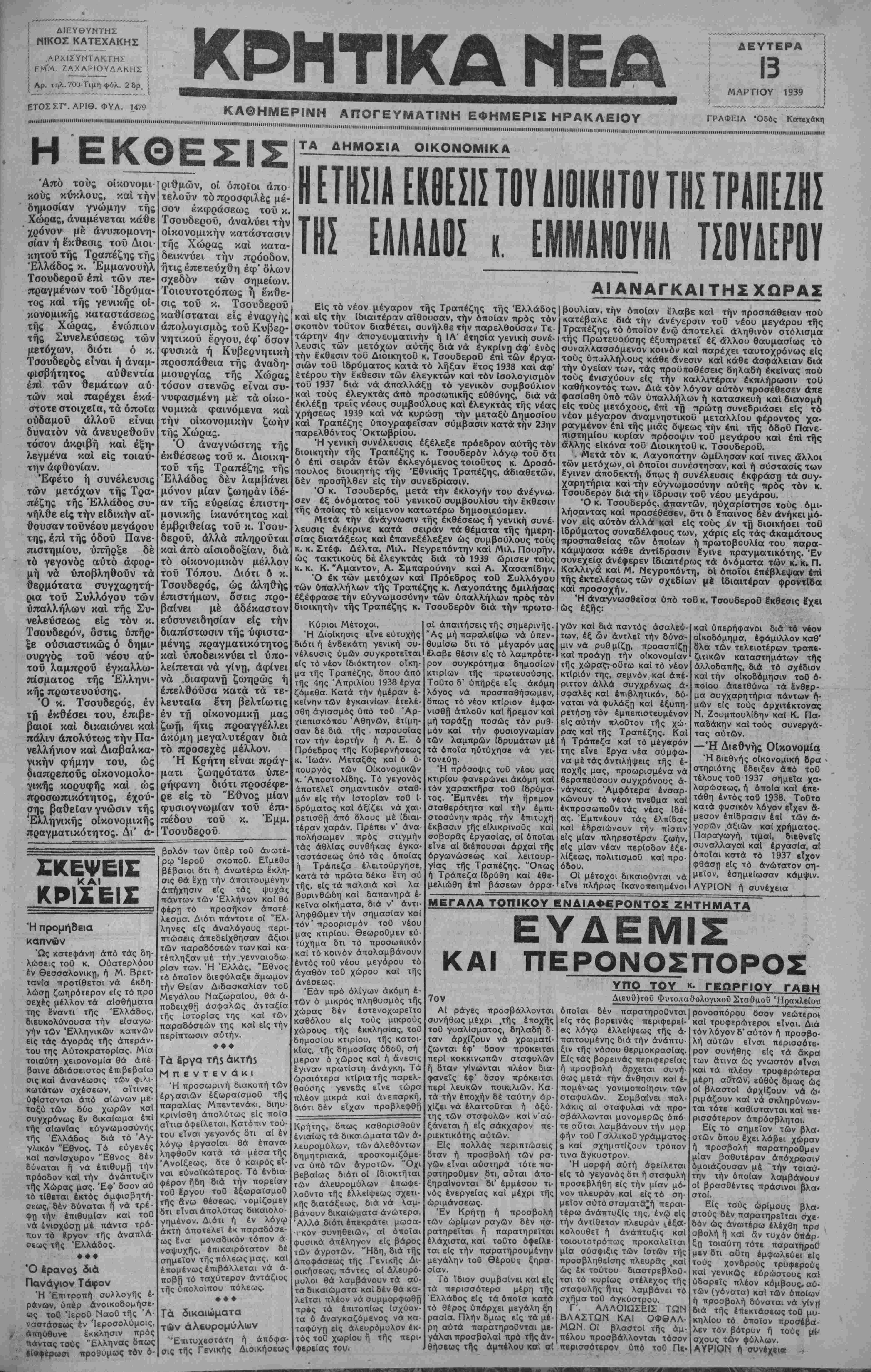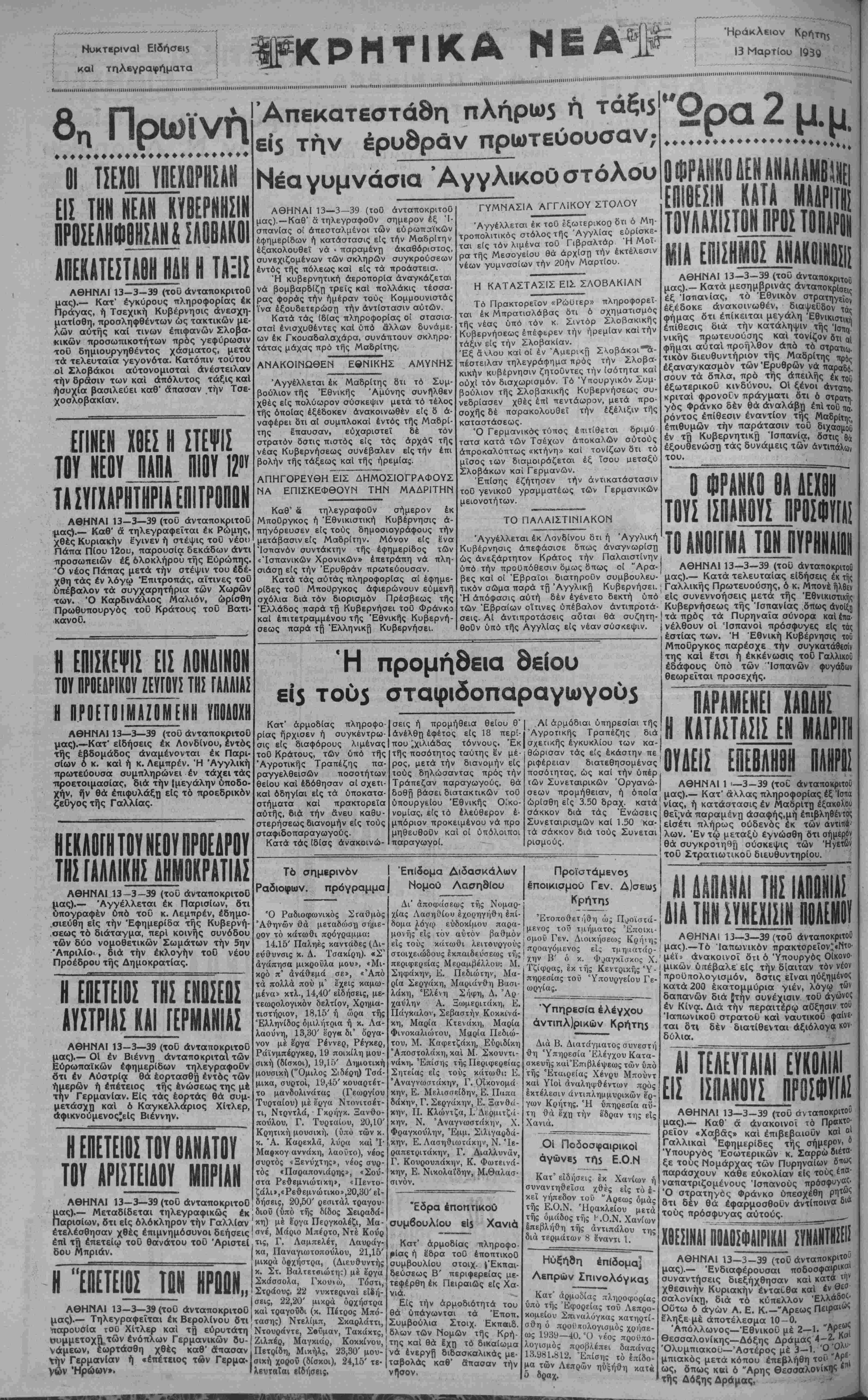 ΑΘΗΝΑΙ 13-3-39 (τοϋ άνταποκριτοϋ