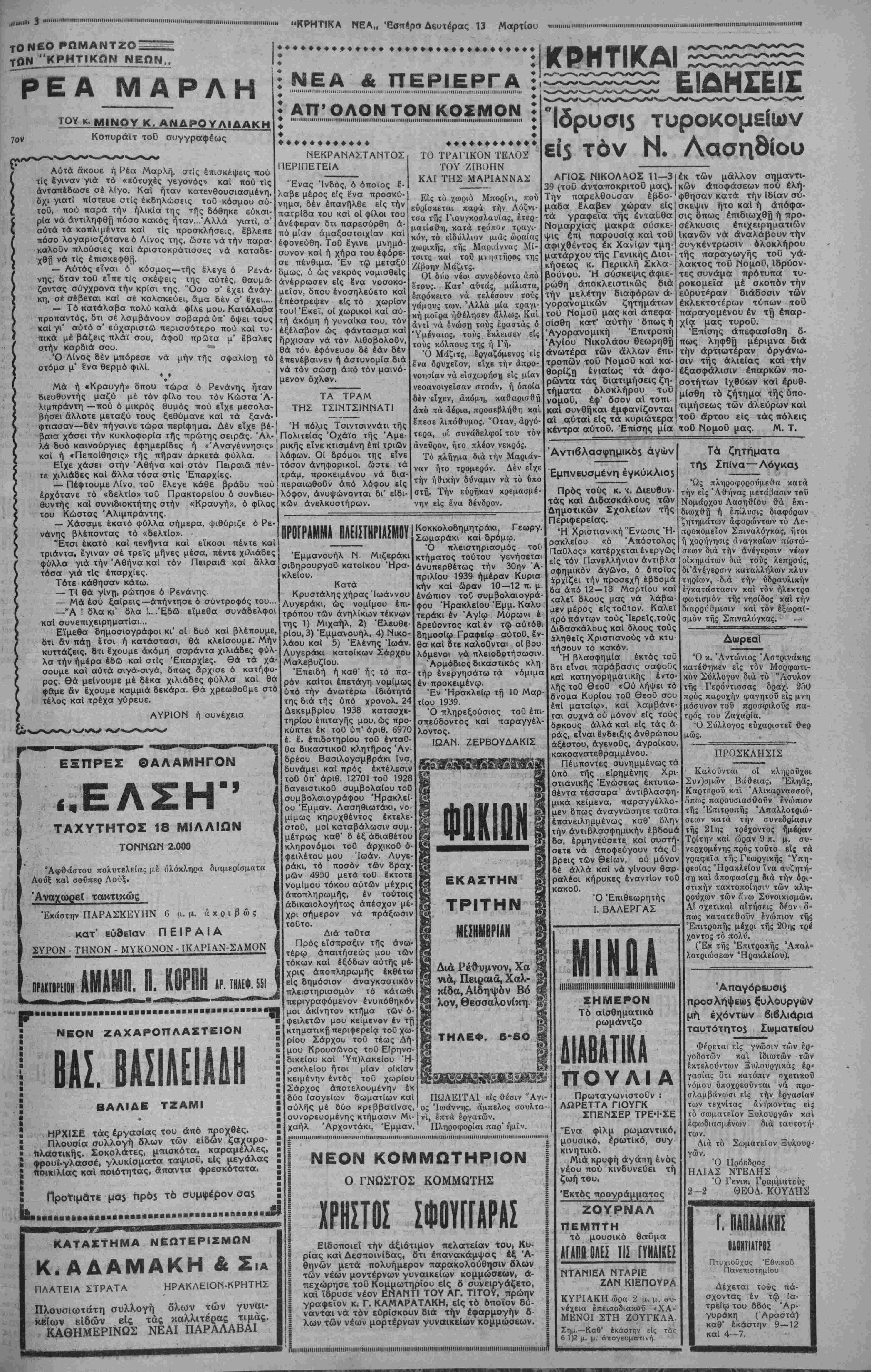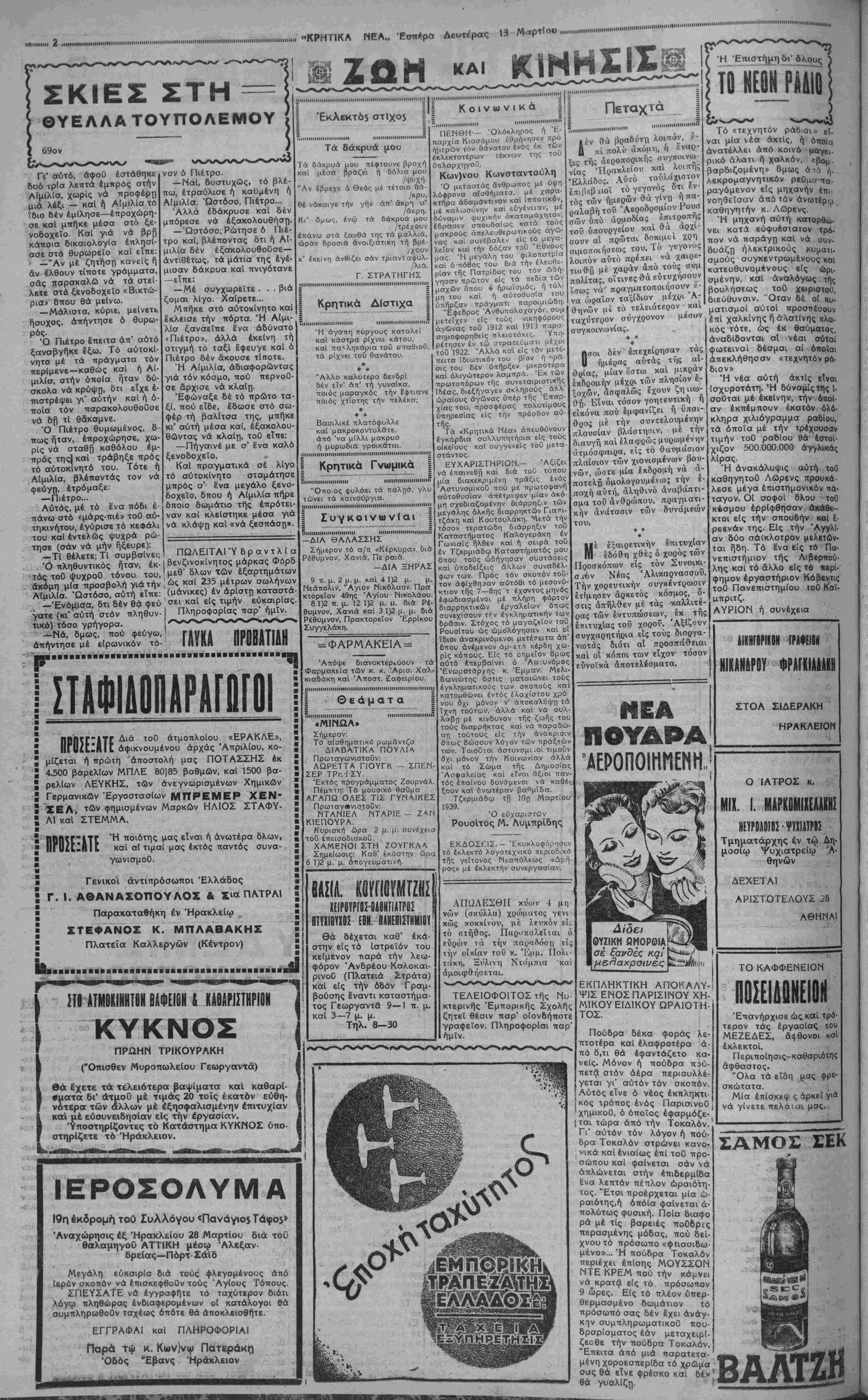 νικής πρωτευούσης και τονίξον <$τι α| φήμαι αύται προήλθον άπό τό στρα τικόν διευθυναήριον τής Μαδρίτης έξαναγκασμδν τών Ερυθρών νά παρα σουν τά όπλα, πρό τής απειλής £κ τοϋ εξωτερικού κινδύνου. ΟΙ ξένοι άνταπο. κριταΐ φρονοΓν πράγματι δτι ό στρατΛ γός Φράνκο δέν θά άναλάβη έπι τοΟ πα. ρόντος έπίθεσιν εναντίον τής Μαδρίτη έπιθυμών τήν παράτασιν του διχασμόο έν τη Κυβερνητική "Ισπανία, «στις θά εξουθένωση τάς δυνάμεις τών αντιπάλων του. ΟΦ ΤΟΥΣ ΙΣ ΤΟ ΑΝΚΟ ΟΑ Α ΙΑΝΟΥΣ ΠΡΟΣΦΥΓΑ! ΕΧΘΗ Η προμήθεια θείου σταφιδοπαραγωγού5 Κατ' αρμοδίας πληροφο-| ρίας ήρχισεν ή συγκέντρω-1 σις είς διαφόρους λιμένας | τοΟ Κράτους, τών ύπό τής Αγροτικής Τραπέζης πα- ραγγελθεισών ποσοτήτων θείου καί εδόθησαν αί σχετι- καί όδηγίαι είς τά υποκατα¬ στήματα καί πρακτορεία αυτής, 6ιά τήν άνευ καθυ¬ στερήσεως διανομήν είς τους σταφιδοπαραγωγούς. Κατά τάς ιδίας ανακοινώ¬ σεις ή προμήθεια θείου θ' άνέλθη εφέτος είς 18 περί¬ που ^χιλιάδας τόννους. Έκ τής ποσότητος ταύτης έν μέ¬ ρος, μετά τήν διανομήν είς τους δηλώσαντος προς τήν Τράπεζαν παραγωγούς, θά δοθί) βάσει διατακτικών τοΟ υπουργείου "Εθνικής Οικο¬ νομίας, είς τό ελεύθερον έ- μπόριον προκειμένου νά προ μηθευθοΟν καί οί υπόλοιποι παραγωγοί. Αί άρμόδιαι ύπηρεσίαι τής Αγροτικής Τραπέζης διά σχετικής εγκυκλίου των κα- θώρισαν τάς είς έκάστην πε ριφέρειαν διατεθησομένας ποσότητας, ώς και τήν υπέρ τών Συνεταιρικών "Οργανώ¬ σεων προμήθειαν, ή όποια ώρίσθη είς 3.50 δραχ. κατά σάκκον διά τάς "Ενώσεις Συνεταιρισμών καί 1.50 κα¬ τά σάκκον διά τους Συνεται ρισμούς. Τό σημερινών Ραβιοφων. πρόγραμμα Ό Ραδιοφωνικός Αθηνών θά μεταδώση σήμε¬ ρον τό κάτωθι πρόγραμμα: 14.15' Παληές καντάδες (Δι- εΰθυνσις κ. Δ. Τσακίρη). «2 αγάπησα μικρούλα μου», «Μι κρό π ανάθεμα σε», «Άπό τά πολλά πού μ1 έχεις καμω¬ μένα» κτλ., 14,40' ειδήσεις, με- τεωρολογικόν δελτίον, Χρημα- τιστήριον, 18,1δ' ή ώρα τής Έλληνίδος ομιλήτρια ή κ. Λα- λαοΰνη, 13,30' έργα δι' όργα¬ νον μέ εΌγα Ρέννερ, Ρέγκερ, Ράϊνμπέργκερ, 19 ποικίλη μου¬ σική (δίσκοι), 19,15' Δημοτική μουσική ("Ομιλος Σιδέρη) Τσά¬ μικα, συρτοί, 19,45' κουαρτέτ- το μανδολινάτας (Γεωργίου Τυρταίου) μέ έ'ργα Ντονιτσέτ- τι, Ντρντλά, Γκρήγκ. Ξανθο- ποΰλου, Γ. Τυρταίου, 20,10' Κρητική μουσική, (υπό τών κ. κ. Ά. Καρεκλά, λΰρα και Τ Μα$κογ αννάκη, λαούτο), νέος συρτός «Ξενύχτης», νέος συρ¬ τός «Παραπονιάρης», «Σού¬ στα Ρεθεμνιώτικη», «Πεντο- 'εΐ- ίήσεις, 20,50' ρεσιτάλ τράγου ', διοϋ (υπό τής δίδος 5ειραδά- 'κη) μέ Εργα Περγκολέζι, Μα- 'σνέ, Μάριο Μπέρτο, Ντε Κούρ , τις, Γ. Λαμπελέτ, Λαυράγ- κα, Παναγιωτοποΰλου, 21,15' μικρά ορχήστρα, (Διευθυντής κ. Στ. Βαλτετοιώτη:) με ϊίργα Σκάσσολα, Γκοιηώ, Τόστι, Στράους, 22 νυκτερινοί ειδή¬ σεις, 22,20' μικρά ορχήστρα καΐ τραγούδι (κ. Πέτρος Μπό¬ τασης) Ντελίμπ, Σκαρλάττι, Ντουράντε, Σβΰμαν, Τακάκτς, Ζιλπέρ, Μαγκιάρ, Κοκκίνου, Πετρίδη, Μικήλς, 23,30" μου¬ σική χοοοΰ (δίσκοι), 24,15' τε¬ λευταίοι βίδήσεις, Επίδομα Λιδασκάλων ΝομοΟ Λασηδίου Δι' αποφάσεως τής Νομαρ¬ χίας Λασηθίου έχορηγήθη επί¬ δομα λόγω εύδοκίμου παρα- μολής εις τόν αυτόν βαθμόν είς τους κάτωθι λειτουργούς στοιχειώδους εκπαιδεύσεως τής περιφερείας Μεραμβέλλου: Μ. Σηφάκην, Ε. Πεδιώΐην, Μα¬ ρία Σεργάκη, Μαριάνθη Βασι¬ λάκη, Ελένη Σηφη, Δ. 'Αρ χαΰλην Α. Ξωμεριτάκη, Ε Πάγκαλον, Σεβαστήν Κόκκινα· κη, Μαρία Κτειάχη, Μαρία Φινοκαλιώτου, Μαρία Πεδιώ- του, Μ. Καφετζάκη, Εύριδίκη Αποστολάκη, καί Μ. Σκουντι- νάκη. Επίσης τής Περιφερείας Σητείας είς τους κάτωθι: Ε. Άναγνωστάκην, Γ. Οικονομά κην, Ε. Μελισσείδ