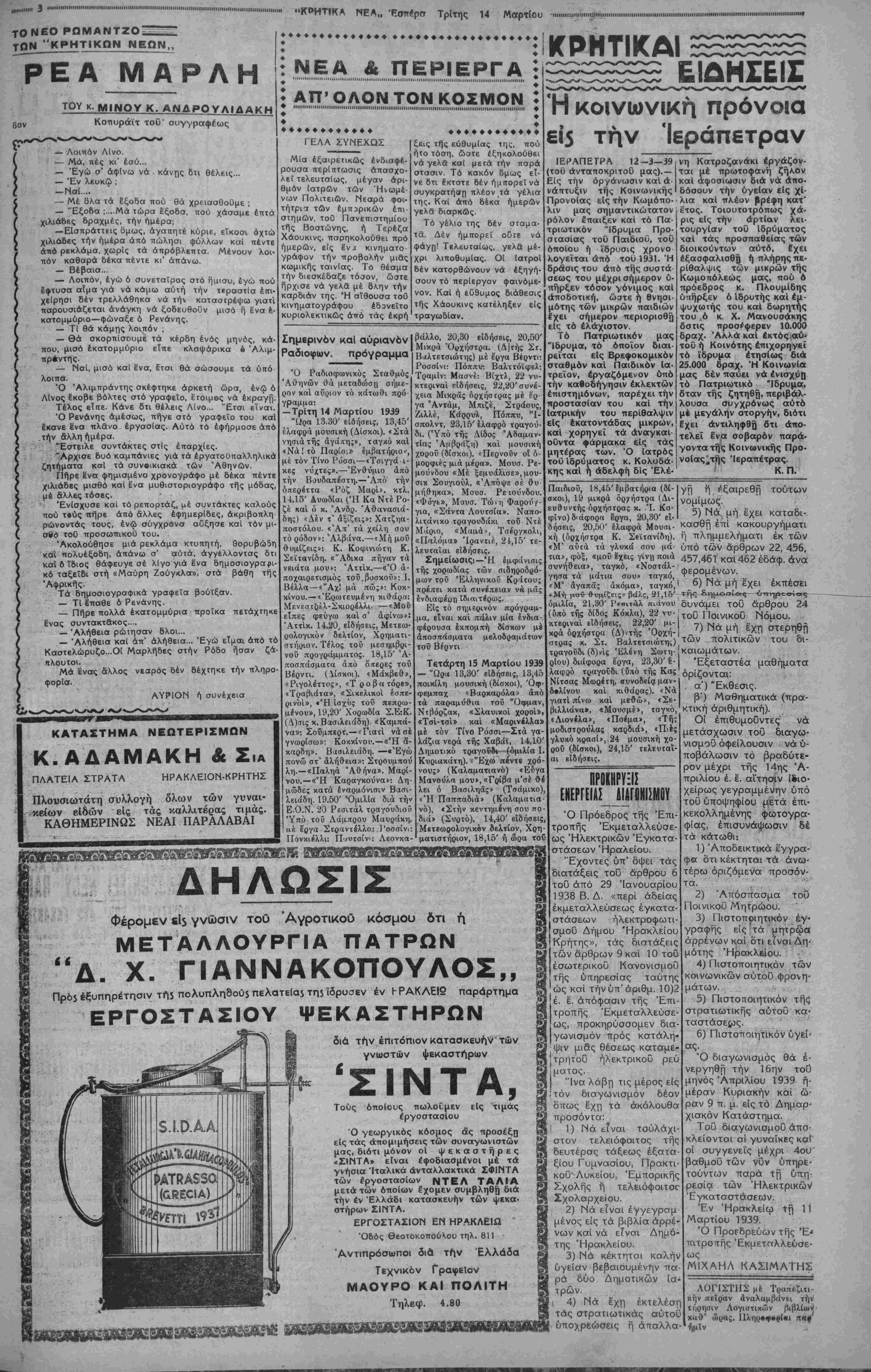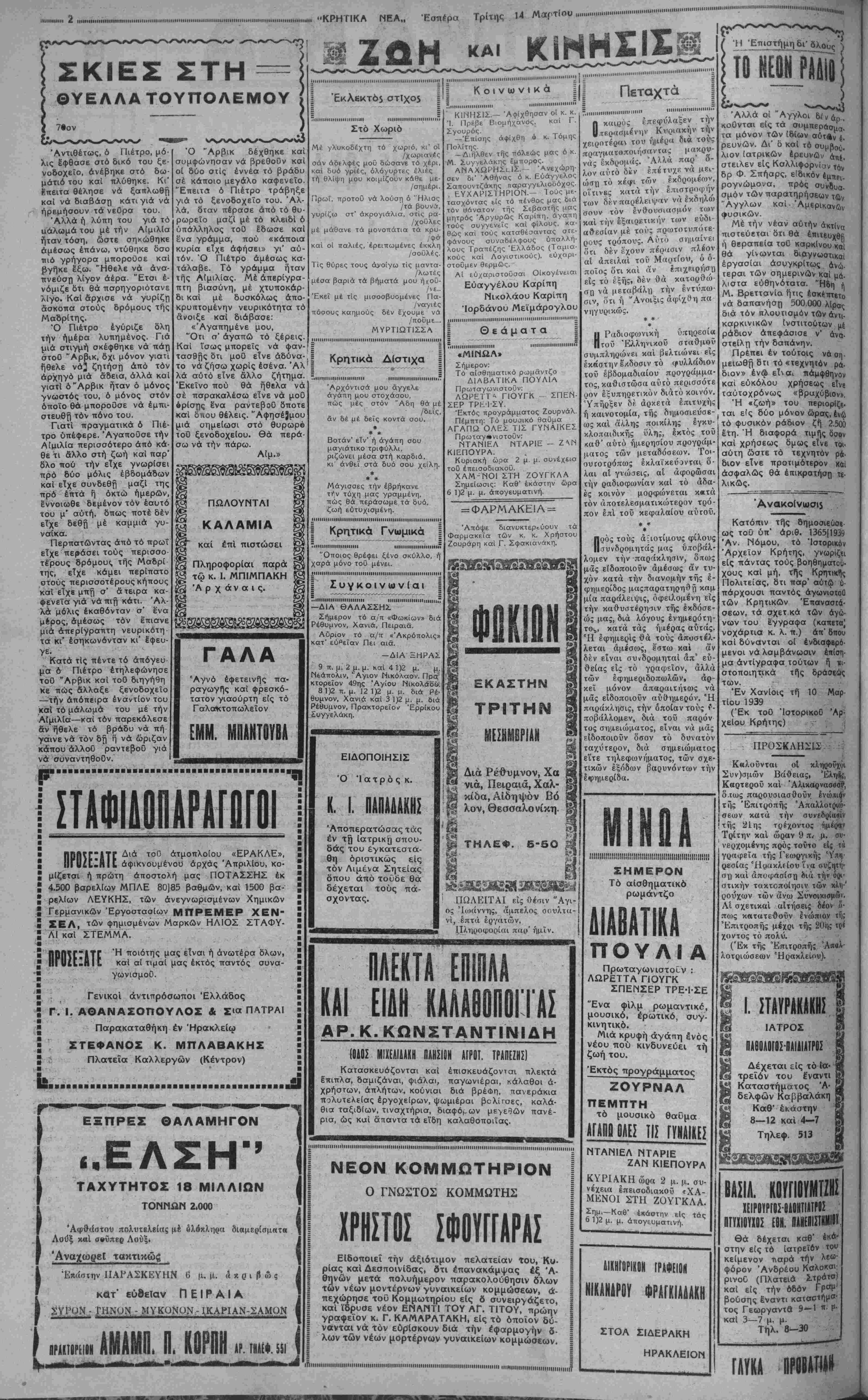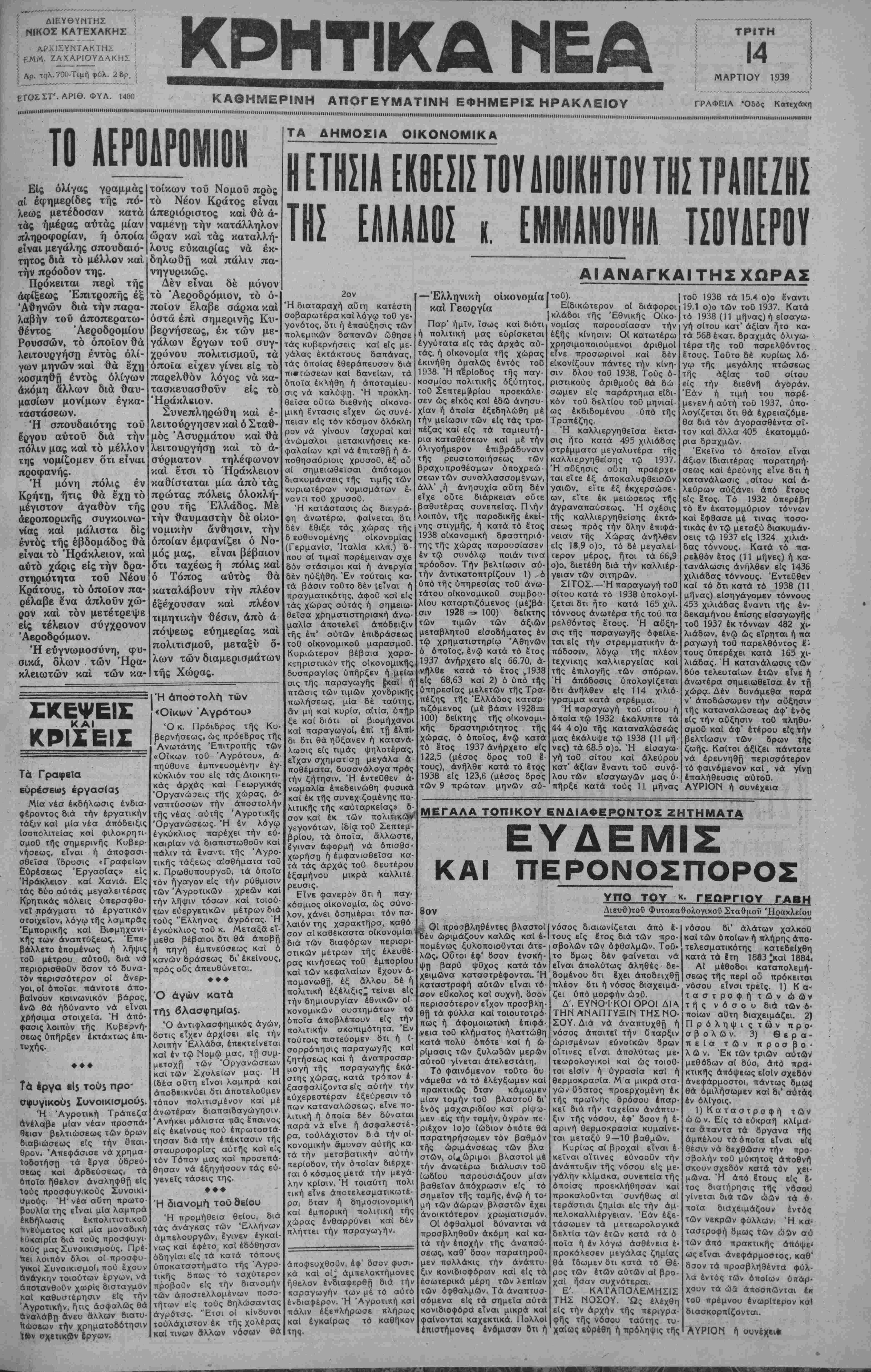 ΜΙΙΙΙΗΙΜΗΙΙΙΜΙΗ......Ι·ΙΙ·ΙΙΙΙ··Ι·.....··..■·..·..·..■,......<■·.,...........,..........„,„„„„„............,ΙΙ,,,,,,ιί,,......„„„„,„„......,.....„„„„,......,.....,„„„„„„„„ ΜΑΡΤΙΟΥ 1939 γραφεία ·ο5Δς κ«™Χ4κη »·...........■........■.........■...........................................................................,........................,........,.,..,,...............„..................,.....,„ ΤΟ ΕΙς ολίγας γραμμάς αί εφημερίδες της πό¬ λεως μετέδοσαν κατά τάς ημέρας αϋτάς μίαν πληροφορία ν, ή οποία είναι μεγάλης σπουδαιό- τητος δια το μέλλον και την πρόοδον της. Πρόκειται περί της άφίξεως Επιτροπής έξ Αθηνών δια την παρα- λαβήν τοΰ άποπερατω- ■θέντος Αεροδρομίου Ρούσσων, το οποίον θα λειτουργήση εντός ολί¬ γων μηνών και θα έχη κοσμηθή έντος ολίγων ακόμη άλλων δια θαυ¬ μάσιων μονίμων εγκα¬ ταστάσεων. Ή σπουδαιότης τοΰ έργου αύτοΰ διά την πόλιν μας και το μέλλον της νομίζομεν δτι είναι προφανής. Ή μόνη πόλις εν Κρήτη, ήτις θα εχη το μέγιστον αγαθόν τής αεροπορικής συγκοινω¬ νίας και μάλιστα δις εντός τής εβδομάδος θα είναι το Ήράκλειον, και αυτό χάρις είς την δρα¬ στηριότητα τοϋ Νέου Κράτους, τό όποιον πα¬ ρέλαβε ένα άπλοΰν χώ- ρον και τον μετέτρεψε εΙς τέλειο ν σύγχρονον Αεροδρόμιο ν. Ή ευγνωμοσύνη, φυ¬ σικά, όλων των Ήρα κλειωτών και των κα τοίκων τοΰ Νομοϋ προς τό Νέον Κράτος είναι απεριόριστος και θα α¬ ναμένη την κατάλληλον ώραν και τάς καταλλή¬ λους ευκαιρίας να έκ- δηλωθη και πάλιν πα¬ νηγυρικώς. Δεν είναι δε μόνον τό Άβροδρόμιον, τό ο¬ ποίον έλαβε σάρκα και οστά επί σημερινής Κυ¬ βερνήσεως, εκ των με¬ γάλων έργων τοΰ συγ¬ χρόνου πολιτισμού, τα όποια είχεν γίνει είς τό παρελθόν λόγος να κα¬ τασκευασθούν είς τό Ήράκλβιον. Συνεπληρώθη και έ- λειτούργησεν και ό Σταθ¬ μός "Ασυρμάτου και θα λειτουργήση καΐ τό ά- σύρματον τηλέφωνον και έτσι τό Ήράκλειον καθίσταται μία άπό τάς πρώτας πόλεις ολοκλή¬ ρου τής Ελλάδος. Με την θαυμαστήν δε οίκο- νομικήν άνθησιν, την οποίαν εμφανίζει ό Νο¬ μός μας, είναι βέβαιον δτι ταχέως ή πόλις και ό Τόπος αυτός θα καταλάβουν την πλέον έξέχουσαν και πλέον τιμητικήν θέσιν, άπό ά πόψεως ευημερίας και πολιτισμού, μεταξύ δ λων των διαμερισμάτων τής Χώρας. ΤΑ ΔΗΜΟΣΙΑ ΟΙΚΟΝΟΜΙΚΑ Η ΕΤΗΣΙΑ ΕΚΟΕΣΙΣ ΤΟΥ ΔΙΟΙΚΗΤΟΥ ΤΗΣ ΤΡΑΠΕΖΗΣ ΤΗΣ ΕΑΛΑΑΟΣ κ. ΕΜΜΑΝΟΥΗΛ ΤΣΟΥΔΕΡΟΥ ΑΙ ΑΝΑΓΚΑΙ ΤΗΣ ΧΩΡΑΣ ΣΚΕΨΕΙΣ ΚΑΙ ΚΡΙΣΕΙΣ Τά Γραφεία εύρέσεωχ έργασ(α$ Μία νέα έκδήλωσις ενδια¬ φέροντος διά τήν έργατικήν τάξιν καΐ μία νέα άπόδειξις Ισοπολιτείας κσί φιλοκρητι- σμοΟ τής σημερινές Κυβερ¬ νήσεως, είναι ή άποφασι- σθεϊσα ΐδρυσις «Γραφείων Ευρέσεως Εργασίας» ιίς Ήράκλειον καΐ Χανιά. ΕΙς τάς δύο αύτάς μεγαλειτέρας Κρητικάς πόλεις ύπερσφθο- νεΐ πράγματι τό έργατικόν Οτοιχεϊον, λόγω τής λαμπρας Εμπορικής καί Βιομηχανι¬ κής των αναπτύξεως. Έπε- βάλλετο επομένως ή λήψις τοΟ μέτρου αύτοΟ, διά νά περιορισθούν δσον τό δυνα¬ τόν περισσότερον οί άνερ¬ γοι, οΐ όποιοι πάντοτε απο¬ βαίνουν κοινωνικόν βάρος, Ινώ θά ήδύναντο νά είναι χρήσιμα στοιχεία. Ή άπό- φασις λοιπόν τής Κυβερνή¬ σεως ύπήρξεν εκτάκτως επι¬ τυχής. ♦ ♦♦ Τά Ιργα «Ι5 τού* προ- Οΐρυγικοϋ$ Συνοικισμοί^. Ή "Αγροτική Τράπεζα ανέλαβε μίαν νέαν προσπά- θειαν βελτιώσεως των δρων διαβιώσεως είς τήν δπα^- θρον. "Απεφάσισε νά χρημα¬ τοδότηση τά Εργα υδρεύ¬ σεως καΐ αρδεύσεως, τά δποΐα ήθελαν άναληφθη είς τους προσφυγικούς Συνοικι- Ιίμούςι Ή' νέα αϋτη πρωτο¬ βουλία της είναι μία λαμπρά έκδήλωσις έκπολιτιστικοΟ ■πνεύματος καΐ μία μοναδική Ιύκαιρία διά τους προσφυγι¬ κούς μας Συνοικισμούς. Πρέ¬ πει λοιπόν δλοι οί προ