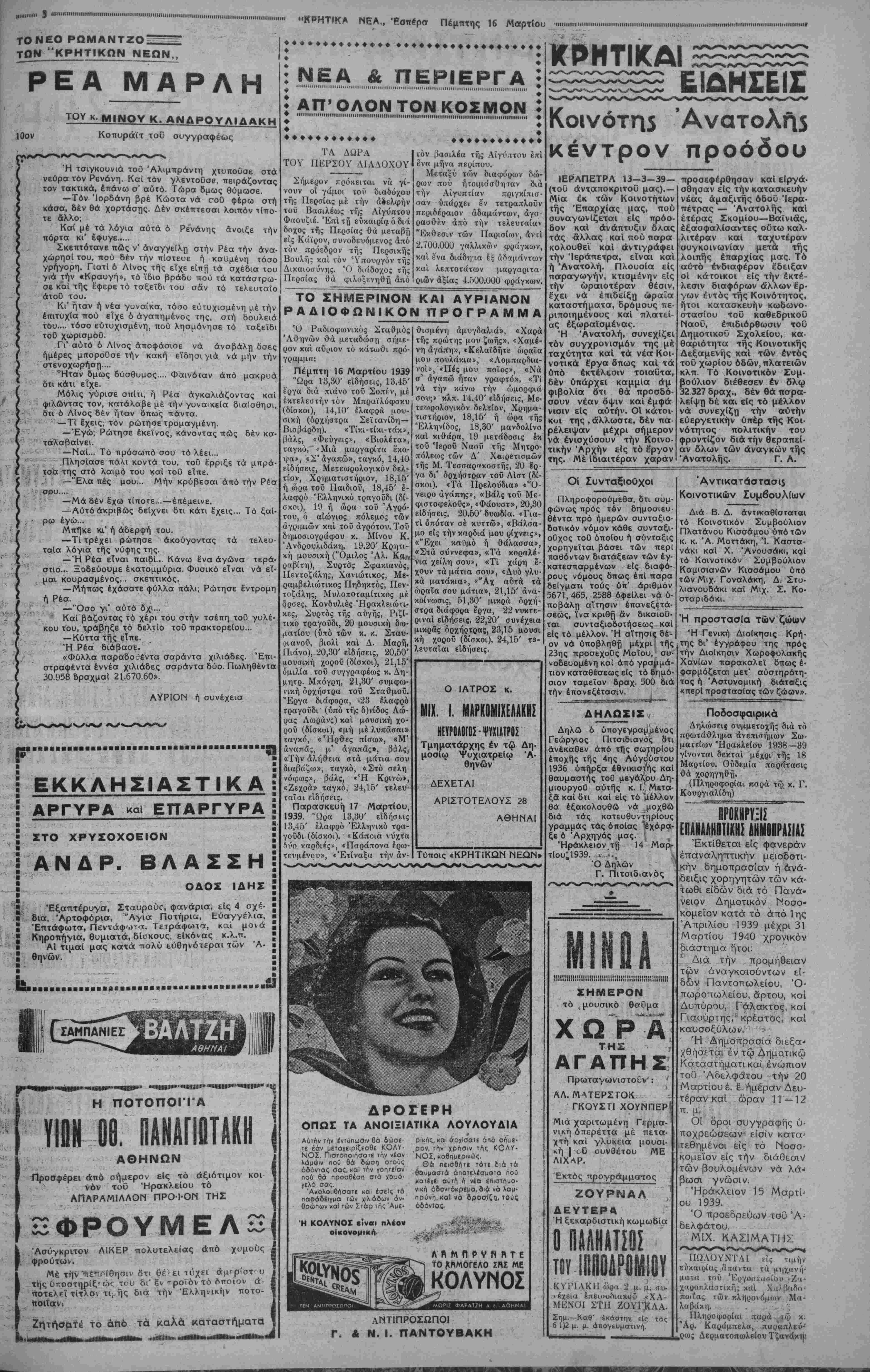 ΑΘΗΝΑΙ 16—3—39 (τοϋ ανταποκριτού
